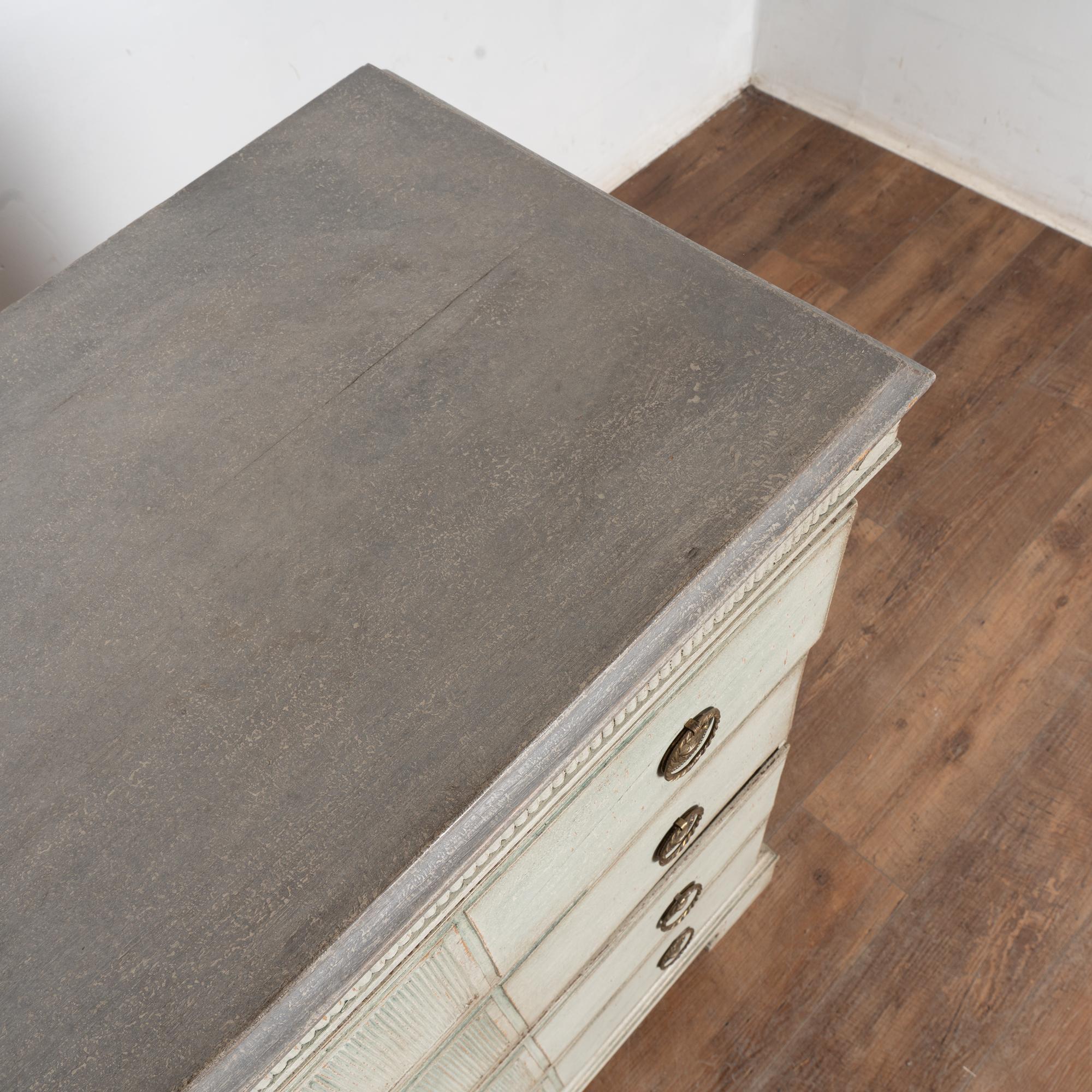 Stately Gustavian chest of four drawers with dentil molding carved along top and gentle fluted carving central to each drawer.