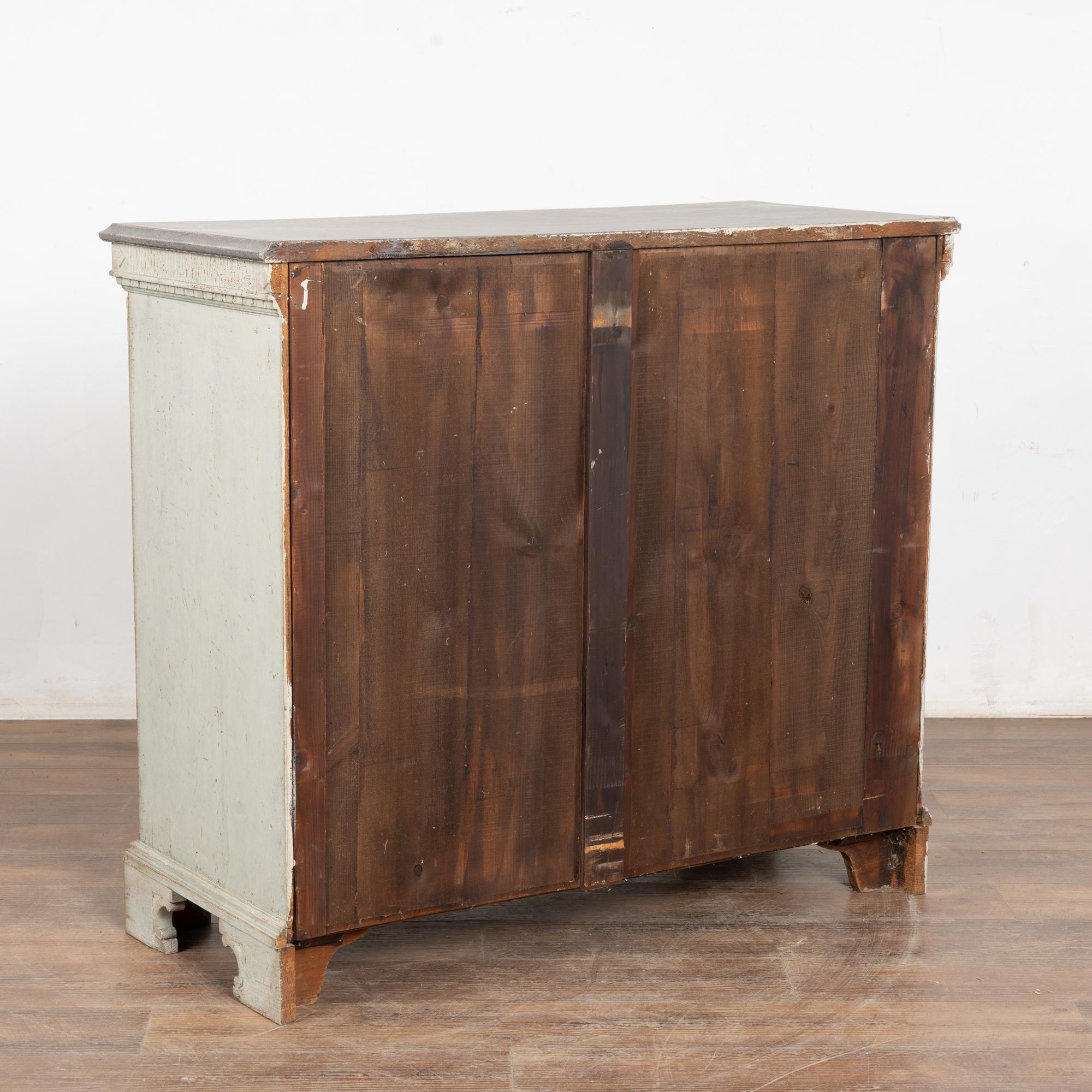 The newer, professionally applied light gray painted layered finish with teal undertone adds a touch of grace that fits the age of this large dresser. Top painted in a contrasting darker gray with white undertones.