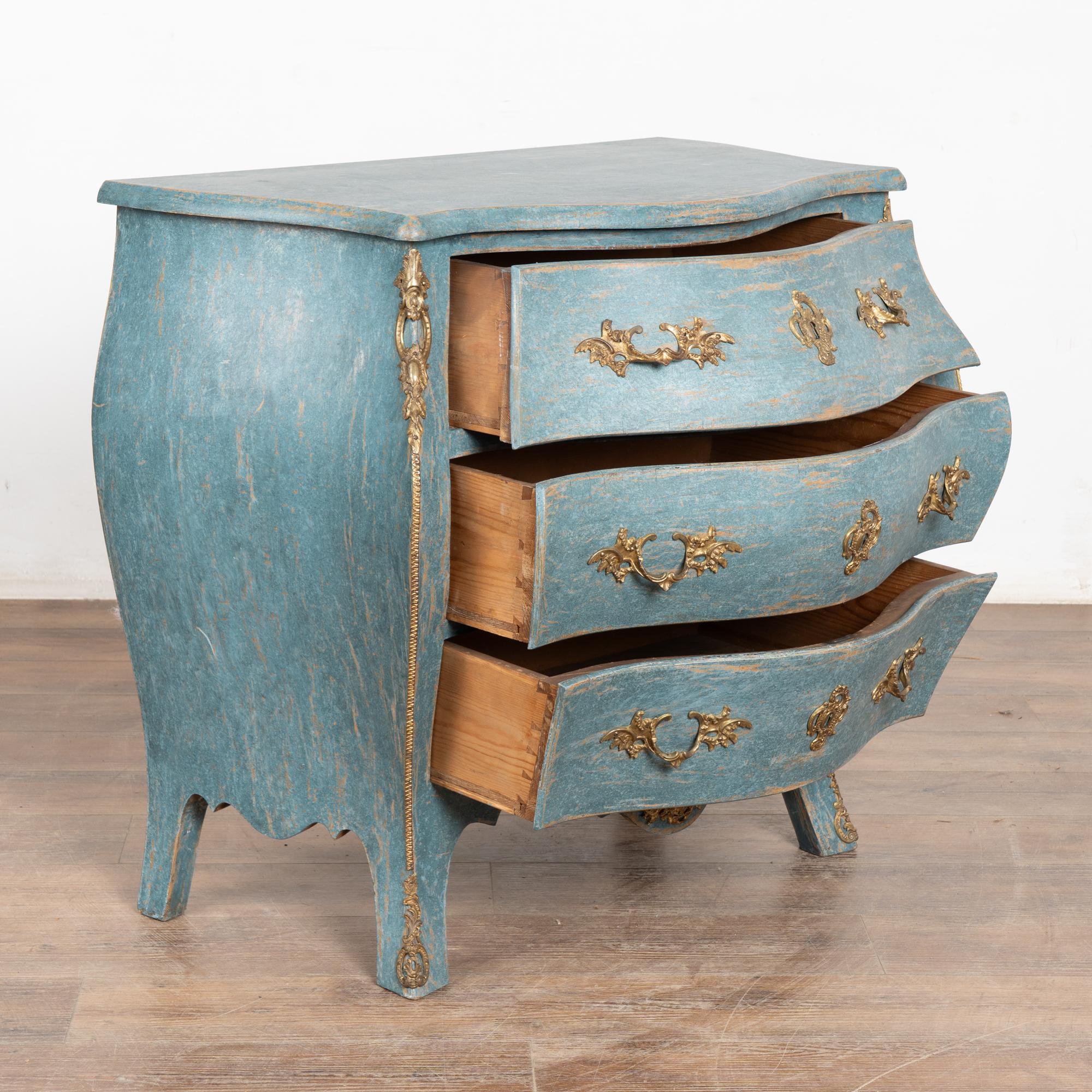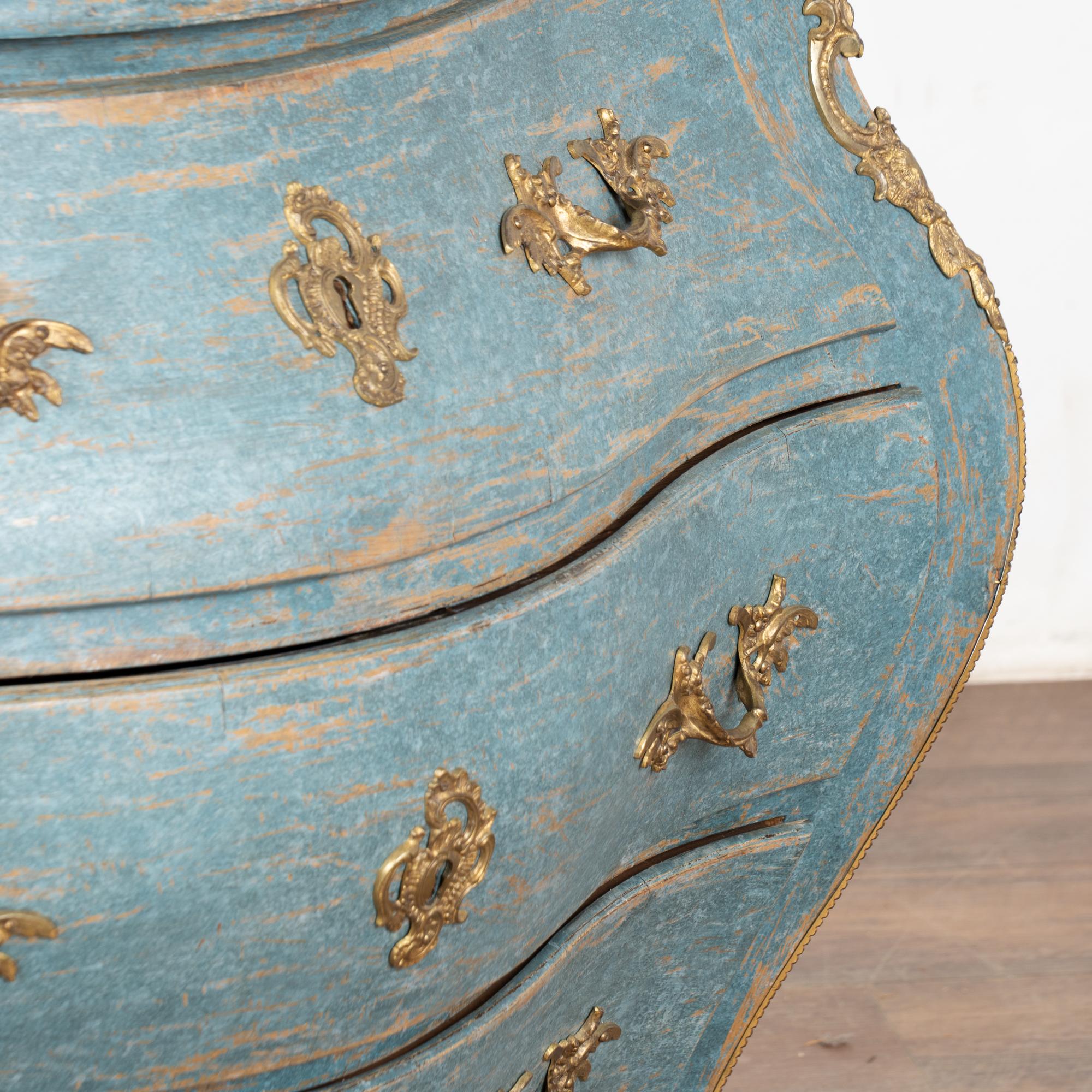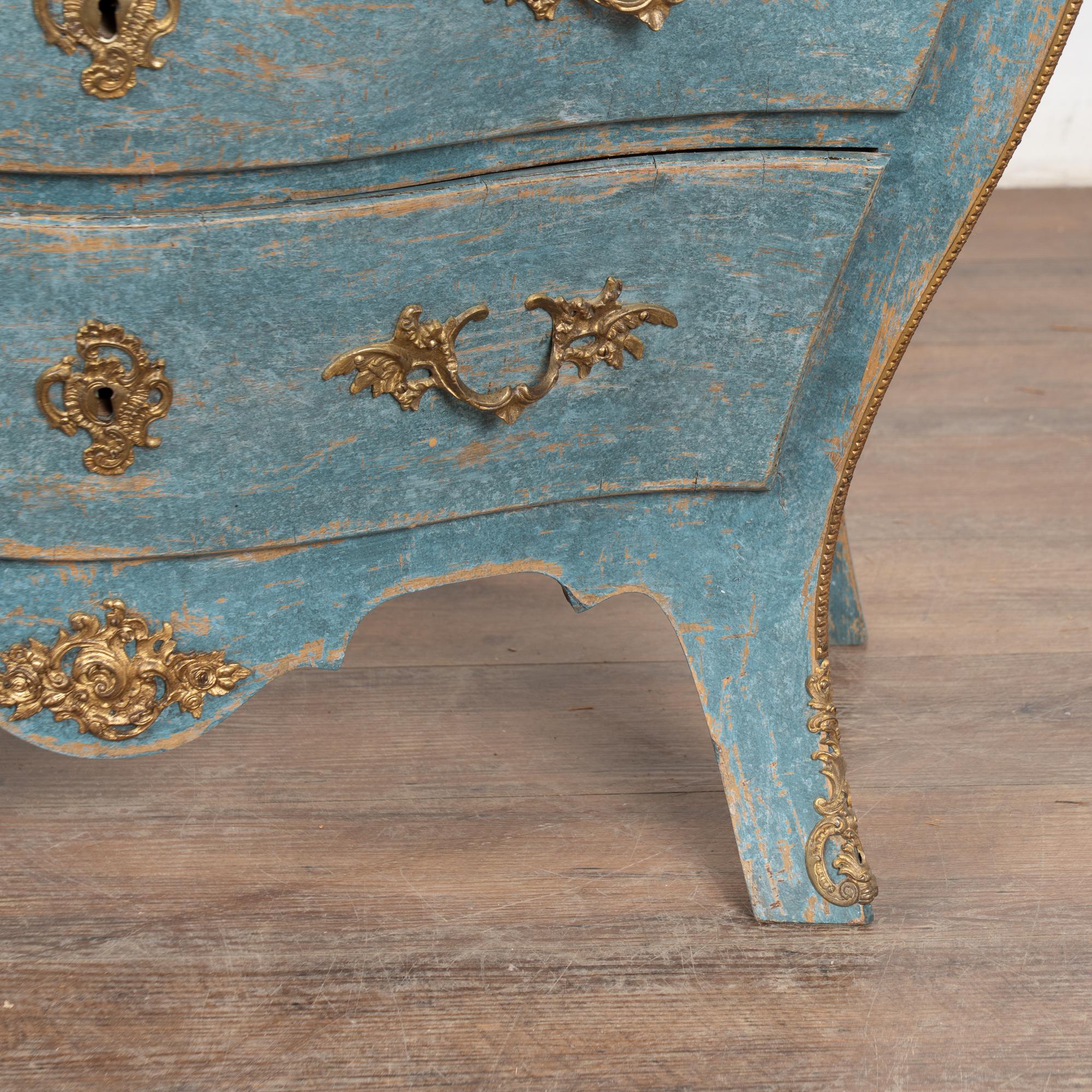 Later professionally painted in layered shades of blue and lightly distressed to fit the age and grace of this elegant pine commode.