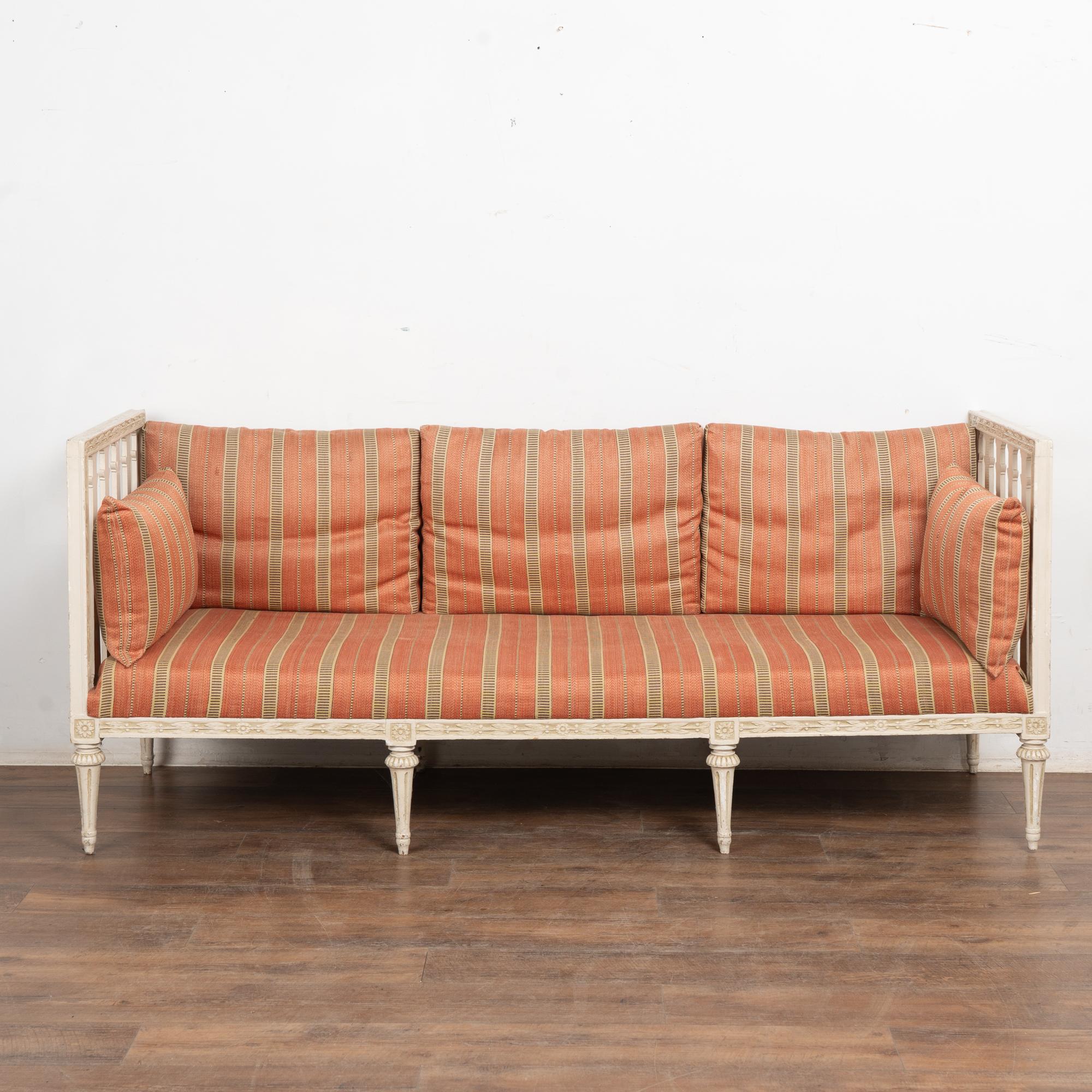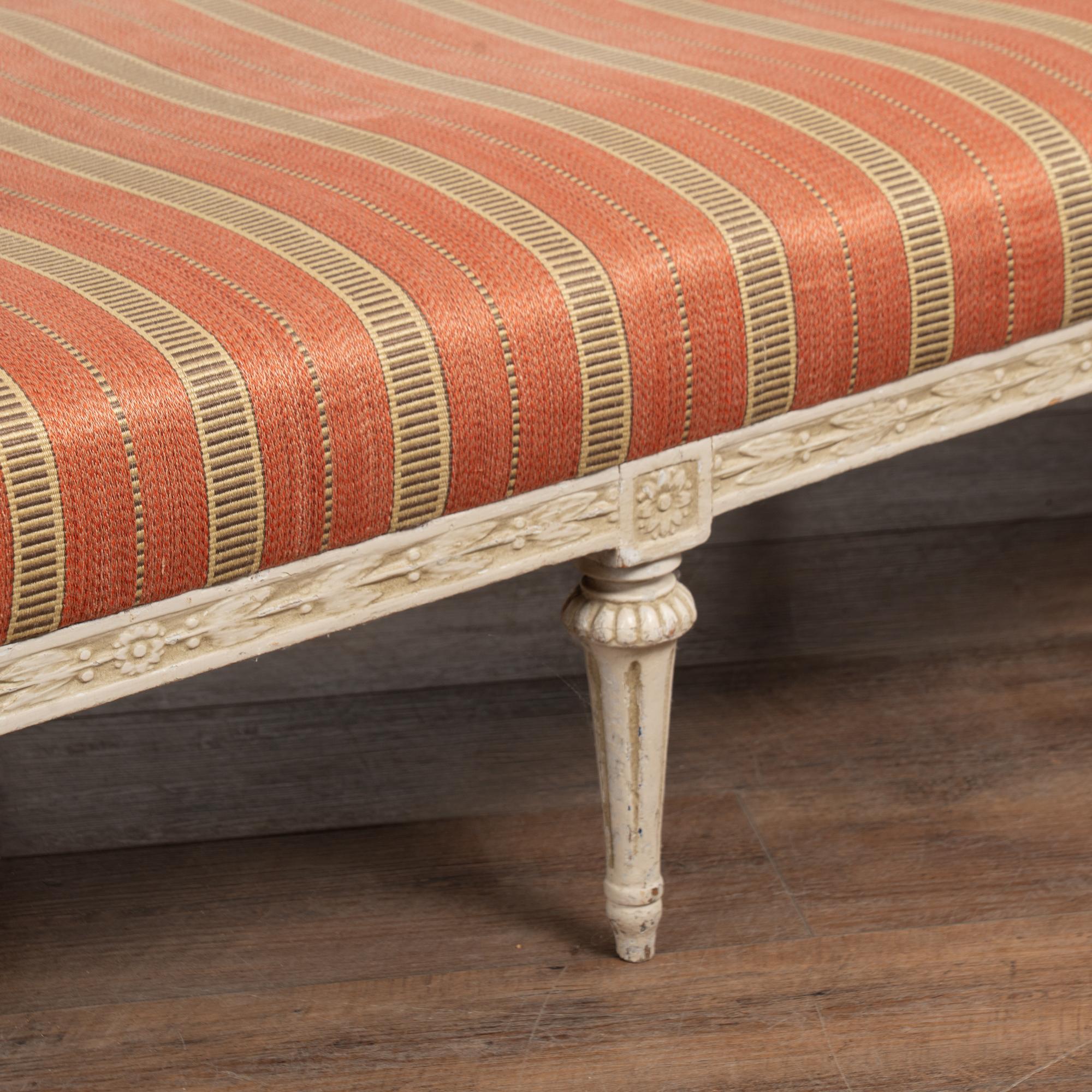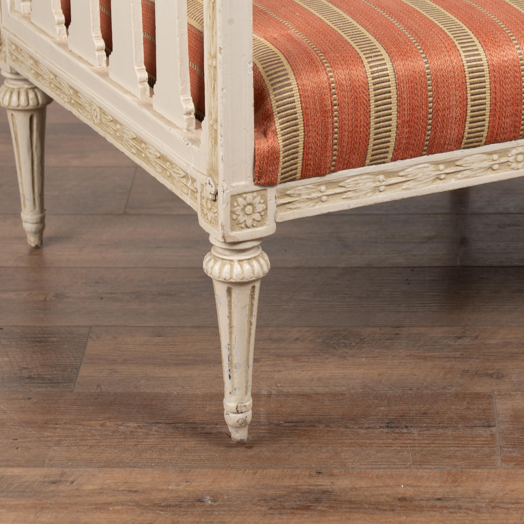 This backless sofa or settee is from the Swedish Gustavian period with carved details and fluted tapered feet.