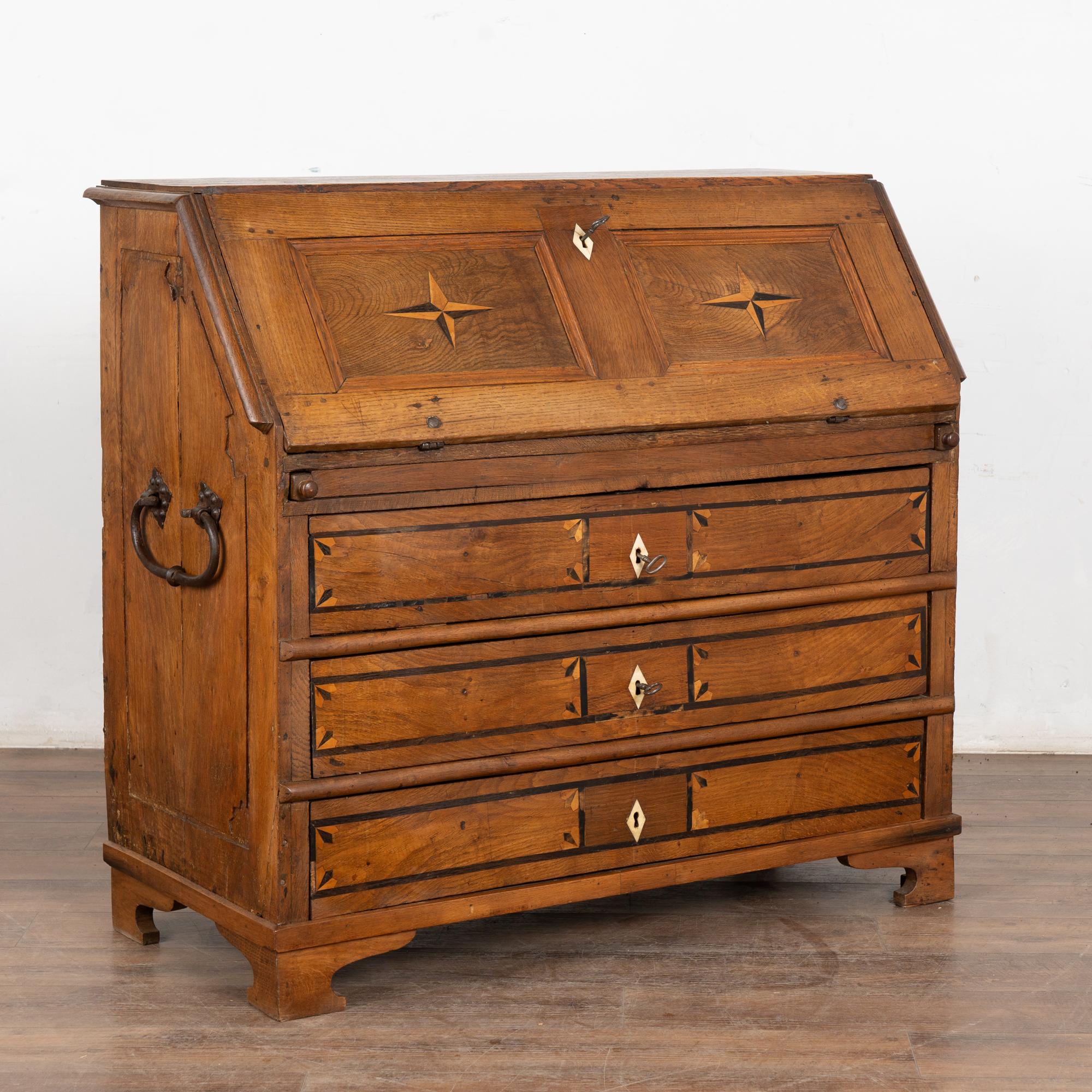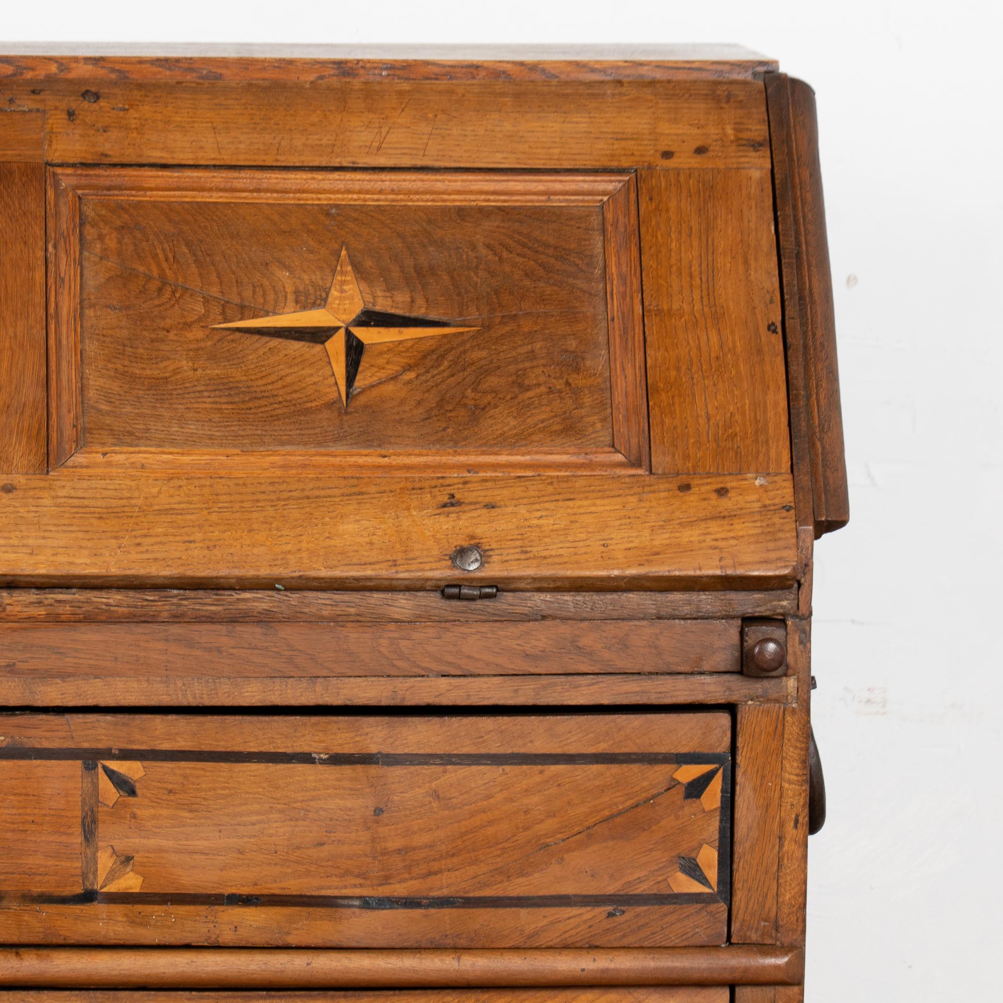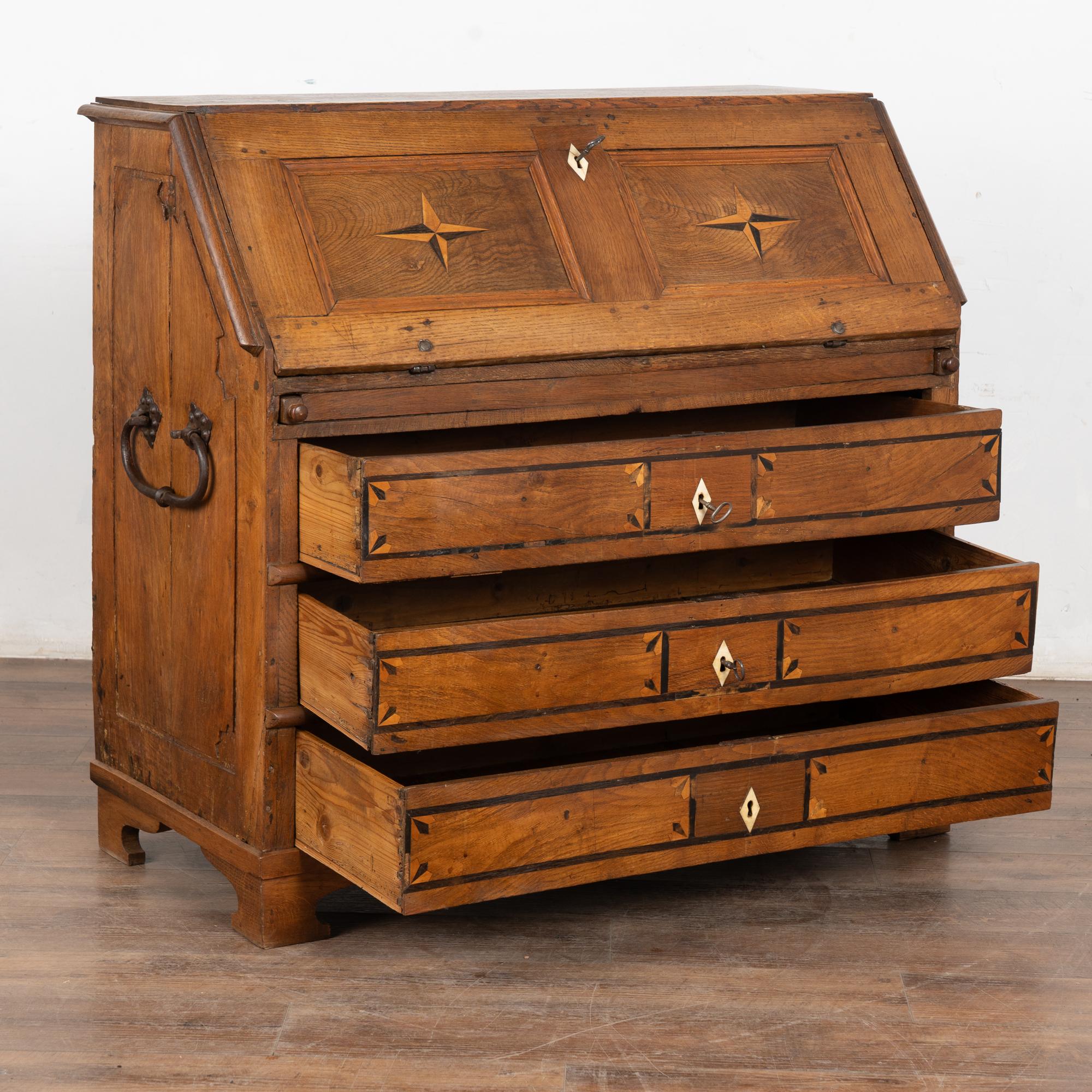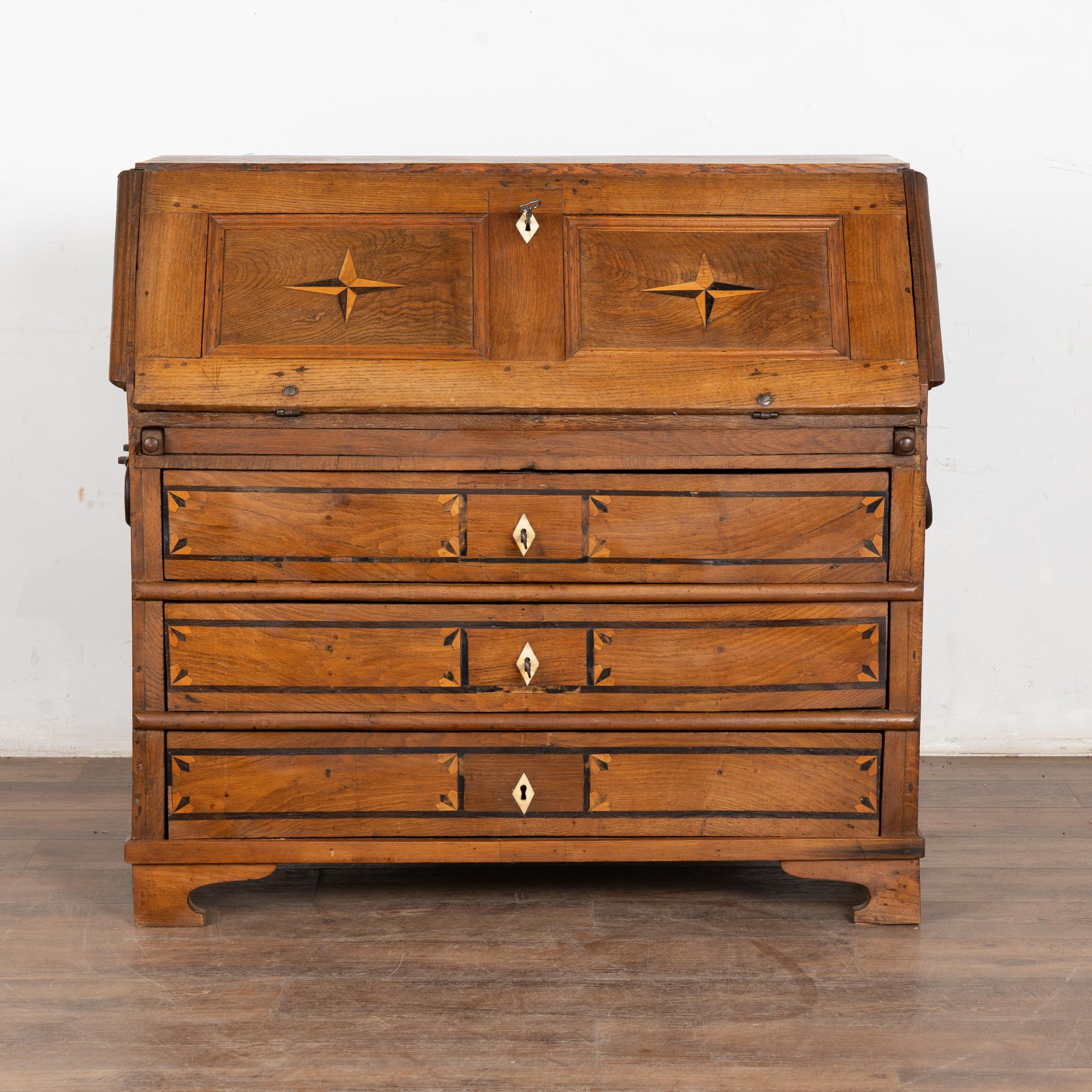 This drop front secretary is charming in every way, with a soft, satin wax finish that compliments the deeply aged patina of the inlaid oak and European country styling. An inlaid star pattern along the desk front, inlaid drawers and carved detail in the sides sides add to the timeless appeal of this bureau.