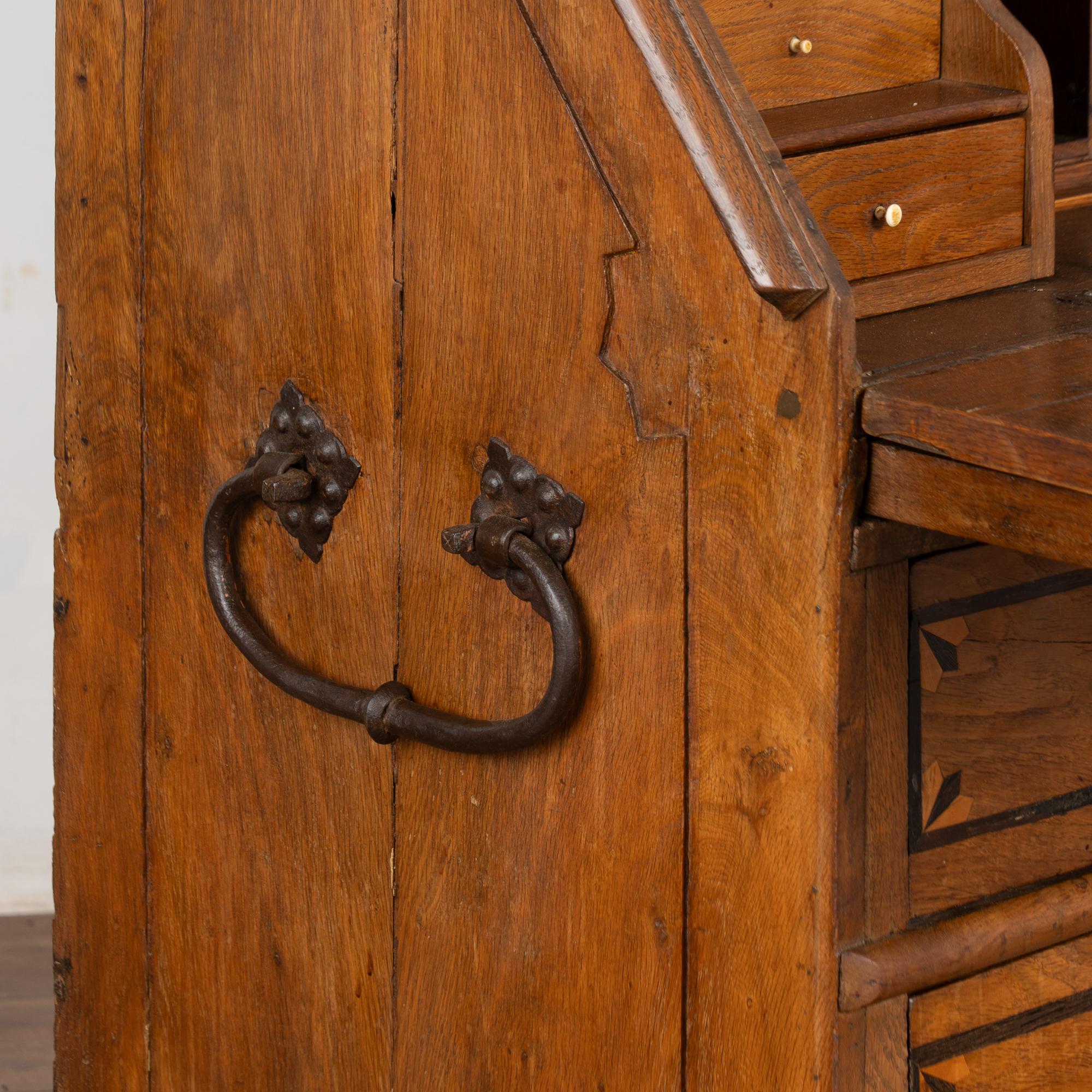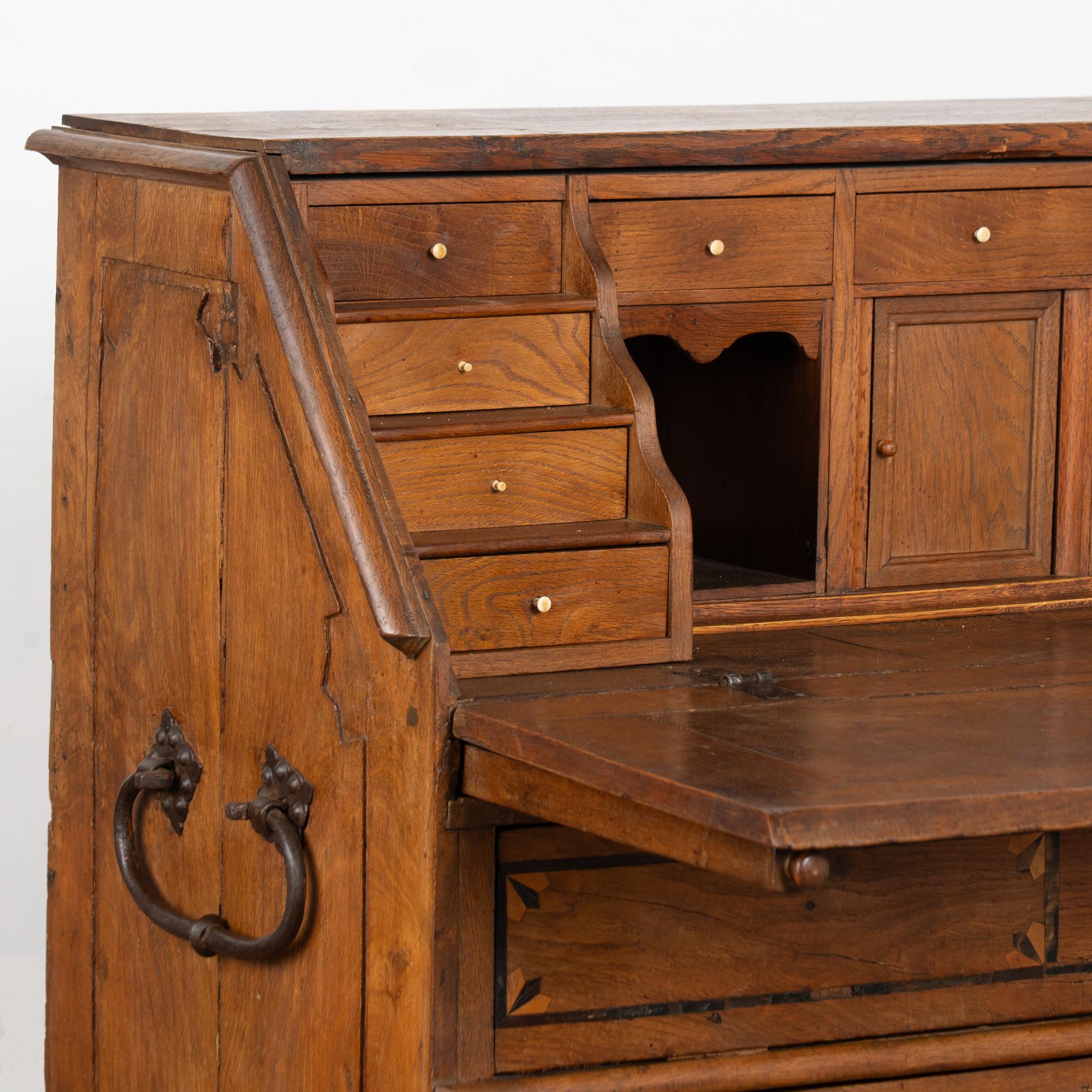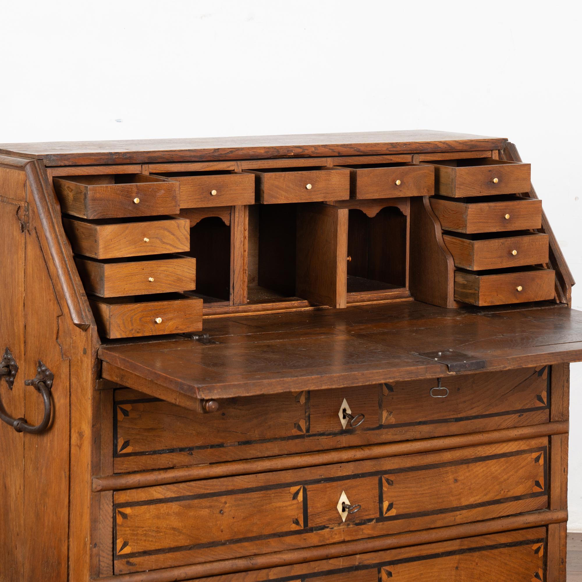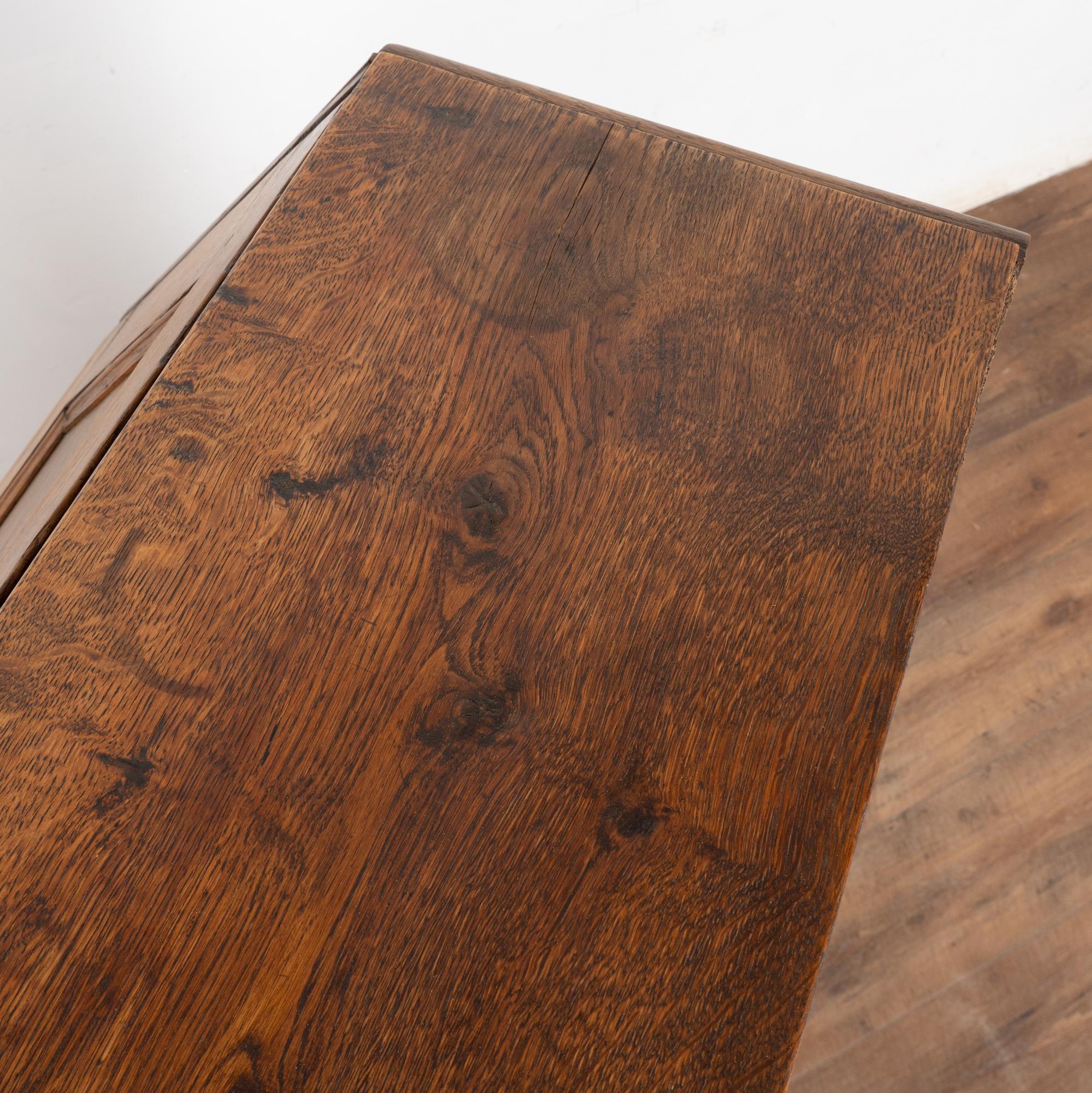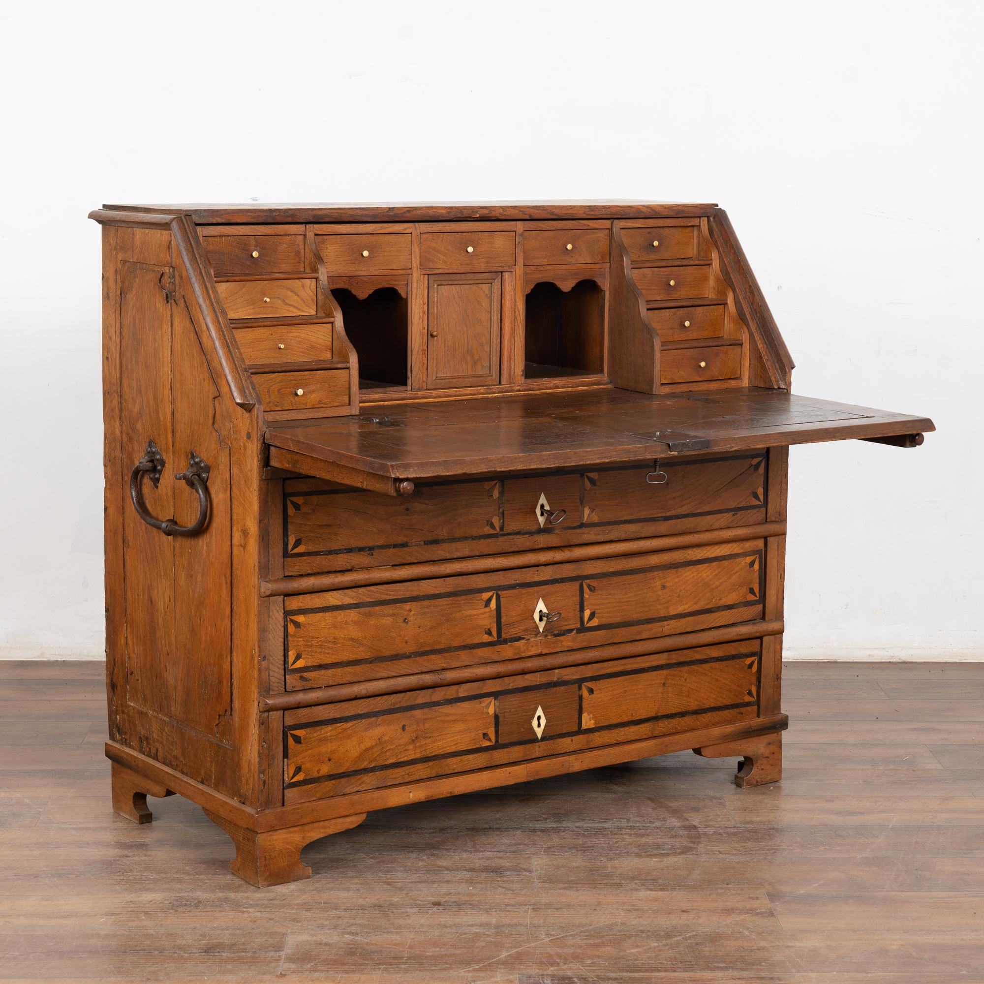 This drop front secretary is charming in every way, with a soft, satin wax finish that compliments the deeply aged patina of the inlaid oak and European country styling. An inlaid star pattern along the desk front, inlaid drawers and carved detail in the sides sides add to the timeless appeal of this bureau.