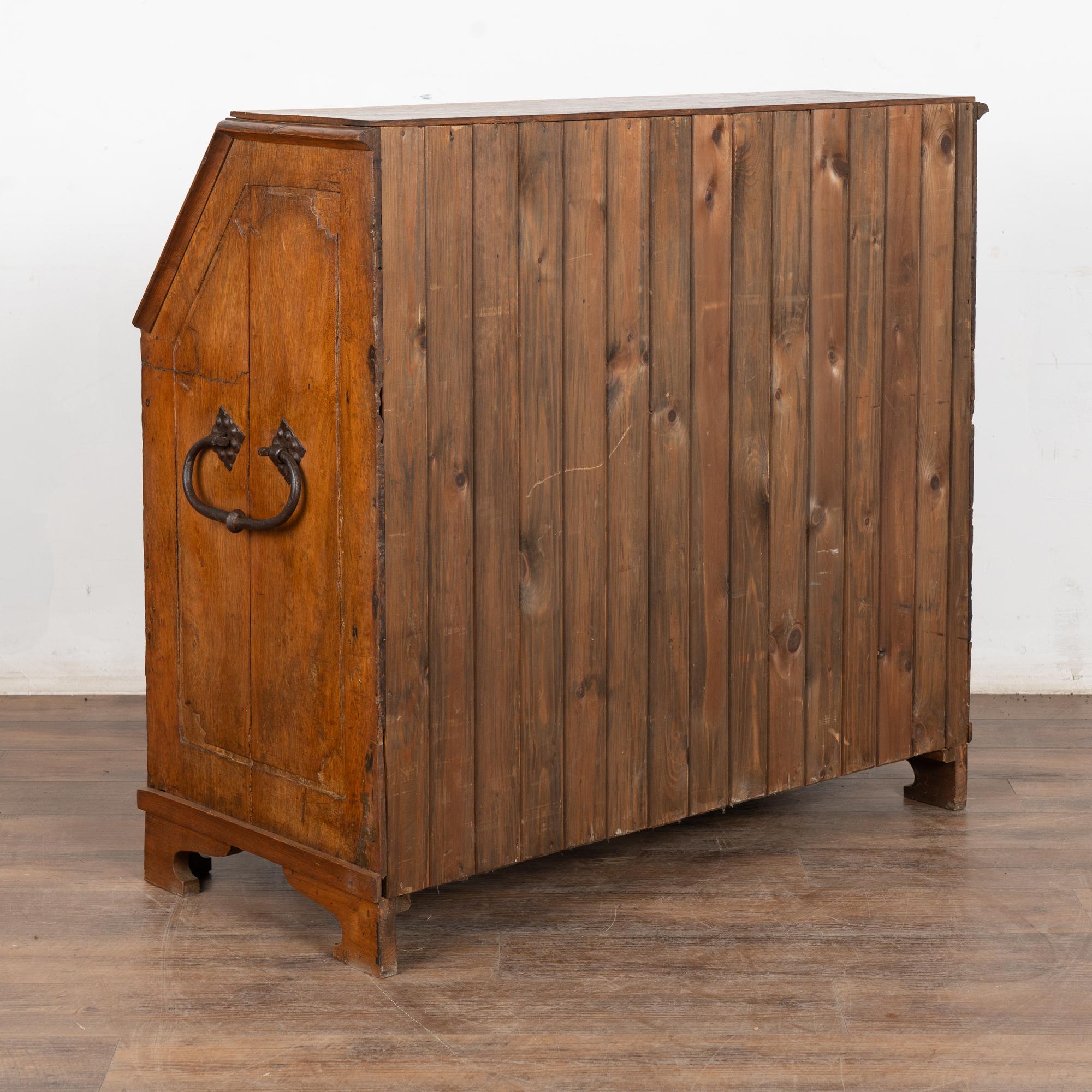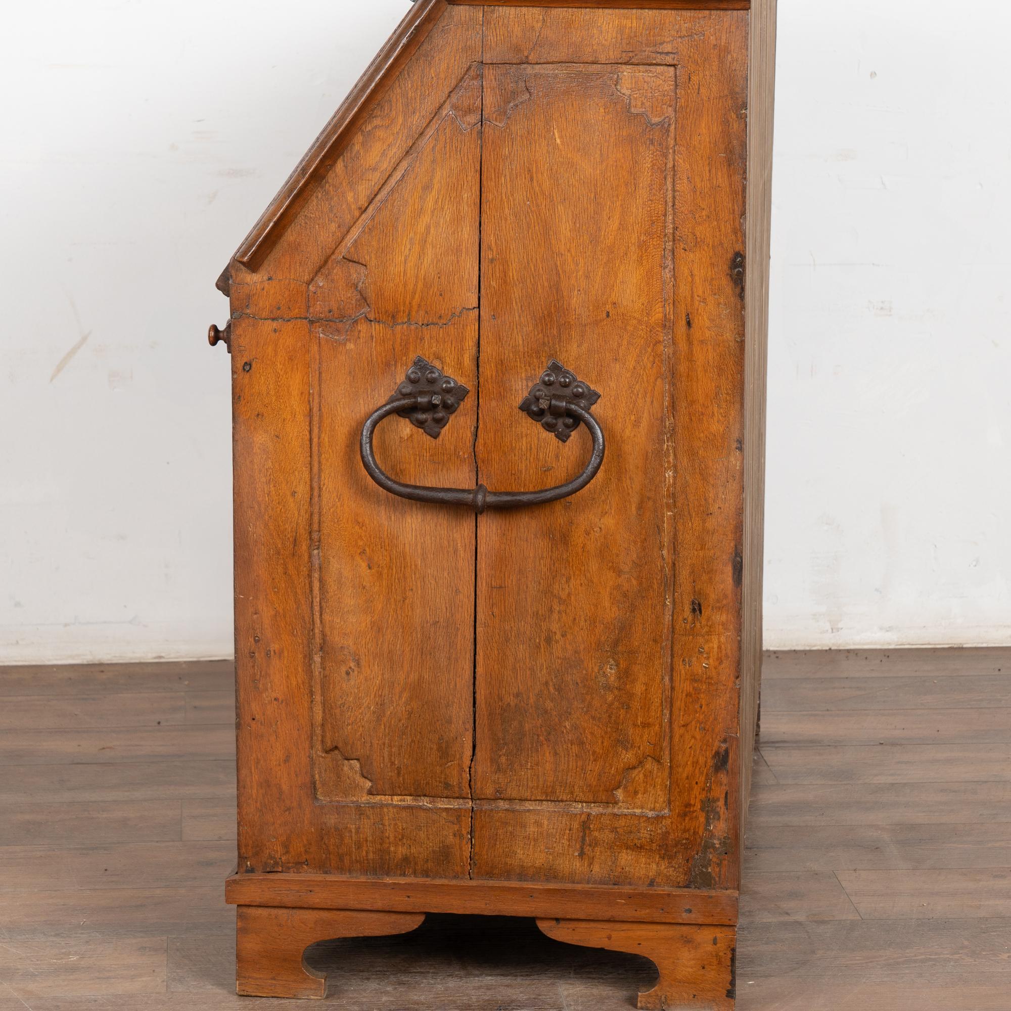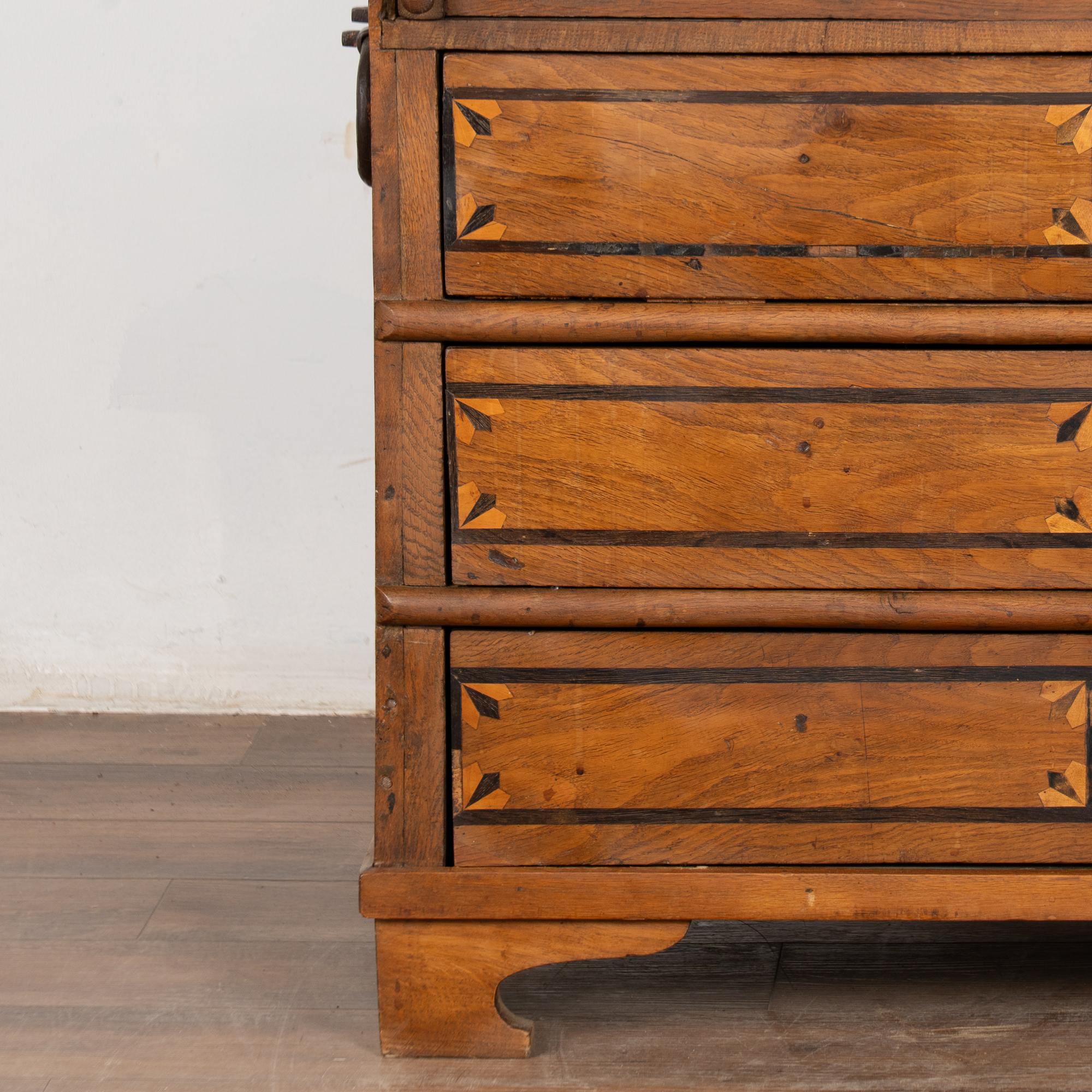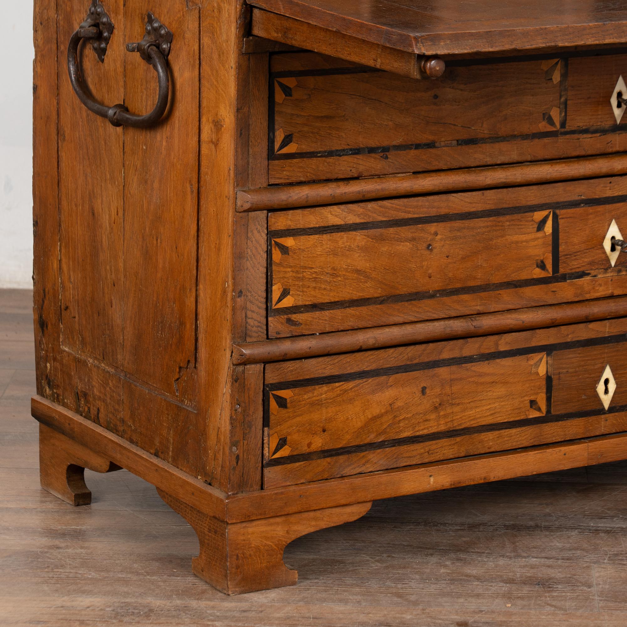 This drop front secretary is charming in every way, with a soft, satin wax finish that compliments the deeply aged patina of the inlaid oak and European country styling. An inlaid star pattern along the desk front, inlaid drawers and carved detail in the sides sides add to the timeless appeal of this bureau.