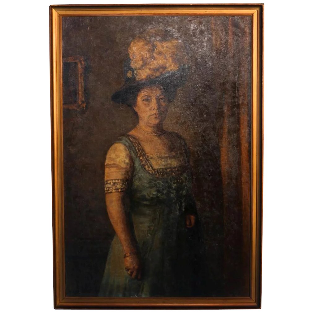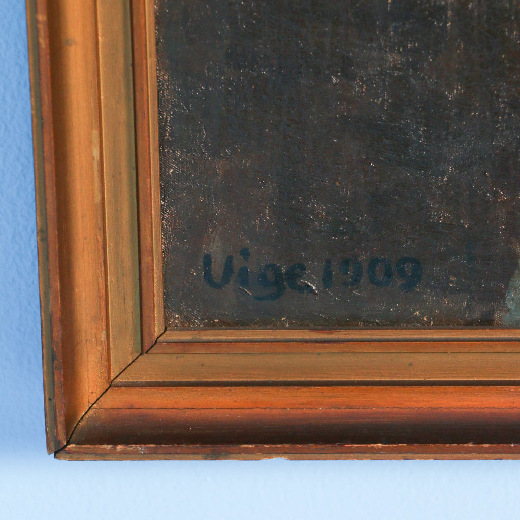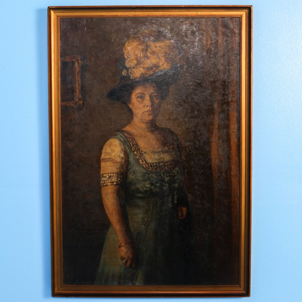This original oil on canvas portrait of a standing woman in evening wear is signed and dated in the lower left Vige 1909 (Jens Peder Olsen Vige 1864-1912). The canvas is mounted in a gold painted frame and inscribed on the back stretcher, "Exhibited at Charlottenborg 1909."