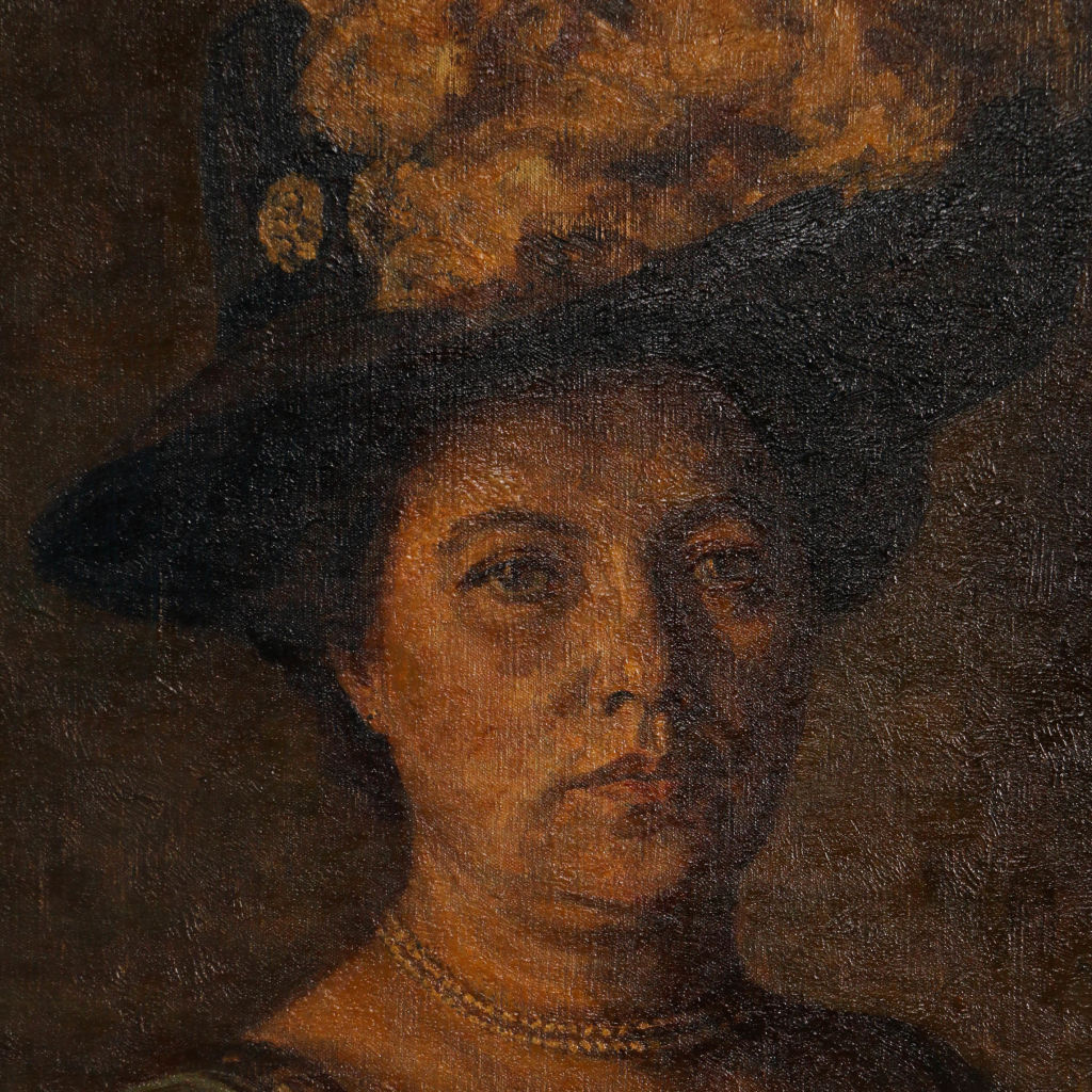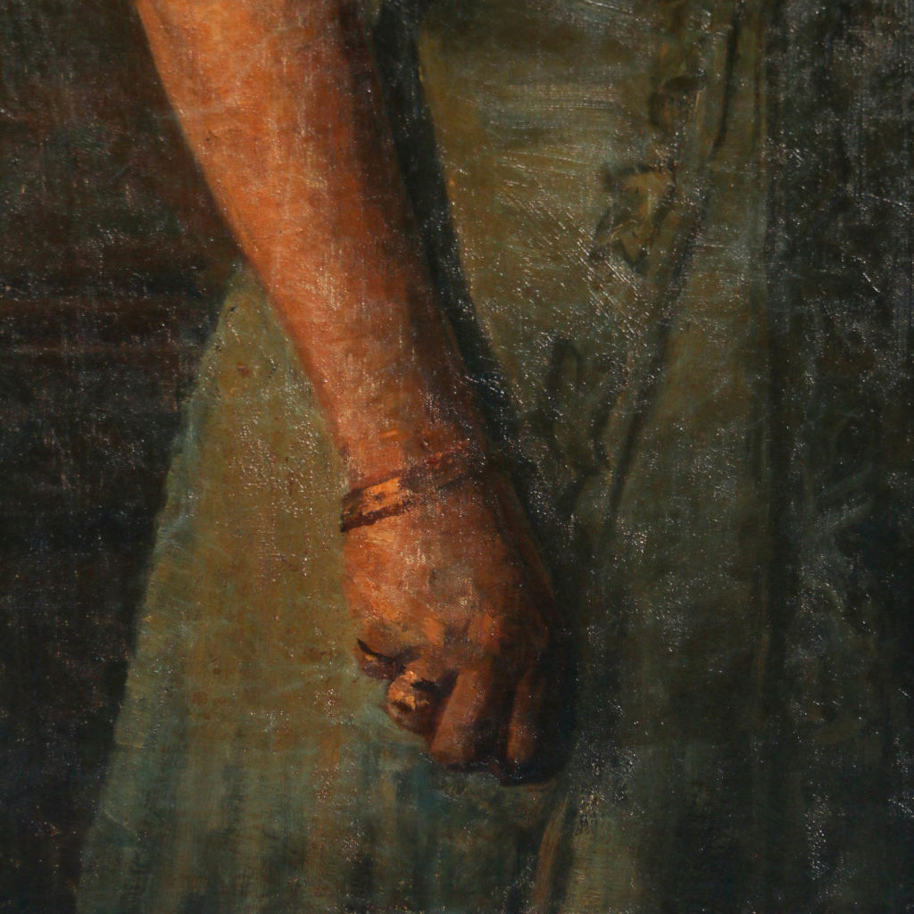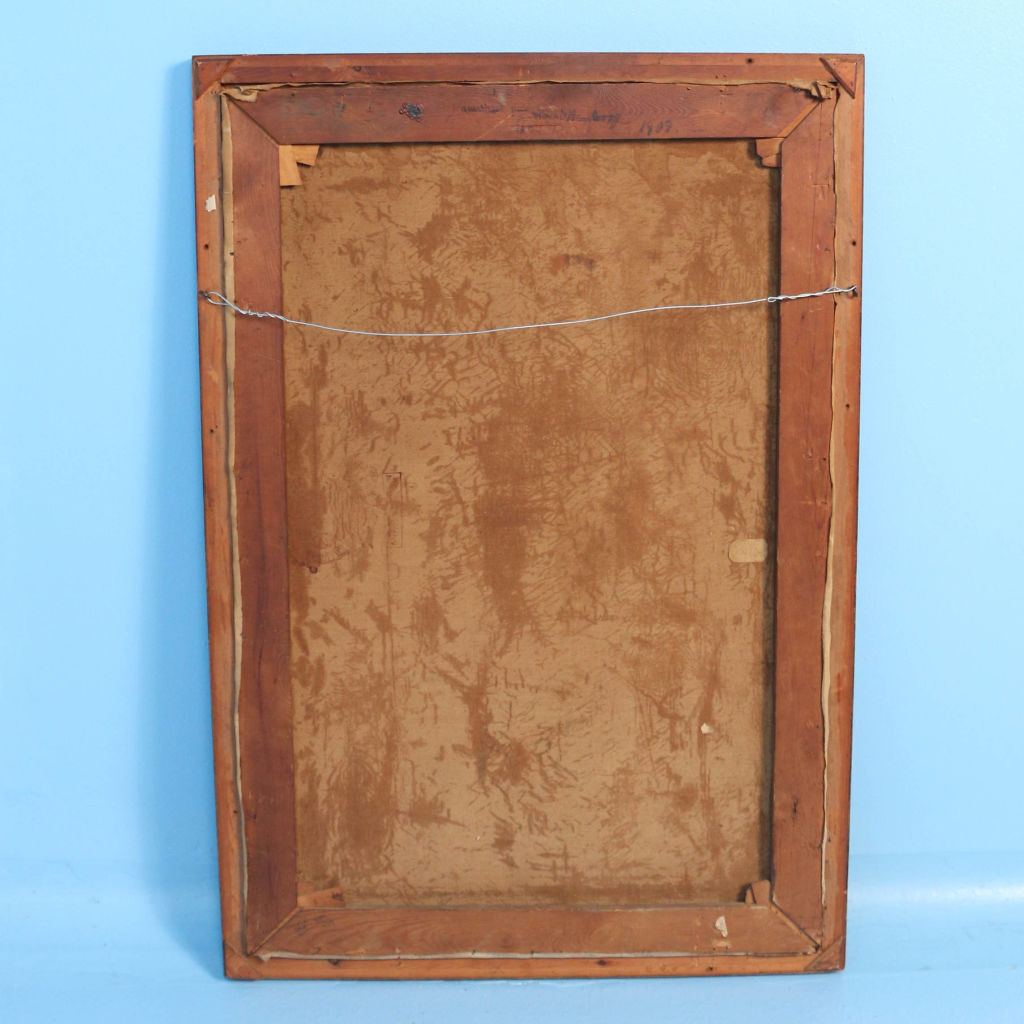 This original oil on canvas portrait of a standing woman in evening wear is signed and dated in the lower left Vige 1909 (Jens Peder Olsen Vige 1864-1912). The canvas is mounted in a gold painted frame and inscribed on the back stretcher, "Exhibited at Charlottenborg 1909."