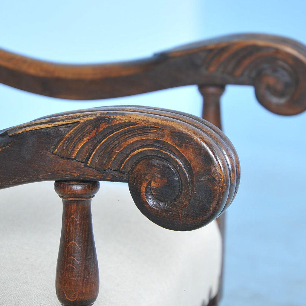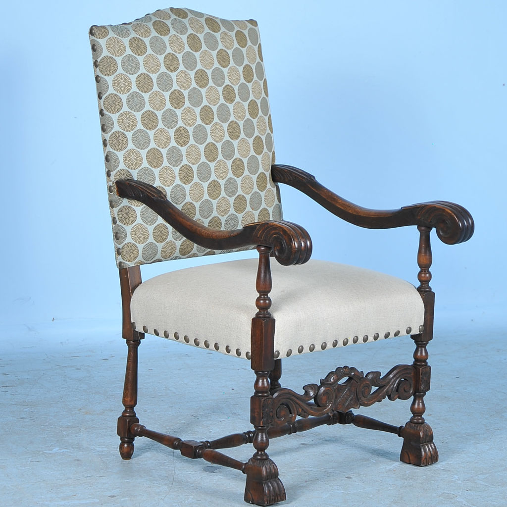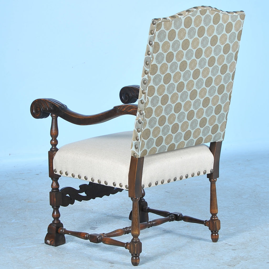 It is the new, contemporary upholstery of geometric circular patterns against the back and clean linen on the seat that creates a fresh, modern look while maintaining this chair's vintage roots. The arm chair reveals its traditional Danish baroque styling of the early 1900's with the carved oak details (note the arms, feet, and lower carved support) giving it a rich and substancial look.