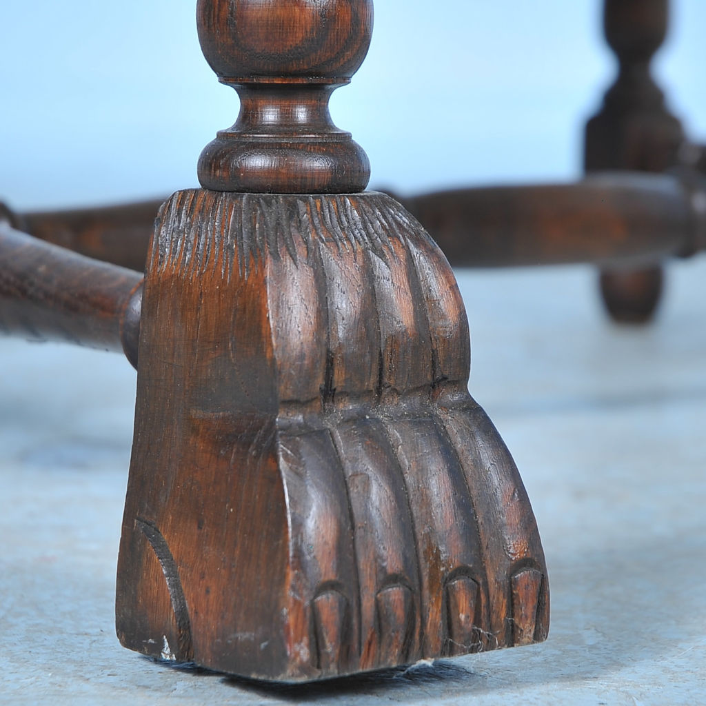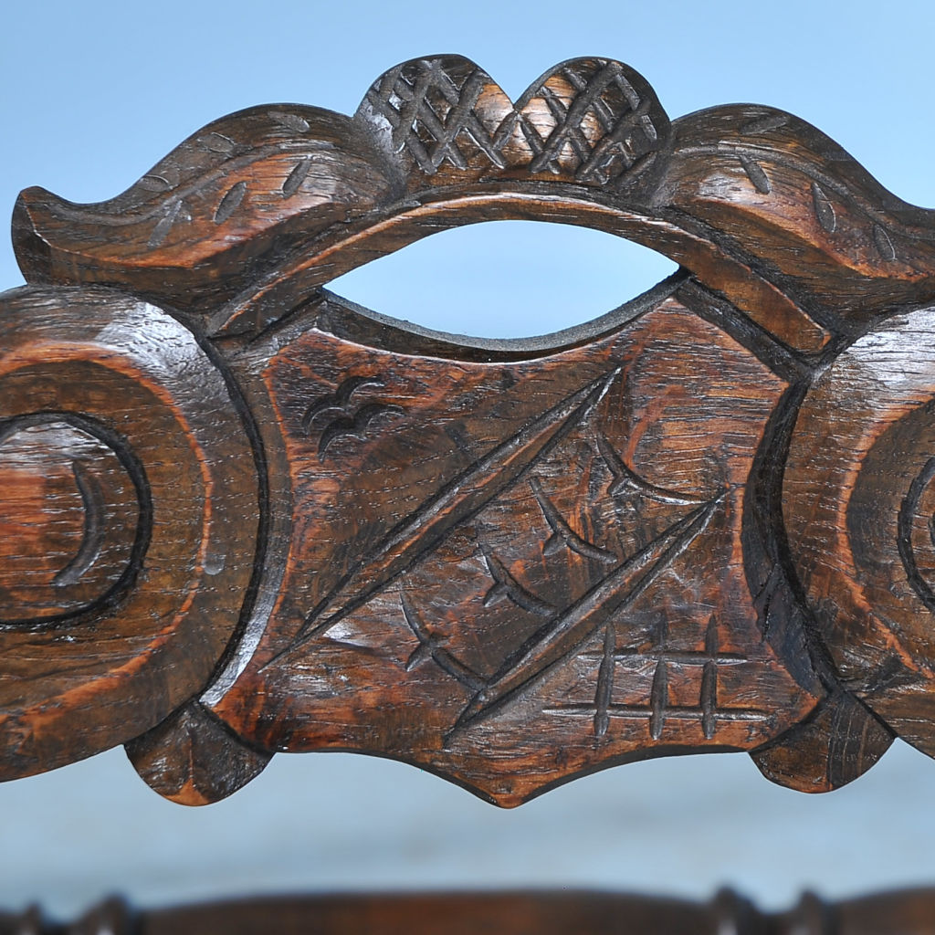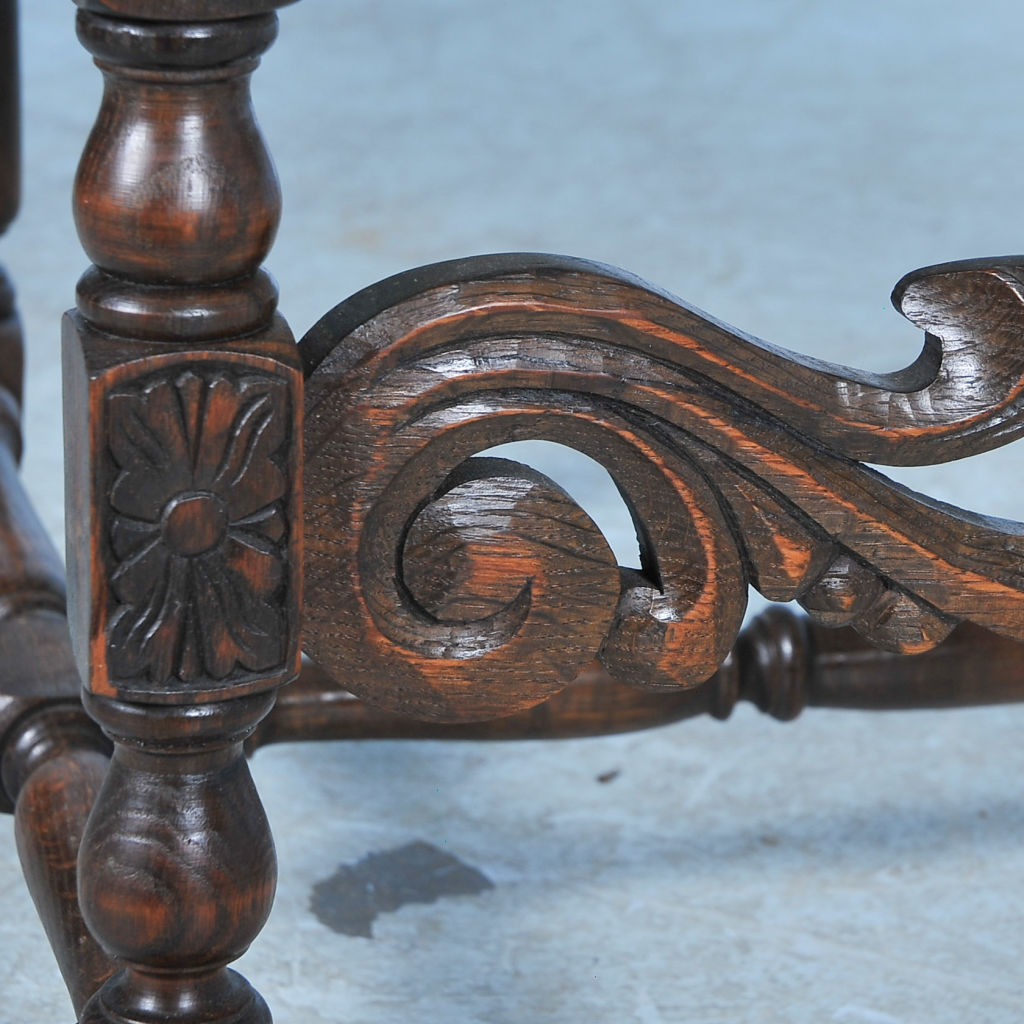 It is the new, contemporary upholstery of geometric circular patterns against the back and clean linen on the seat that creates a fresh, modern look while maintaining this chair's vintage roots. The arm chair reveals its traditional Danish baroque styling of the early 1900's with the carved oak details (note the arms, feet, and lower carved support) giving it a rich and substancial look.