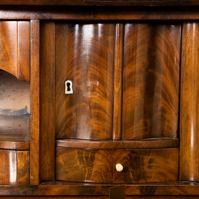 This stunning Biedermeier secretary was crafted in Denmark during a peak era known for high quality furniture craftsmanship. Enlarge photos to appreciate the beauty of the wood, note the curve of each door and how the carved elements and turned columns accent the overall stately appeal of this remarkable piece. The top features a convex center door flanked by spiral columns with smaller concave doors on the sides. The lower cabinet has 3 drawers below the cylinder roll and a pull out writing surface. Take time to enlarge the photos to view the extraordinary details of the drawers and doors inside the desk. This remarkable desk has been professionally restored, it is ready to be placed, used and enjoyed.