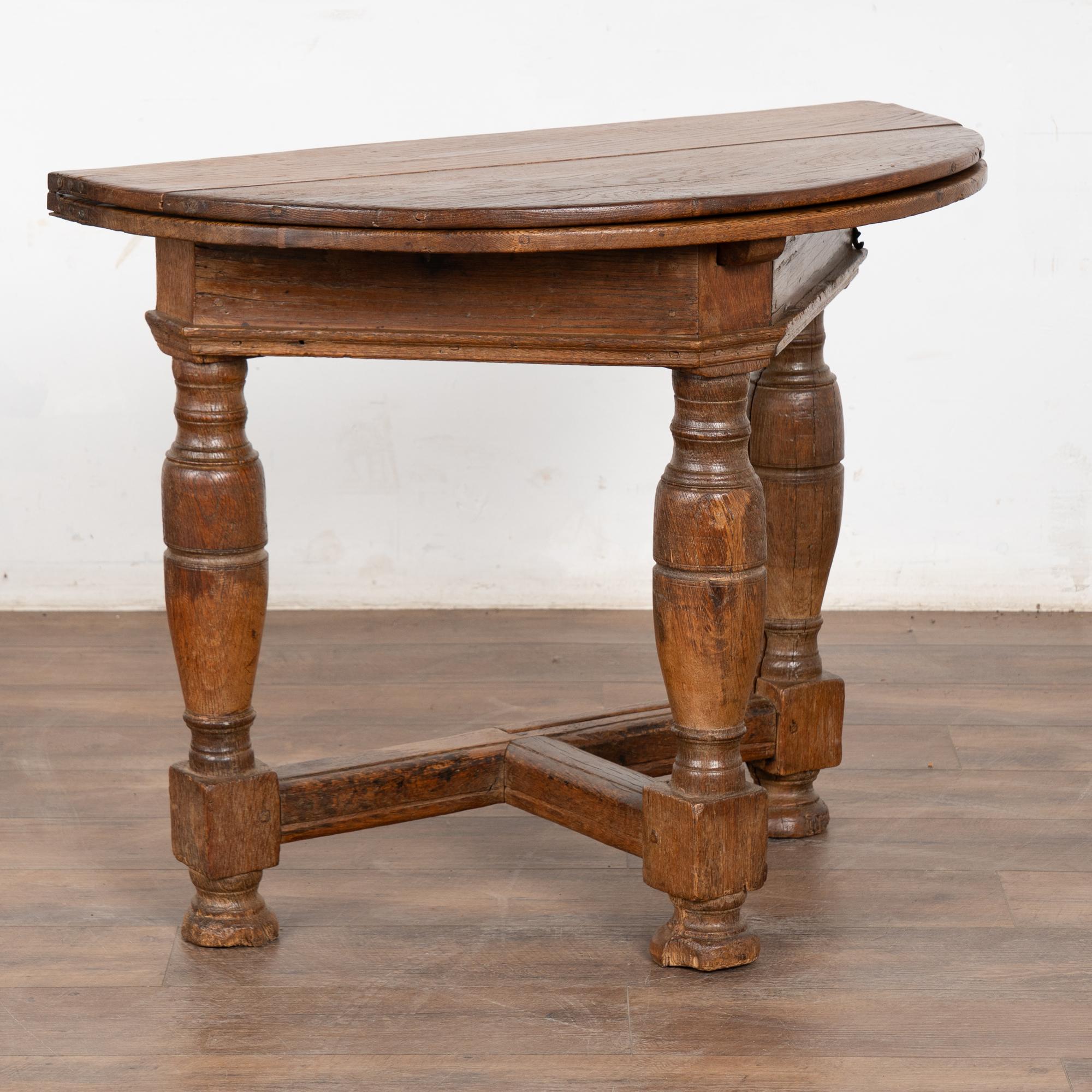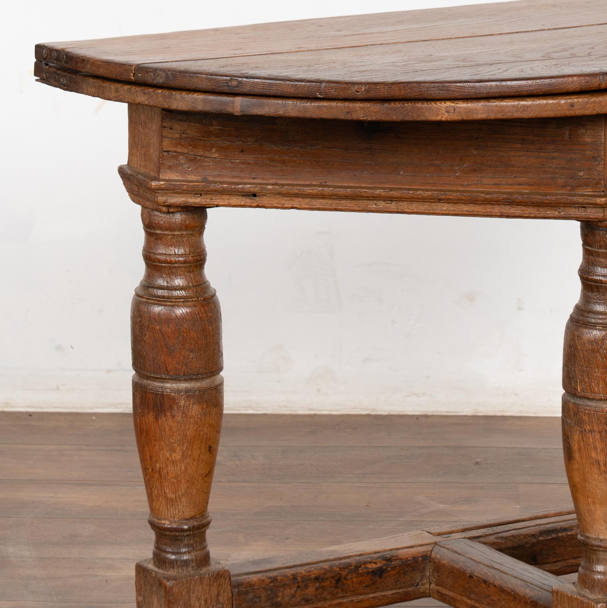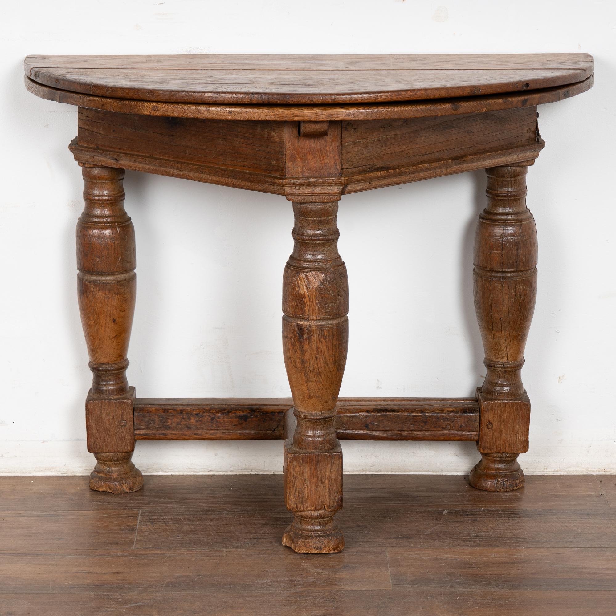 There is wonderful aged charisma to this drop leaf gate leg table that can serve as a side table, game table, demi-lune console or even small kitchen table.