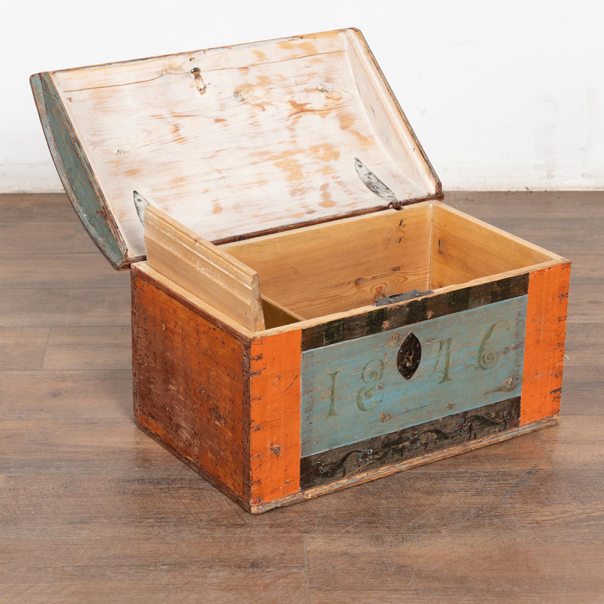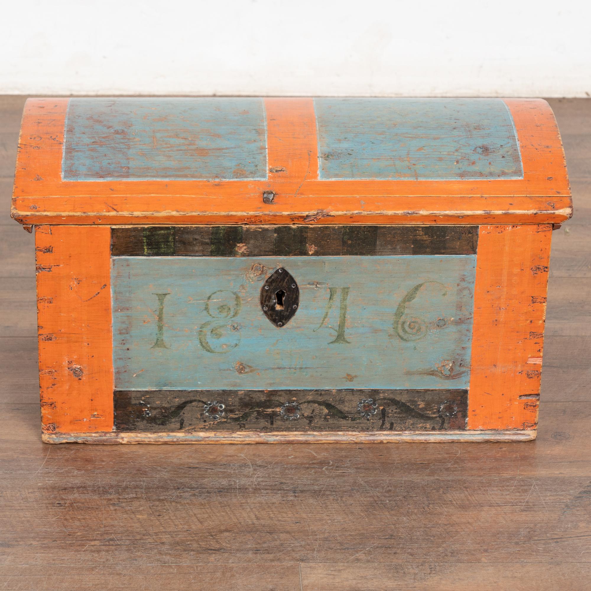 Small dome top trunk from Sweden dated 1846. The burnished orange background and light blue accent is all hand painted in the traditional folk style of the era.