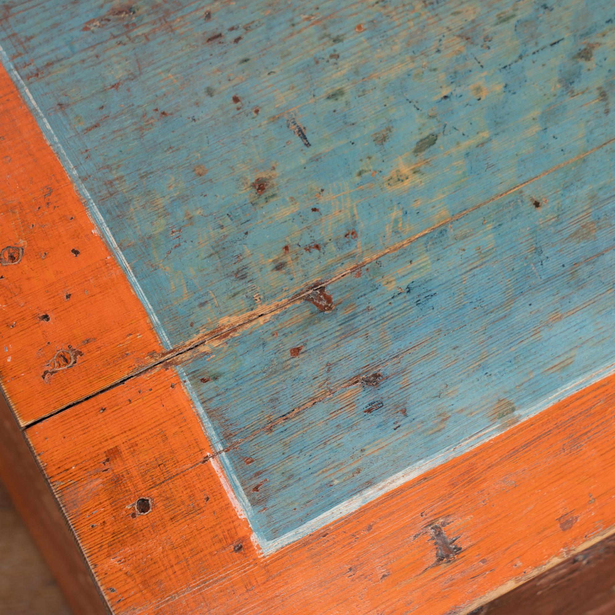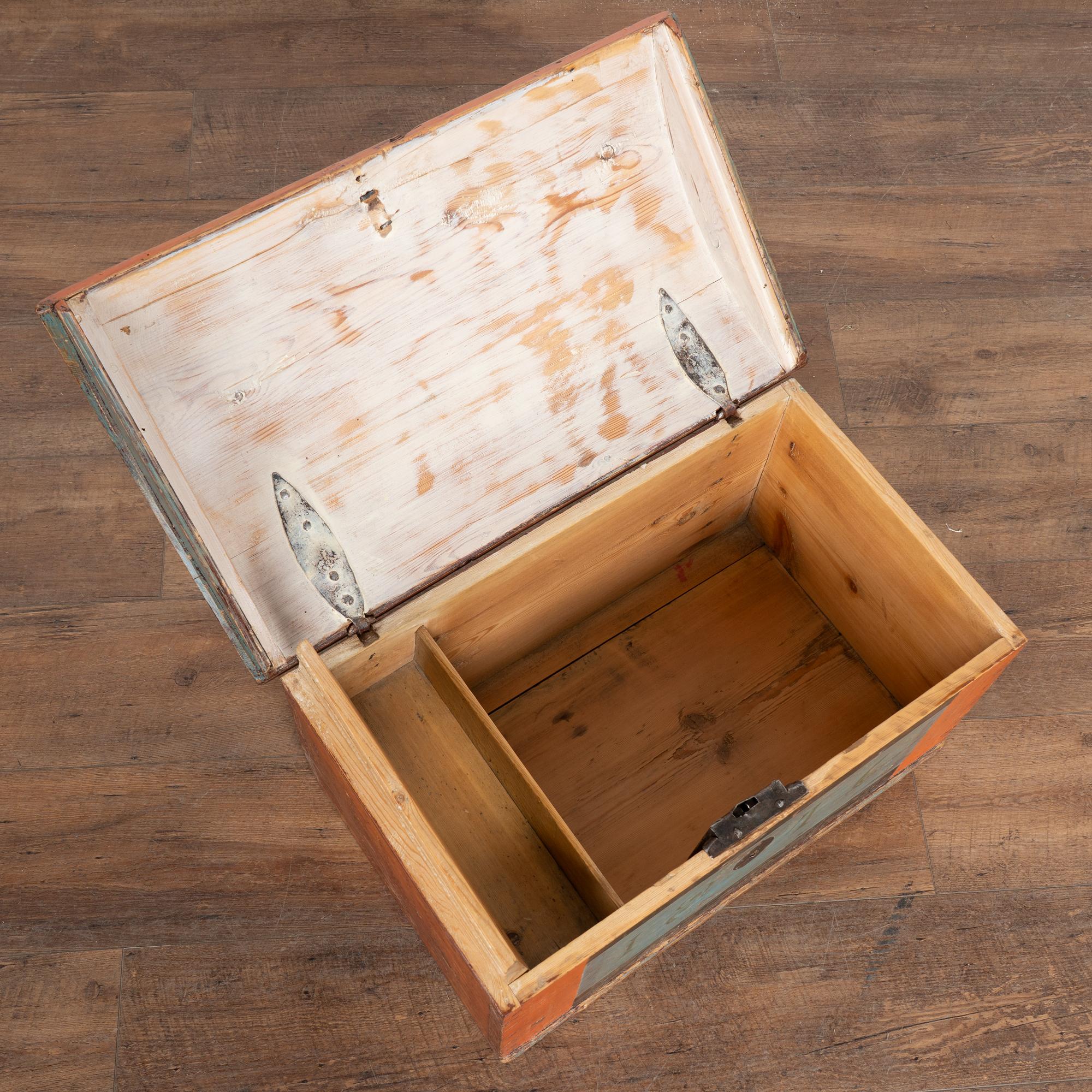 The worn patina adds to its ageless appeal, while other signs of wear are commensurate with age such as the cracks along the top and interior bottom, nicks, marks, distress (seen along bottom edge/corners/sides, etc.) etc., none of which detract from the beauty of this highly original painted trunk.