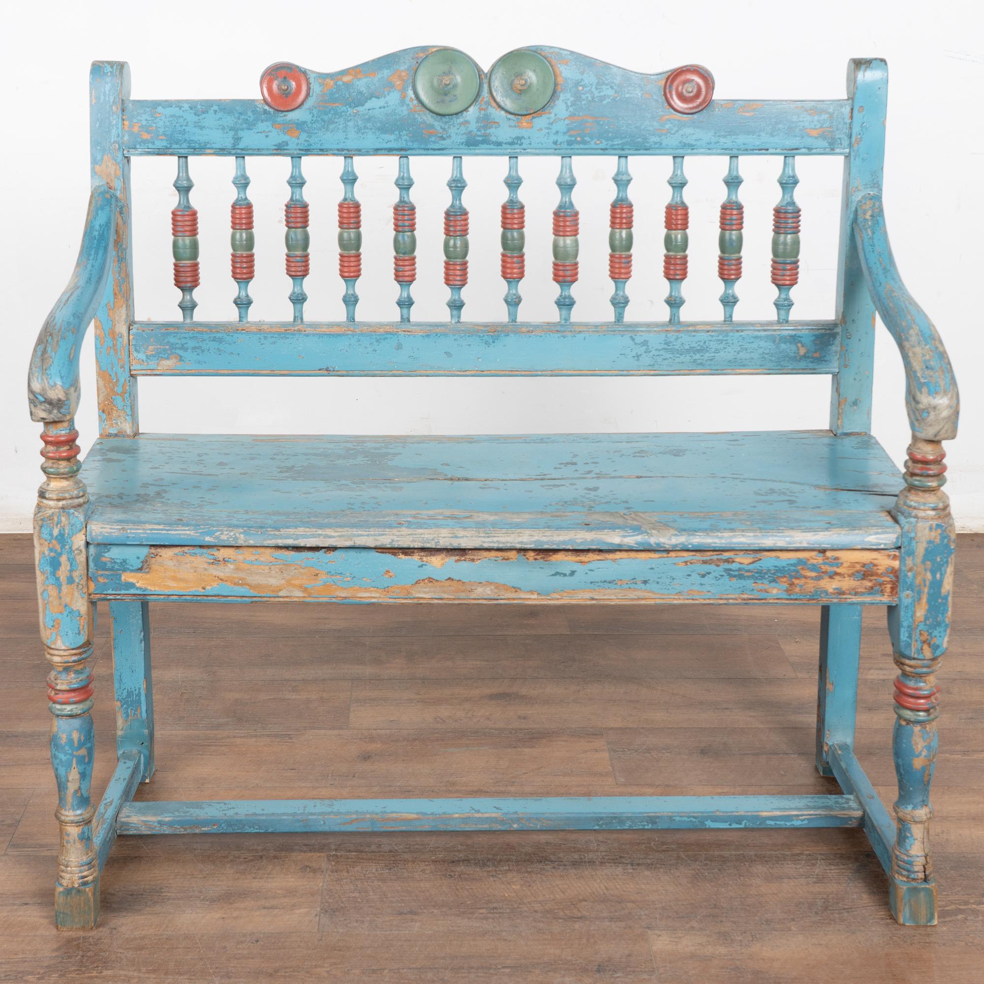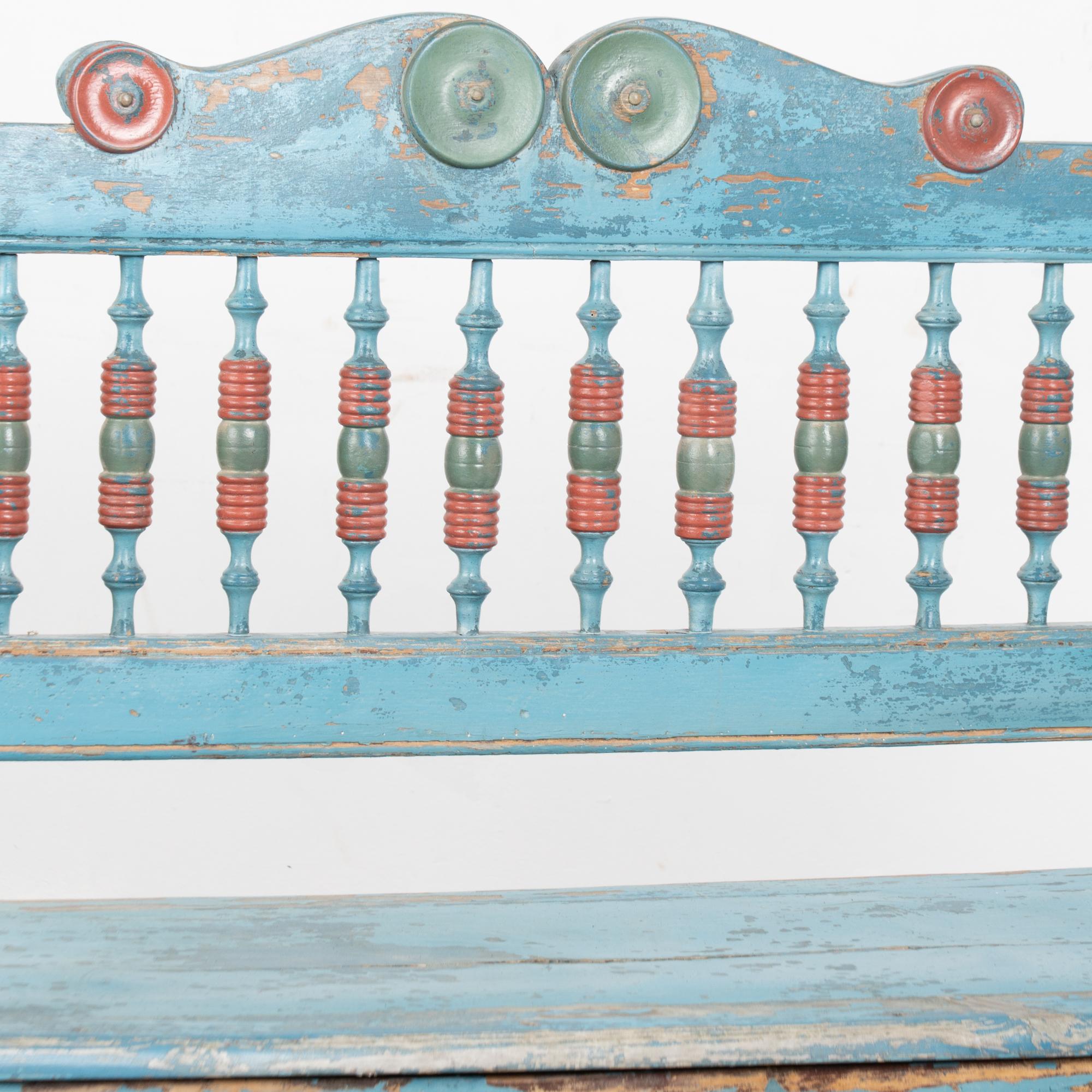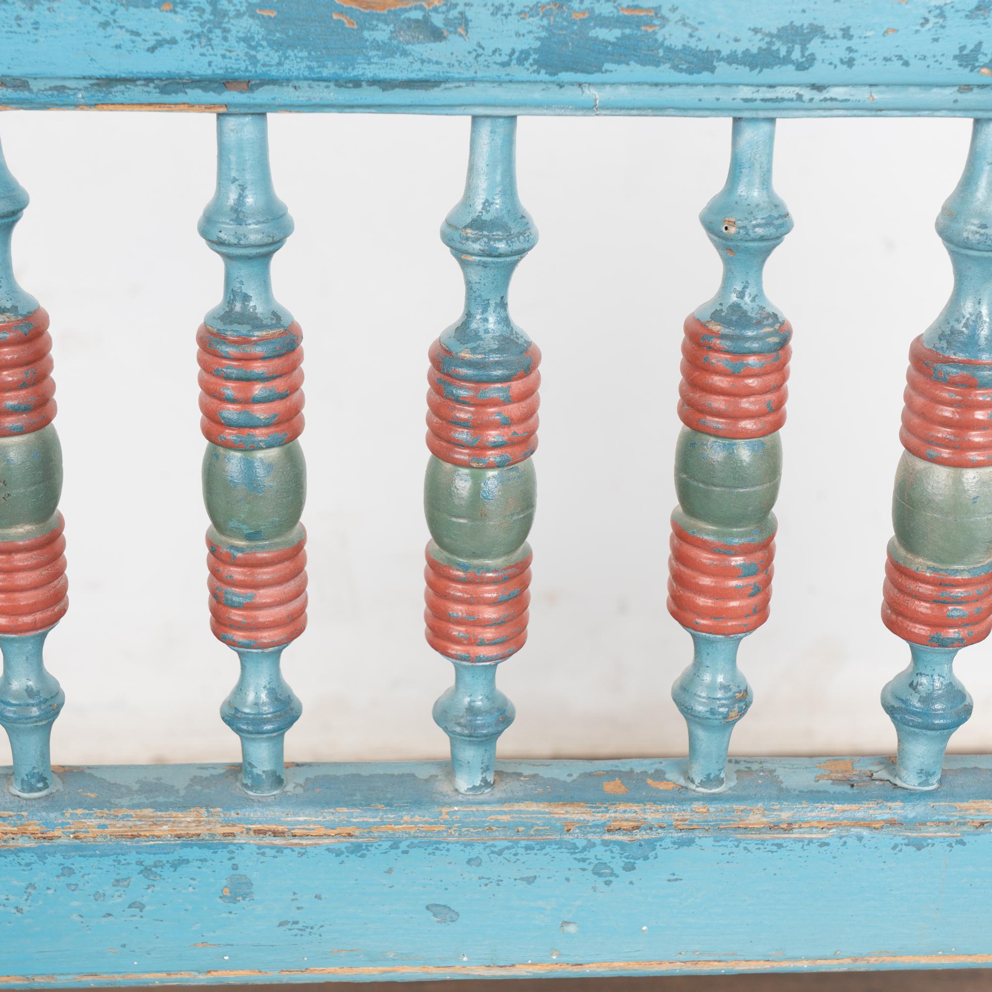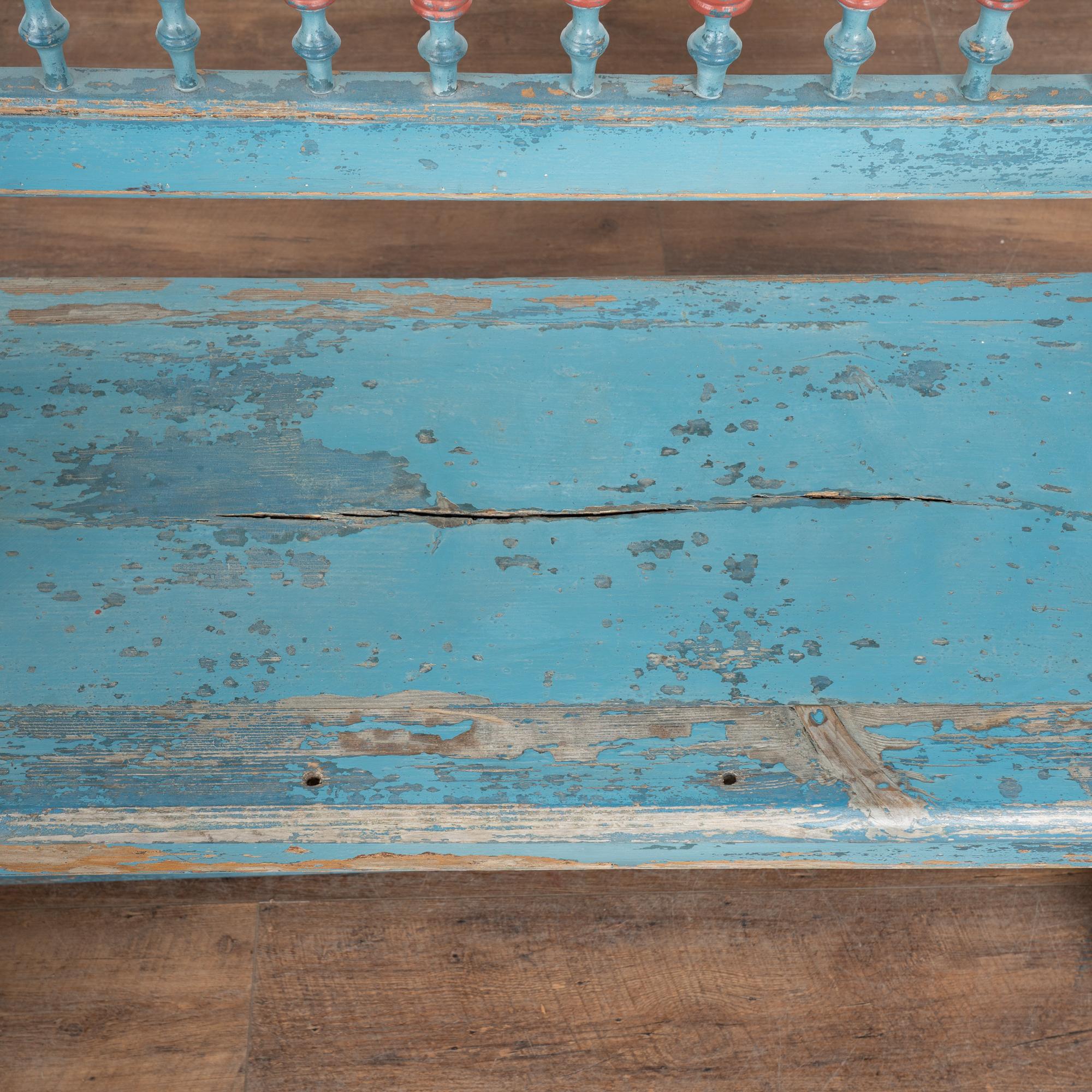 Fun and festive original blue painted bench that has been naturally worn and distressed over time revealing the natural pine below, all adding to the character and charm of this delightful 3.5' long bench. Accent colors of red and green decorate the turned spindle back.