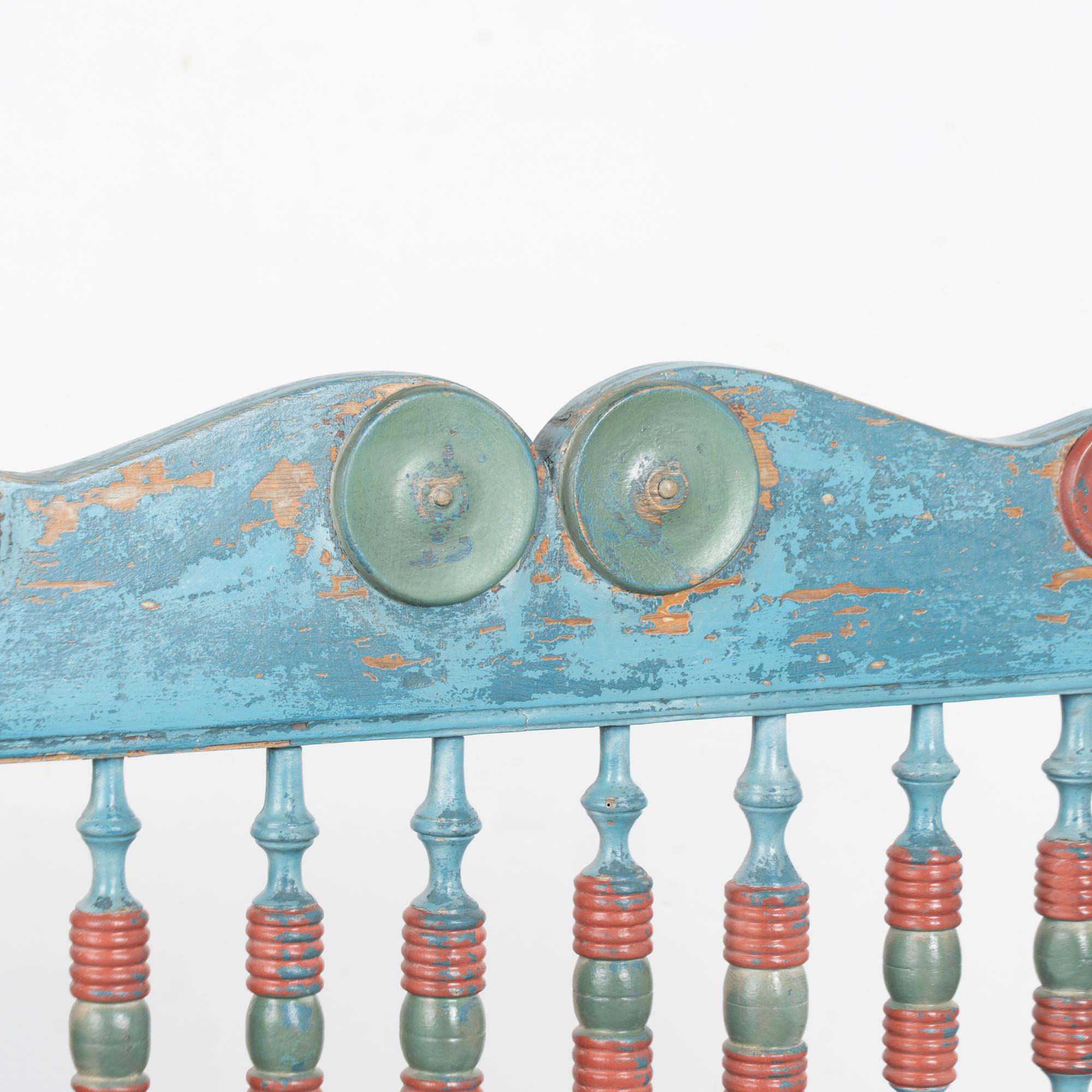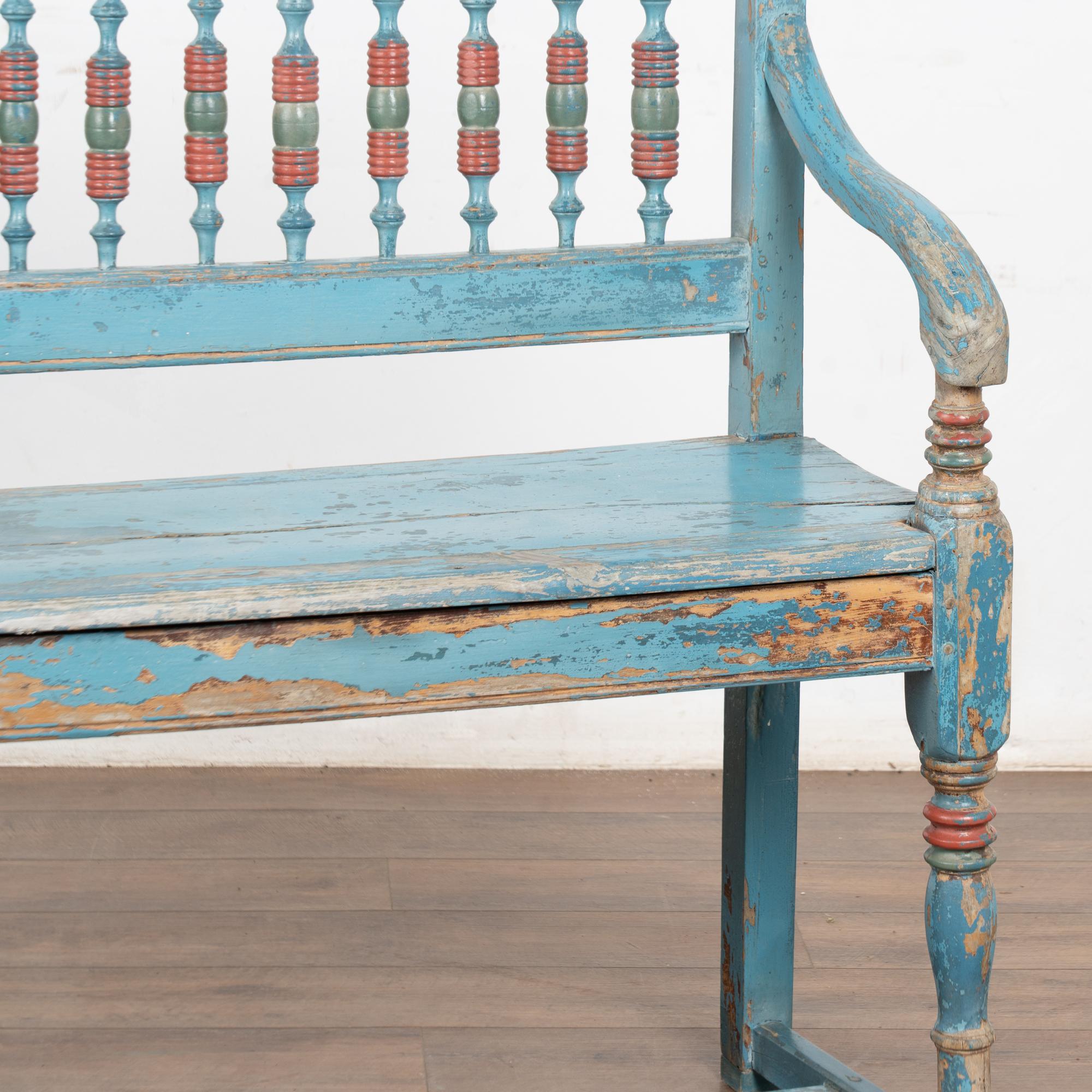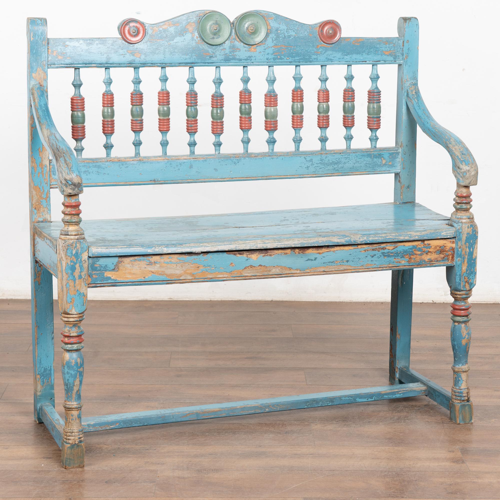 Fun and festive original blue painted bench that has been naturally worn and distressed over time revealing the natural pine below, all adding to the character and charm of this delightful 3.5' long bench. Accent colors of red and green decorate the turned spindle back.