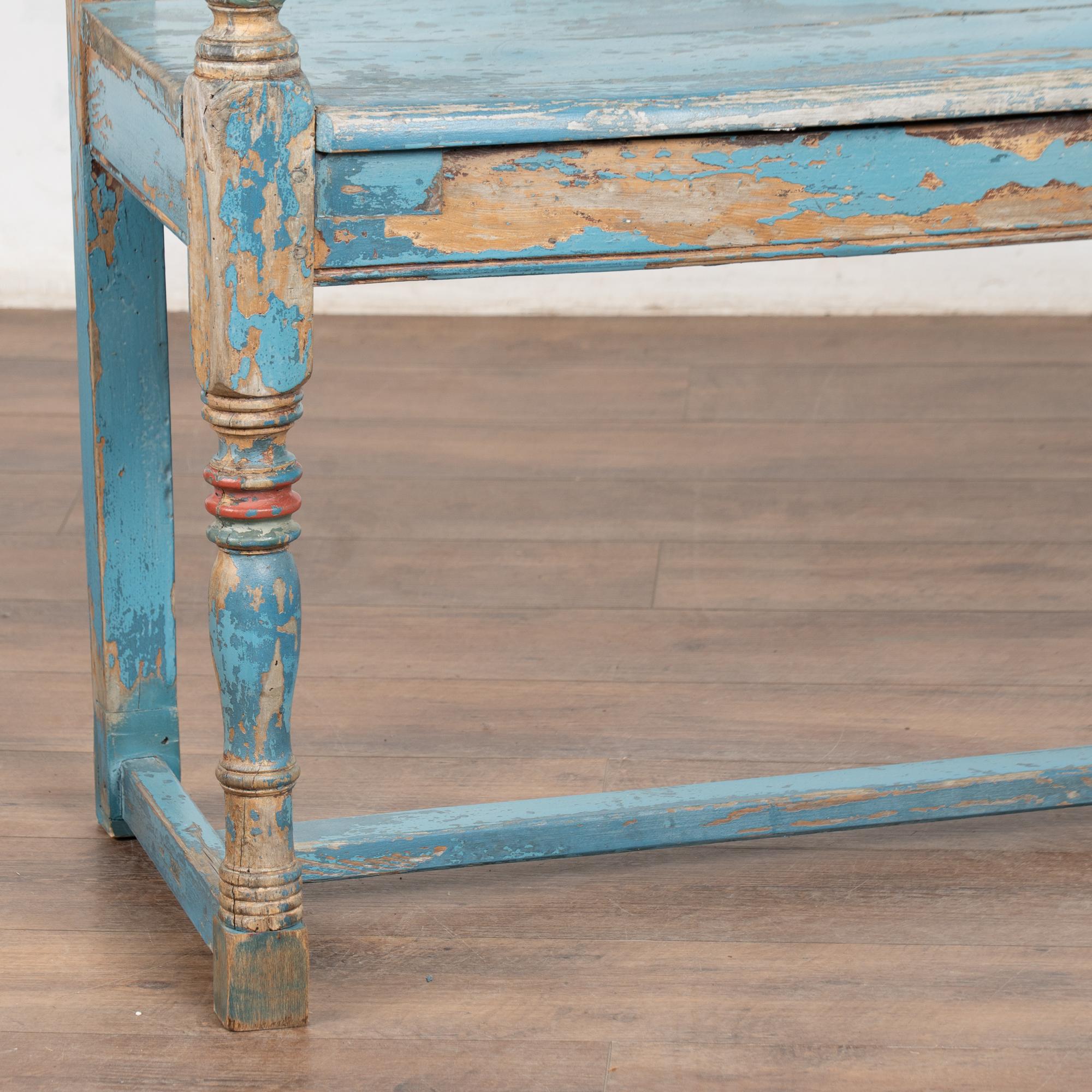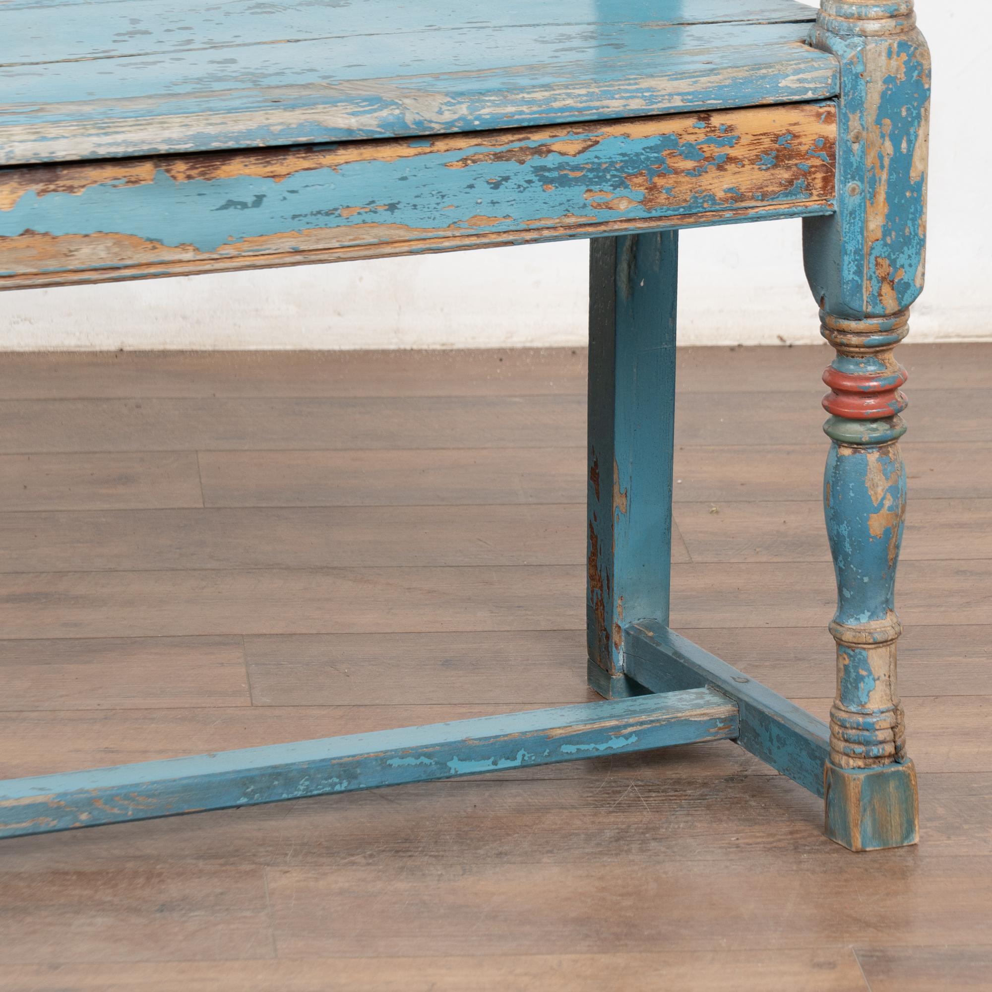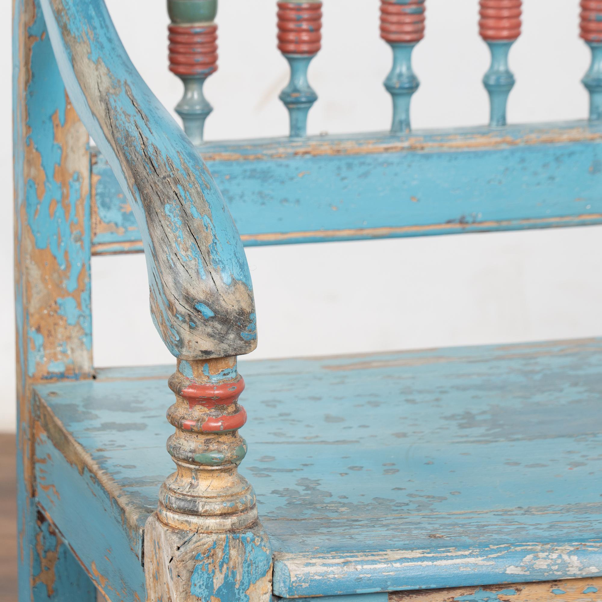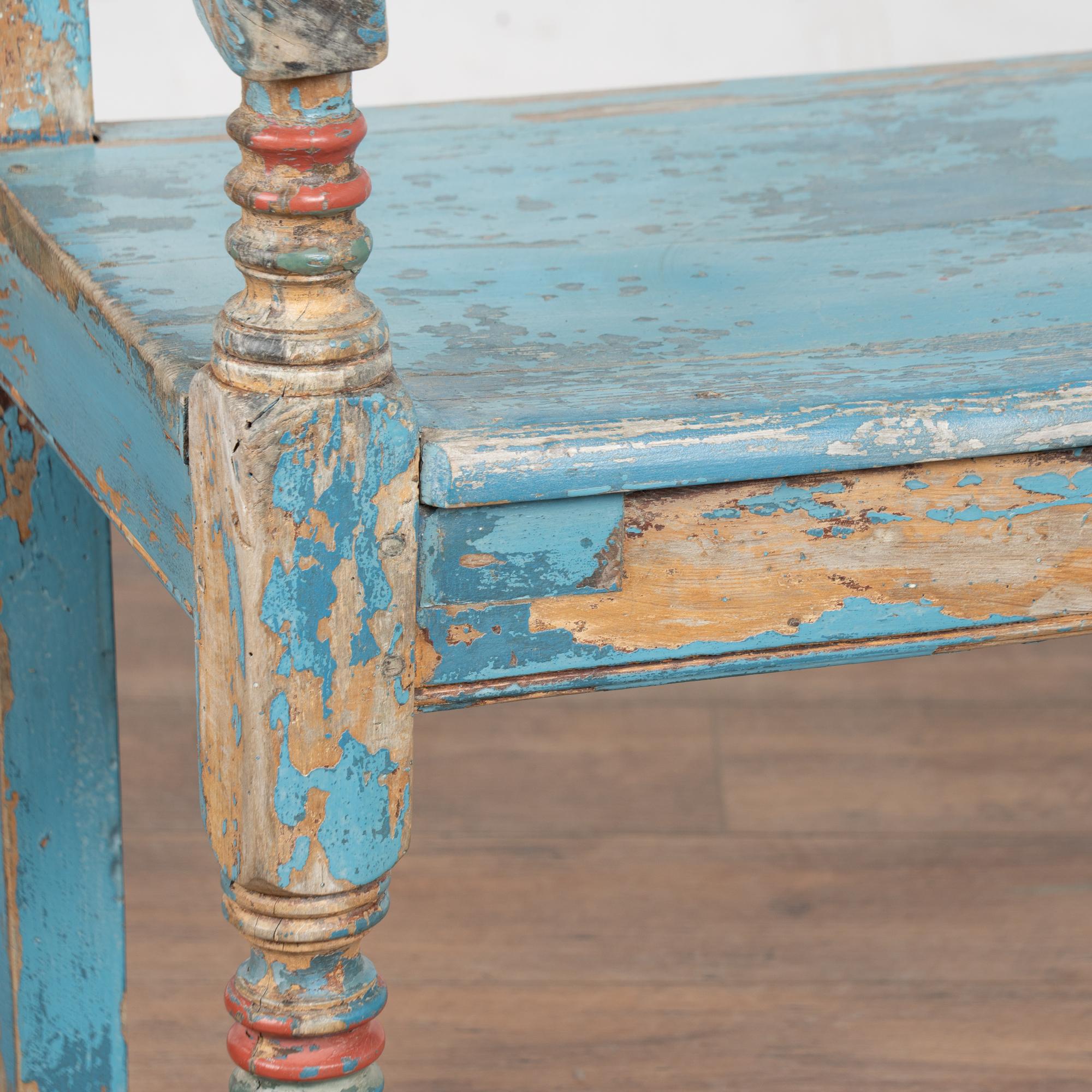 Fun and festive original blue painted bench that has been naturally worn and distressed over time revealing the natural pine below, all adding to the character and charm of this delightful 3.5' long bench. Accent colors of red and green decorate the turned spindle back.