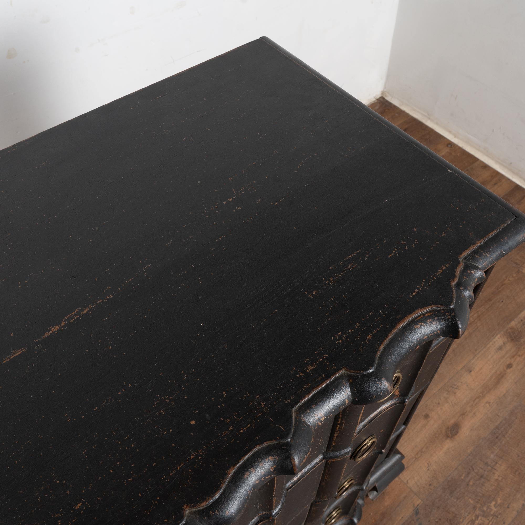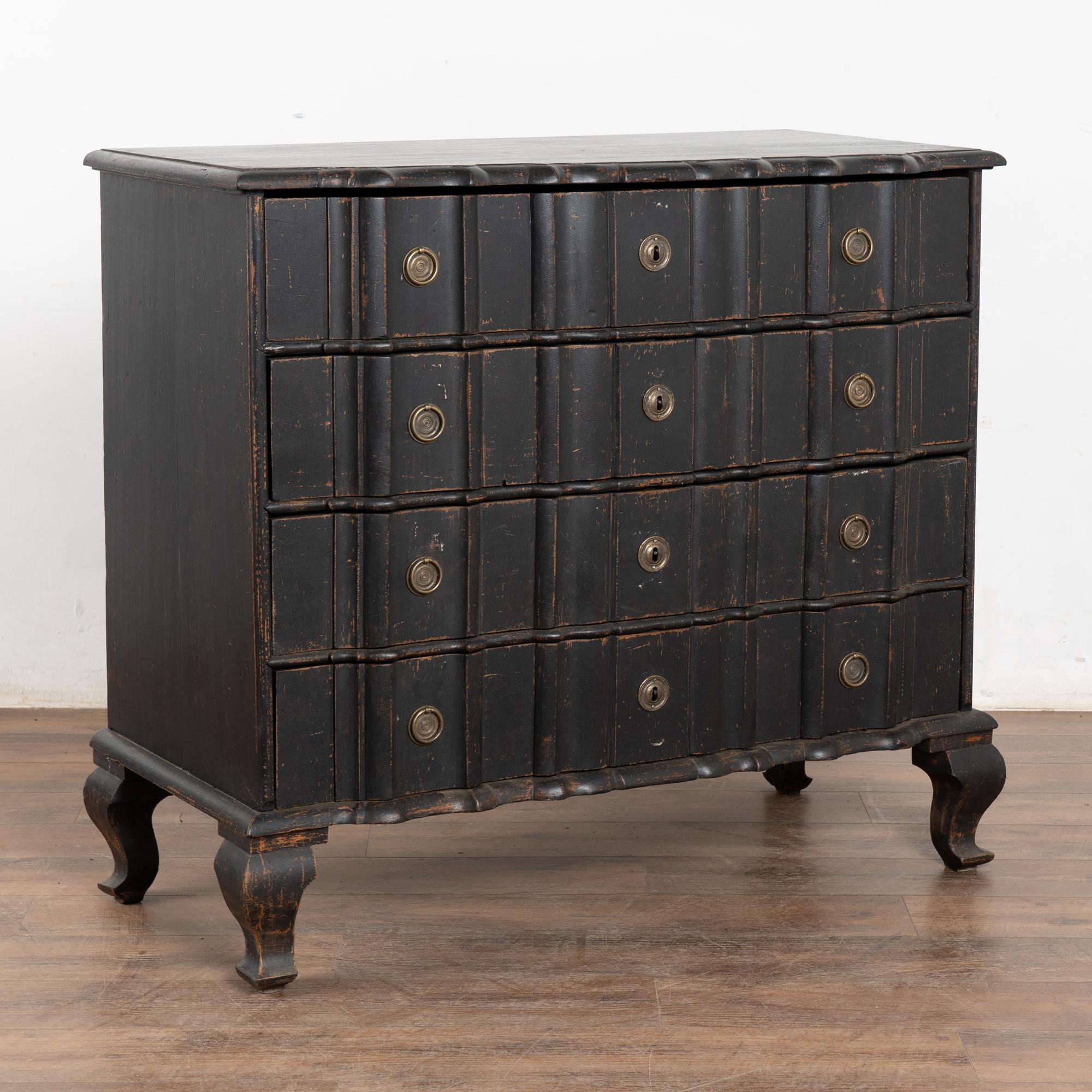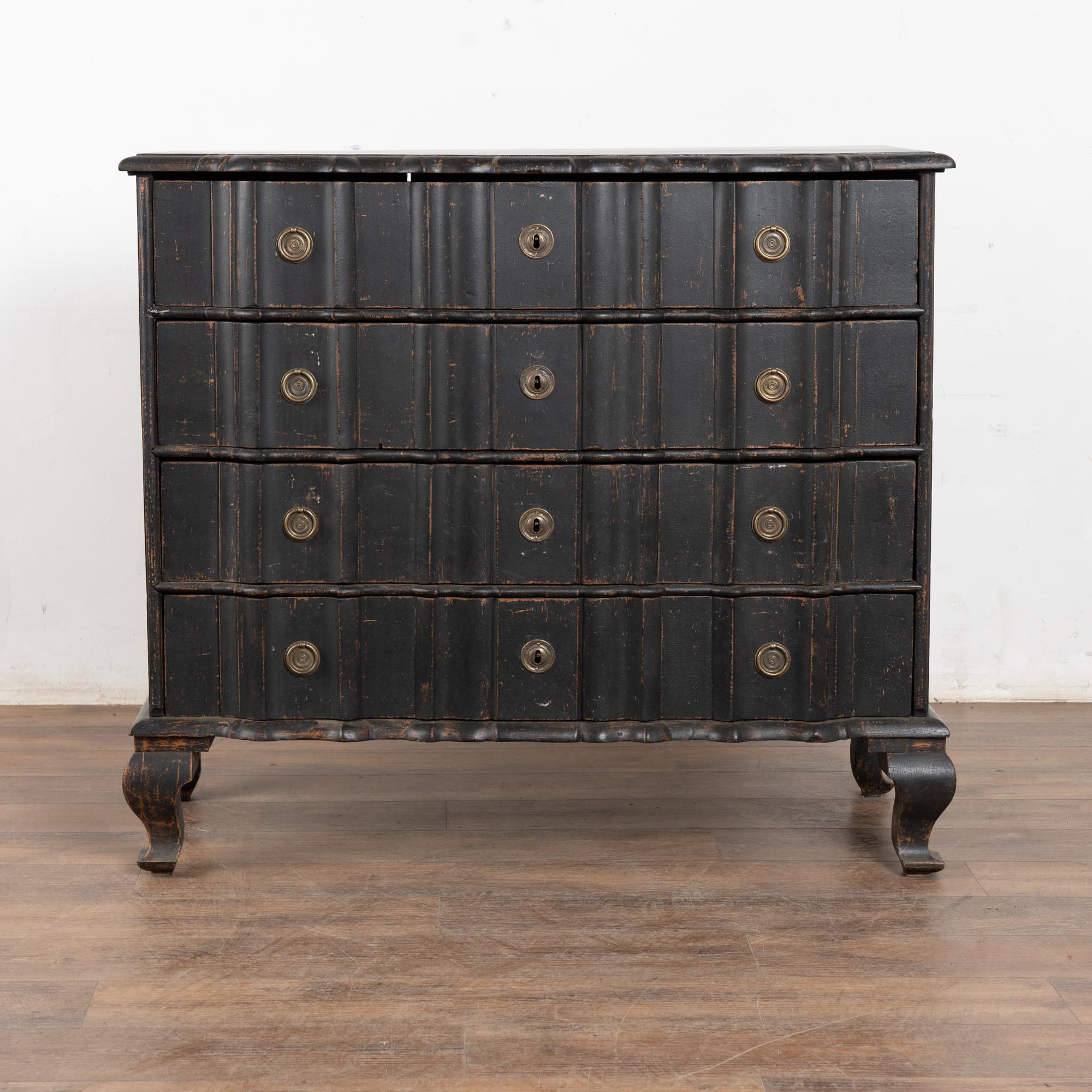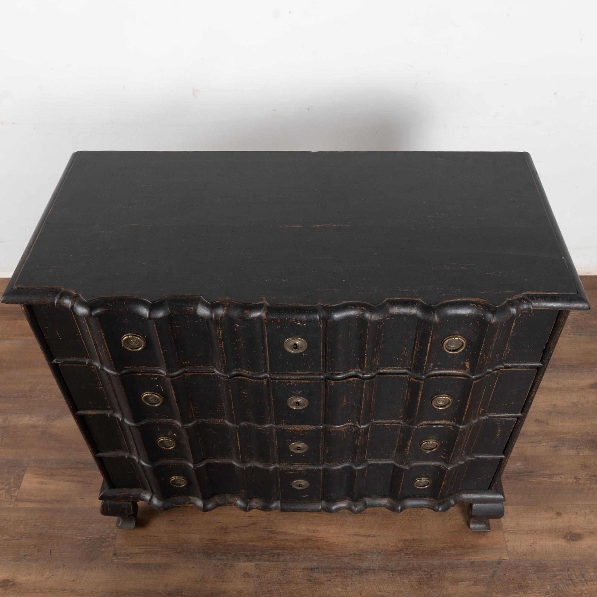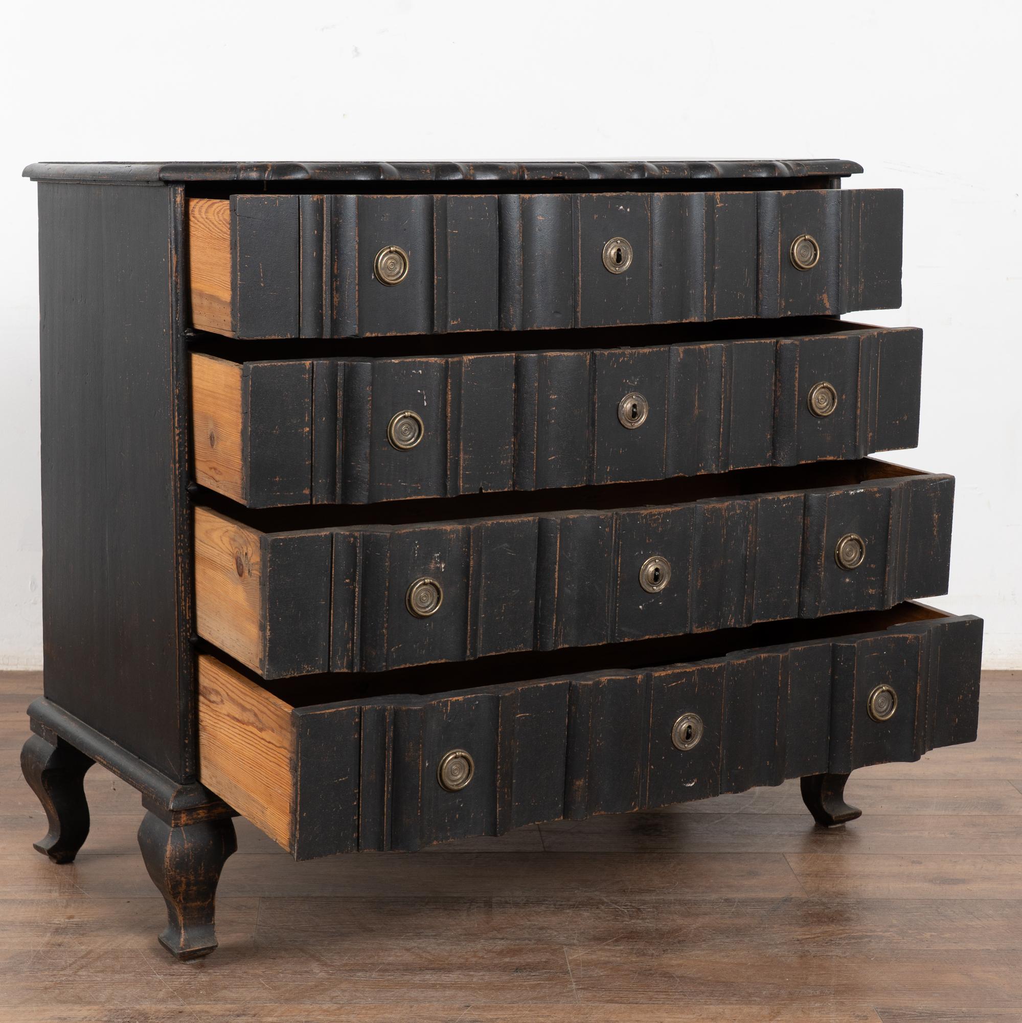 The black painted finish is striking in this attractive large chest of four drawers resting on scalloped skirt (mirroring top edge) and heavy cabriole feet.