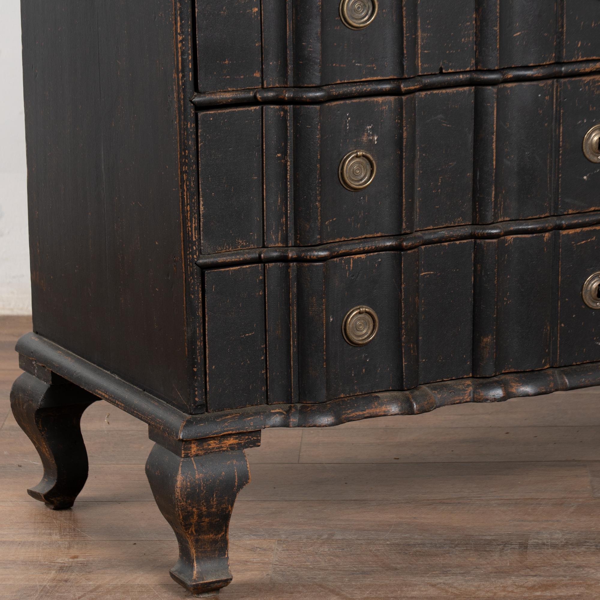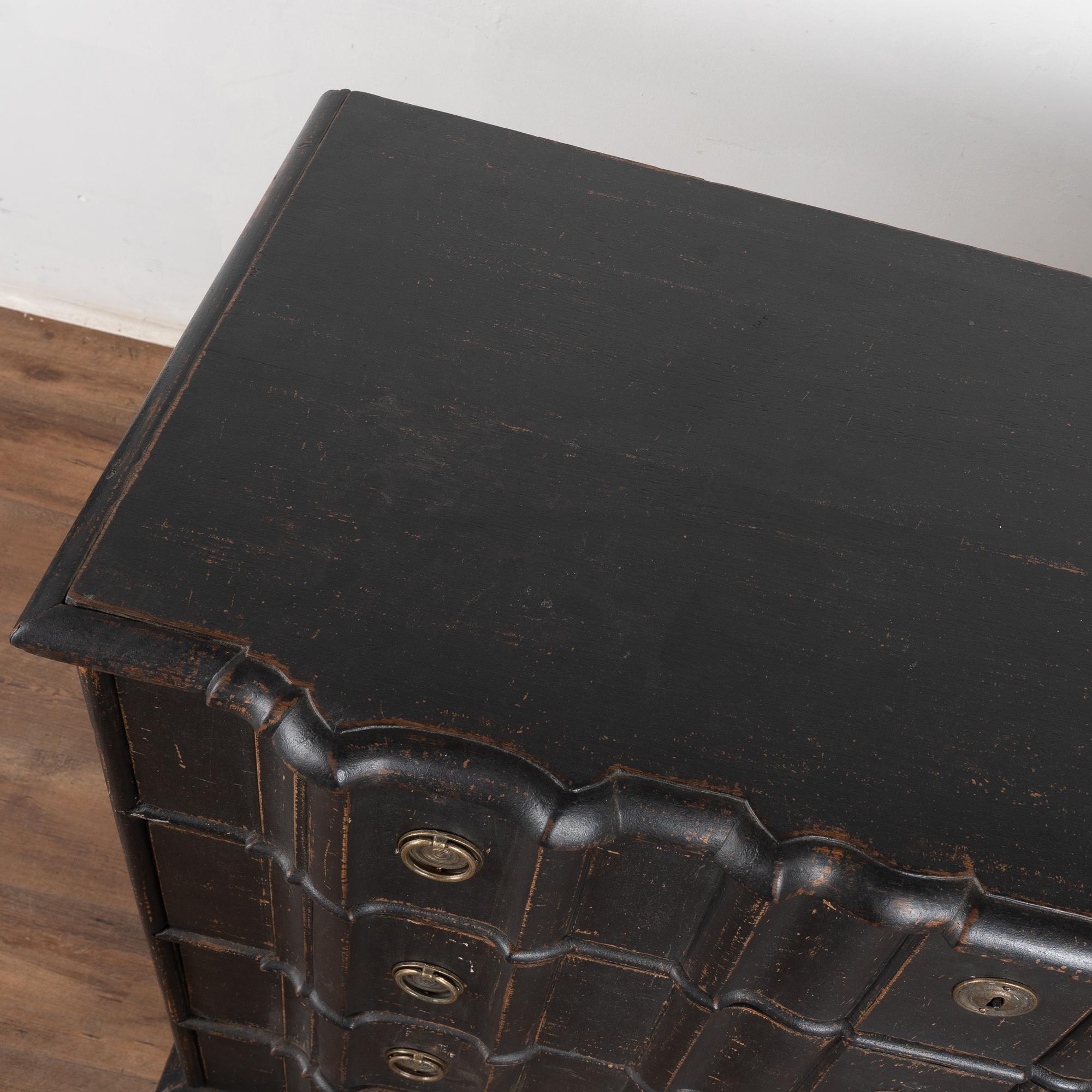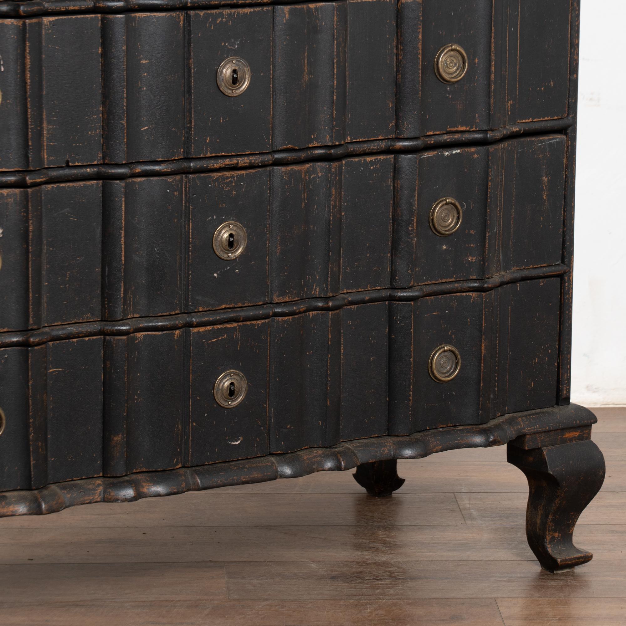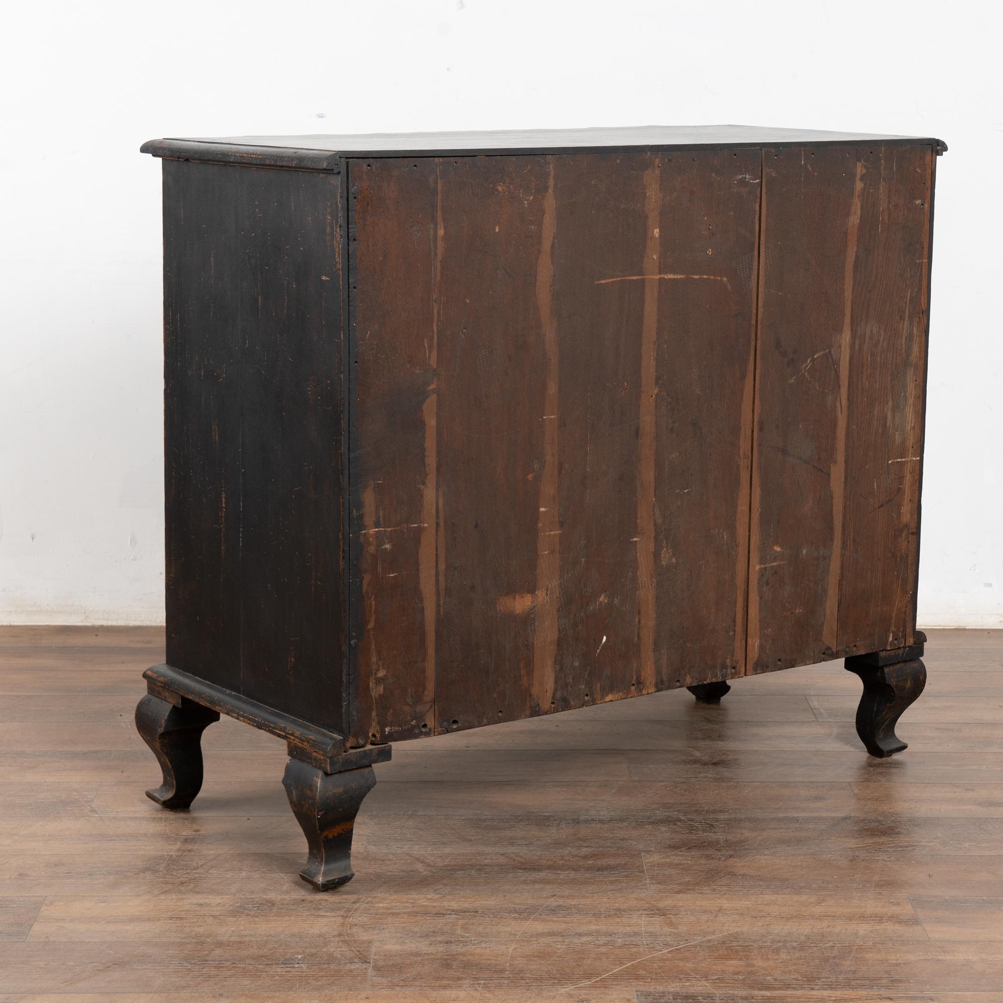 The black painted finish is striking in this attractive large chest of four drawers resting on scalloped skirt (mirroring top edge) and heavy cabriole feet.