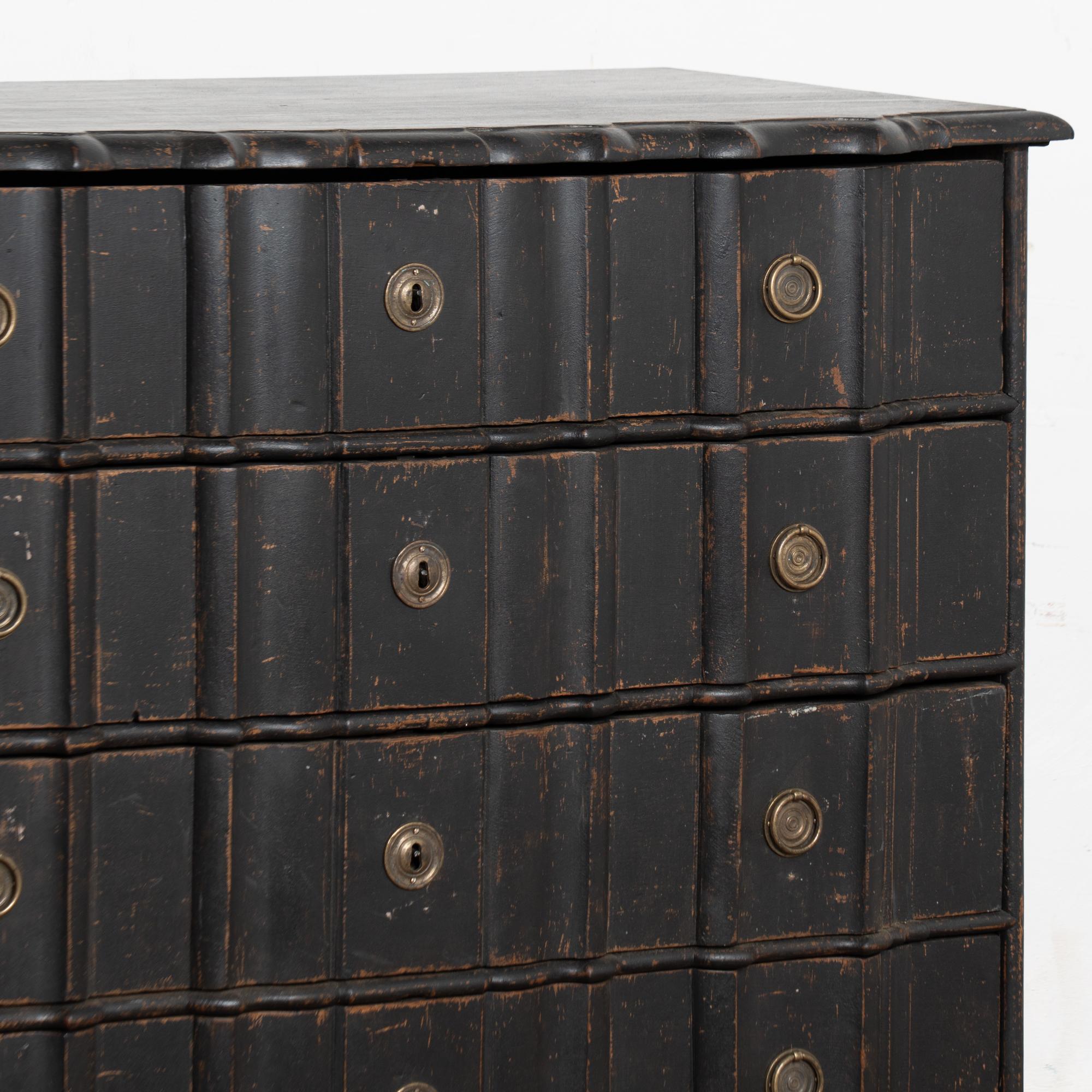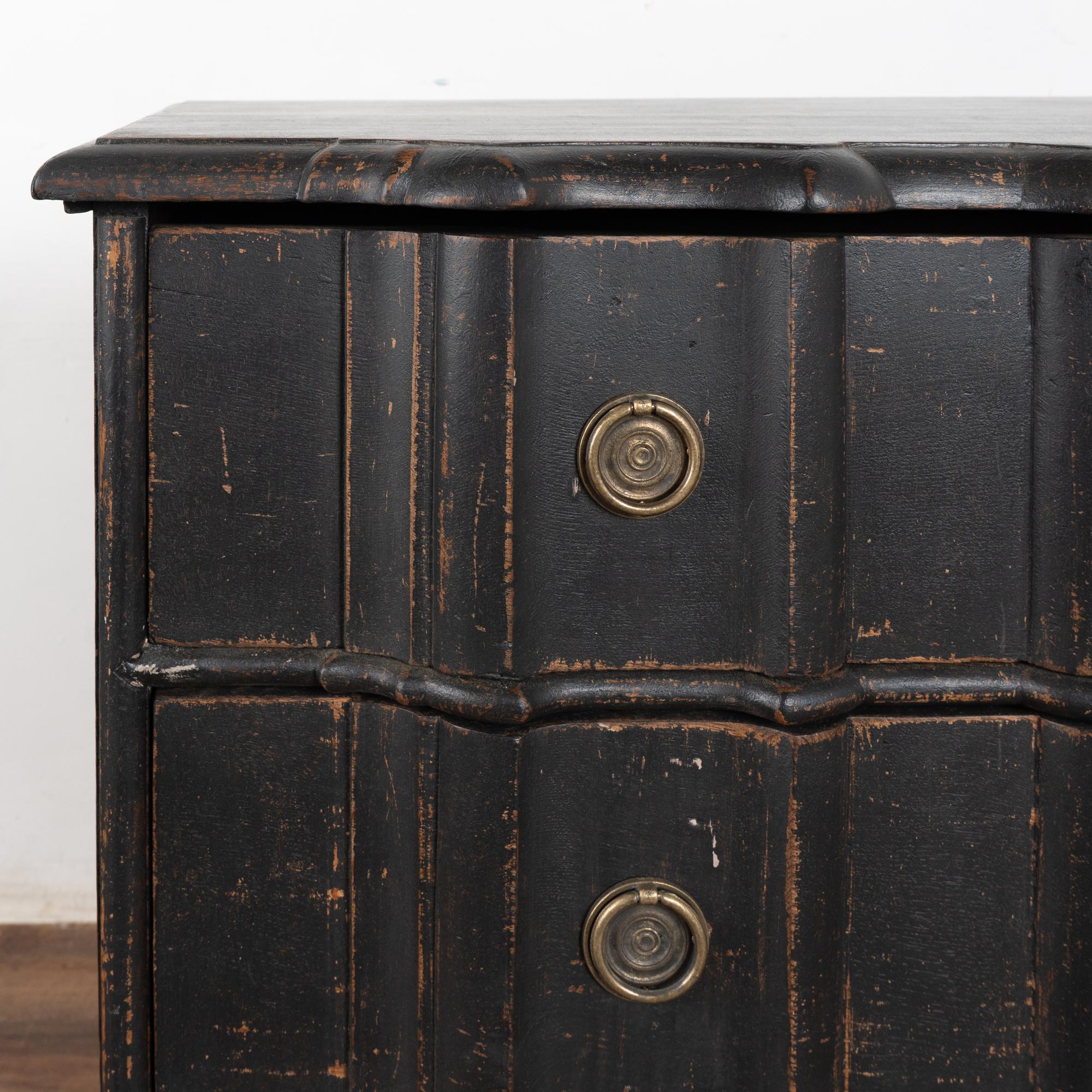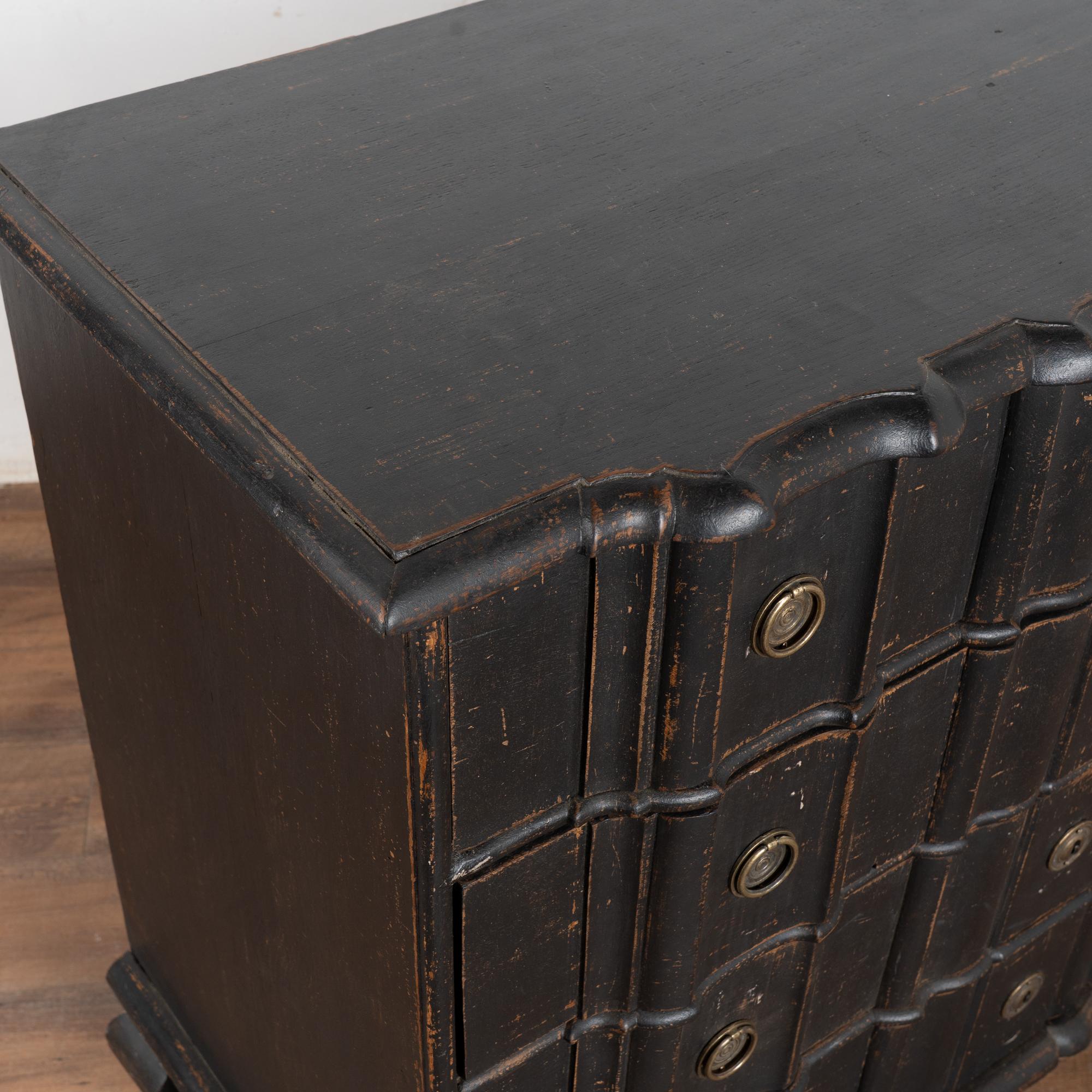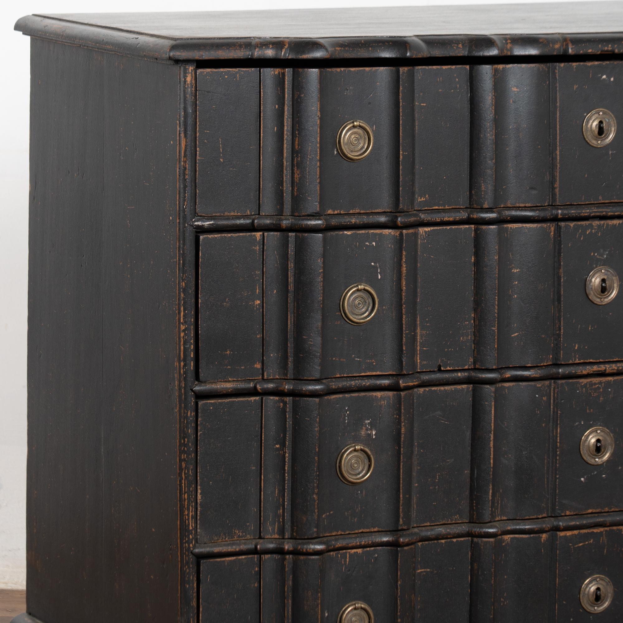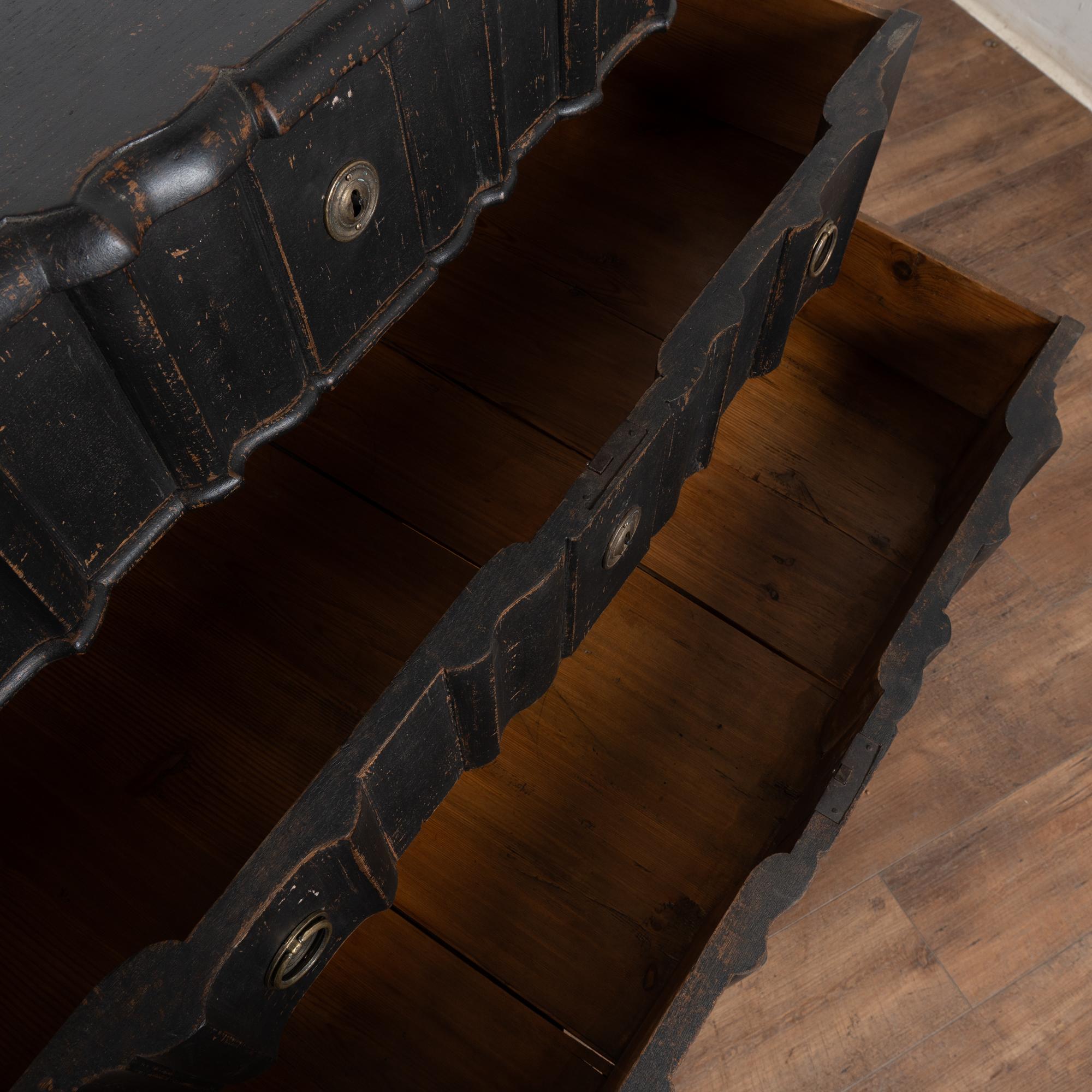 The black painted finish is striking in this attractive large chest of four drawers resting on scalloped skirt (mirroring top edge) and heavy cabriole feet.