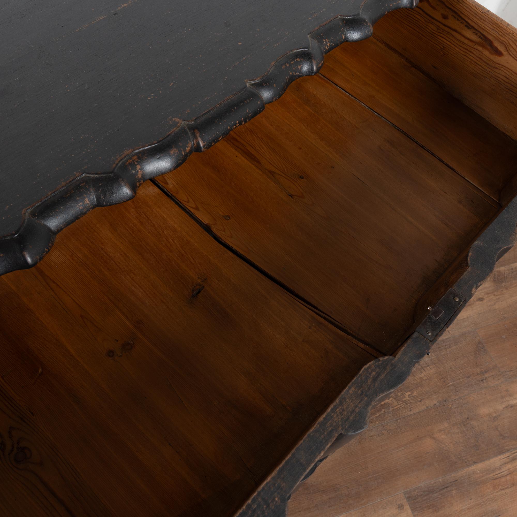 The layered black painted finish has been distressed, creating aged character while revealing the natural wood below.