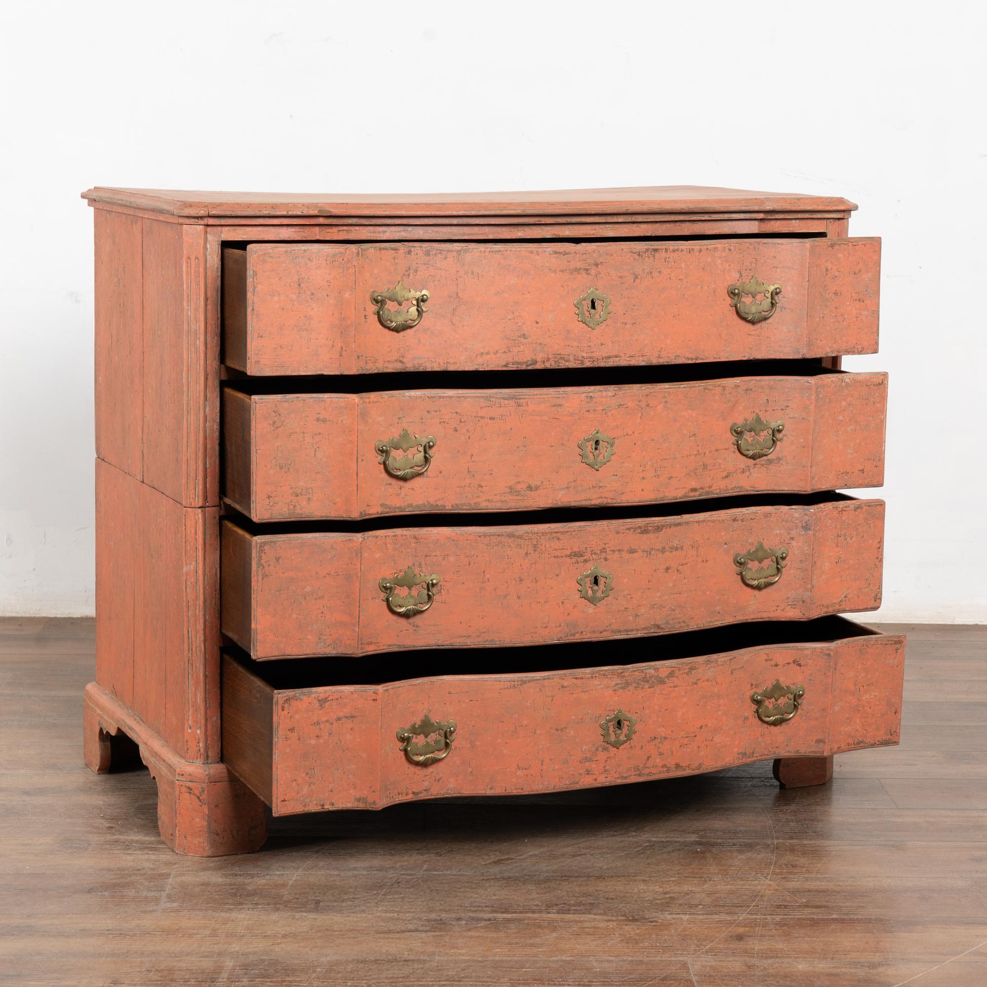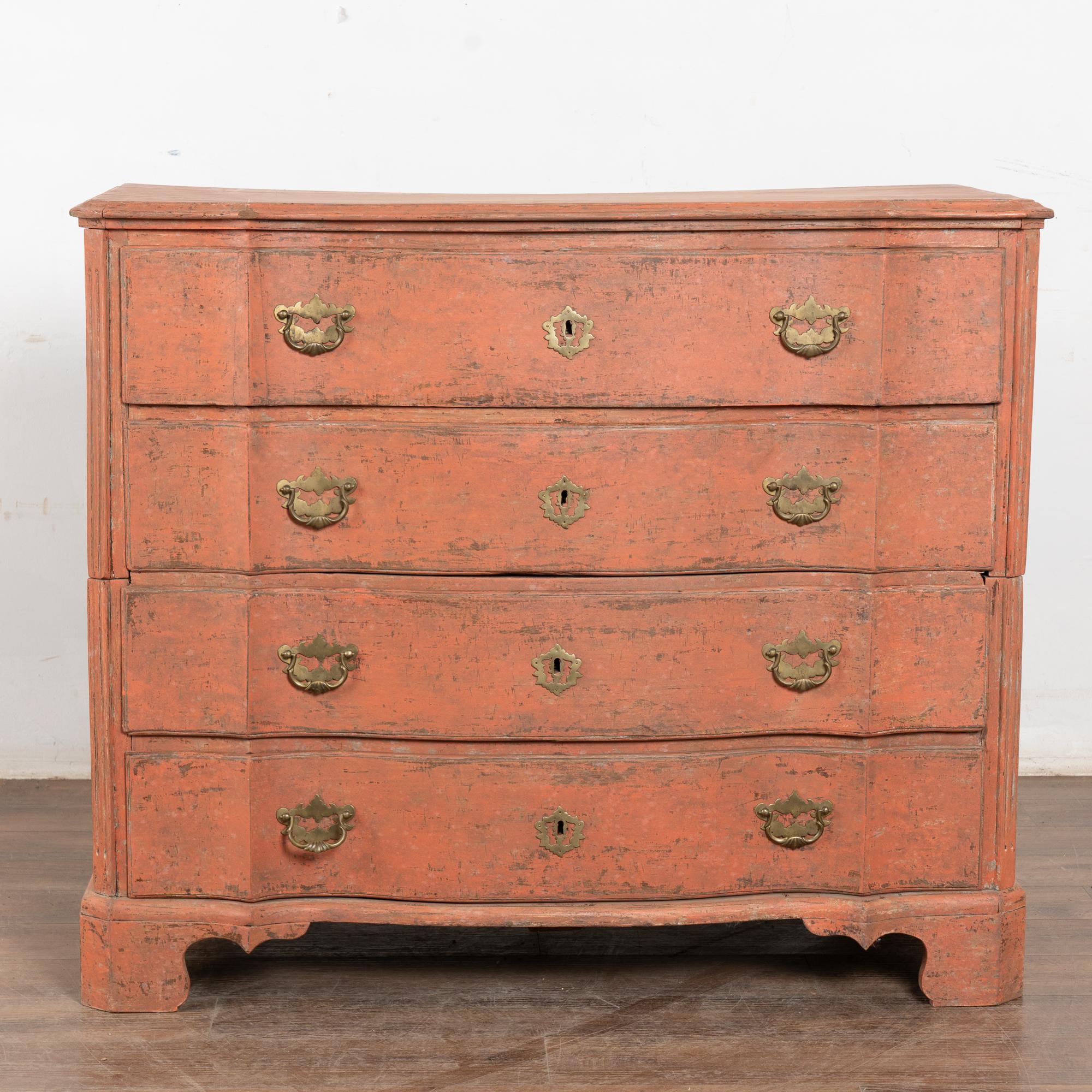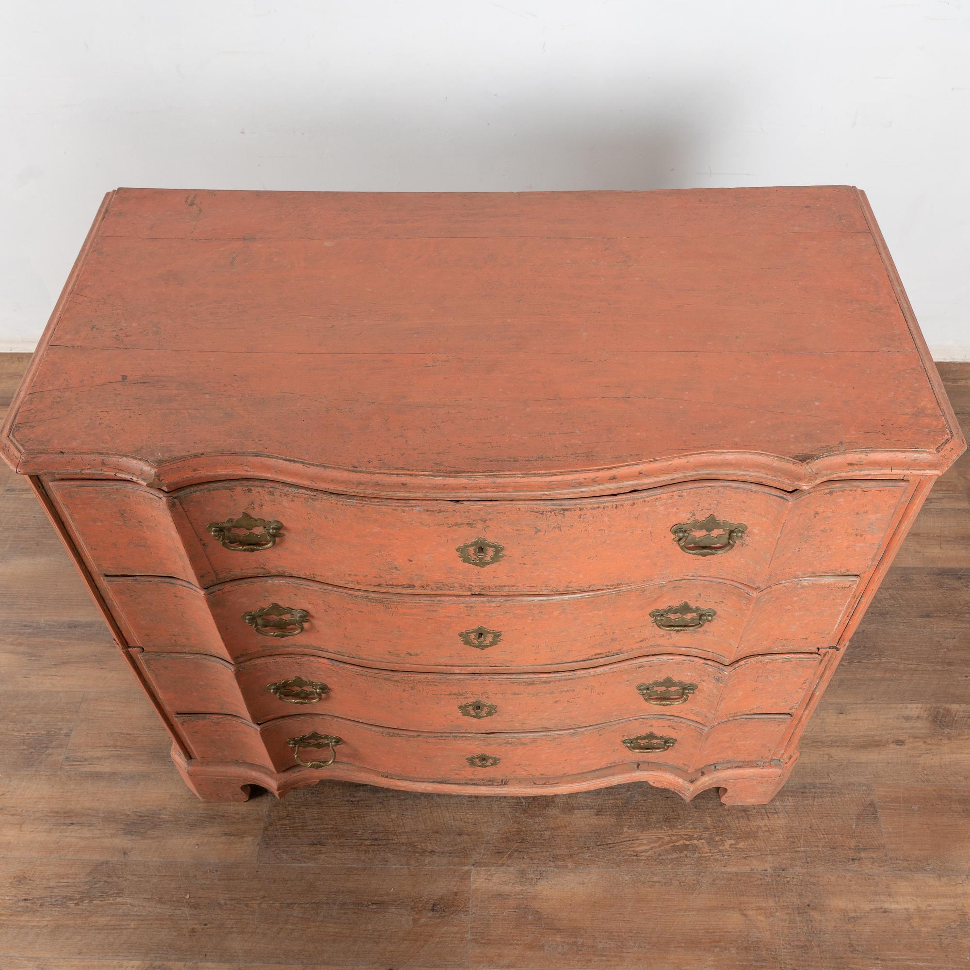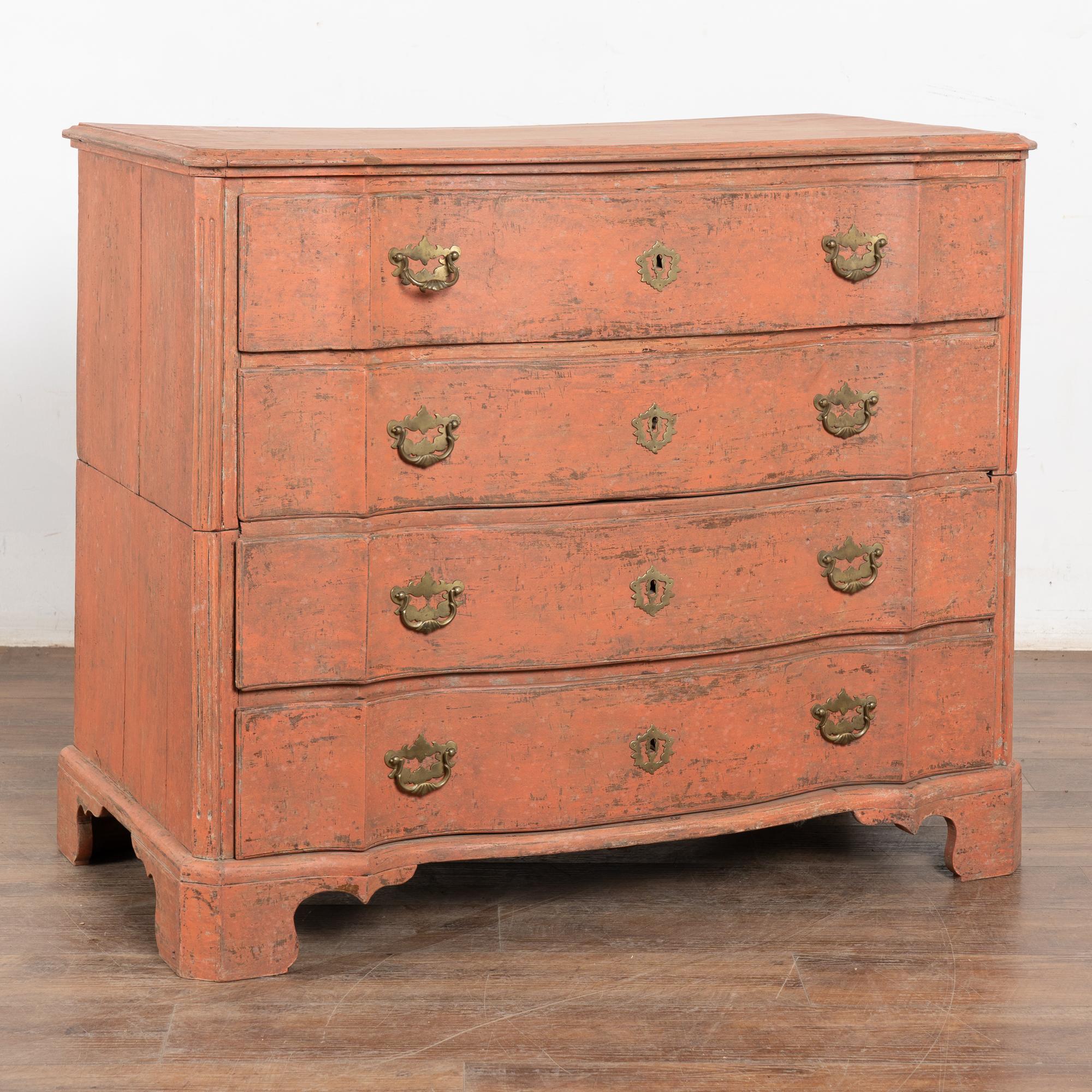 This rococo large oak chest of four drawers features a newer, professionally applied and layered salmon painted finish which is gently distressed, revealing the natural wood below while complimenting the age and curved lines of the chest.