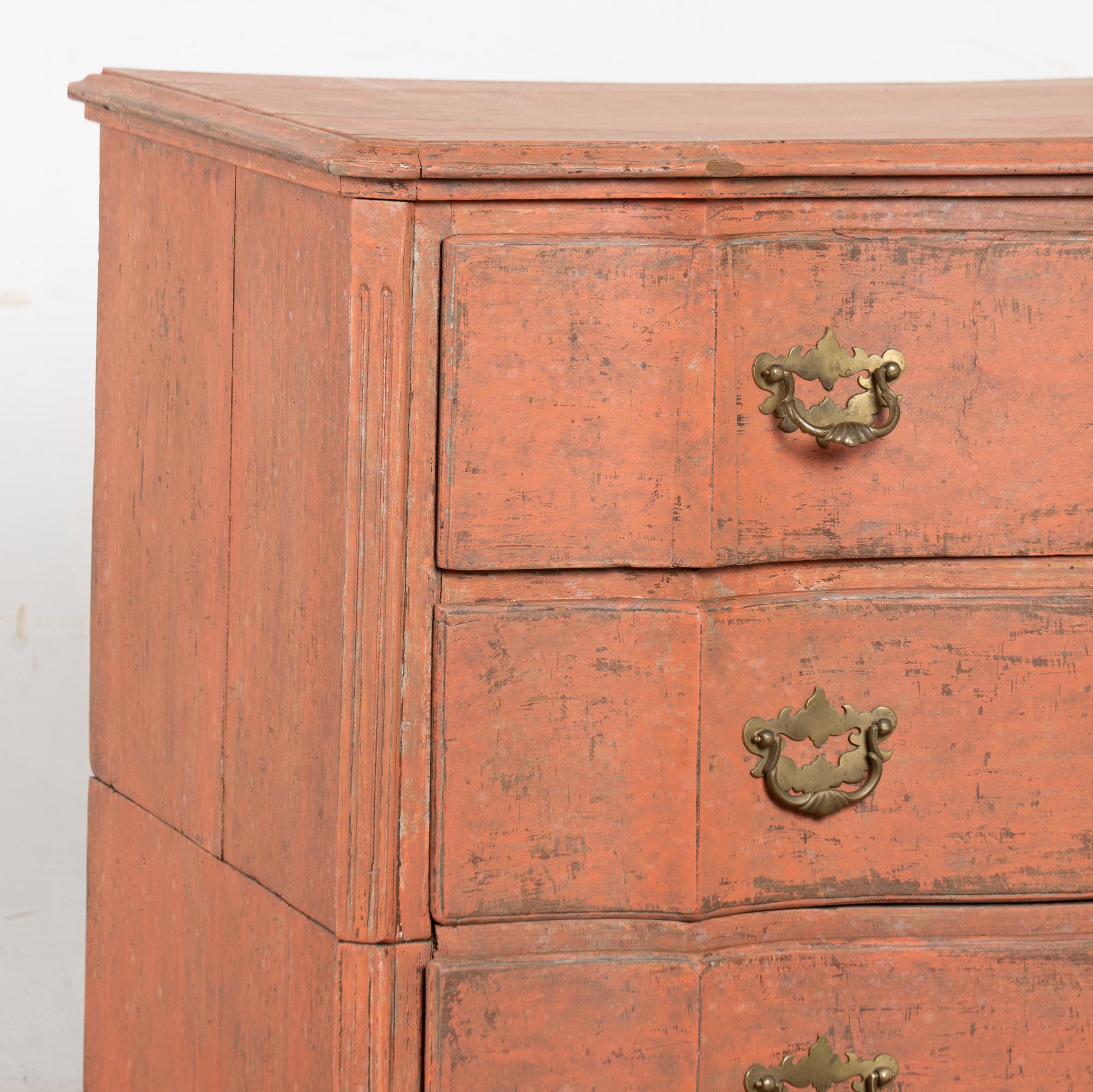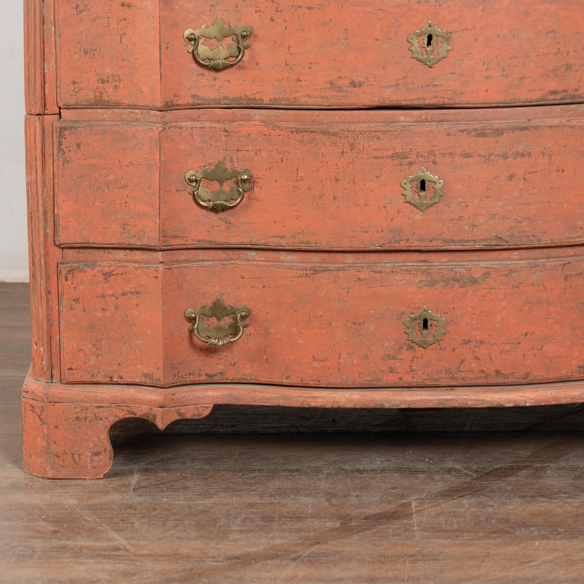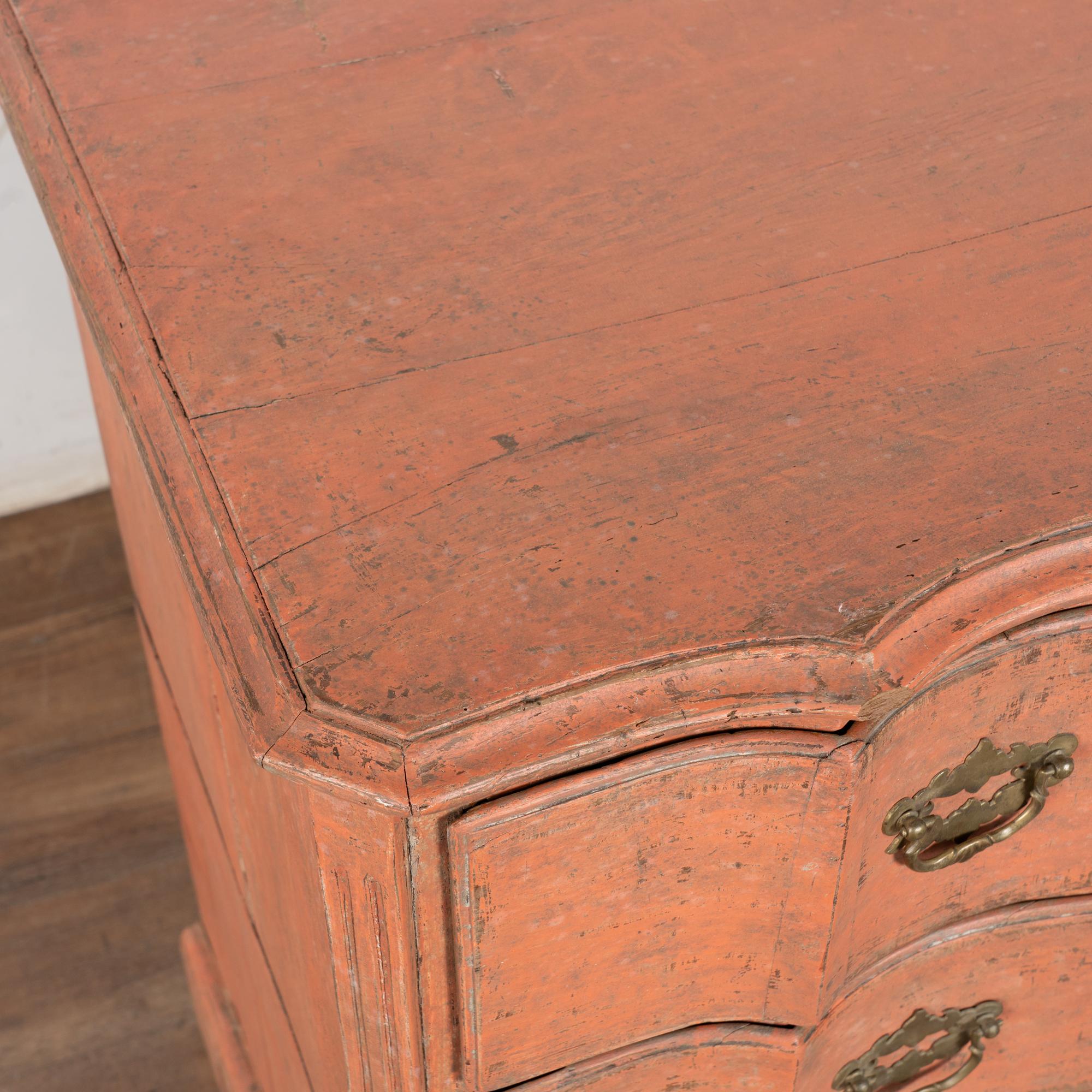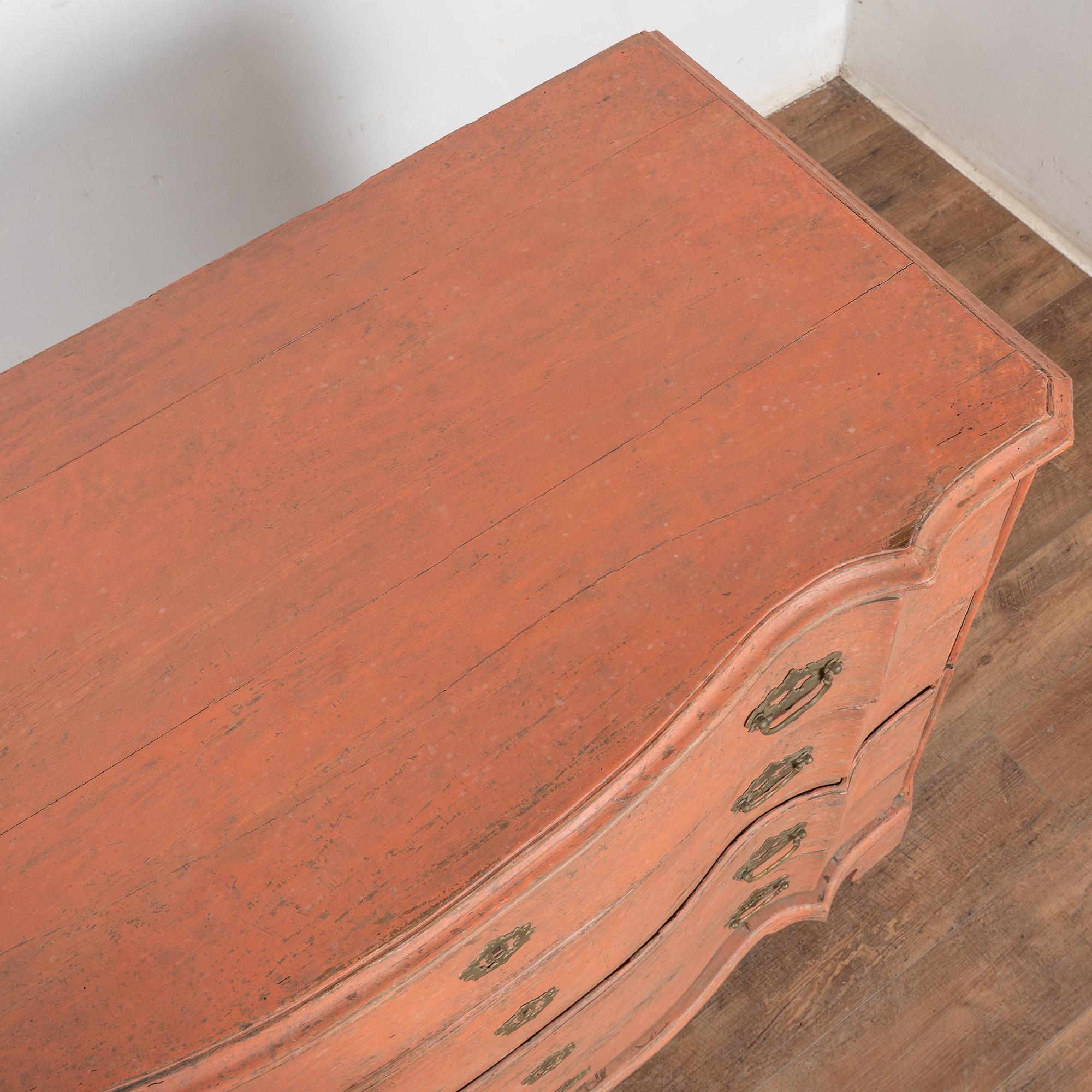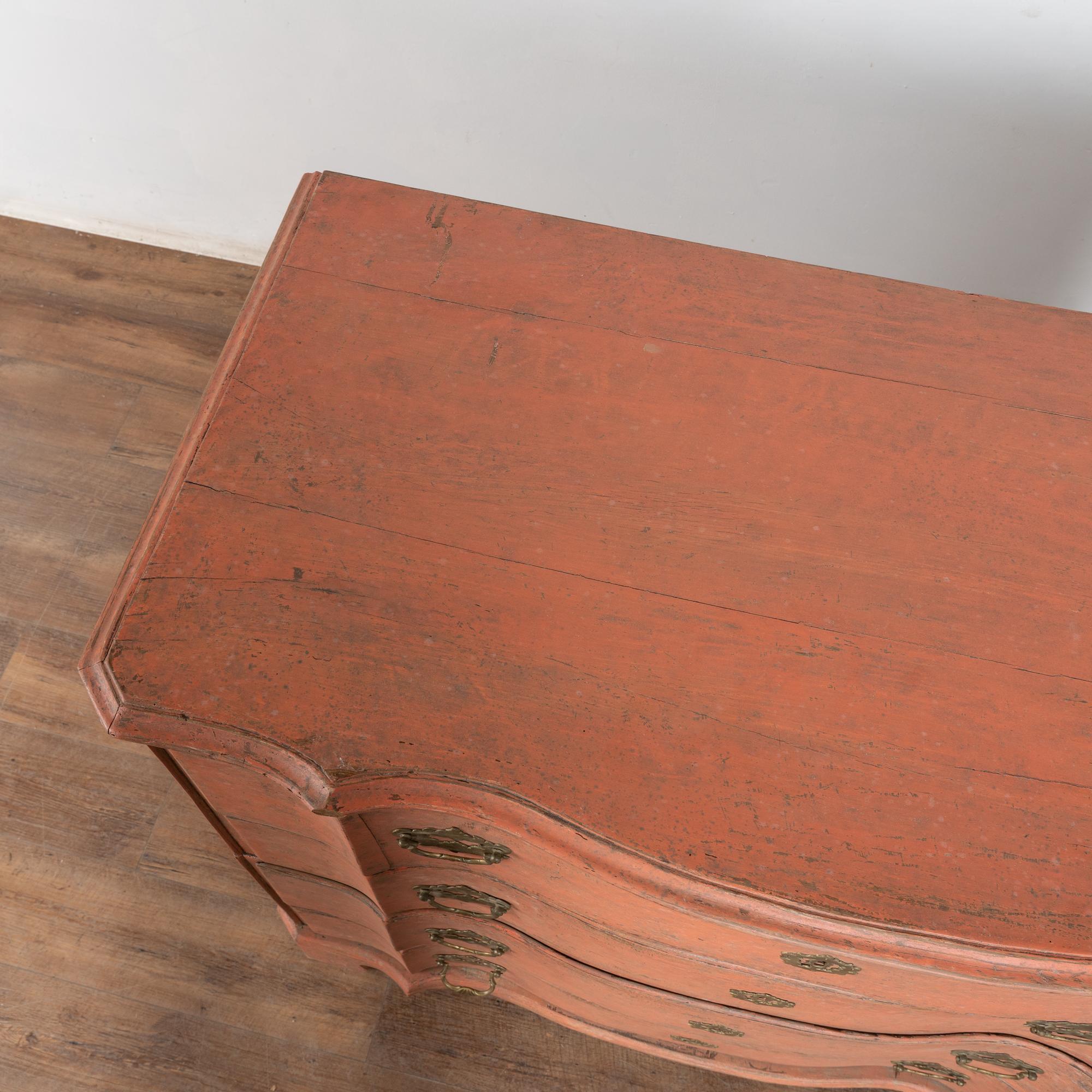 This rococo large oak chest of four drawers features a newer, professionally applied and layered salmon painted finish which is gently distressed, revealing the natural wood below while complimenting the age and curved lines of the chest.