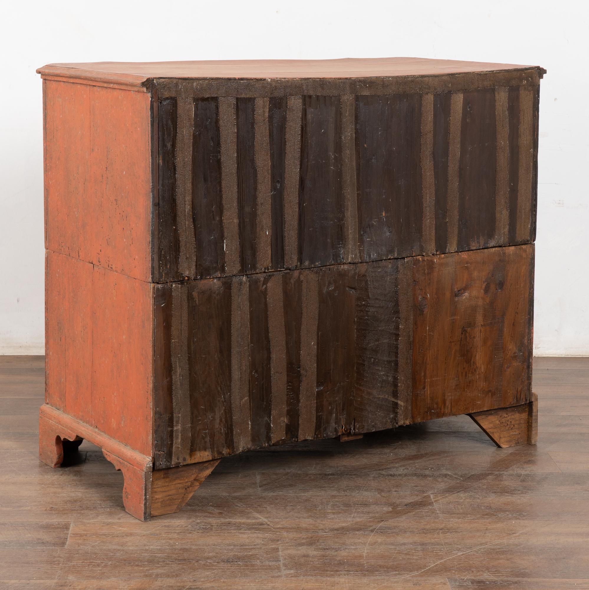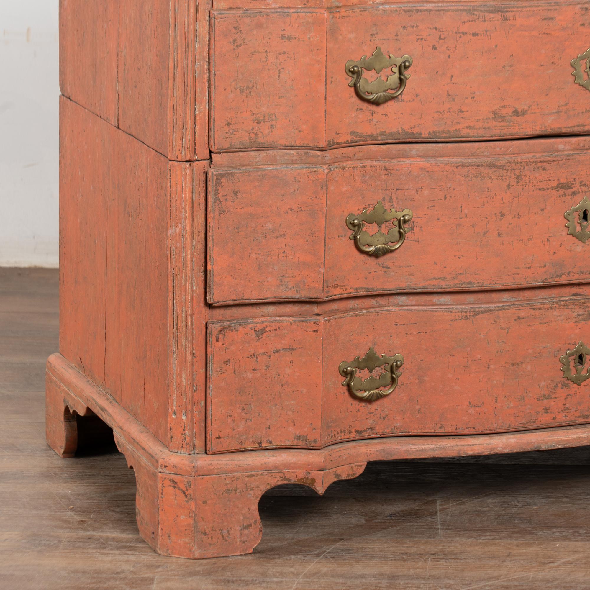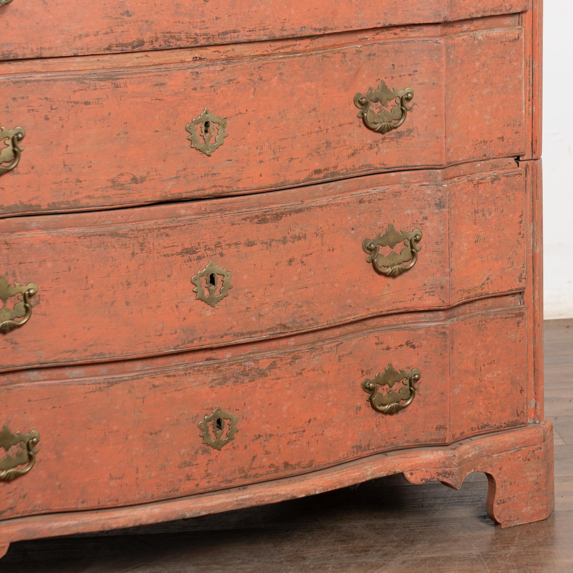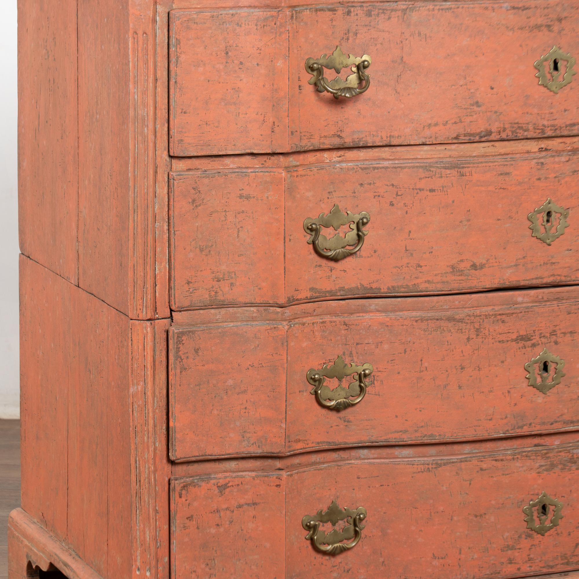 This rococo large oak chest of four drawers features a newer, professionally applied and layered salmon painted finish which is gently distressed, revealing the natural wood below while complimenting the age and curved lines of the chest.