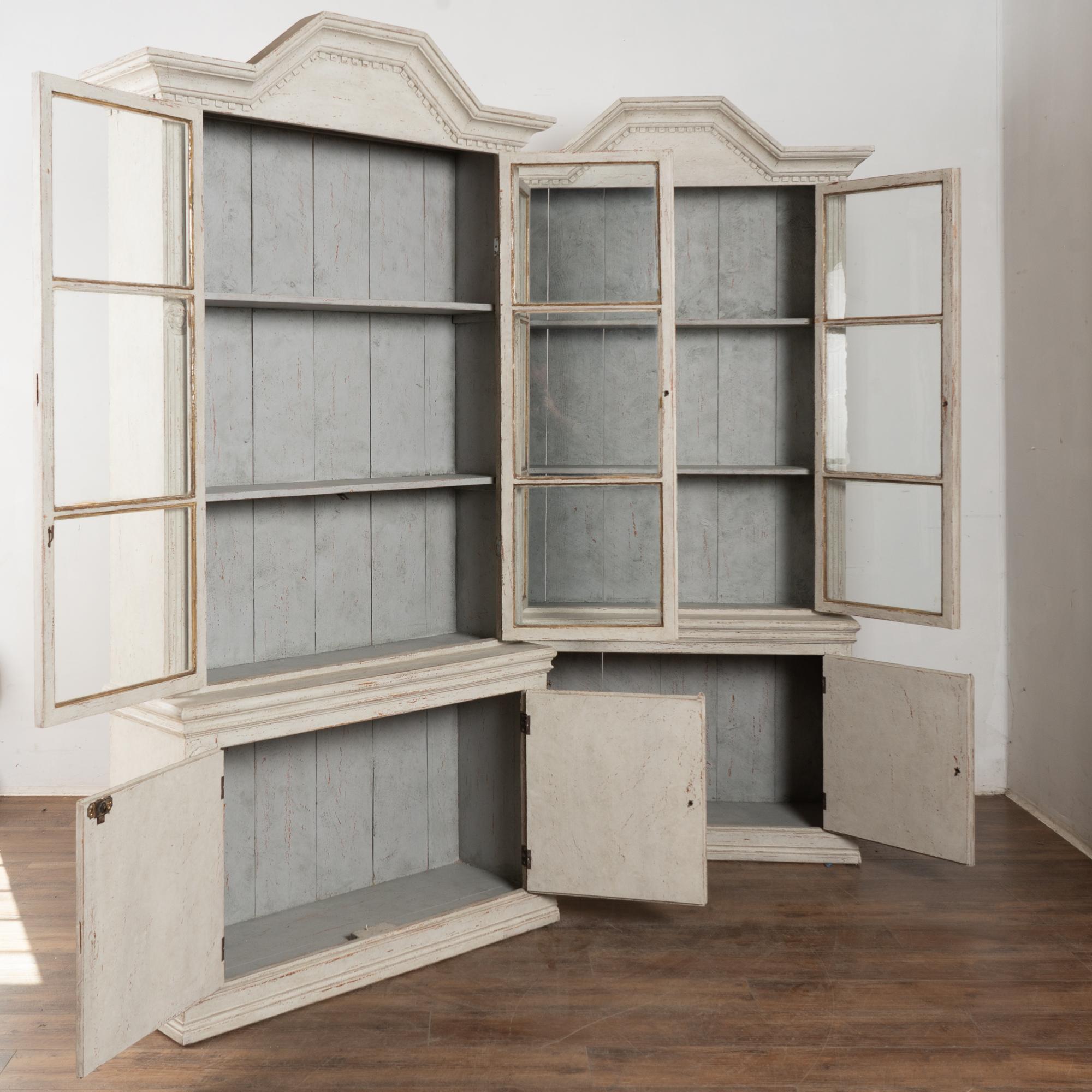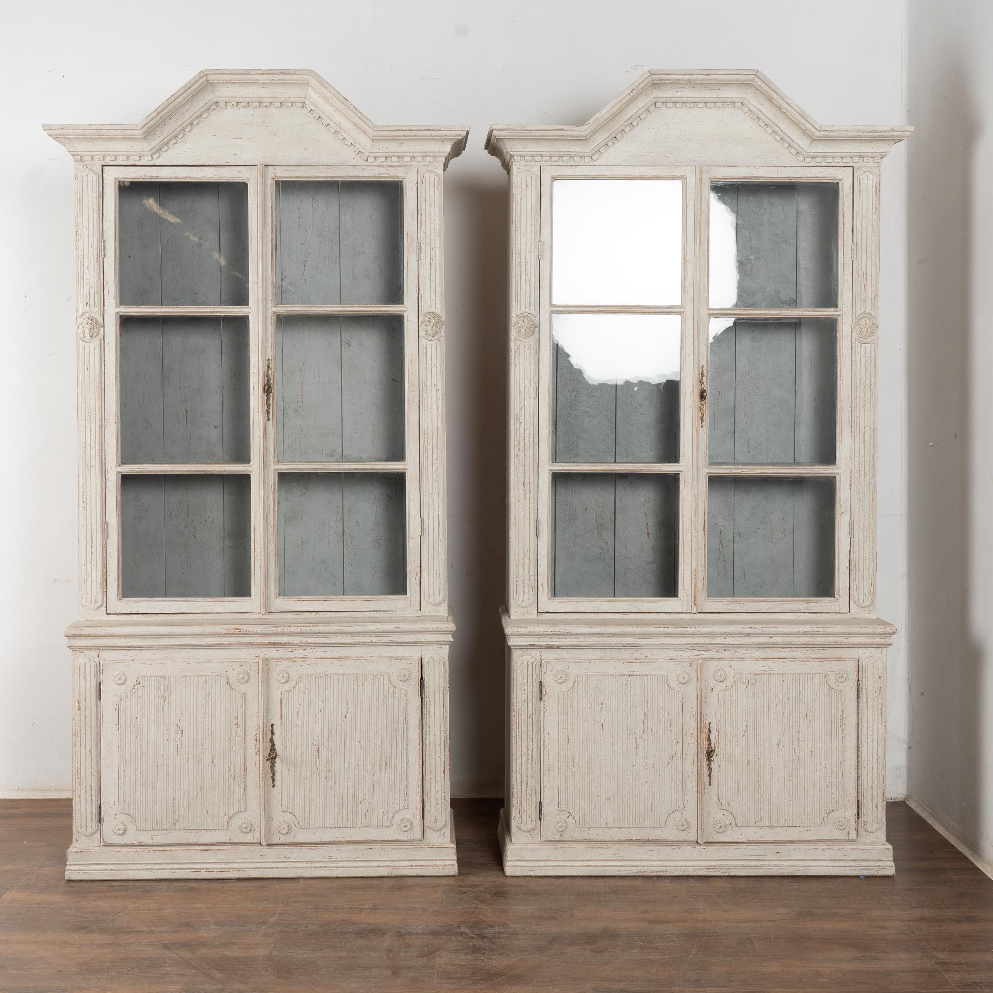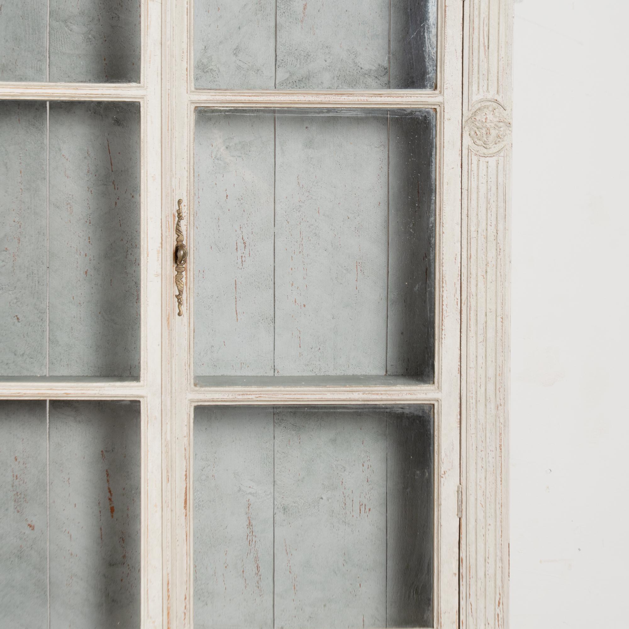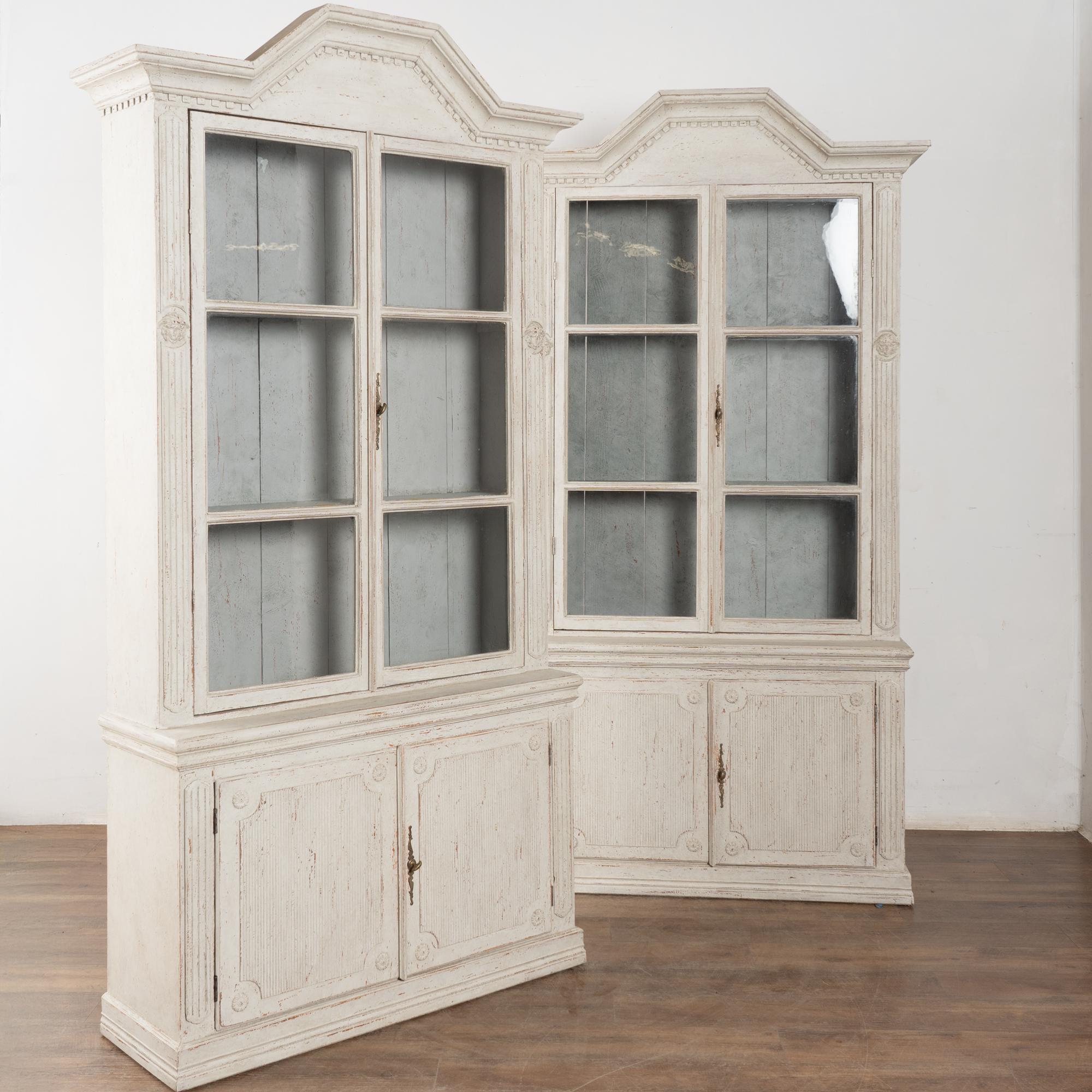 Restored, later professionally painted in layered shades of antique white and lightly distressed to fit the age and grace of these display cabinets. Interior cabinet painted a contrasting pale blue with gray undertones.