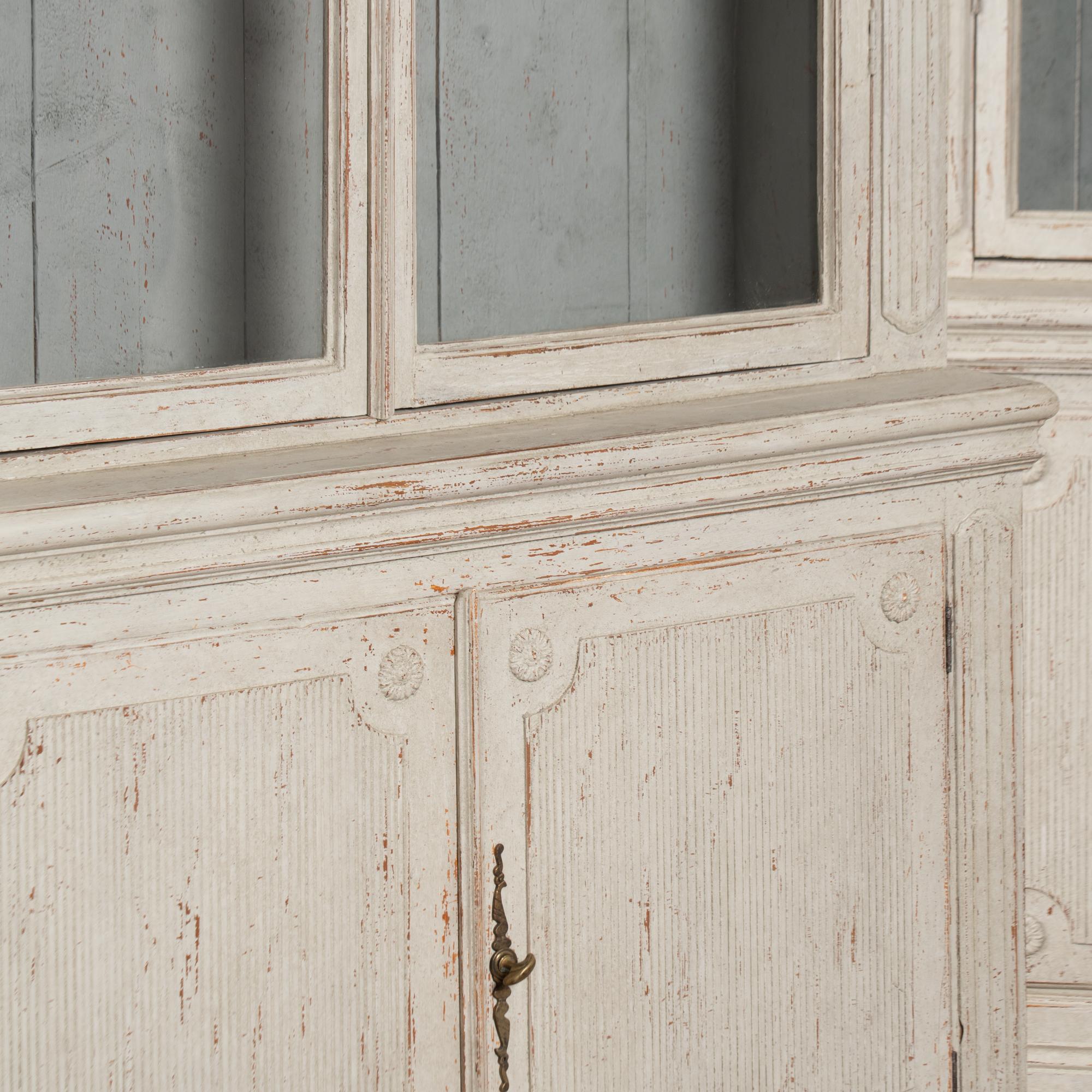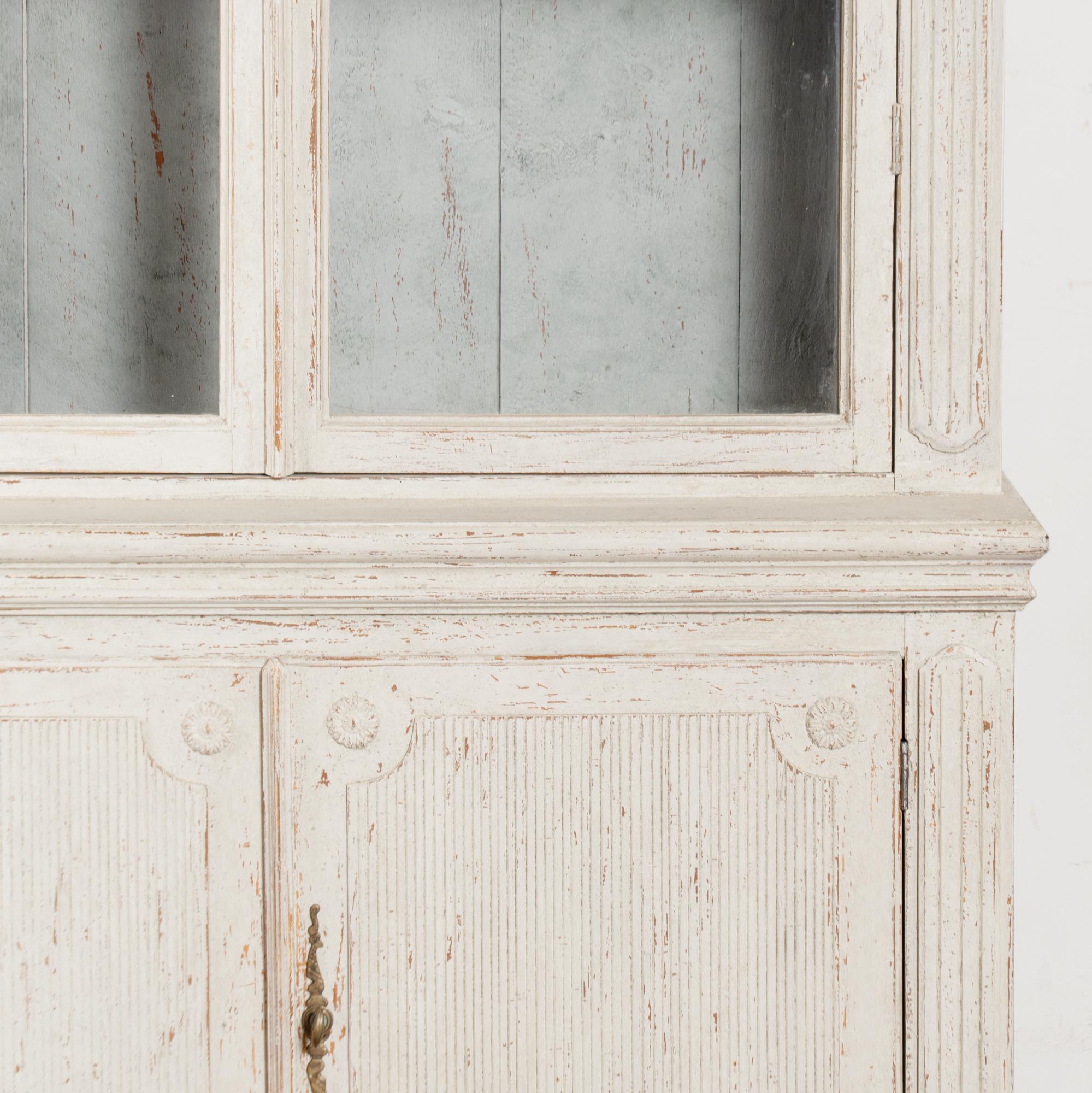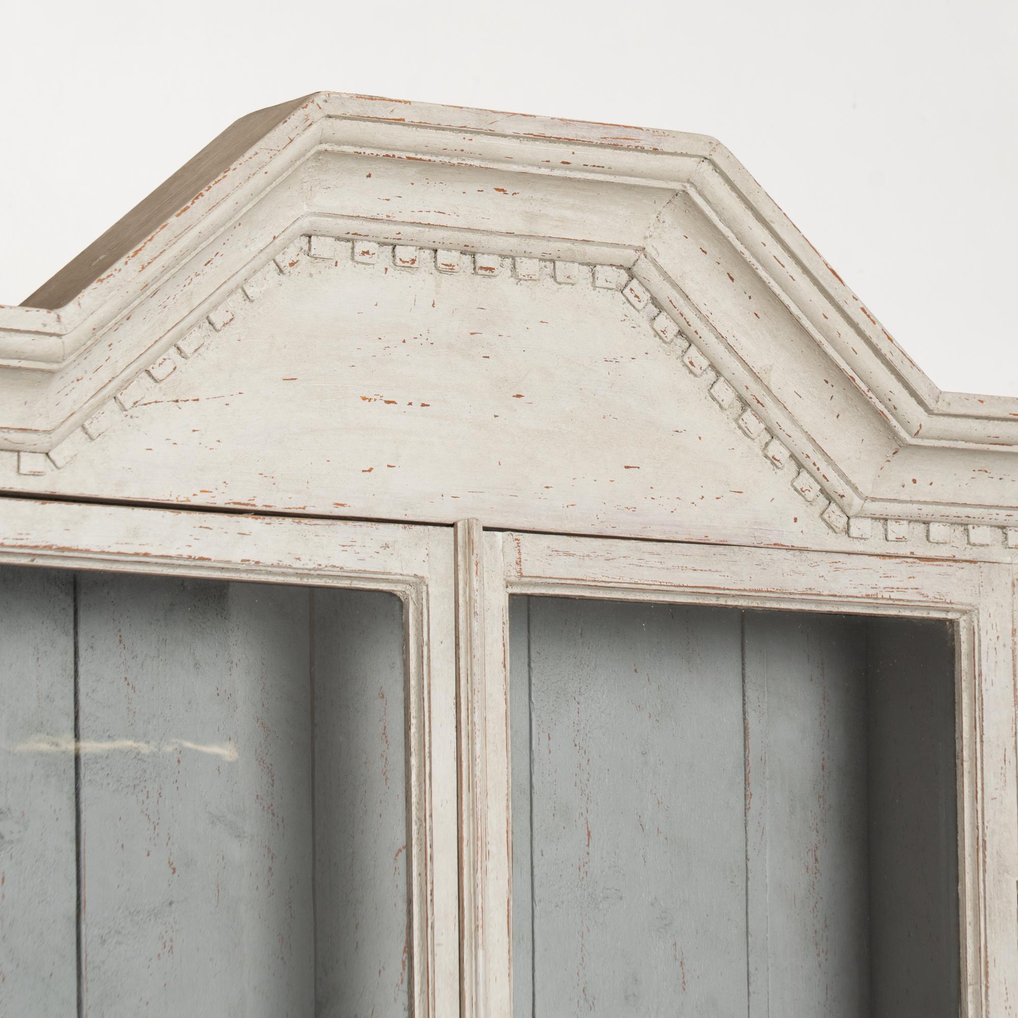 Restored, later professionally painted in layered shades of antique white and lightly distressed to fit the age and grace of these display cabinets. Interior cabinet painted a contrasting pale blue with gray undertones.