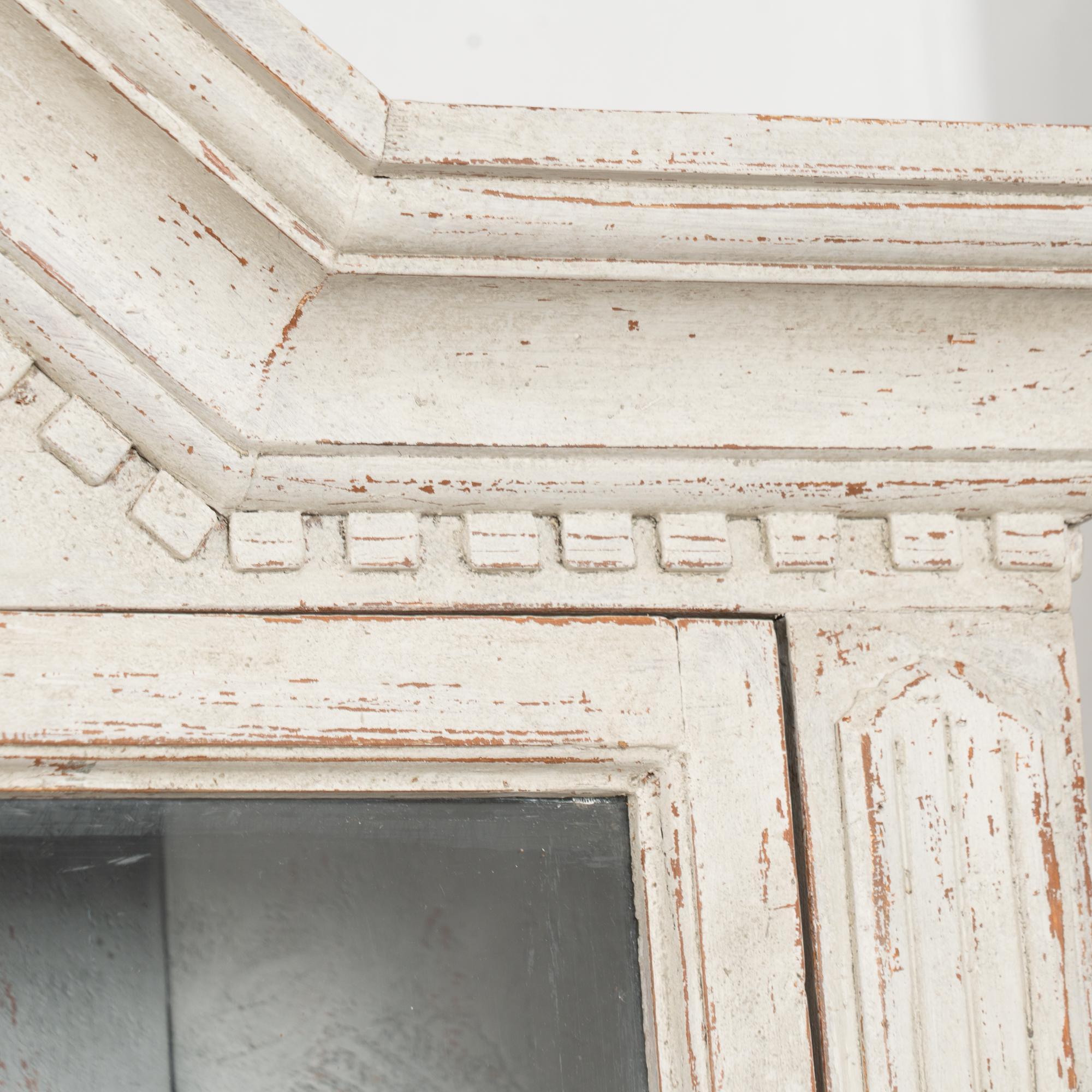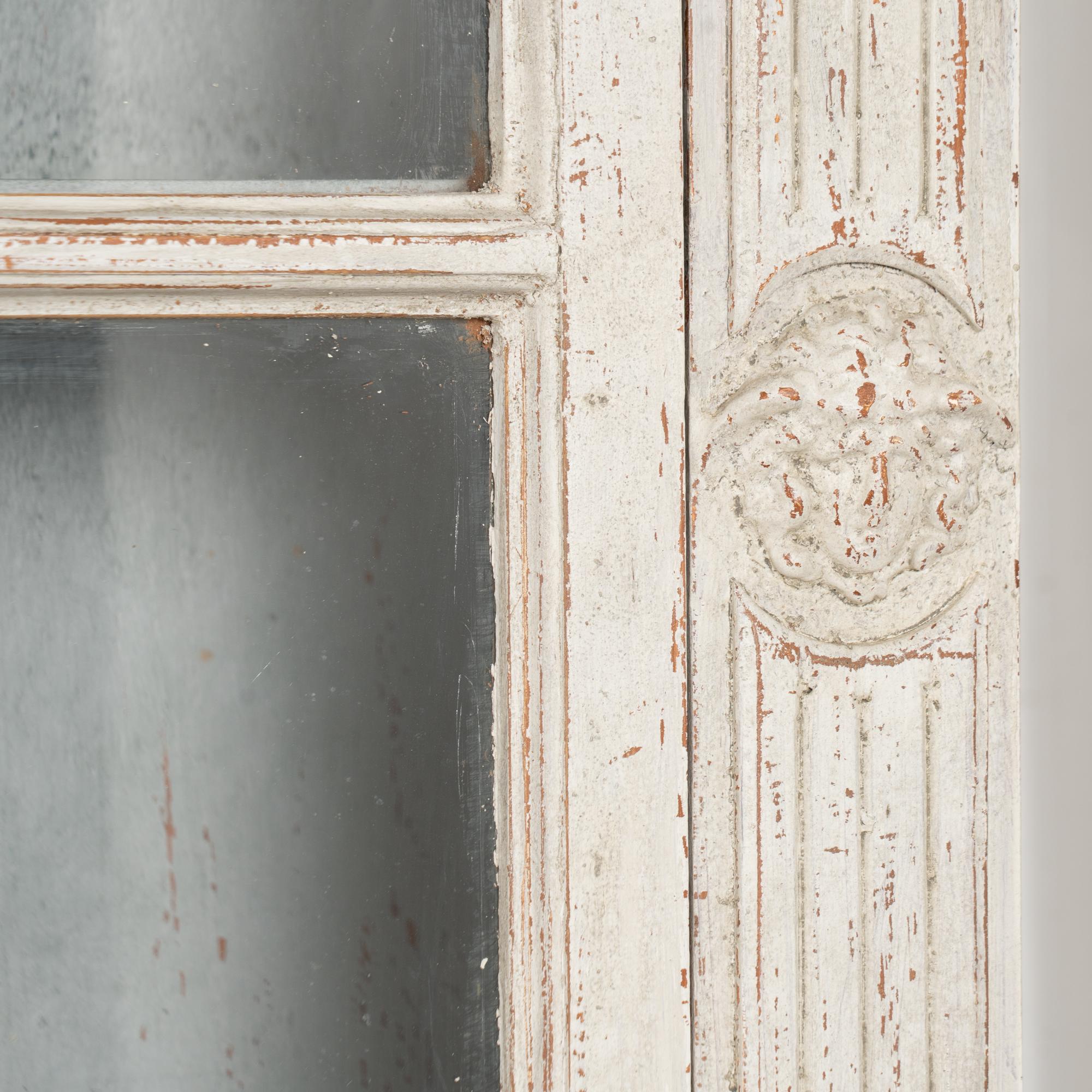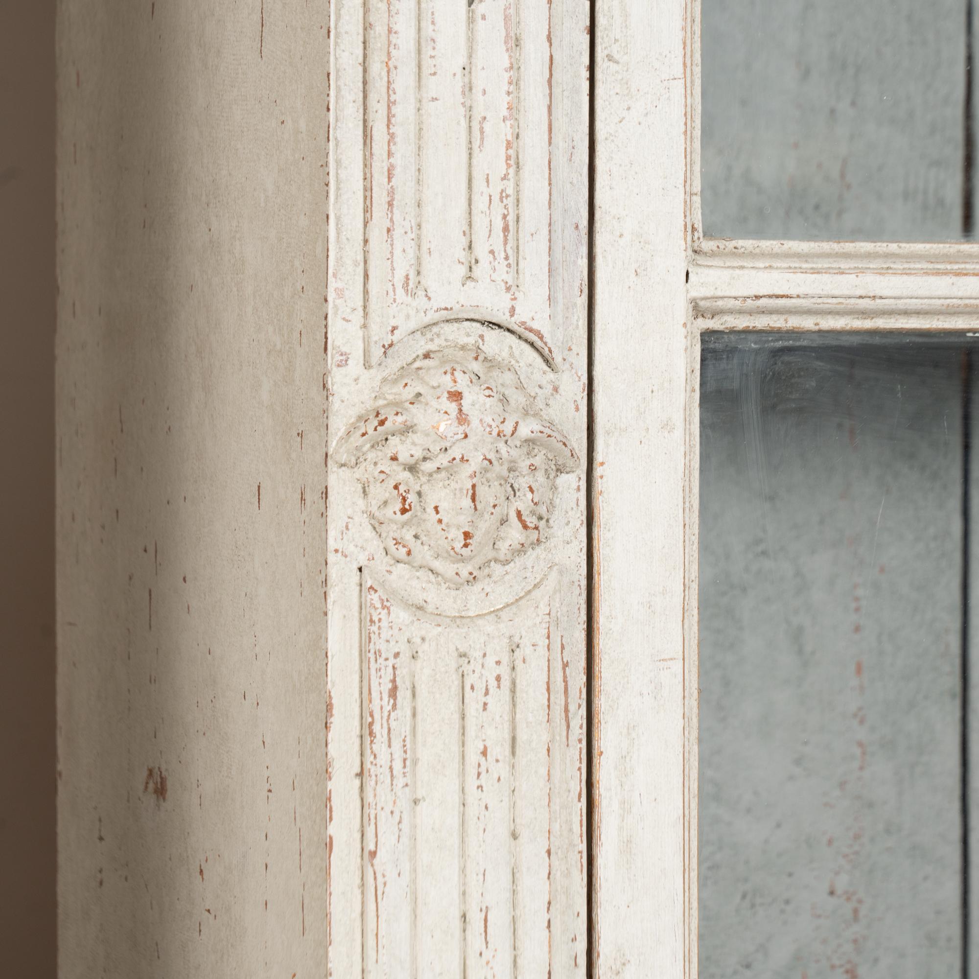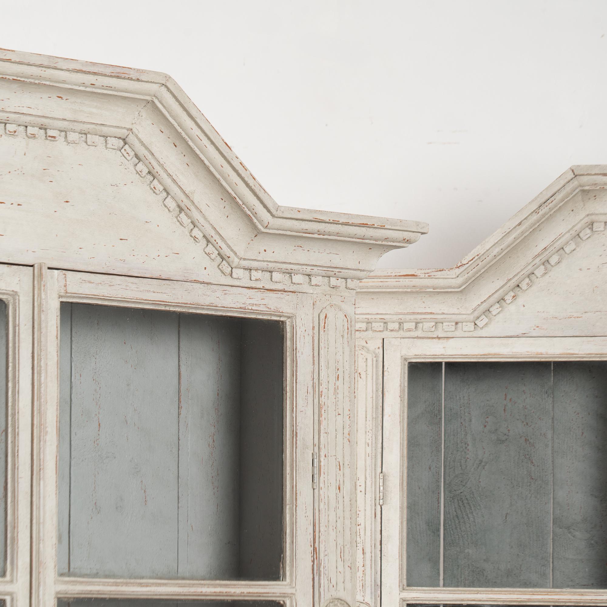 Restored, later professionally painted in layered shades of antique white and lightly distressed to fit the age and grace of these display cabinets. Interior cabinet painted a contrasting pale blue with gray undertones.