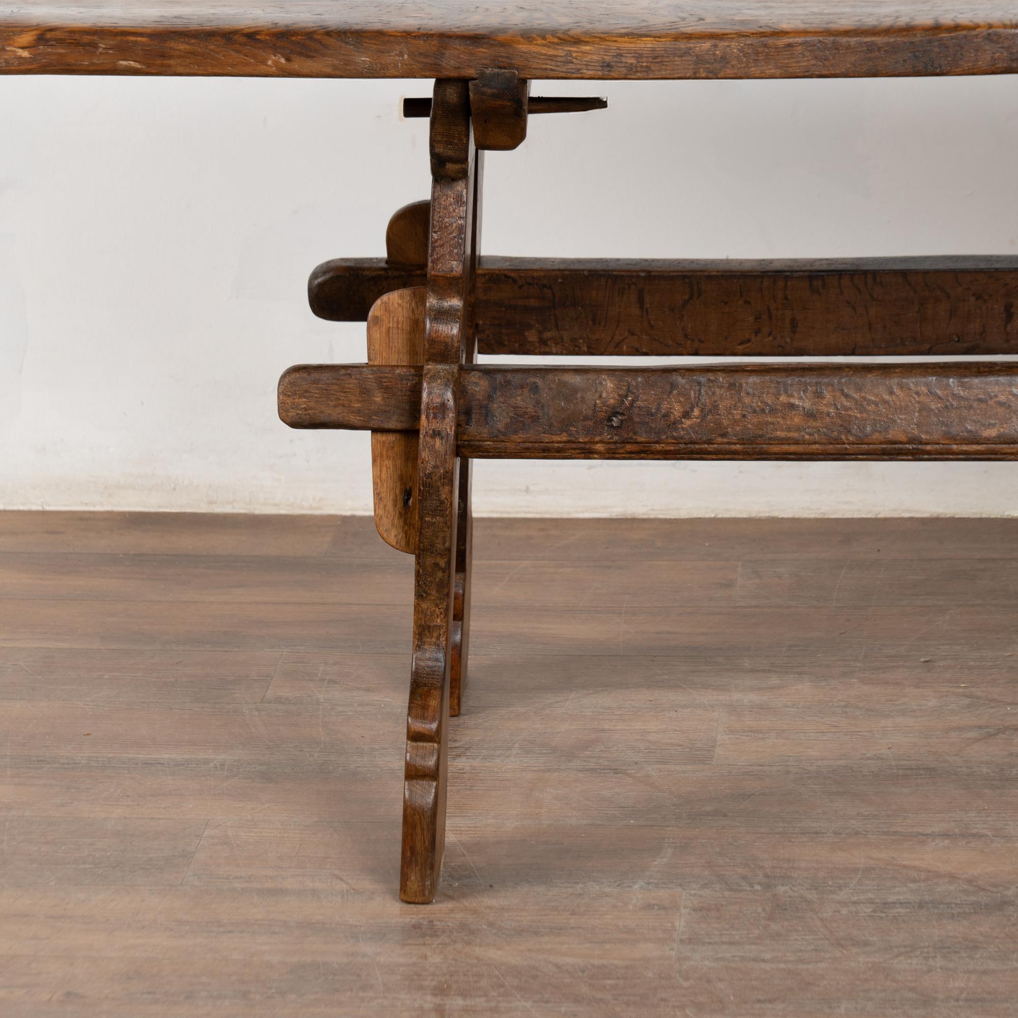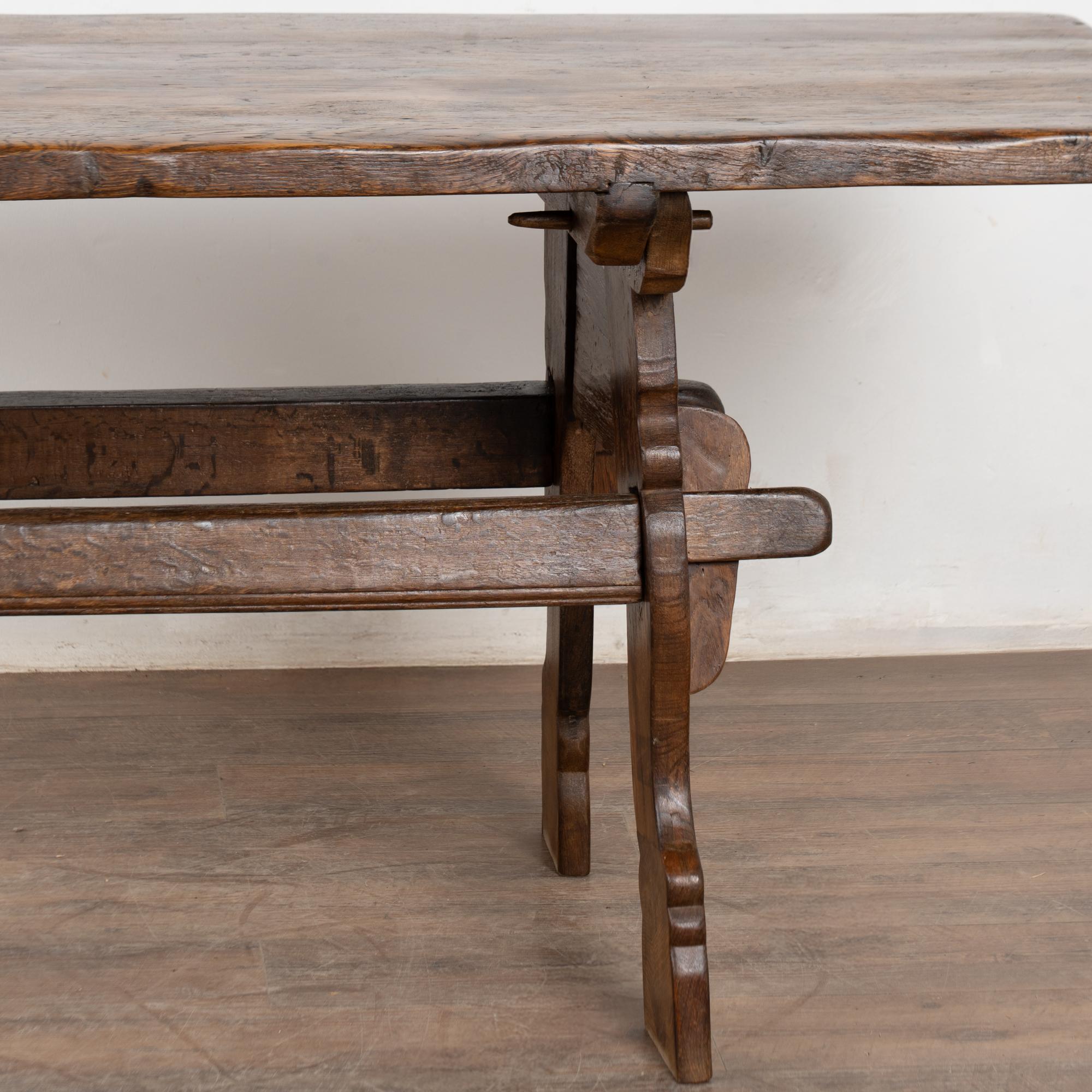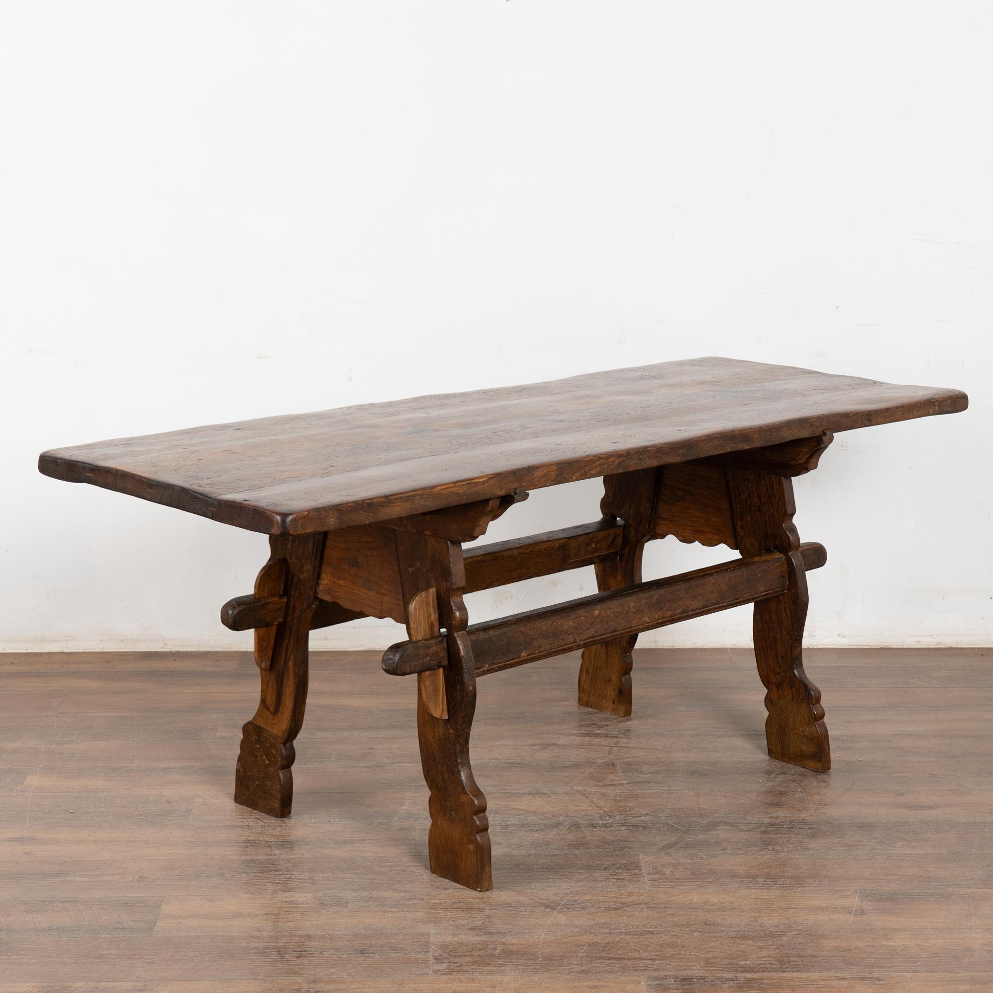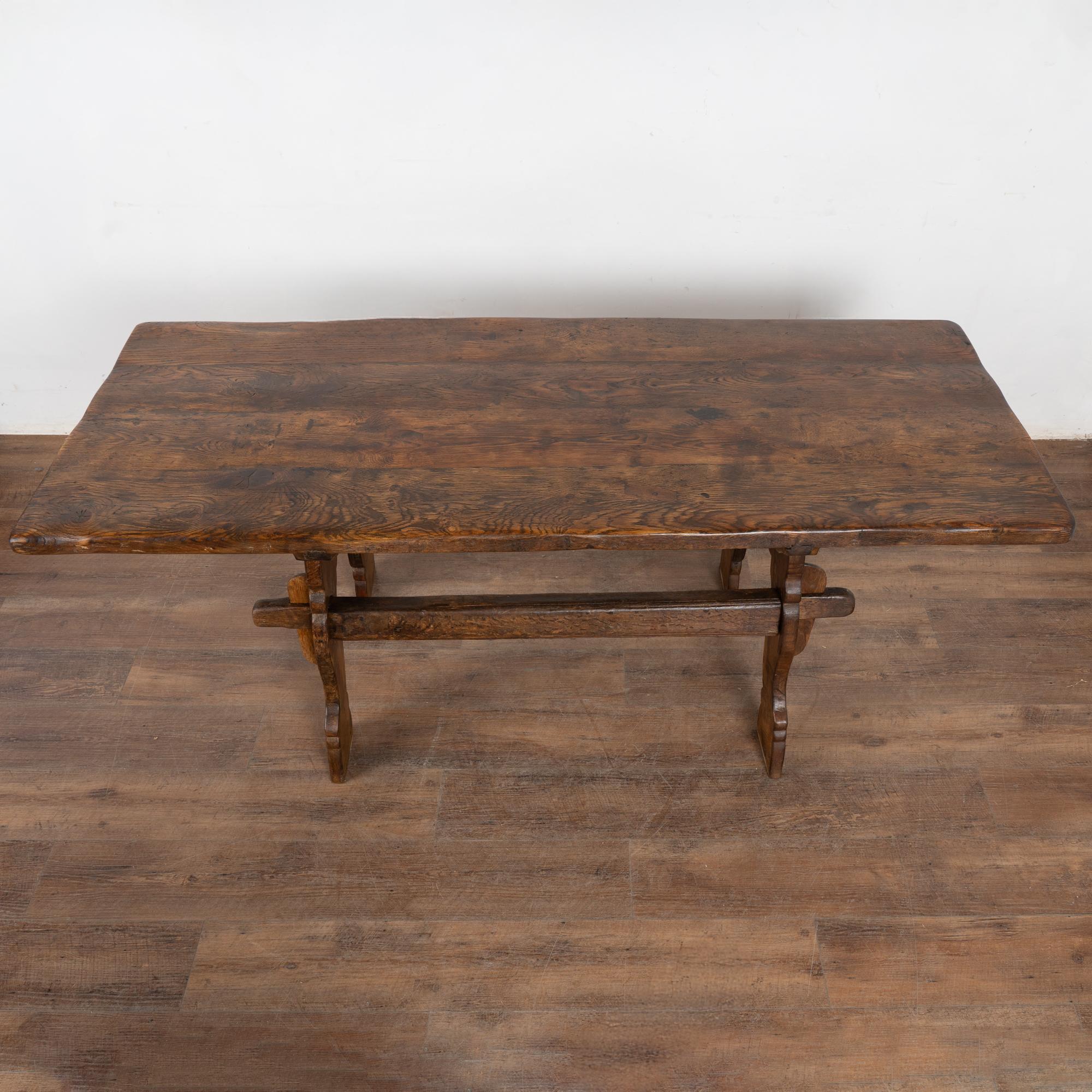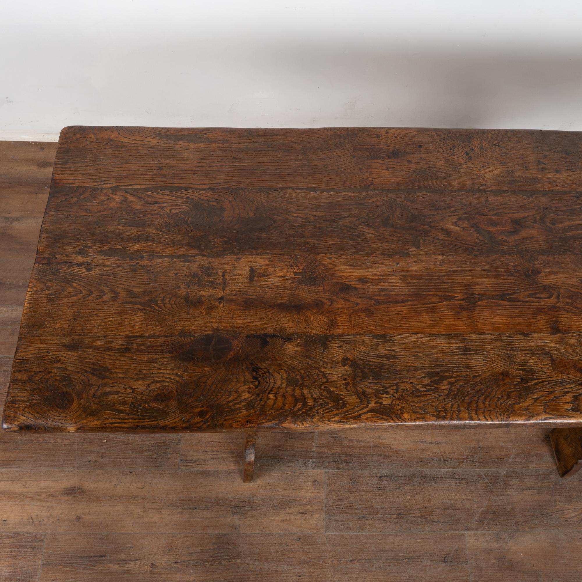 It is the deep aged patina seen in the top and trestle base that draw one to this 6' long farm table from France.