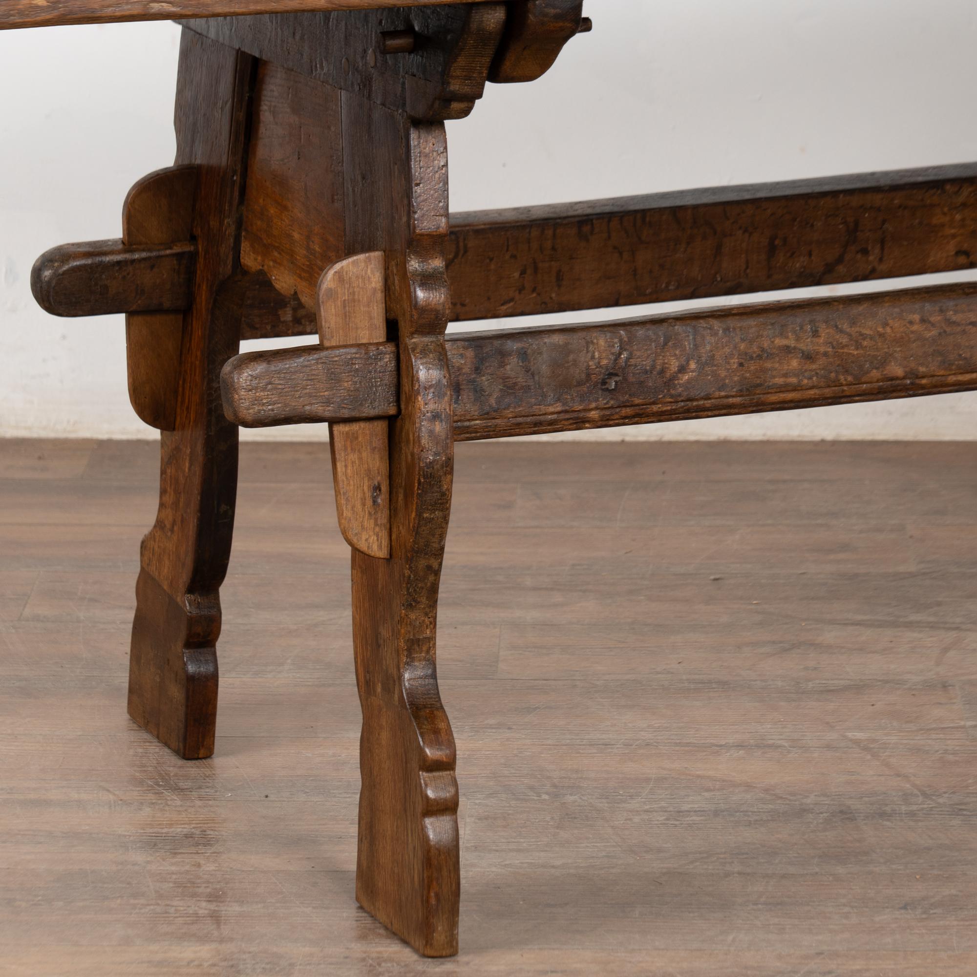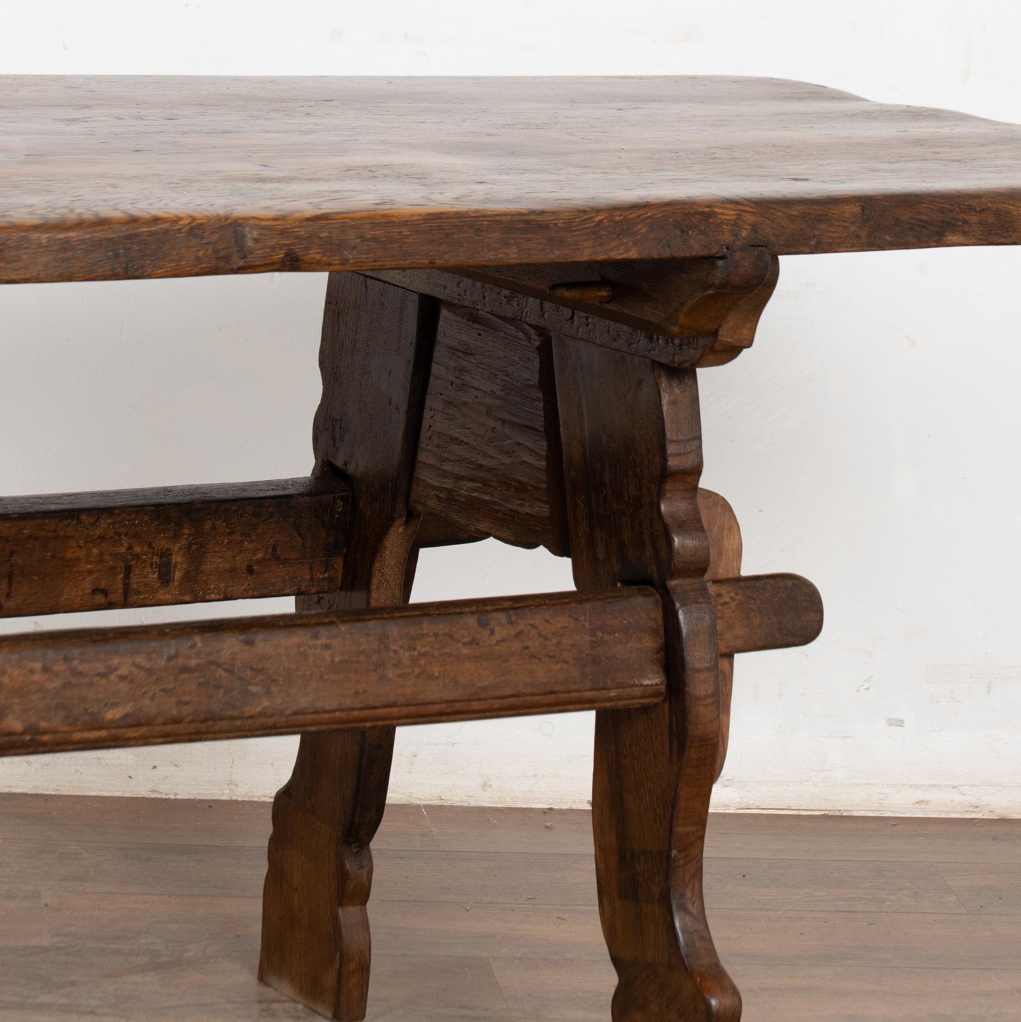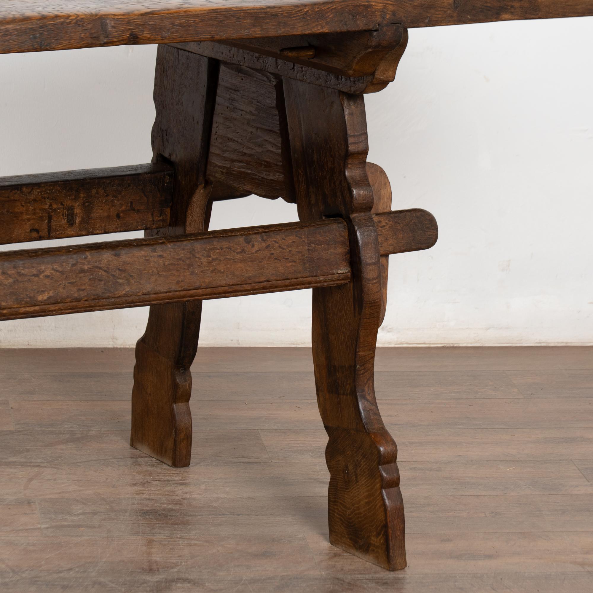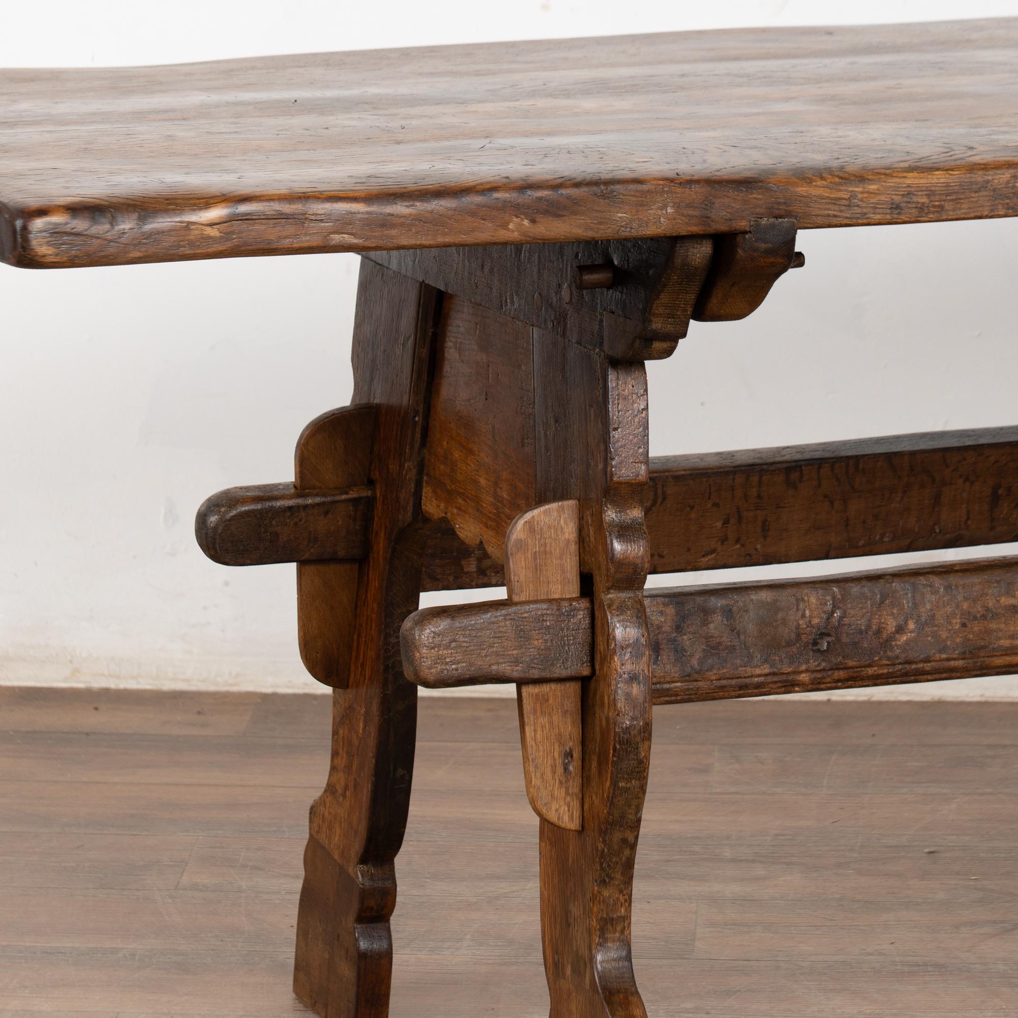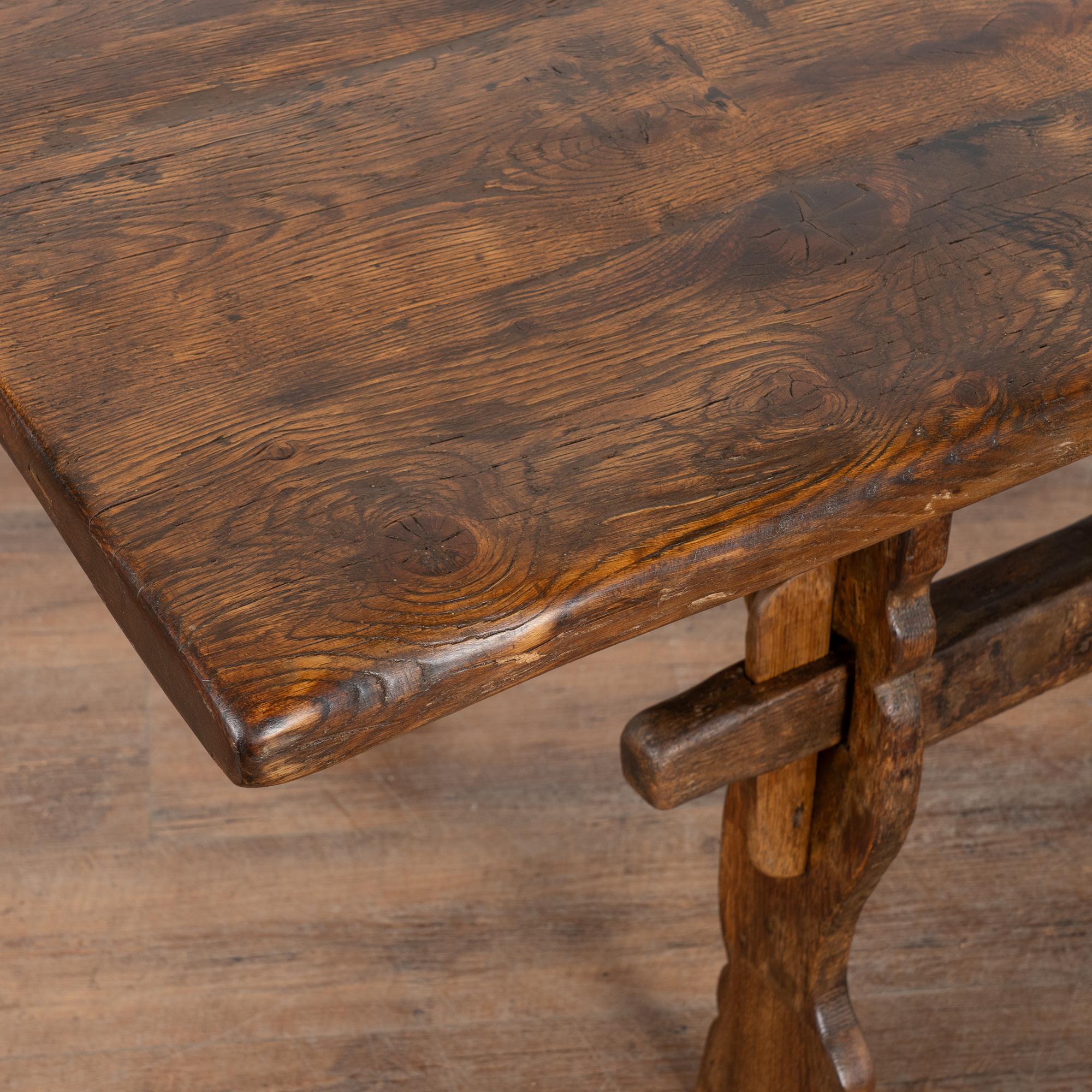 It is the deep aged patina seen in the top and trestle base that draw one to this 6' long farm table from France.