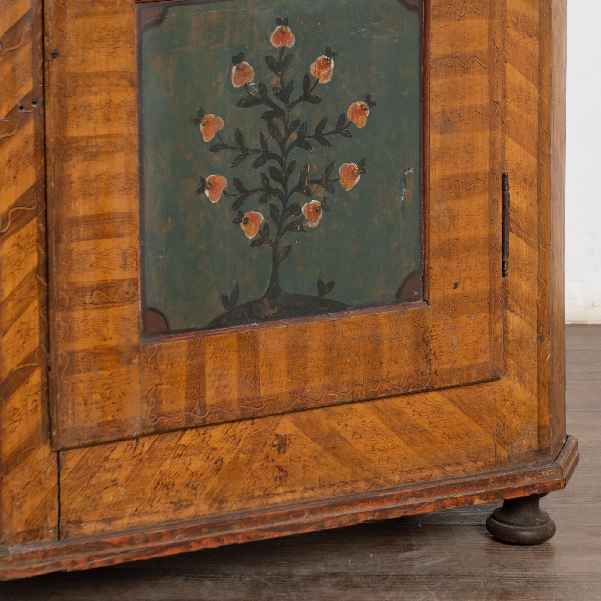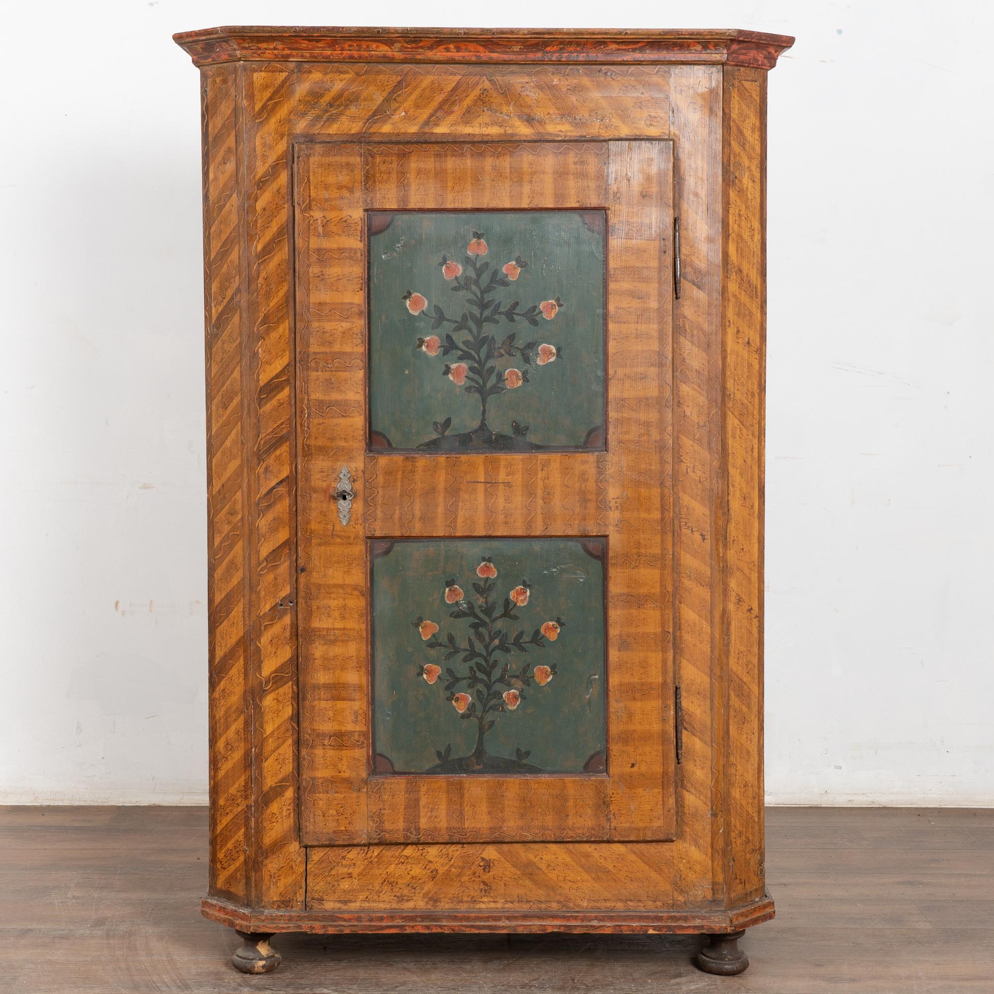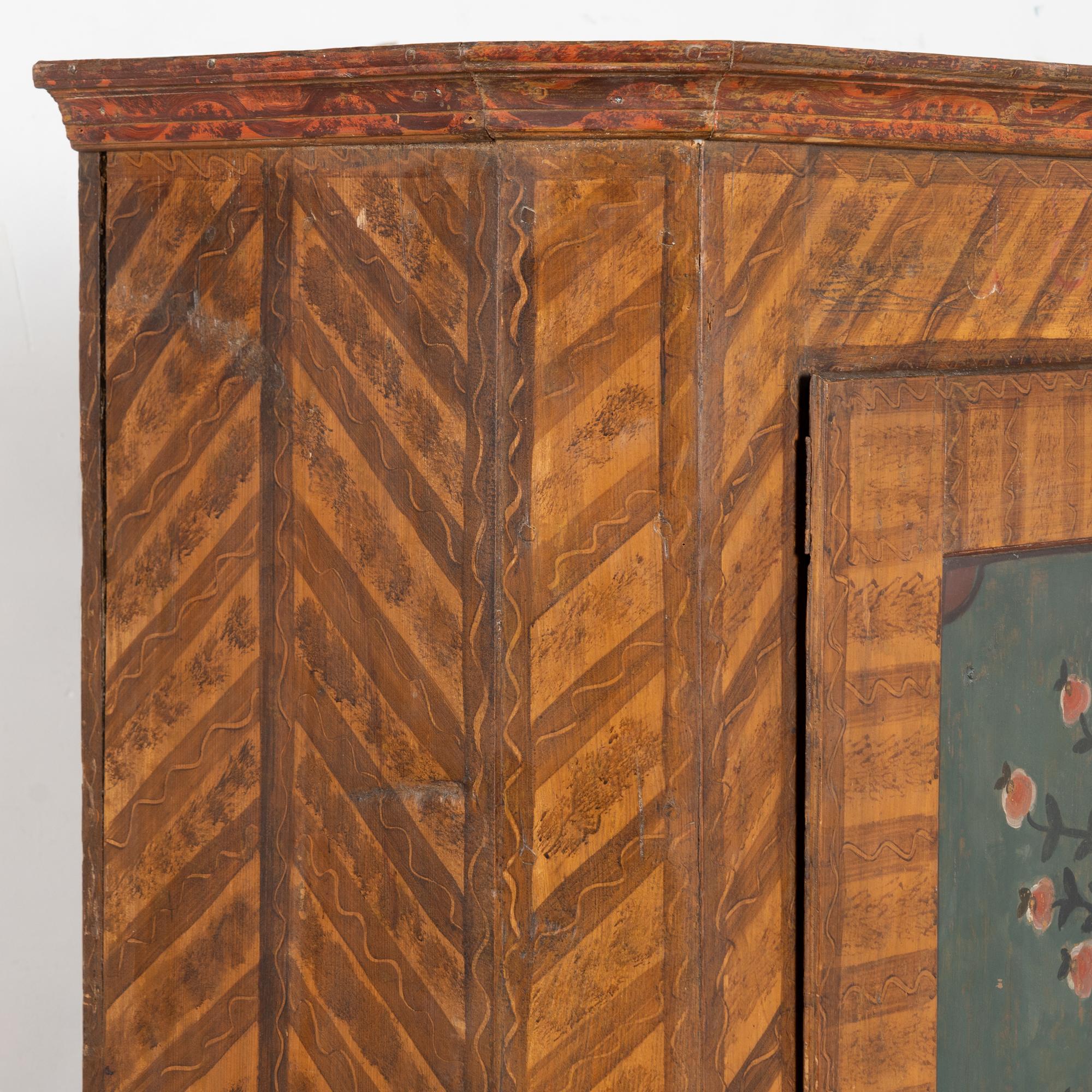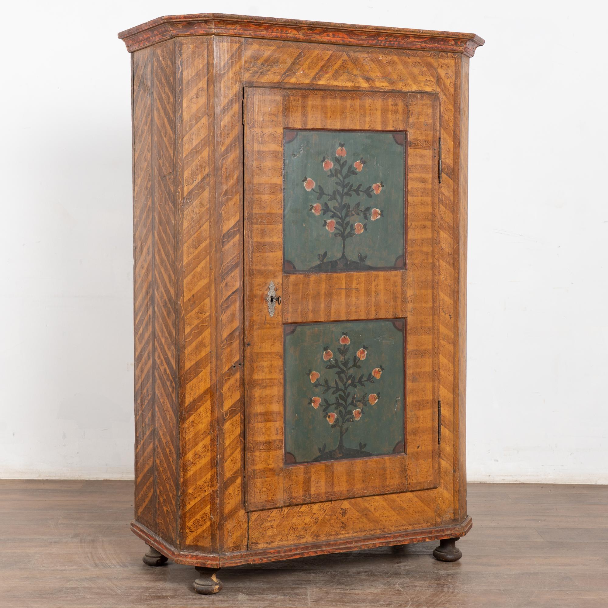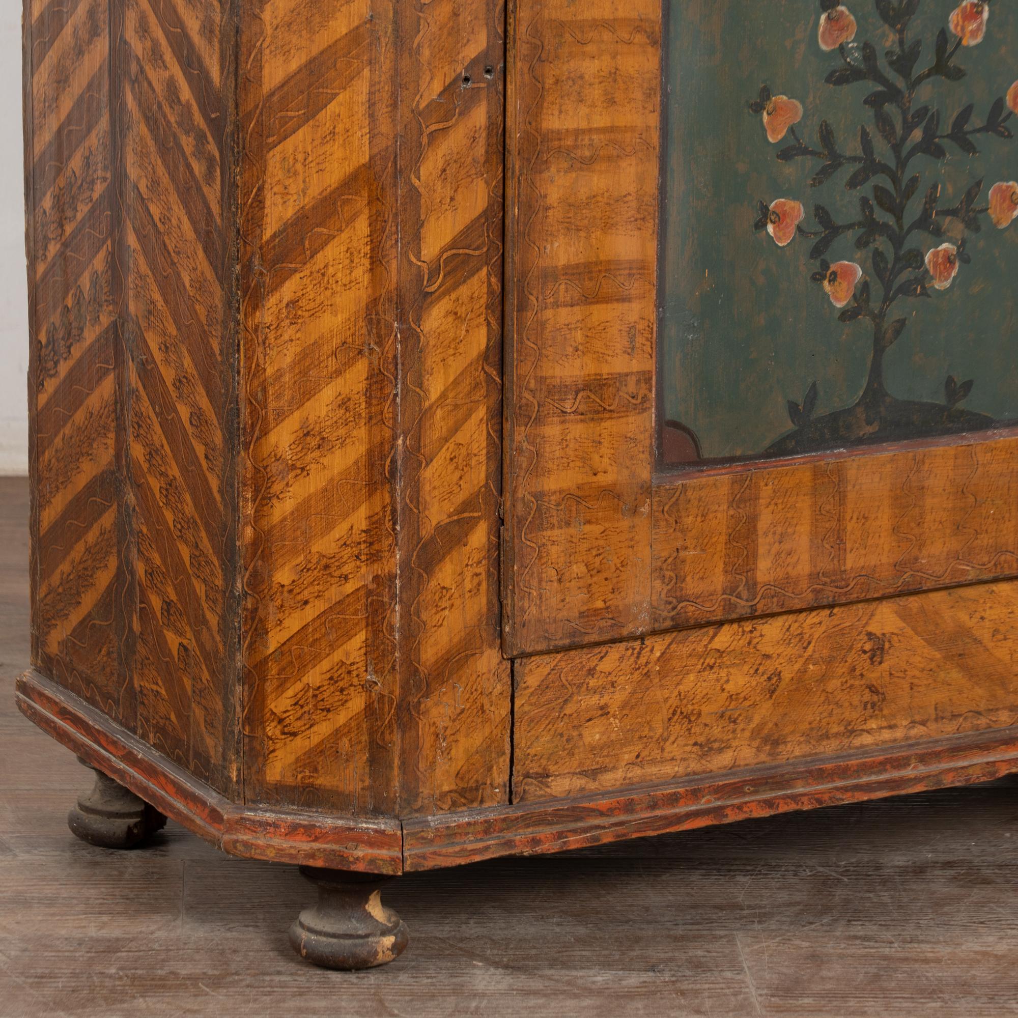 This lovely painted armoire still maintains the quality and details of the original hand-painted folk art finish. The soft, gentle colors with delightful floral motifs are beautifully executed against a painted teal blue panel. Old gouges seen along front, sides, etc.