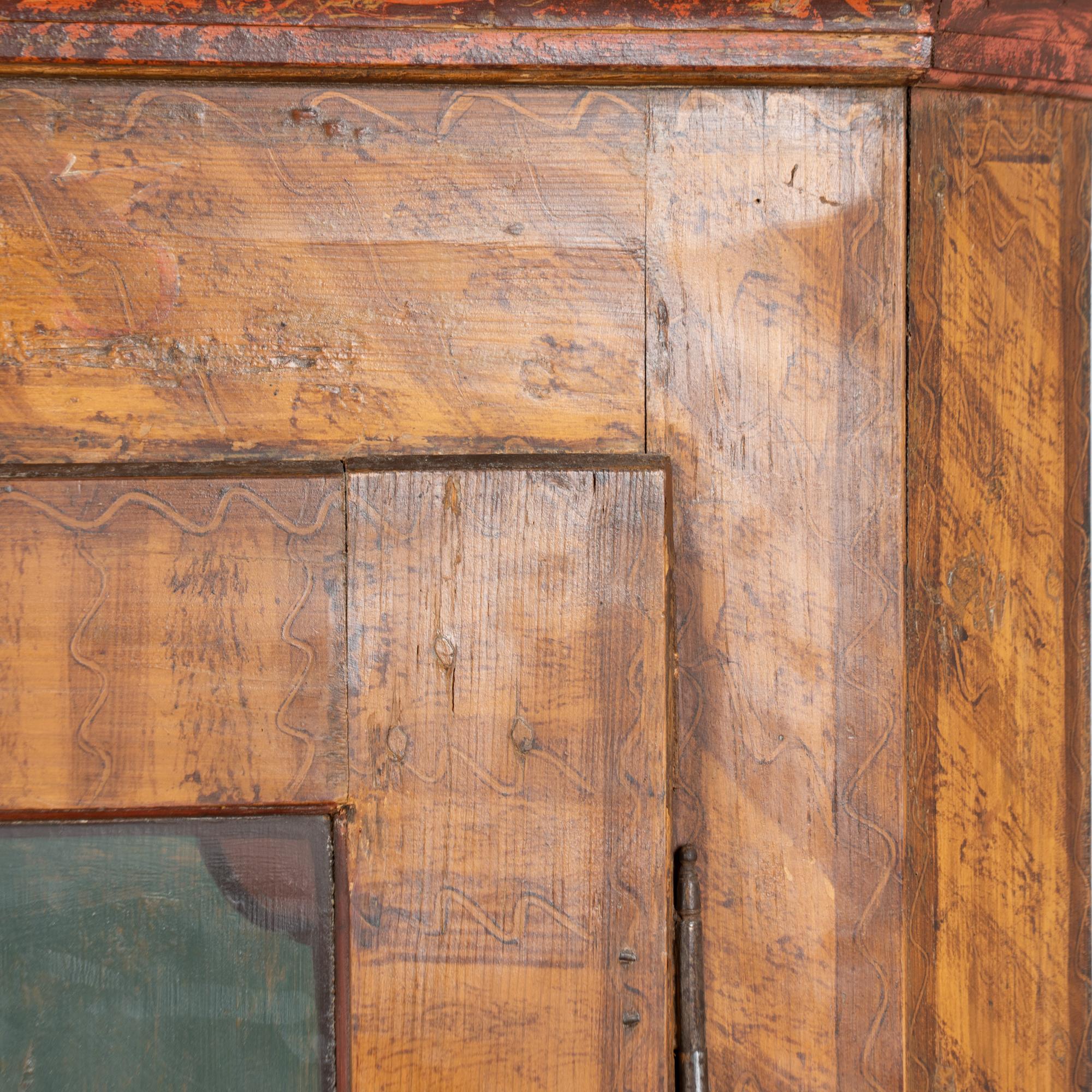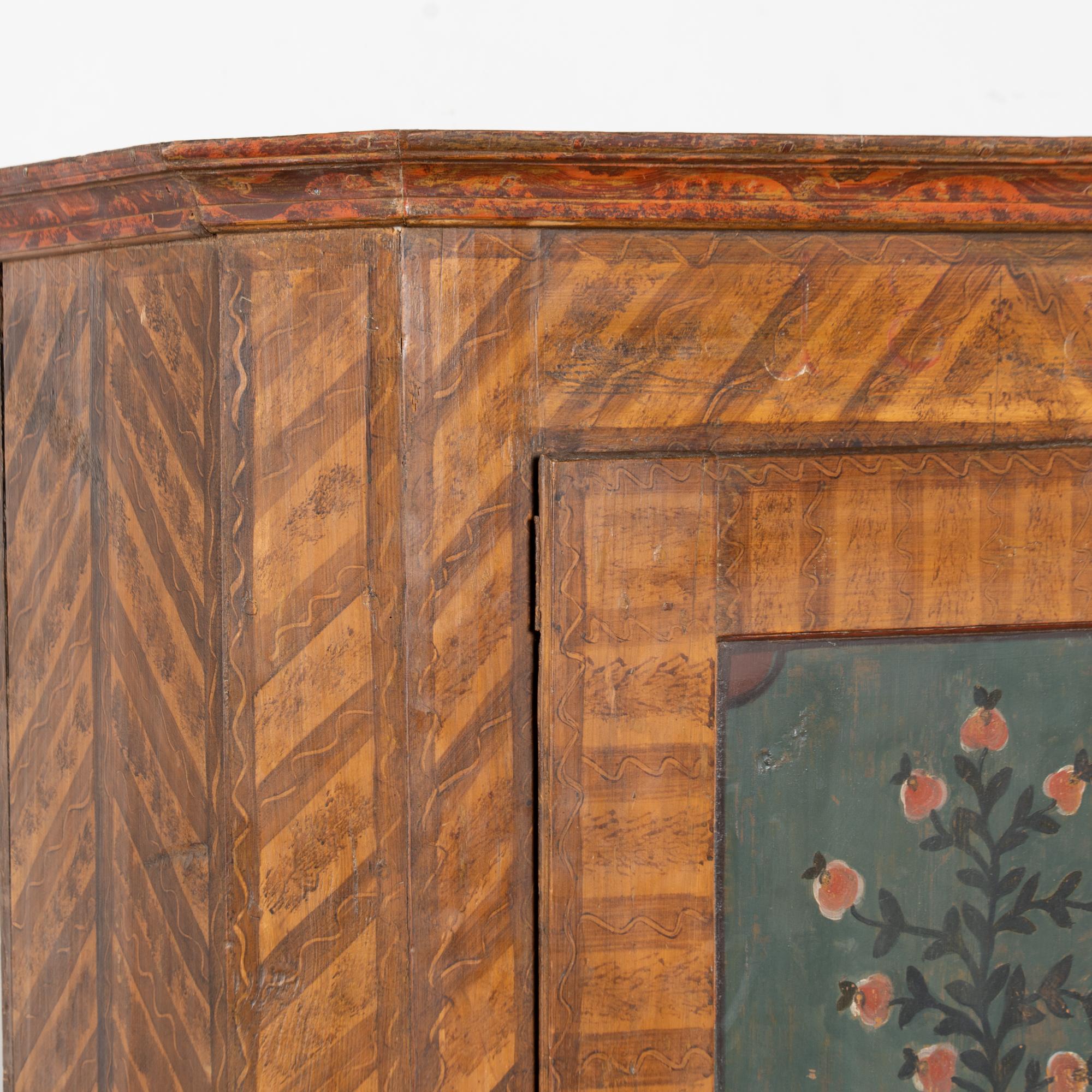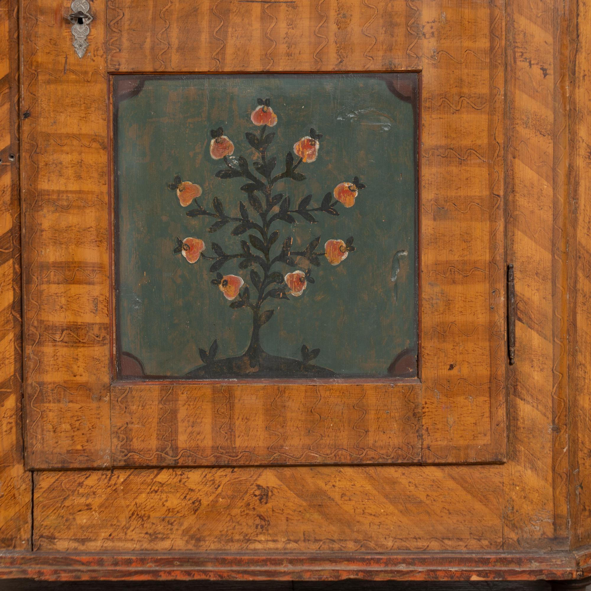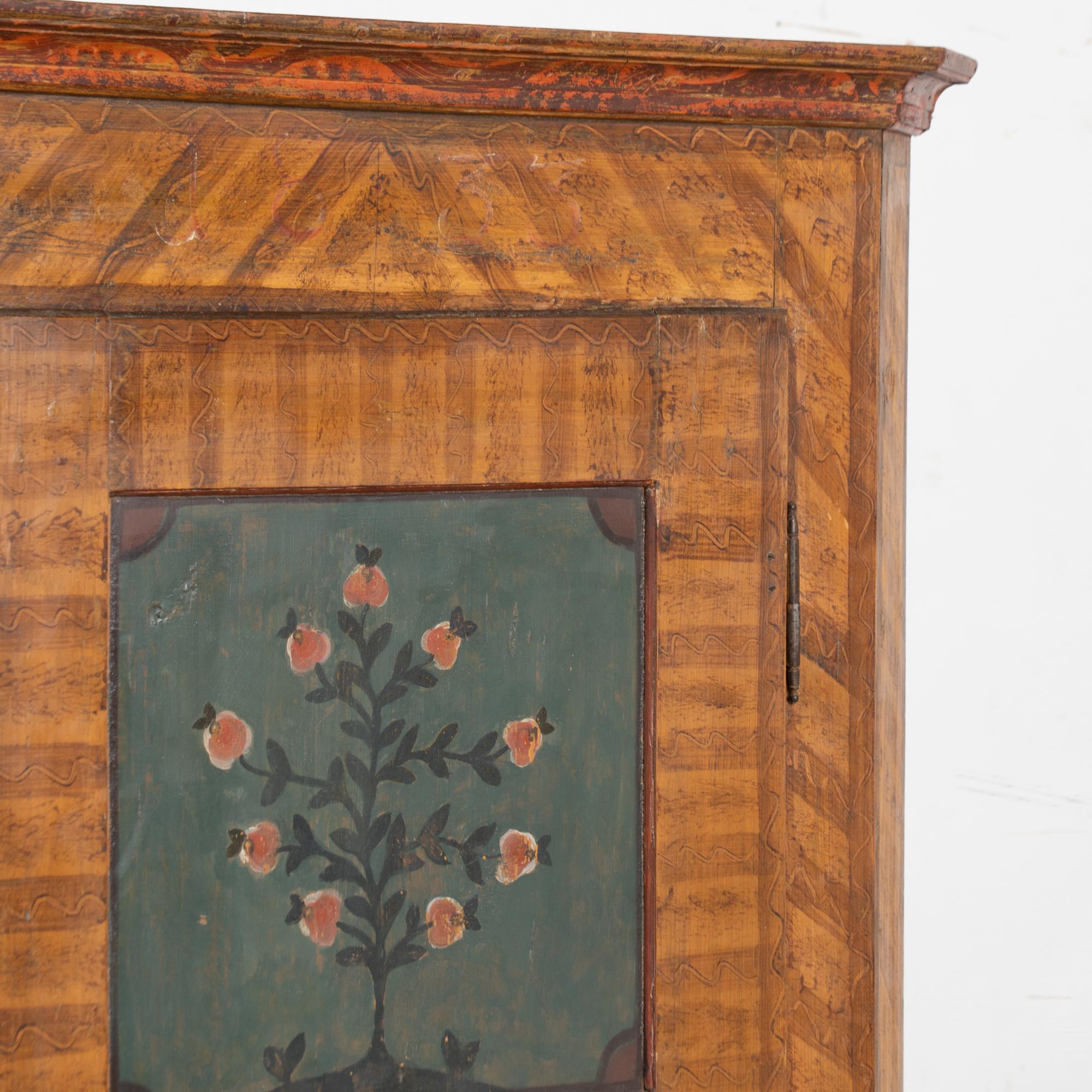 This lovely painted armoire still maintains the quality and details of the original hand-painted folk art finish. The soft, gentle colors with delightful floral motifs are beautifully executed against a painted teal blue panel. Old gouges seen along front, sides, etc.