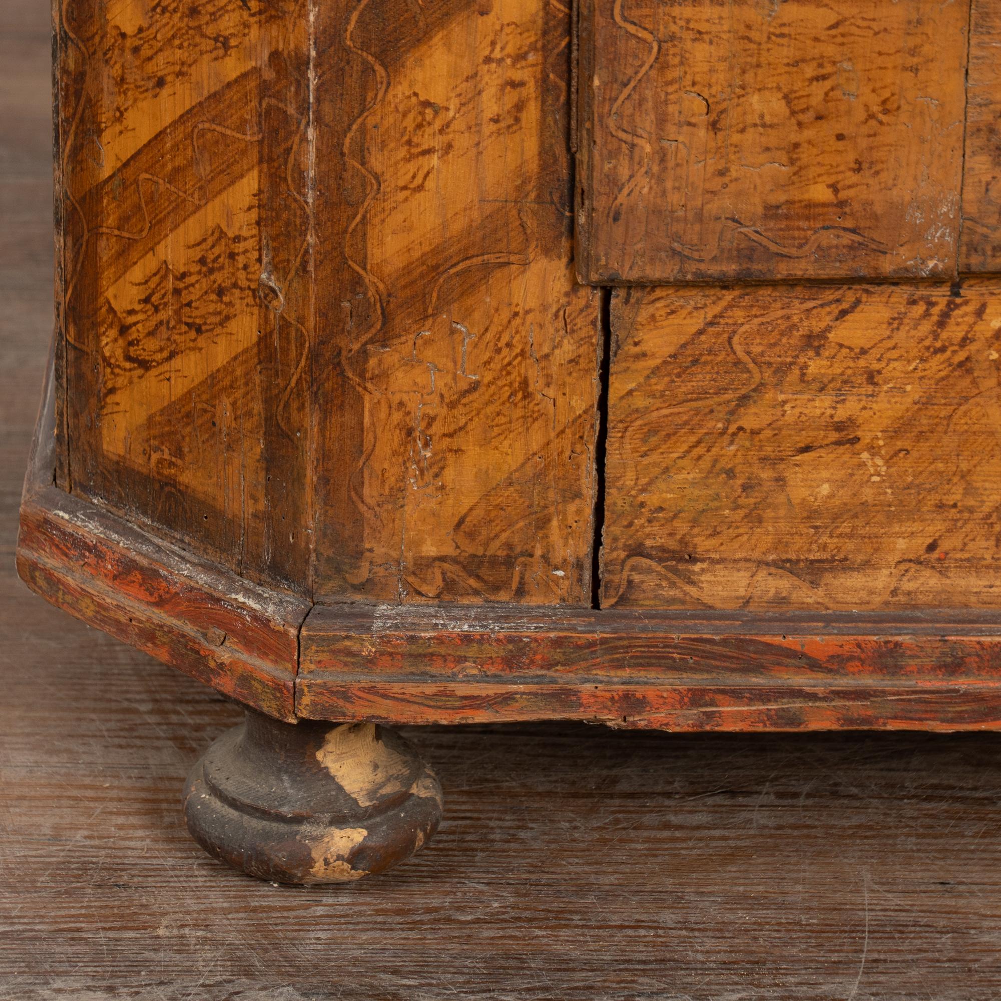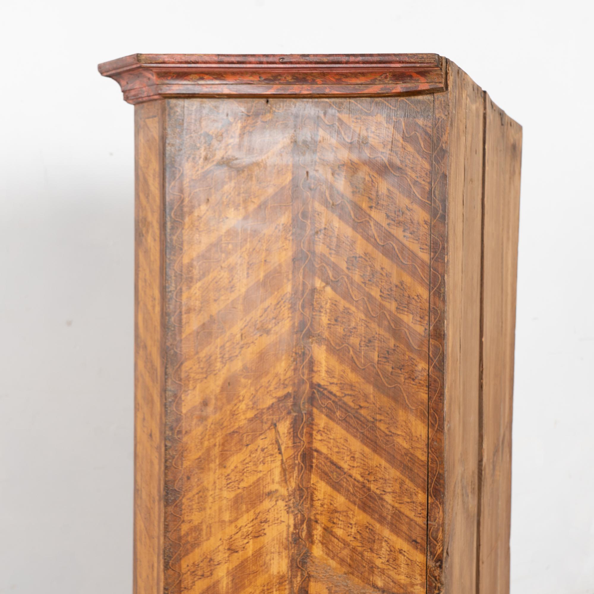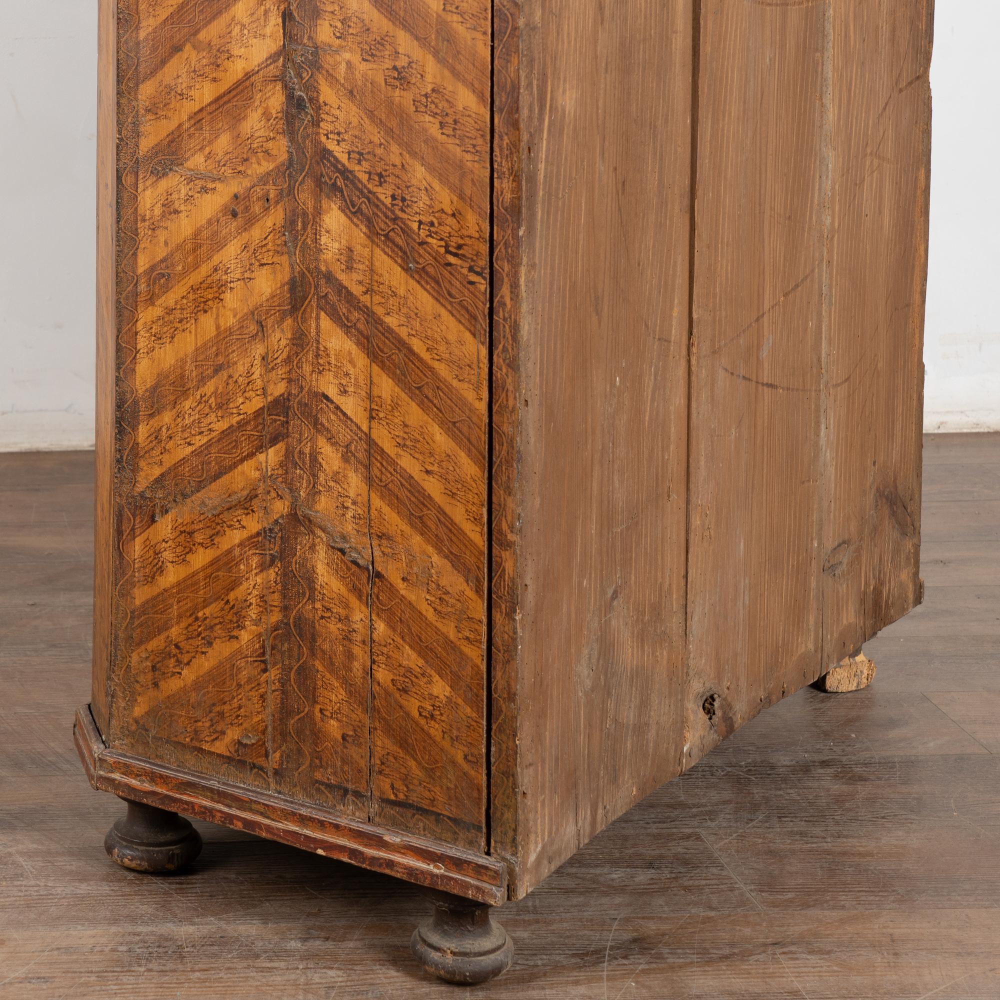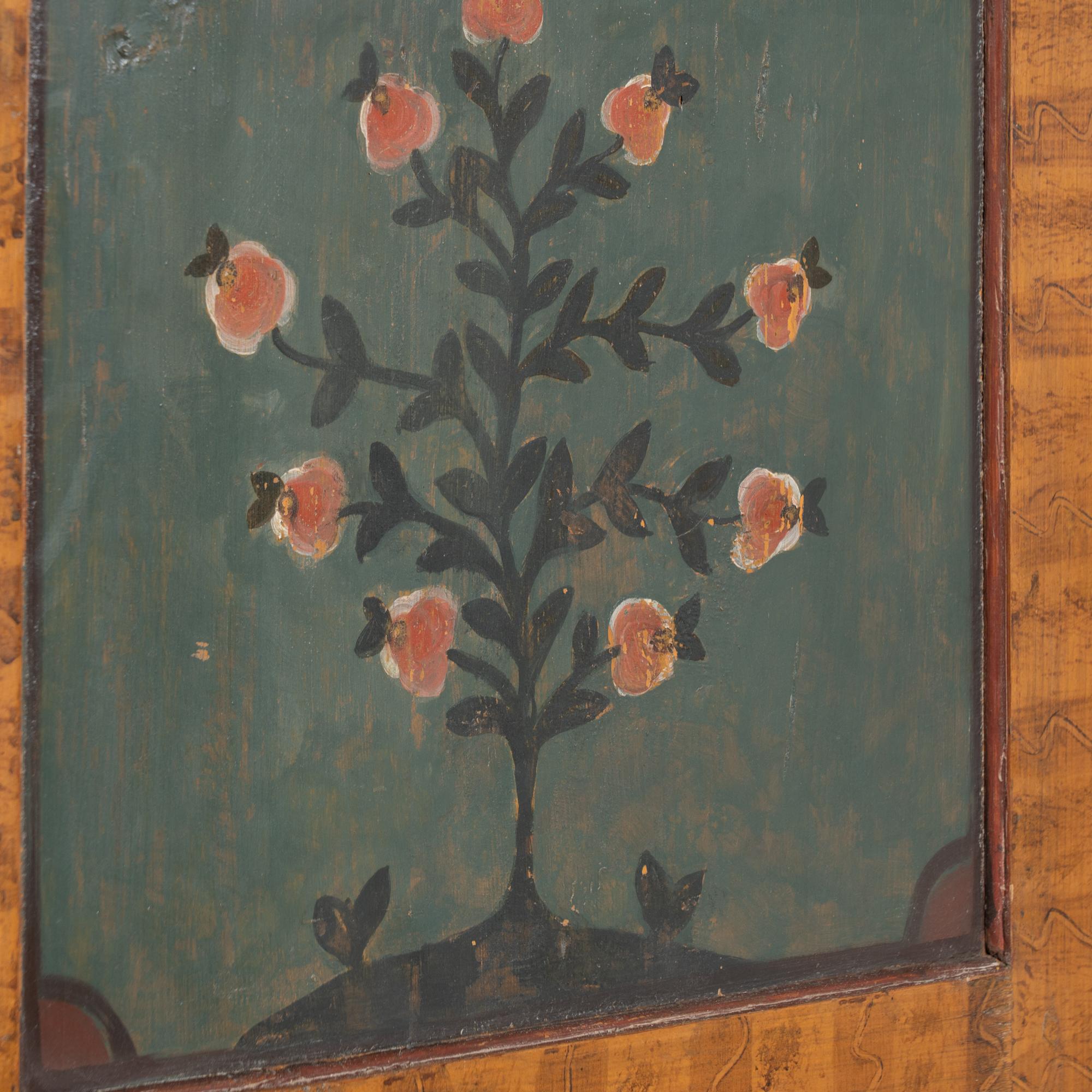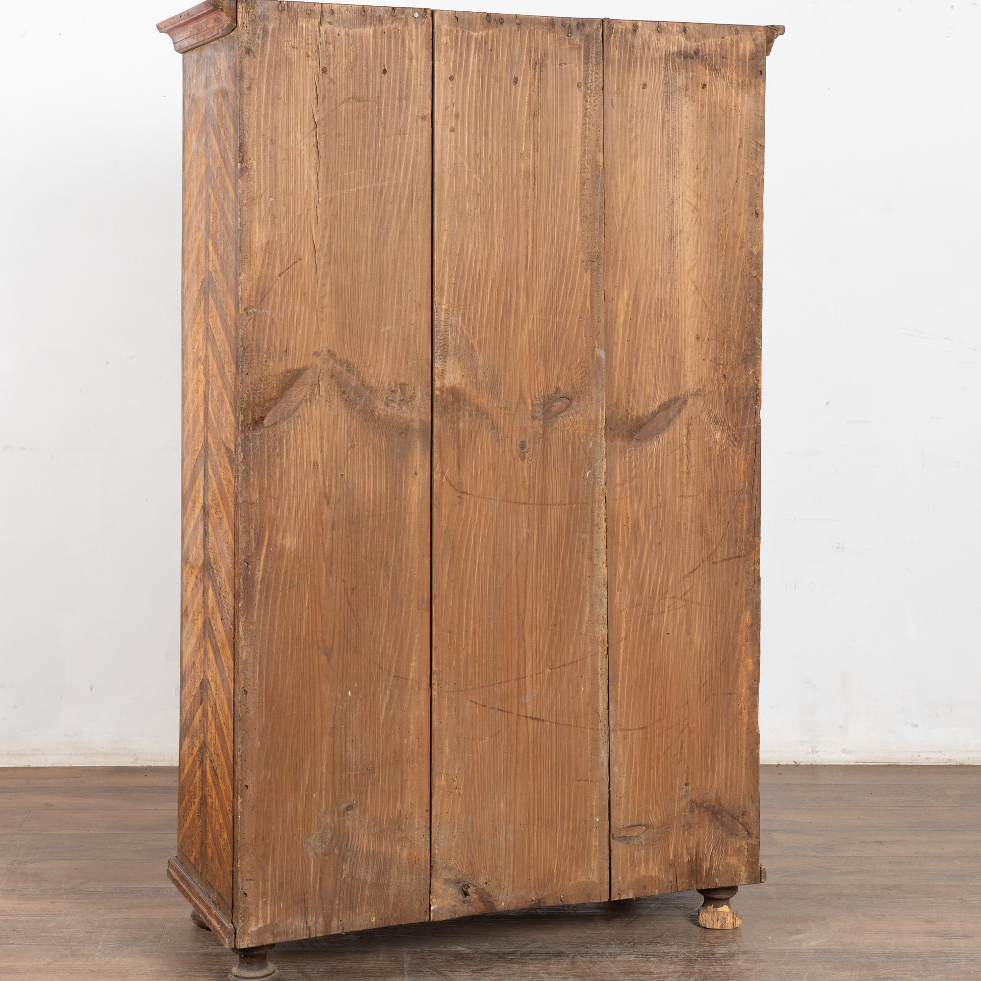 This lovely painted armoire still maintains the quality and details of the original hand-painted folk art finish. The soft, gentle colors with delightful floral motifs are beautifully executed against a painted teal blue panel. Old gouges seen along front, sides, etc.