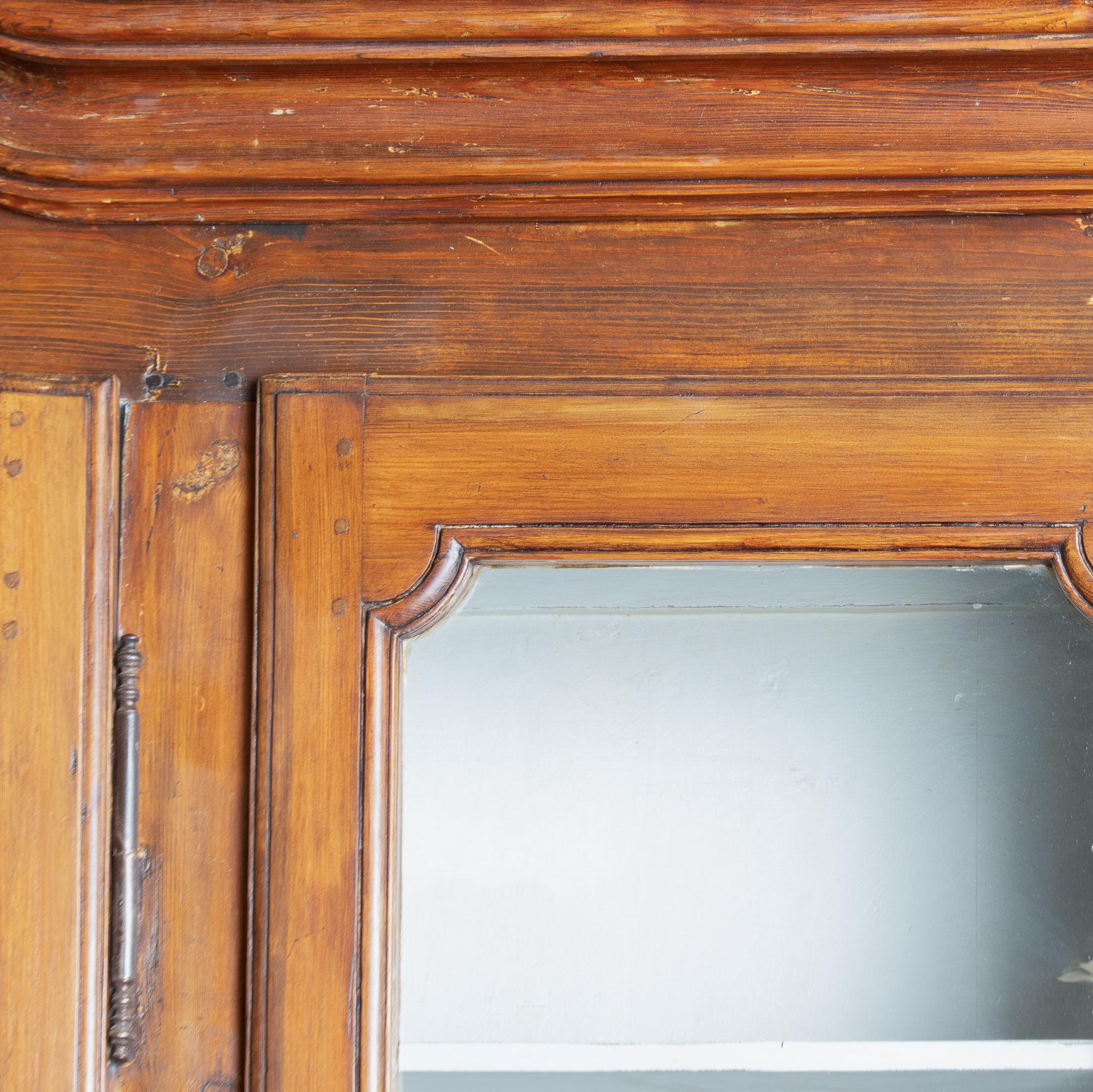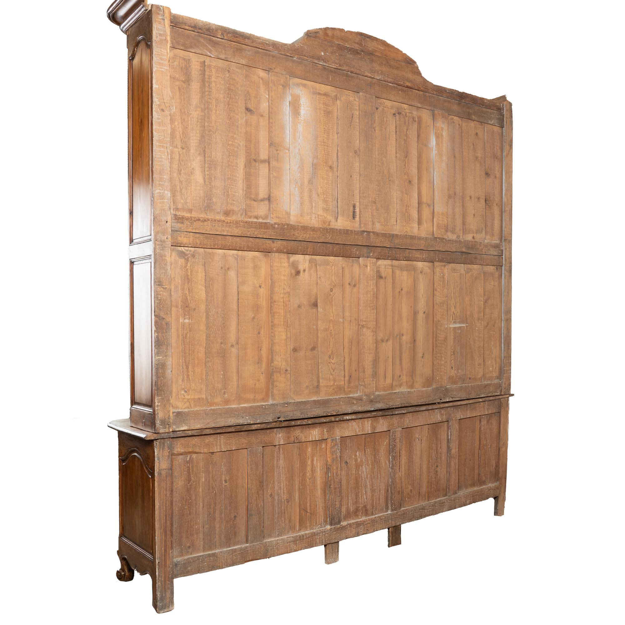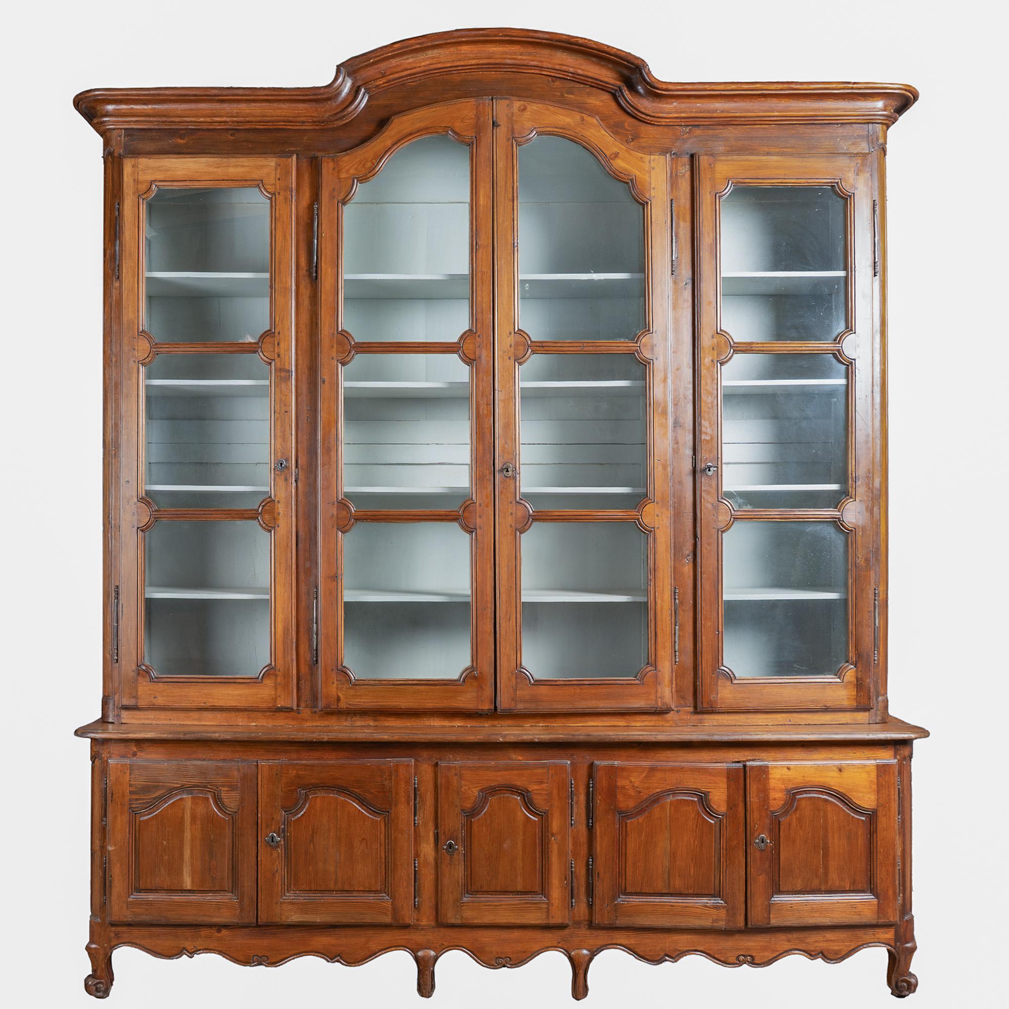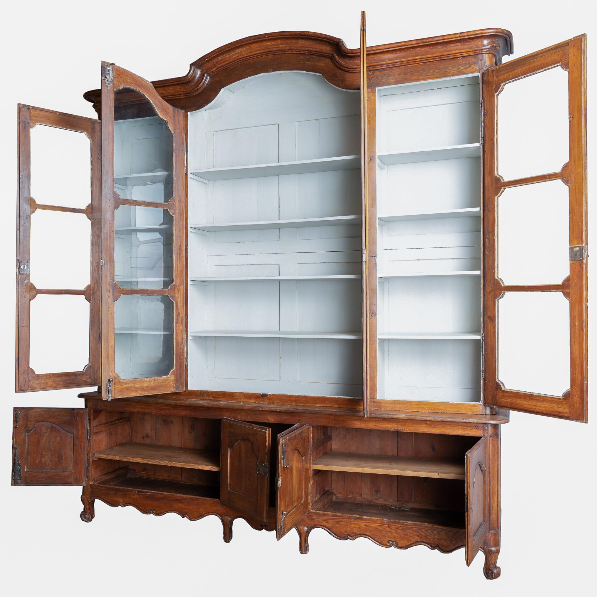 Impressive late 18th-century French pine bookcase showing a deep aged patina and traditional provincial design. At over ten feet tall, the two-part ("Deux Corp") cabinet offers substantial storage and a commanding presence for displaying collections. The scalloped carved skirt and curved feet add graceful detail; rear feet show expected scuffs and wear from years of use.