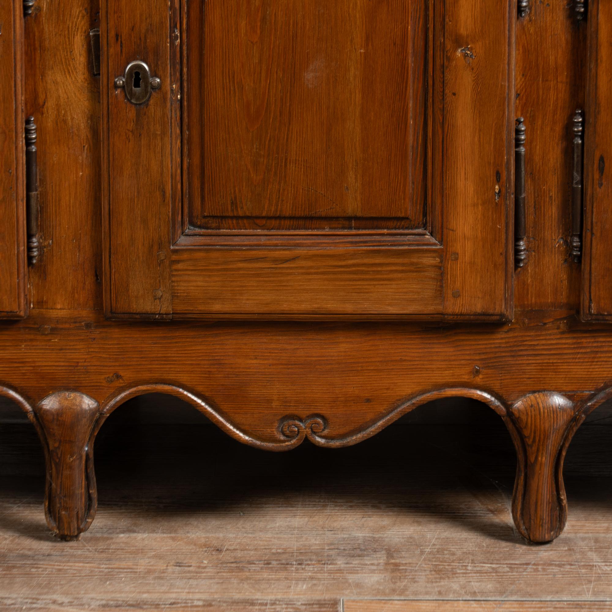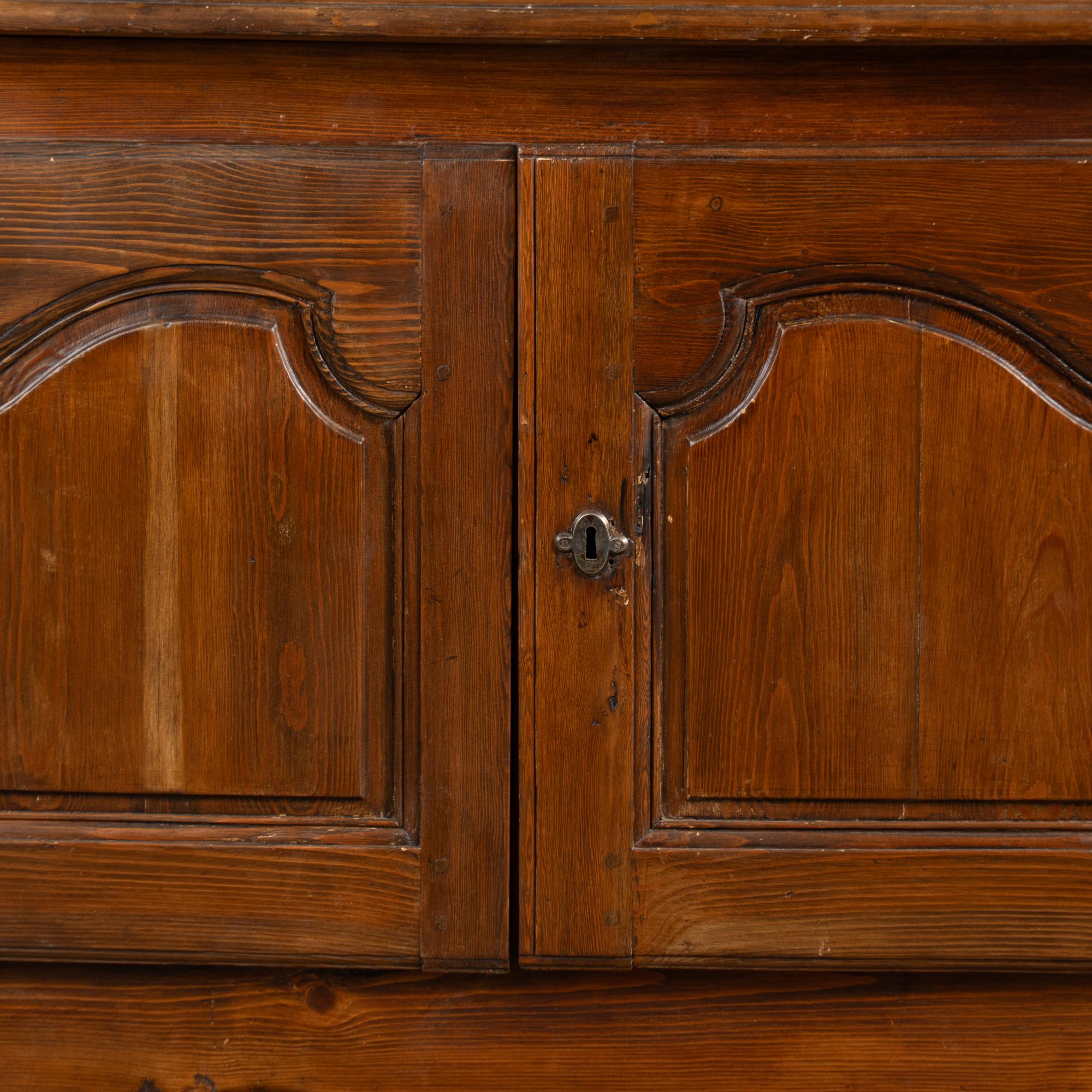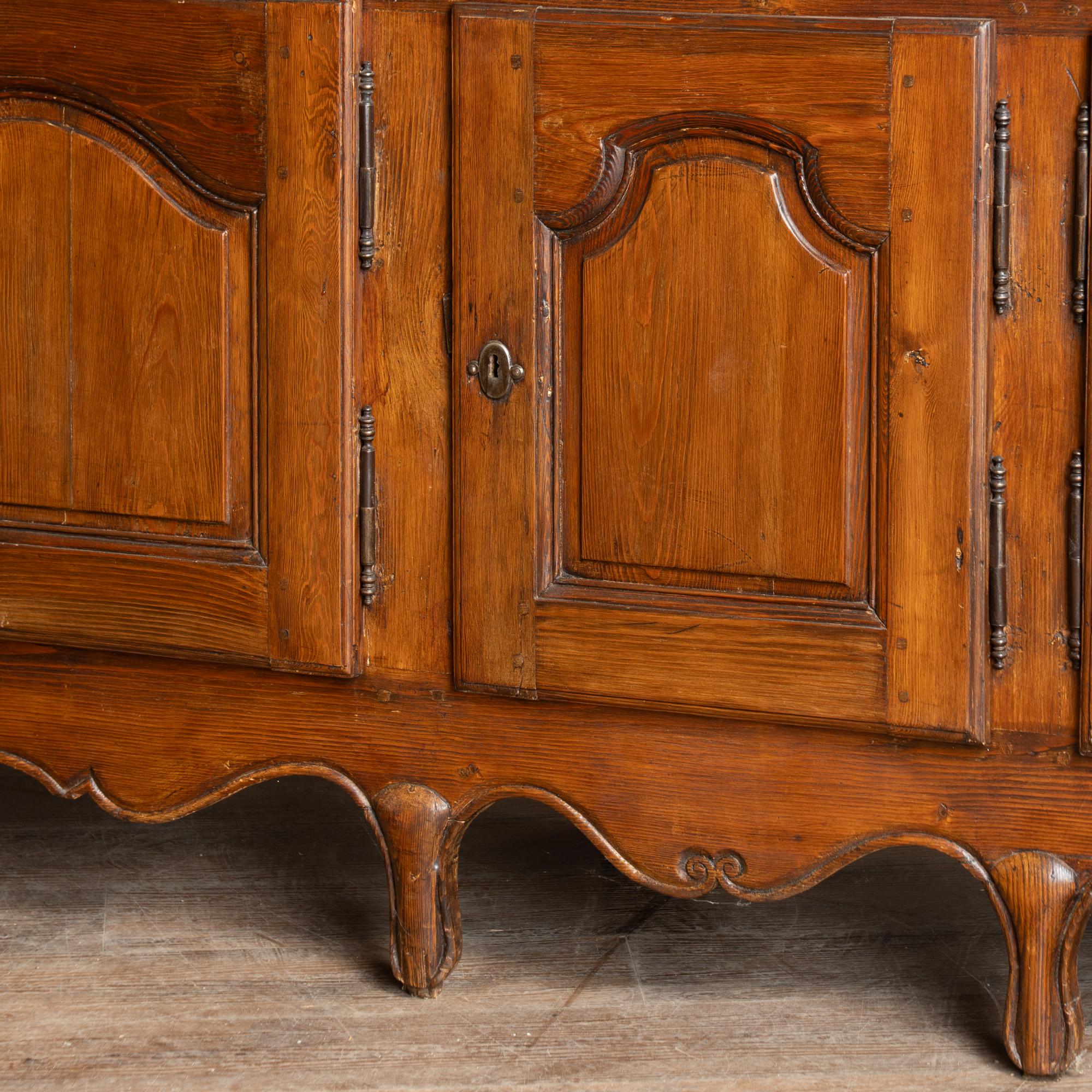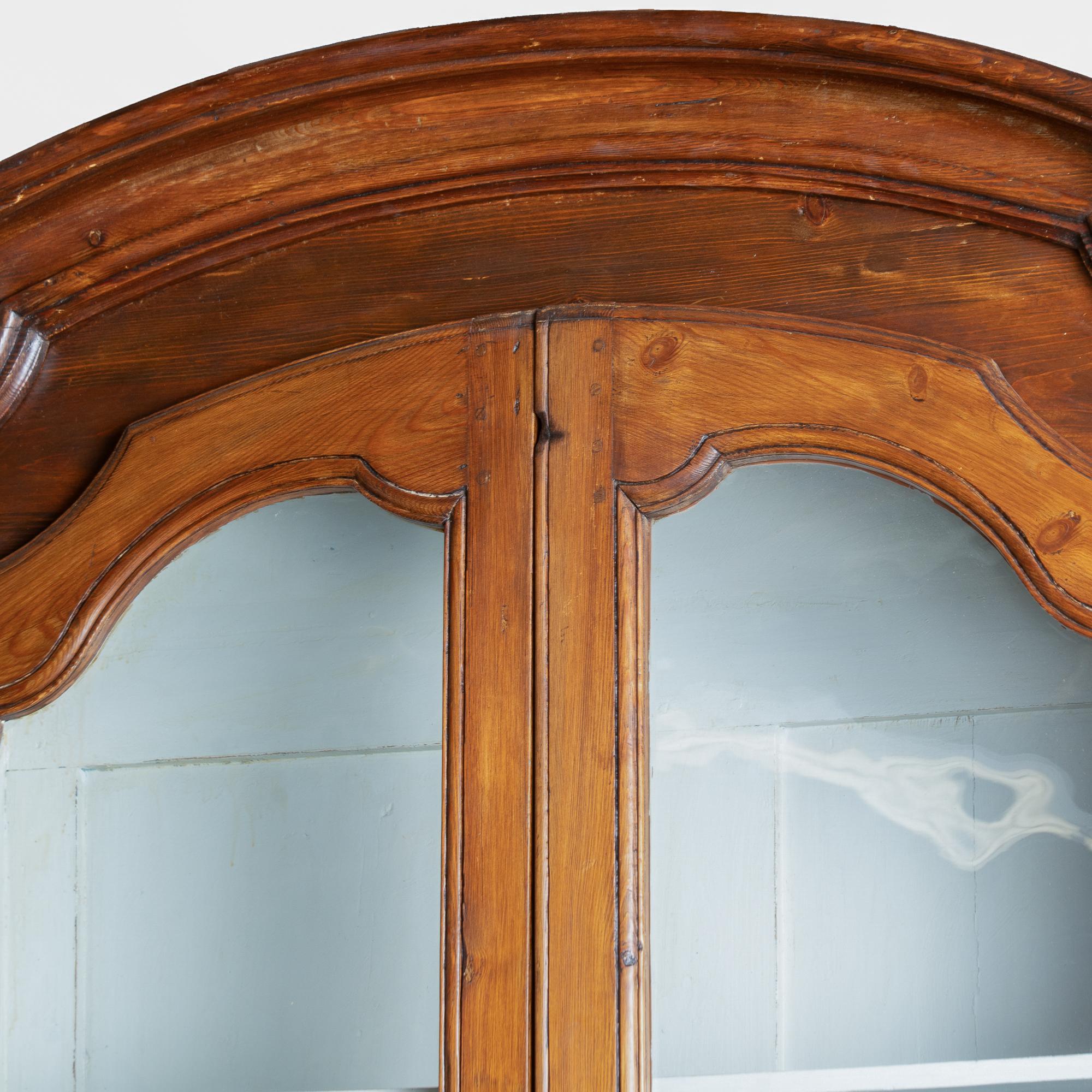 Impressive late 18th-century French pine bookcase showing a deep aged patina and traditional provincial design. At over ten feet tall, the two-part ("Deux Corp") cabinet offers substantial storage and a commanding presence for displaying collections. The scalloped carved skirt and curved feet add graceful detail; rear feet show expected scuffs and wear from years of use.