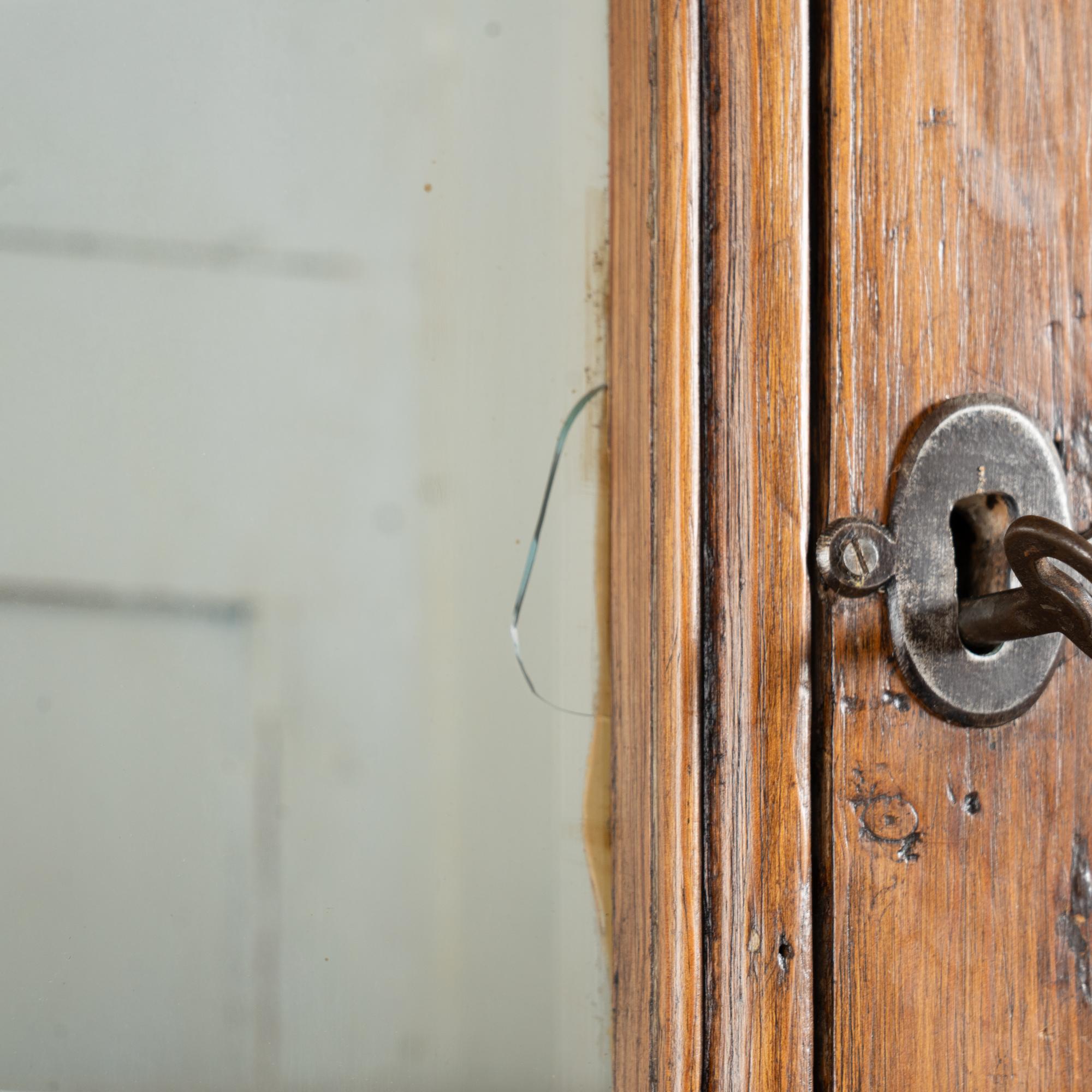 Restored, strong, and stable, the interior has been painted a newer pale blue-gray. Original French long hinges remain in place; three skeleton keys are included. Some locks function, while others use key to serve as pulls only. Typical age-related signs of wear include cracks along lower doors and sides, as well as scuffs and wear throughout, especially along the top edge. Lower shelves in each section appear newer or replaced. All shelves are removable.