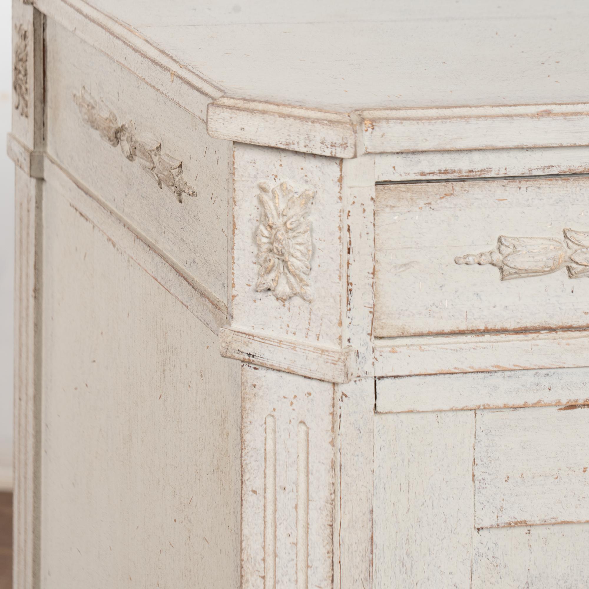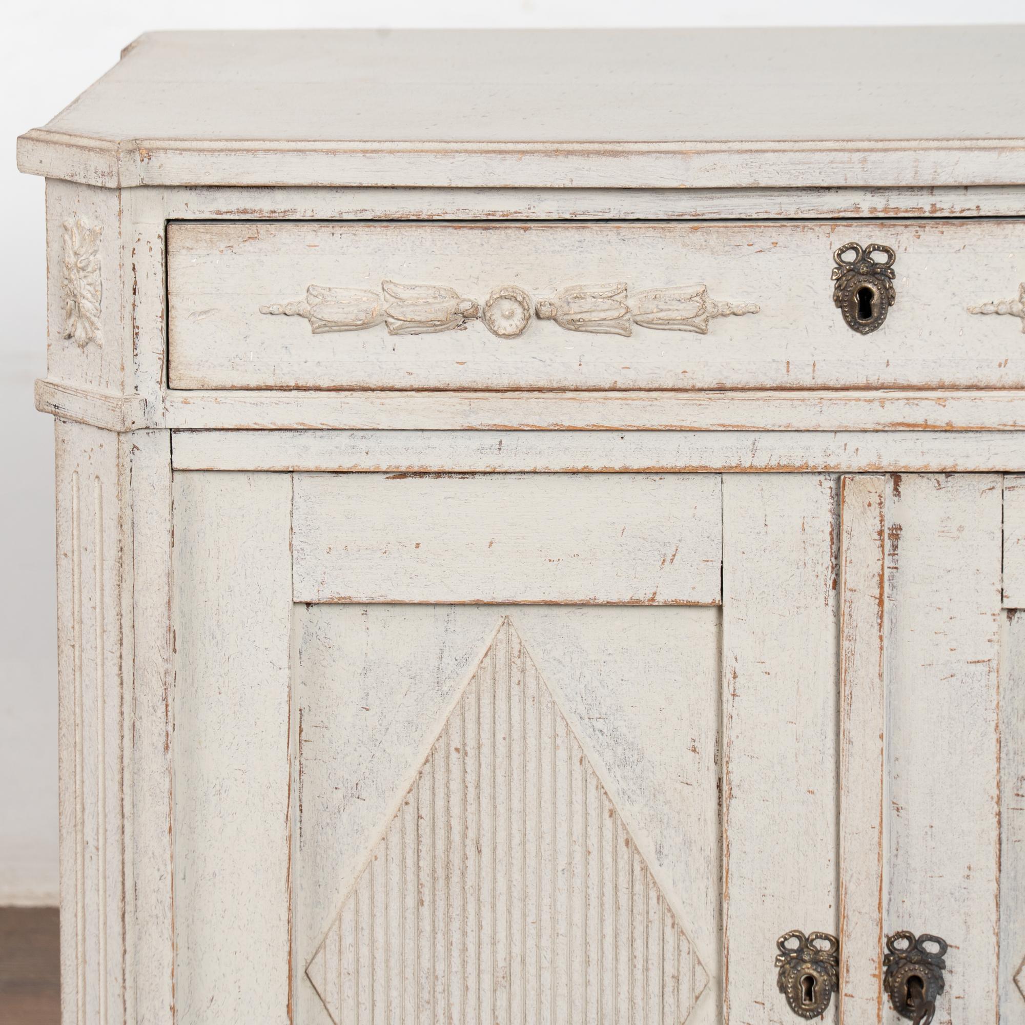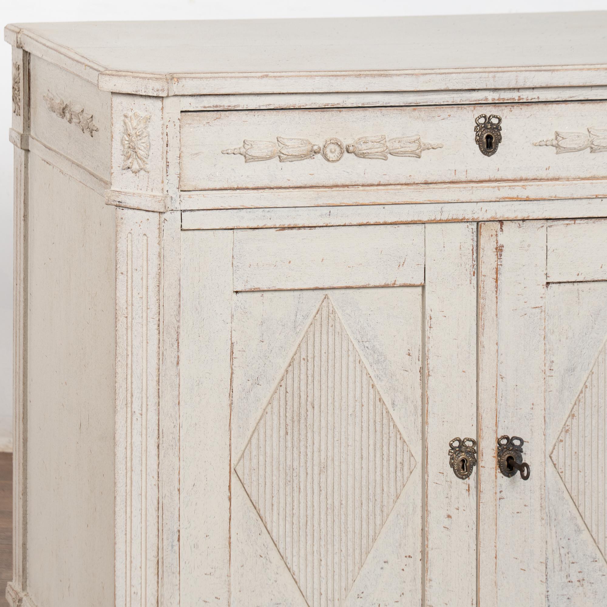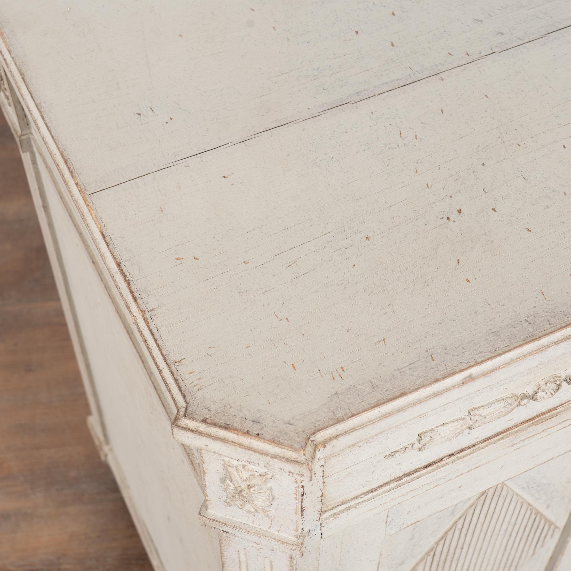 Later professionally painted in layered shades of antique white and lightly distressed to fit the age and grace of this Swedish sideboard. Color can appear between antique white and light gray depending on lighting. Enlarge photos for understanding of layers/distress to finish.