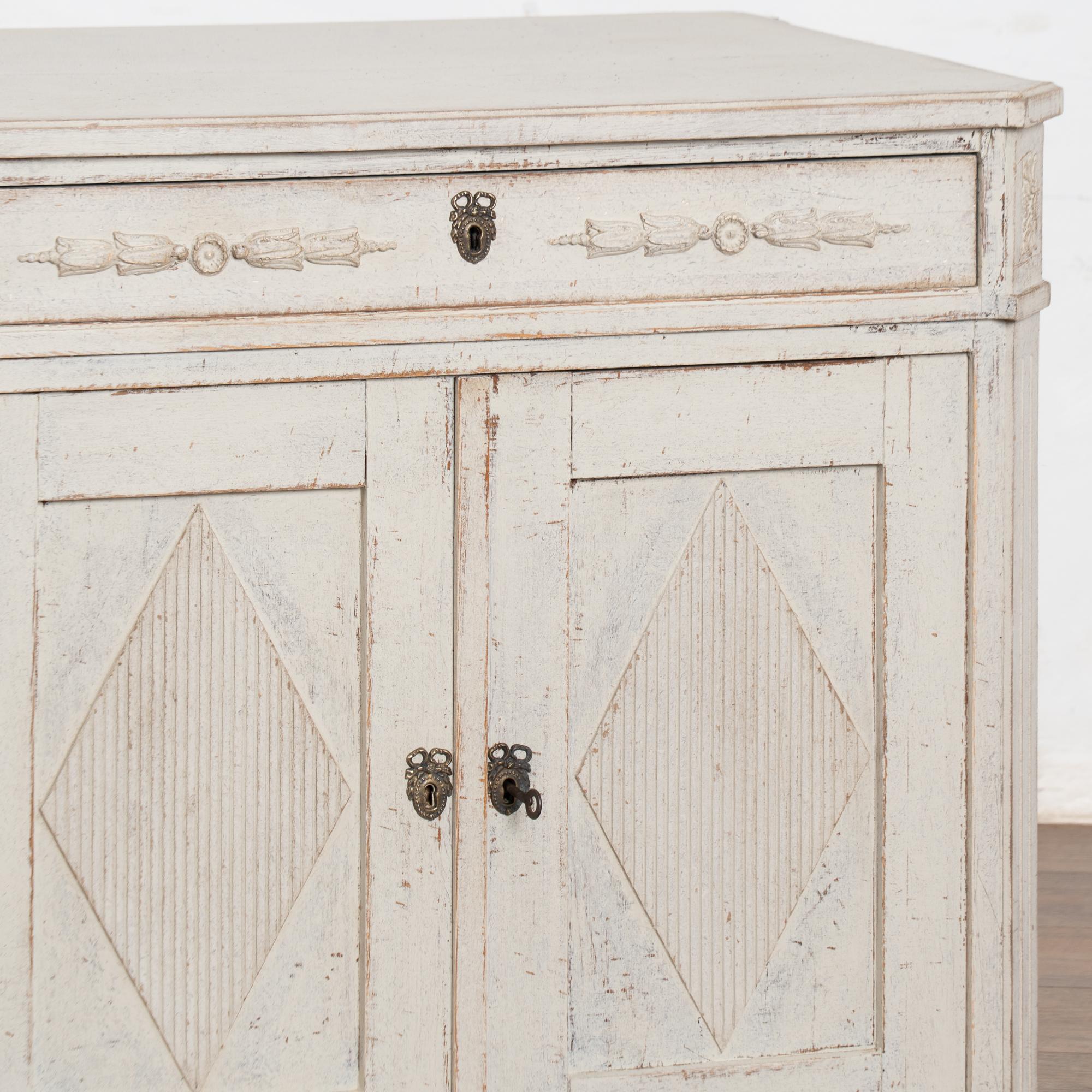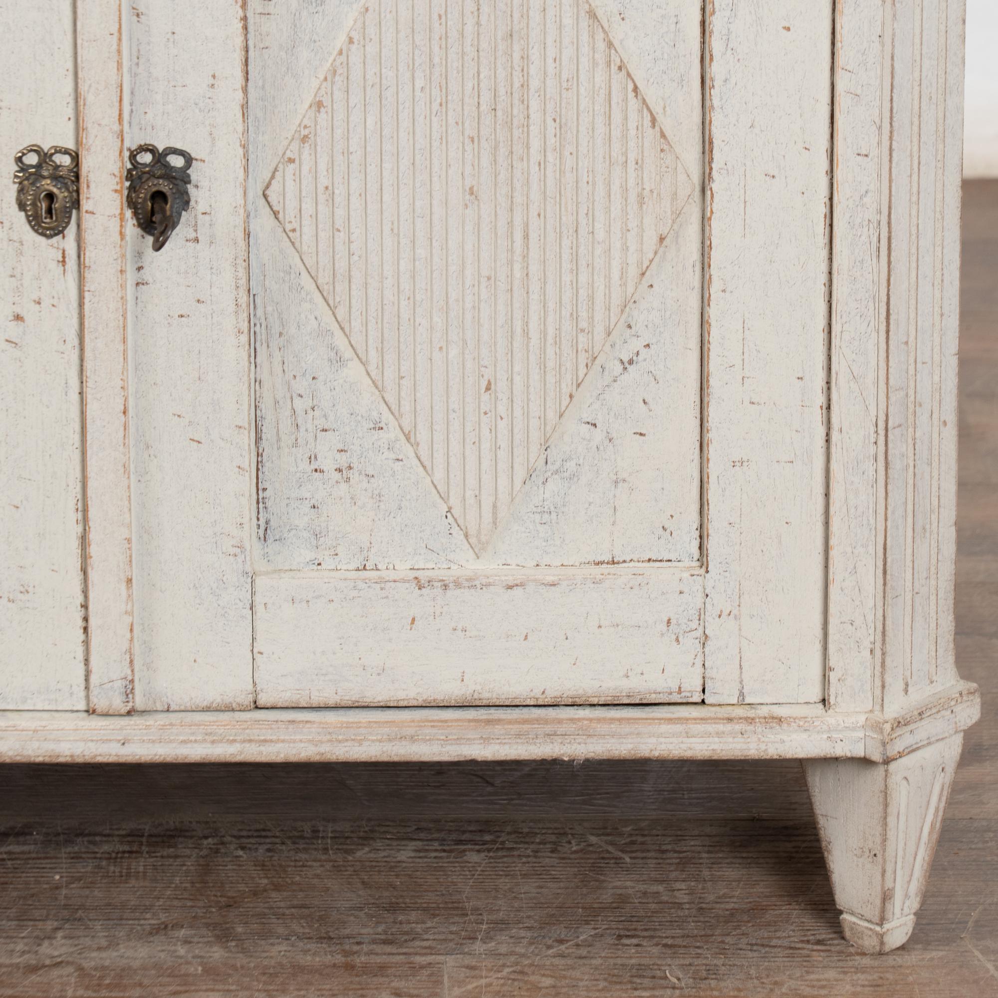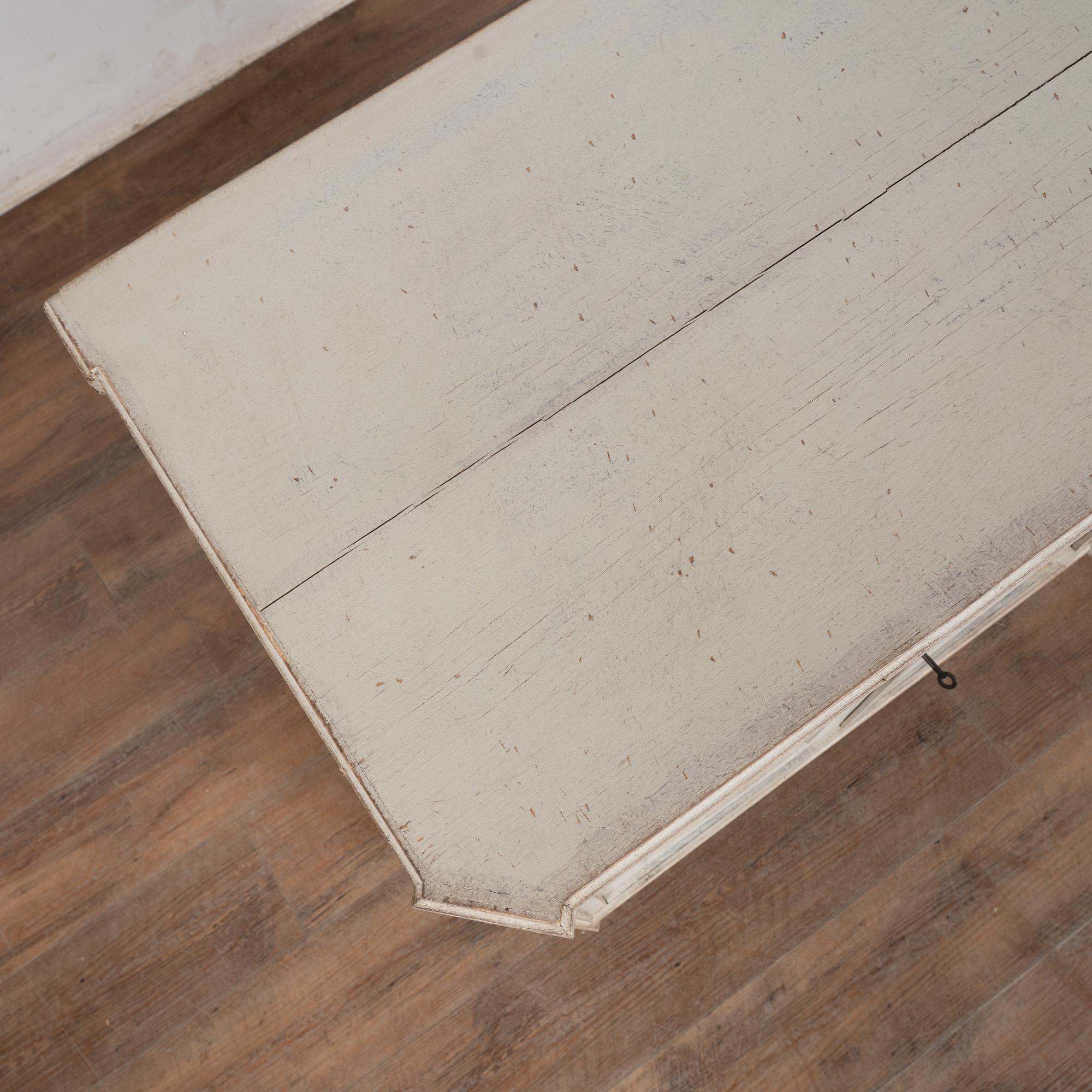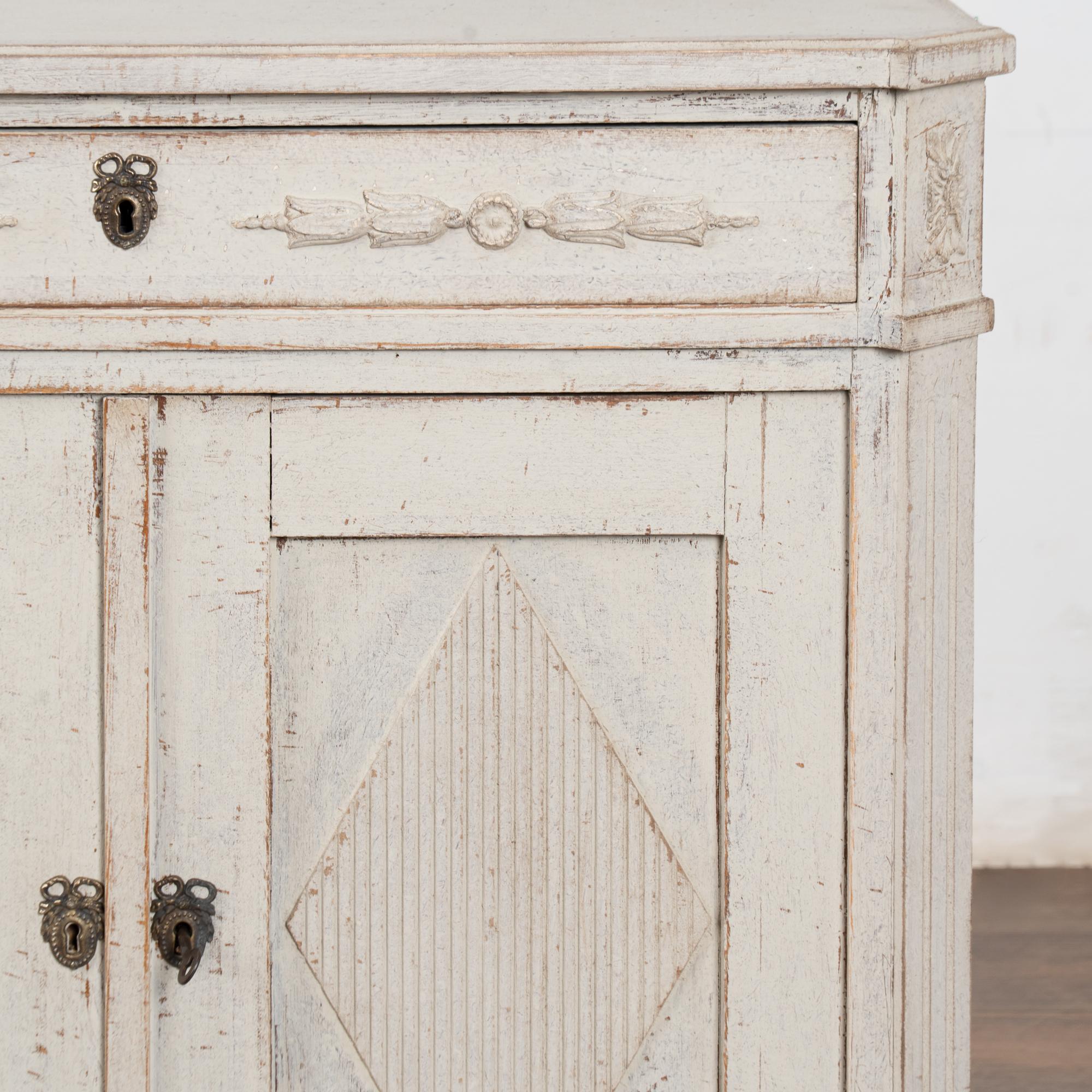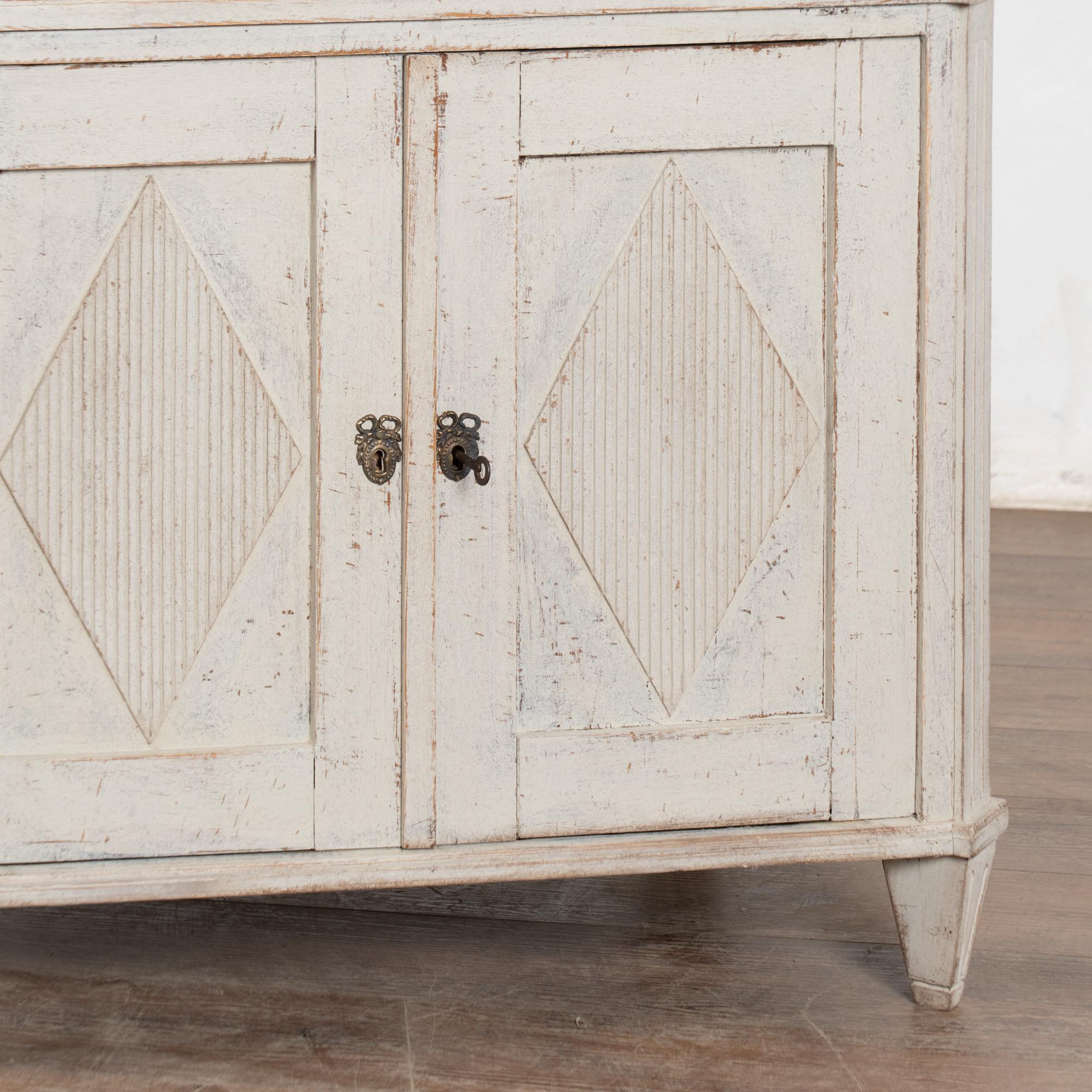 Later professionally painted in layered shades of antique white and lightly distressed to fit the age and grace of this Swedish sideboard. Color can appear between antique white and light gray depending on lighting. Enlarge photos for understanding of layers/distress to finish.