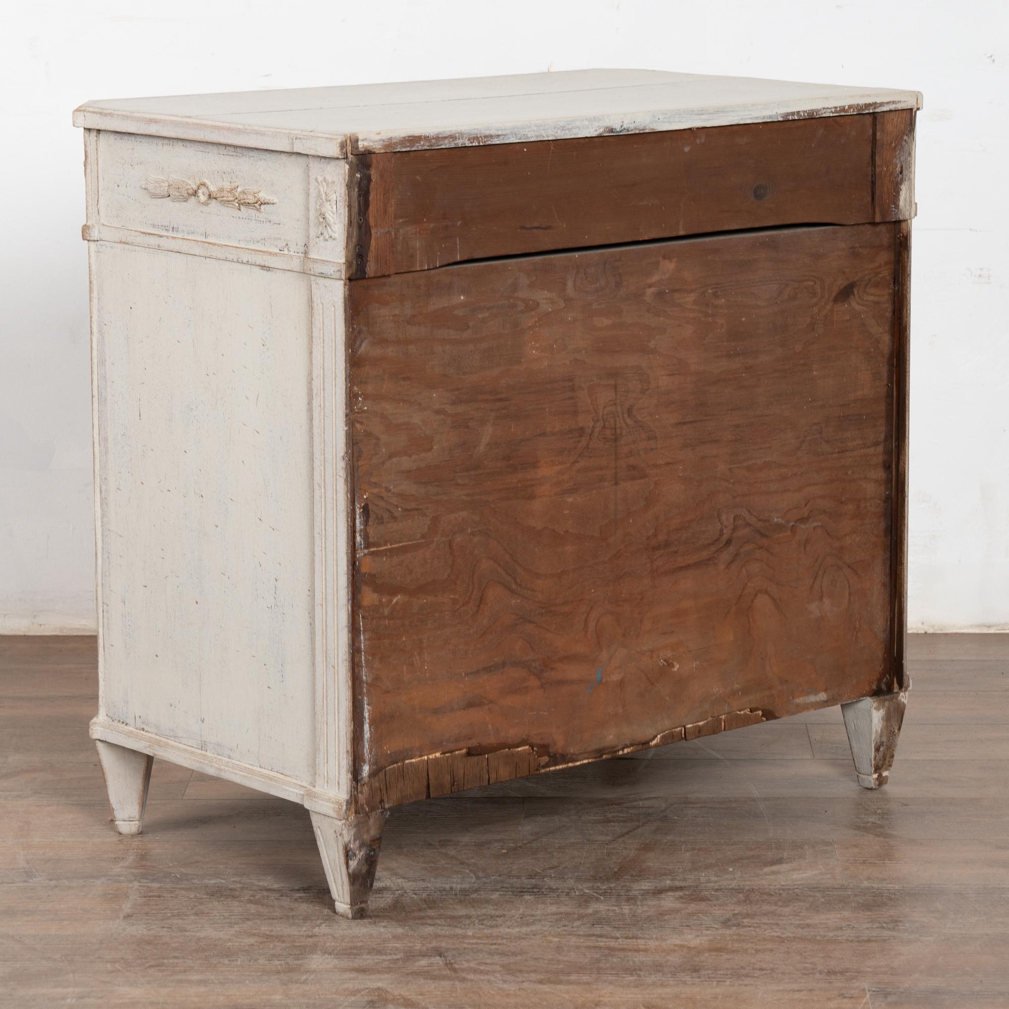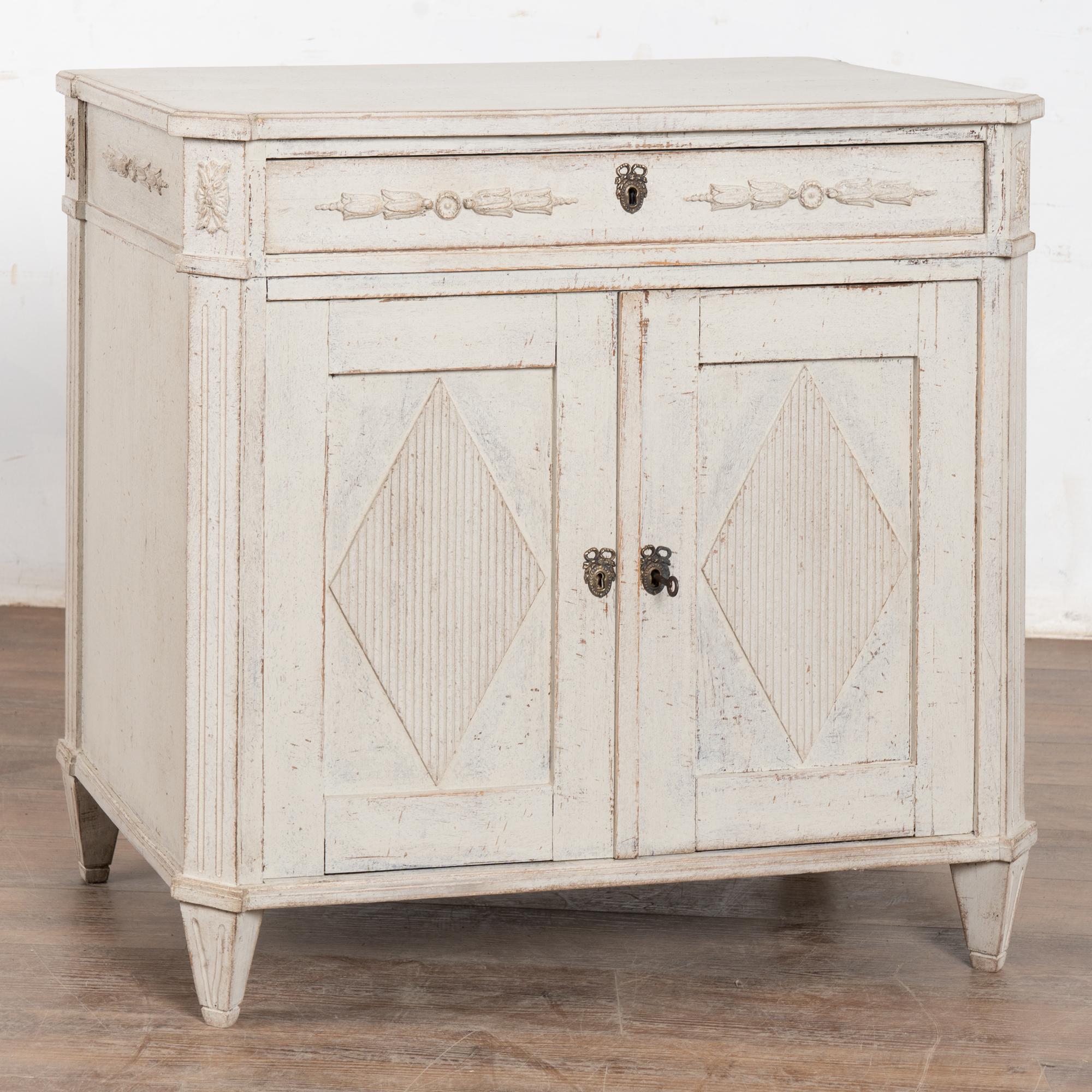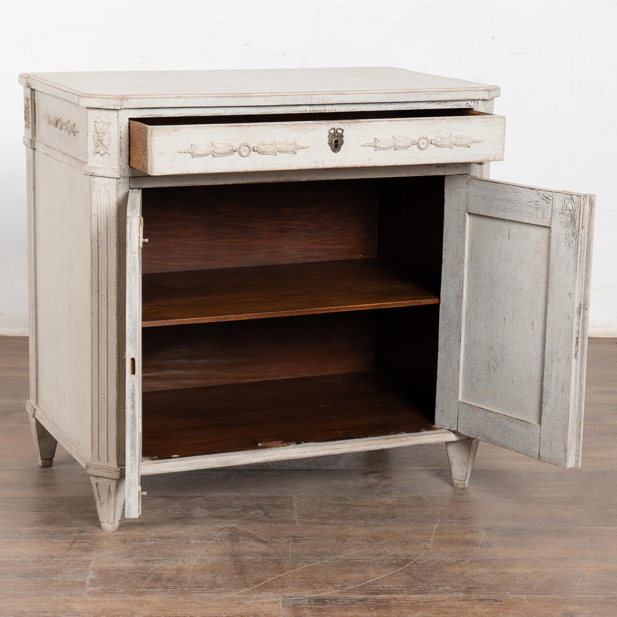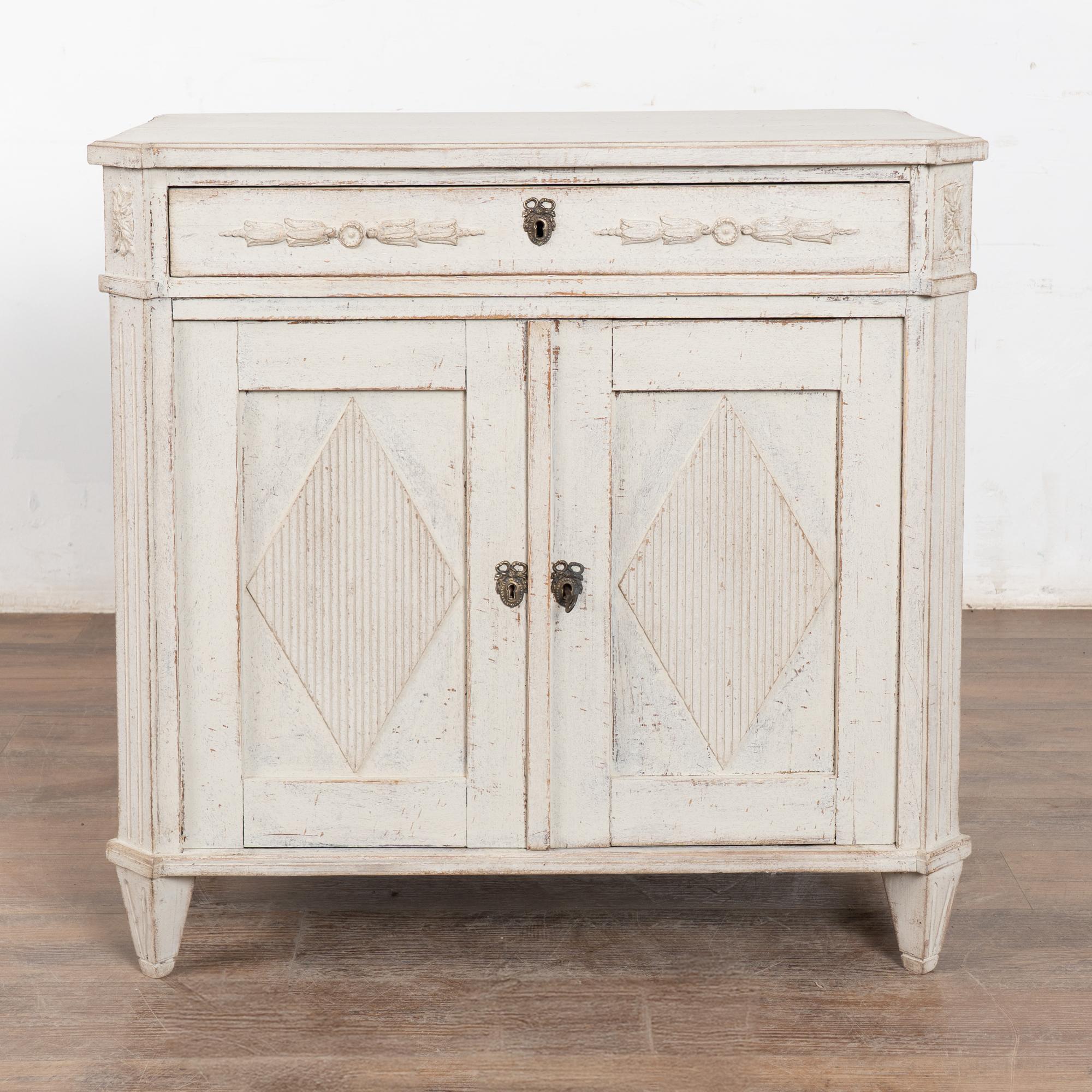 Later professionally painted in layered shades of antique white and lightly distressed to fit the age and grace of this Swedish sideboard. Color can appear between antique white and light gray depending on lighting. Enlarge photos for understanding of layers/distress to finish.