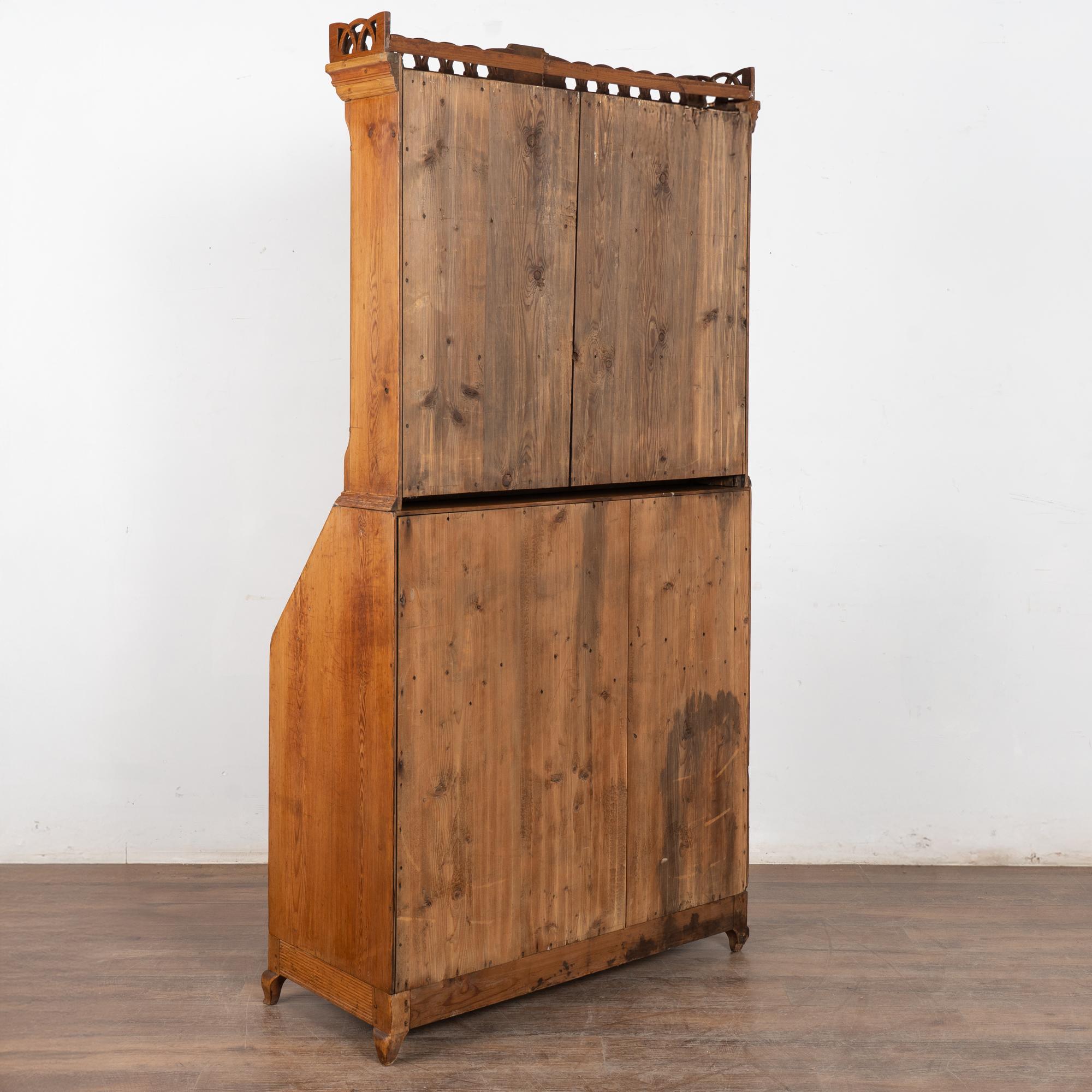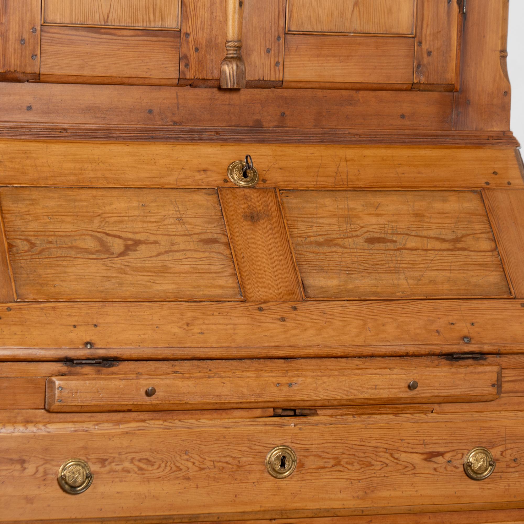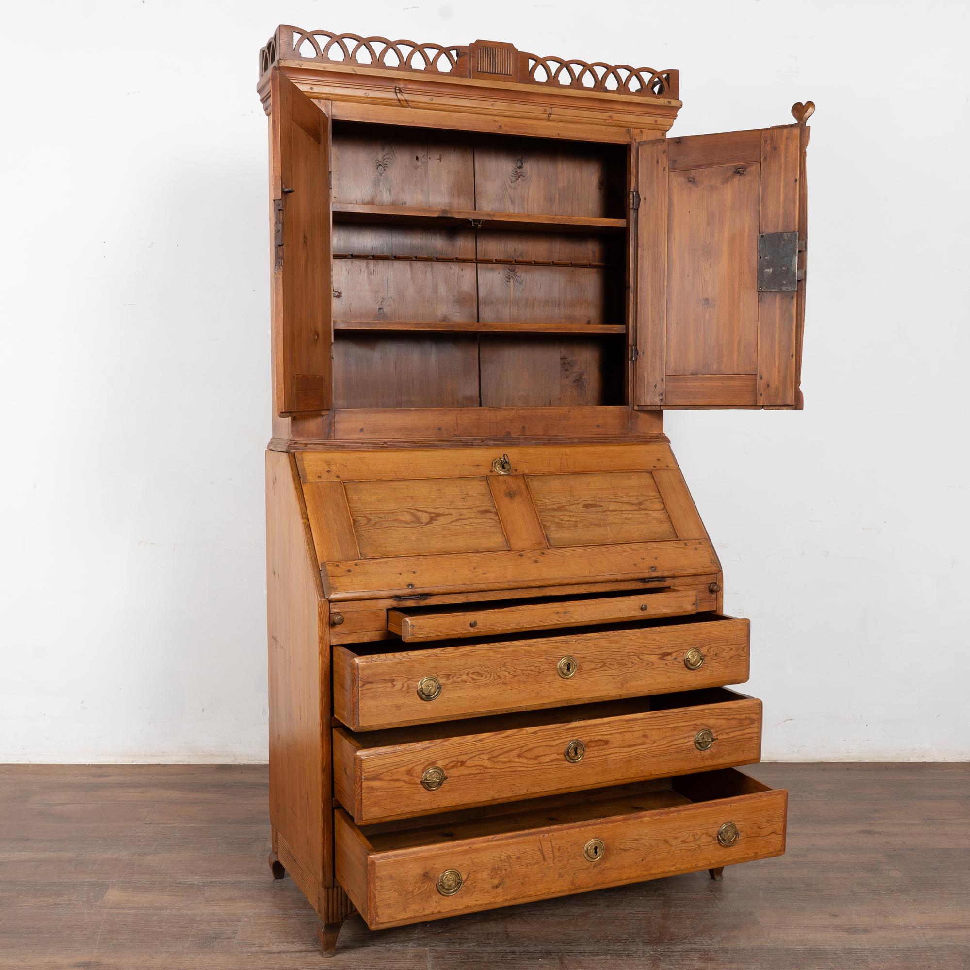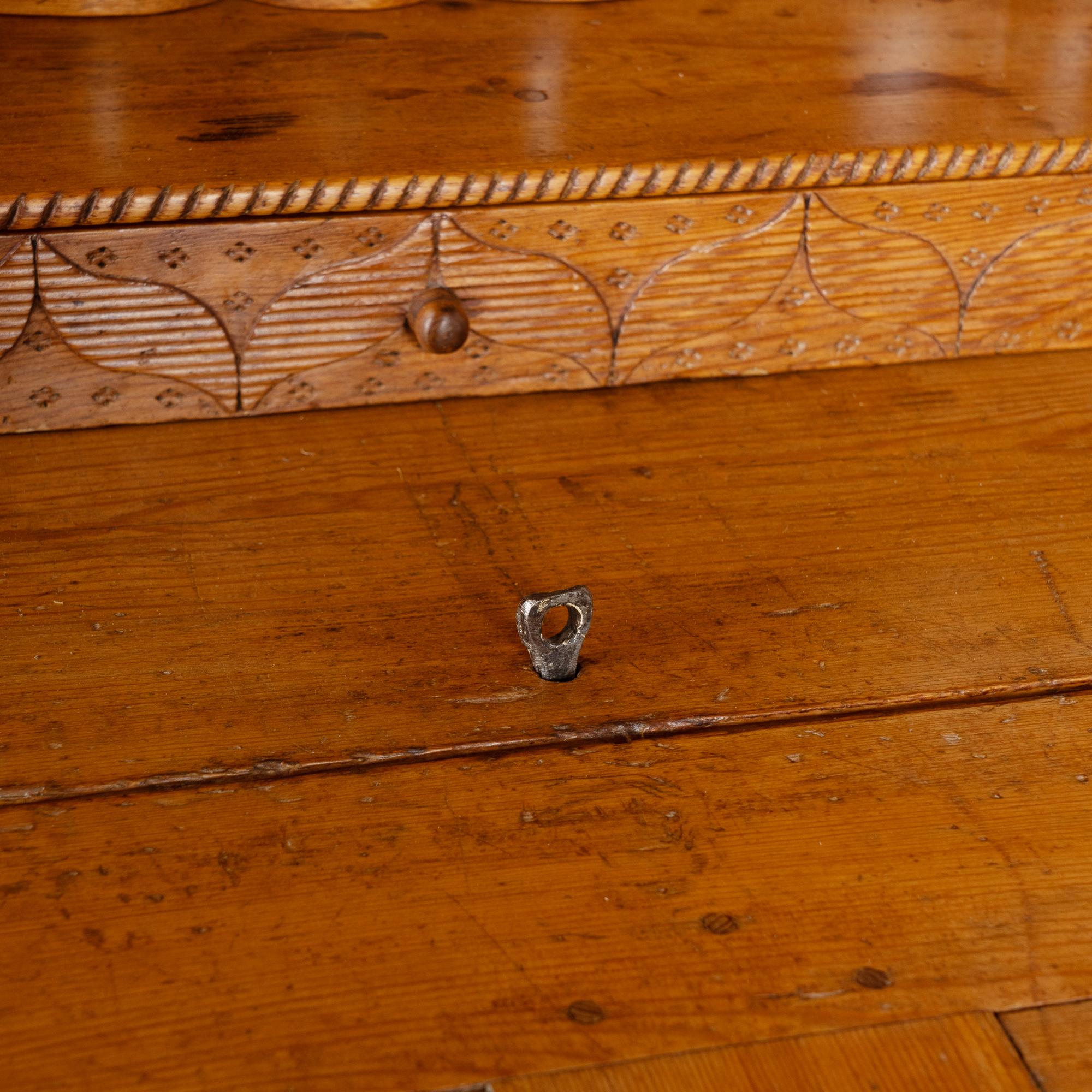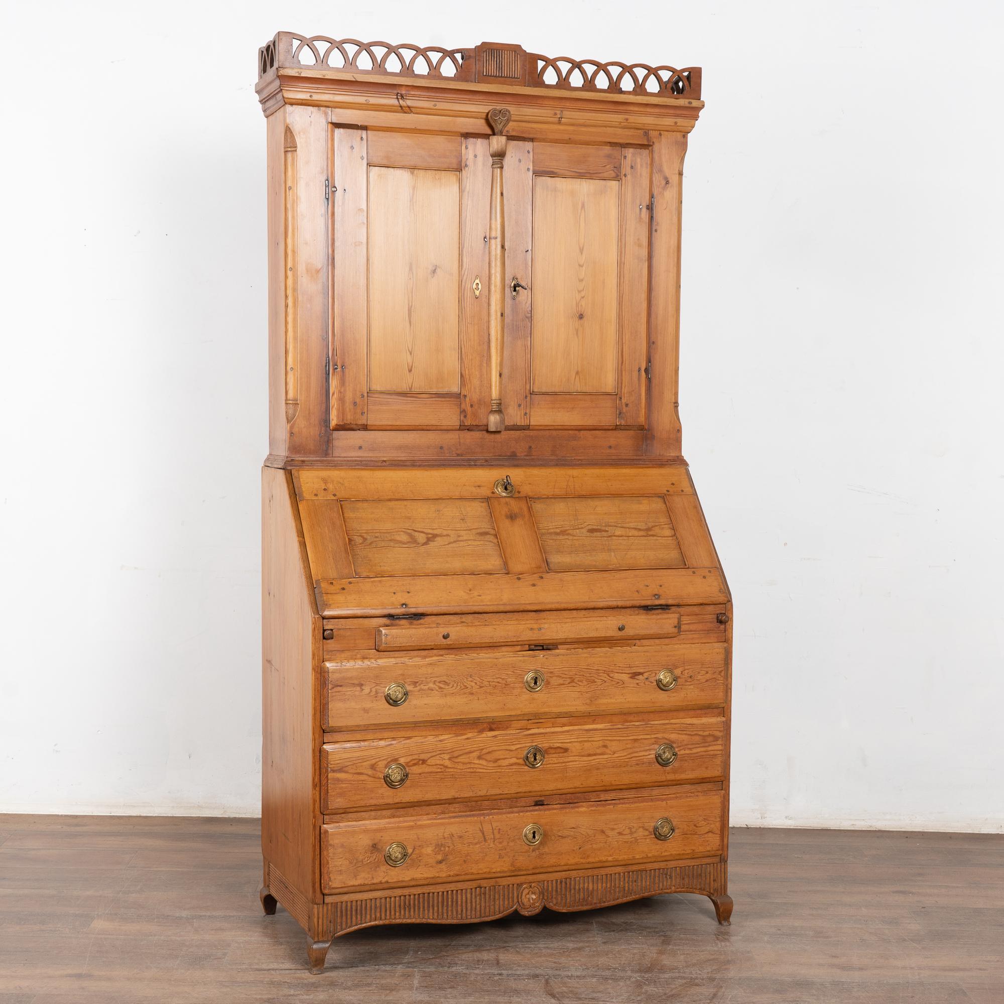 Early 19th-century Swedish pine secretary featuring exceptional hand-carved details and the warm, deep patina of 200 years of use. The lower section includes three large drawers topped by a narrow drawer, all opening with brass pulls. The upper cabinet is crowned with latticework and a decorative carved heart at the center door. Interior includes two shelves and a central notched rack originally used to display family silver.