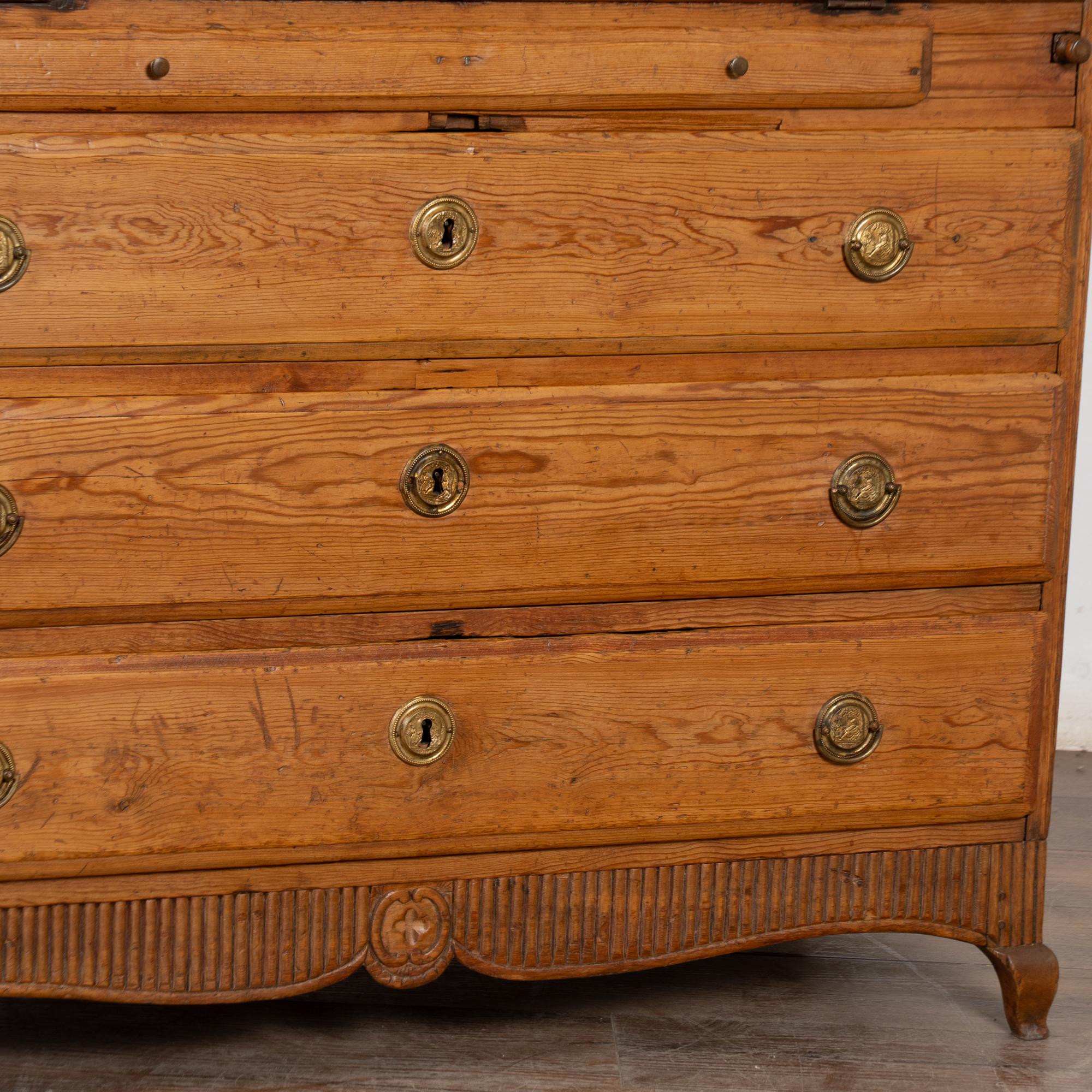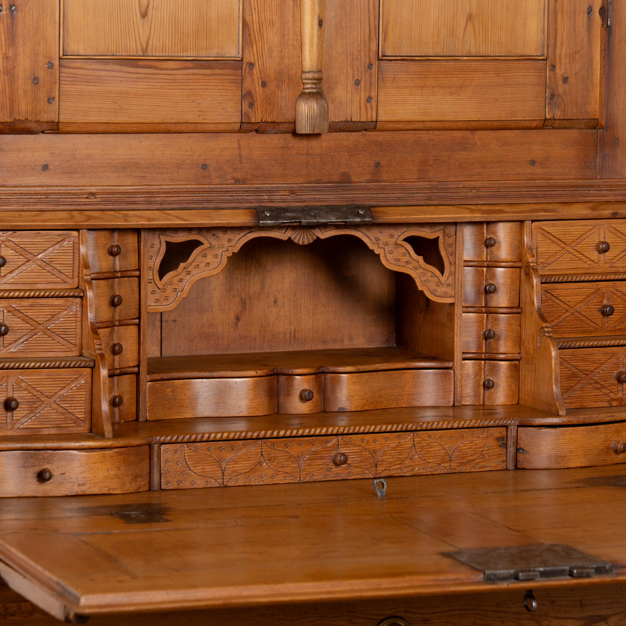 The drop-front desk opens to an interior showcasing impressive craftsmanship, with multiple carved drawers and curved drawer fronts that required advanced skill during construction. The writing surface rests on extending wood arms. Old locks on both the upper cabinet and central desk still function, though stiffly. Fluted carving continues across the skirt and sides, reflecting classic Swedish styling.