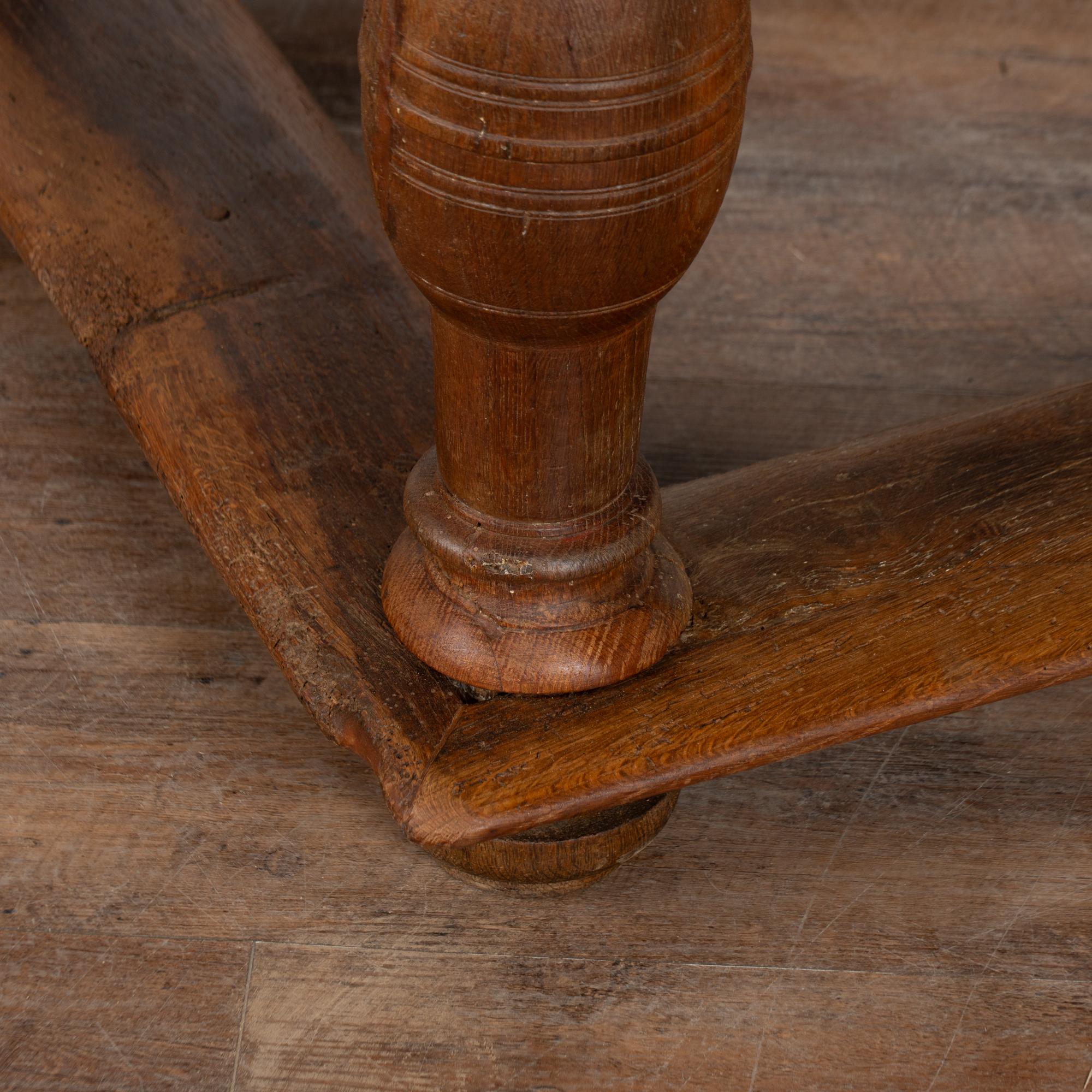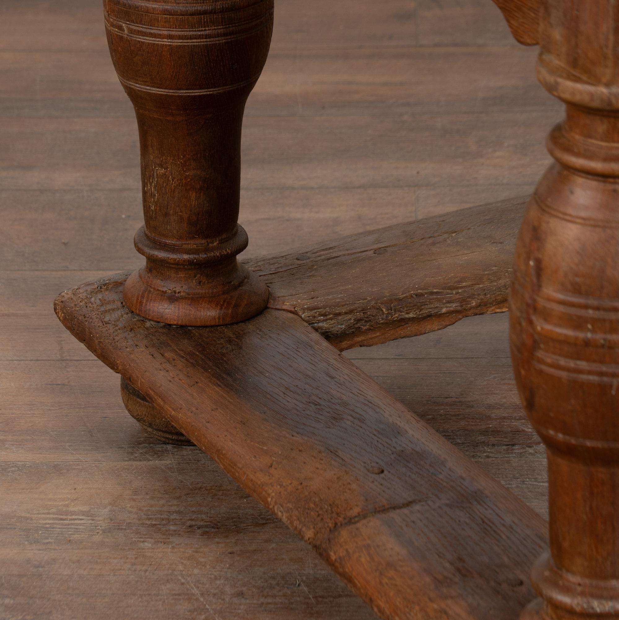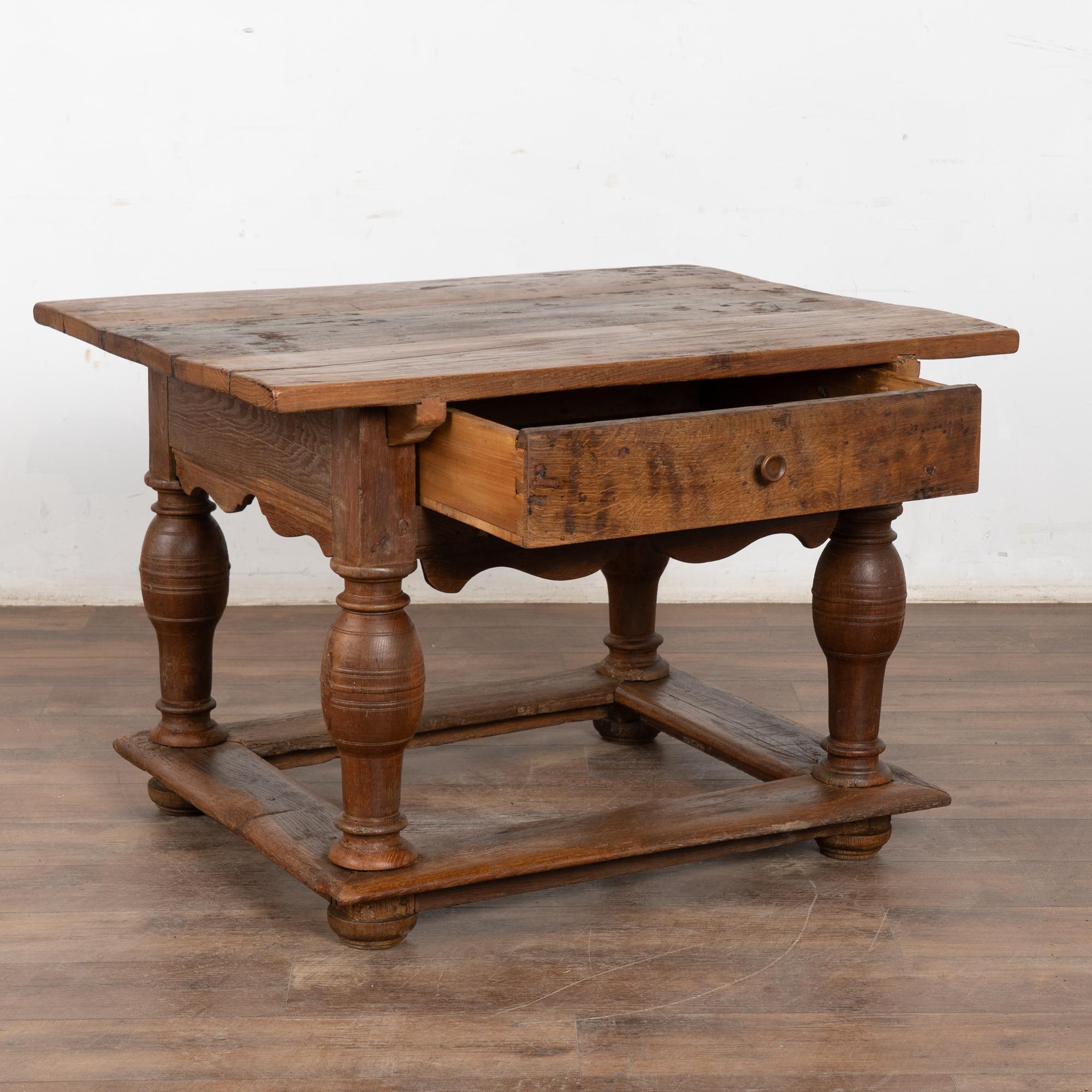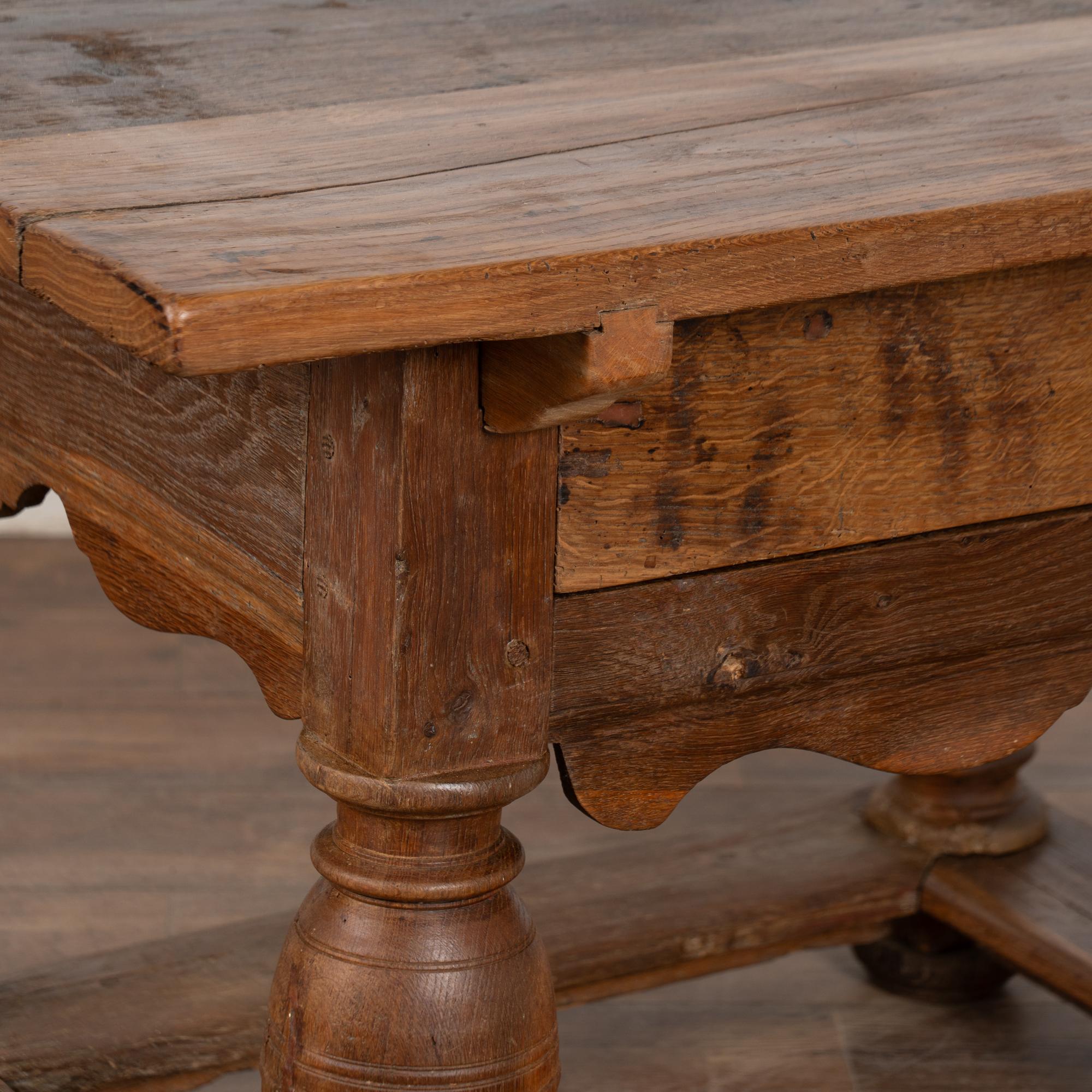 Baroque Danish oak table with a single drawer. Constructed of oak, the table features heavily turned legs connected by a square-shaped stretcher base. Scalloped skirt encircles the table. The top shows extensive evidence of age and use, including knots, gouges, stains, scratches, cracks, and additional surface wear, with similar distress visible throughout the piece. The table has been restored, is structurally strong, stable, and ready for use.