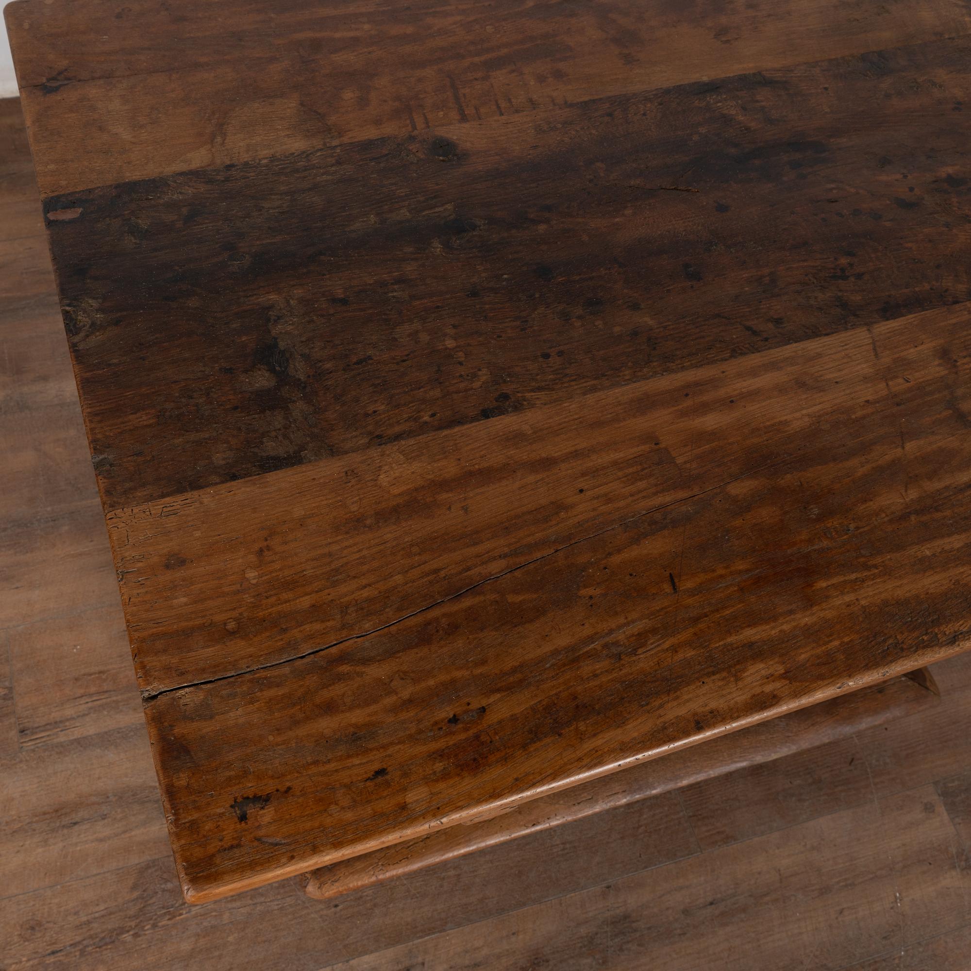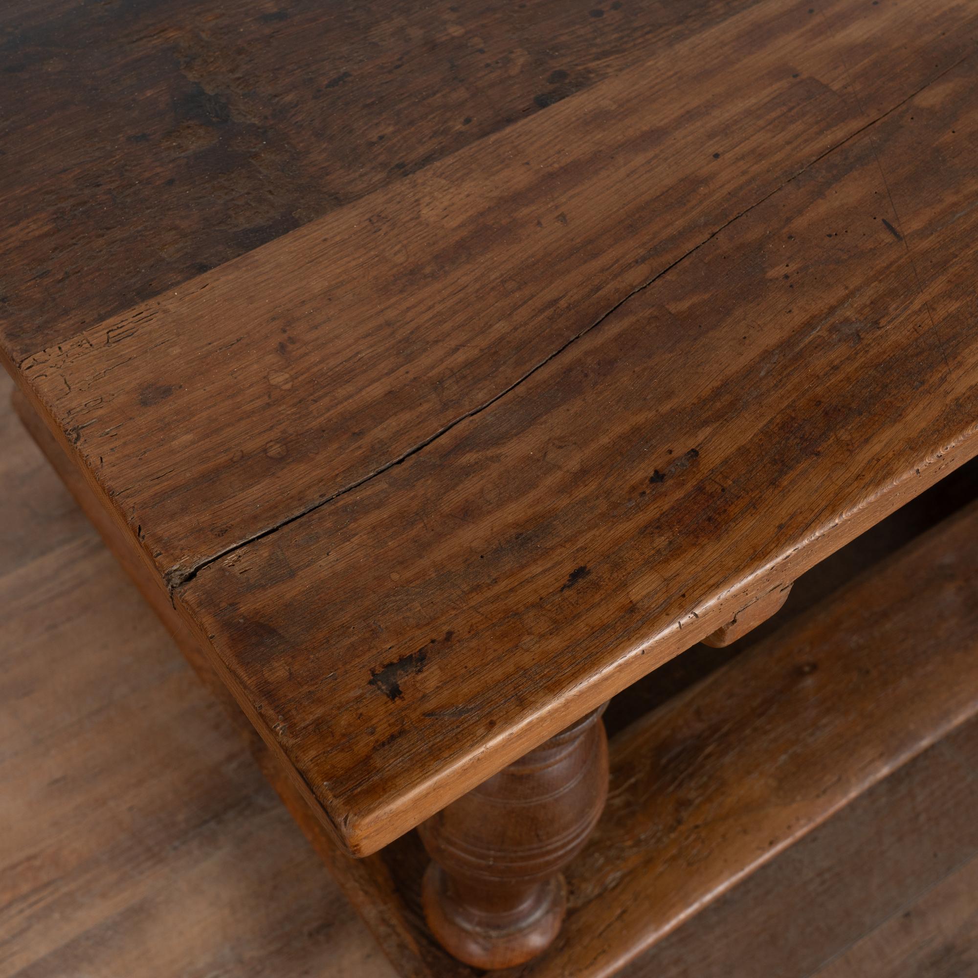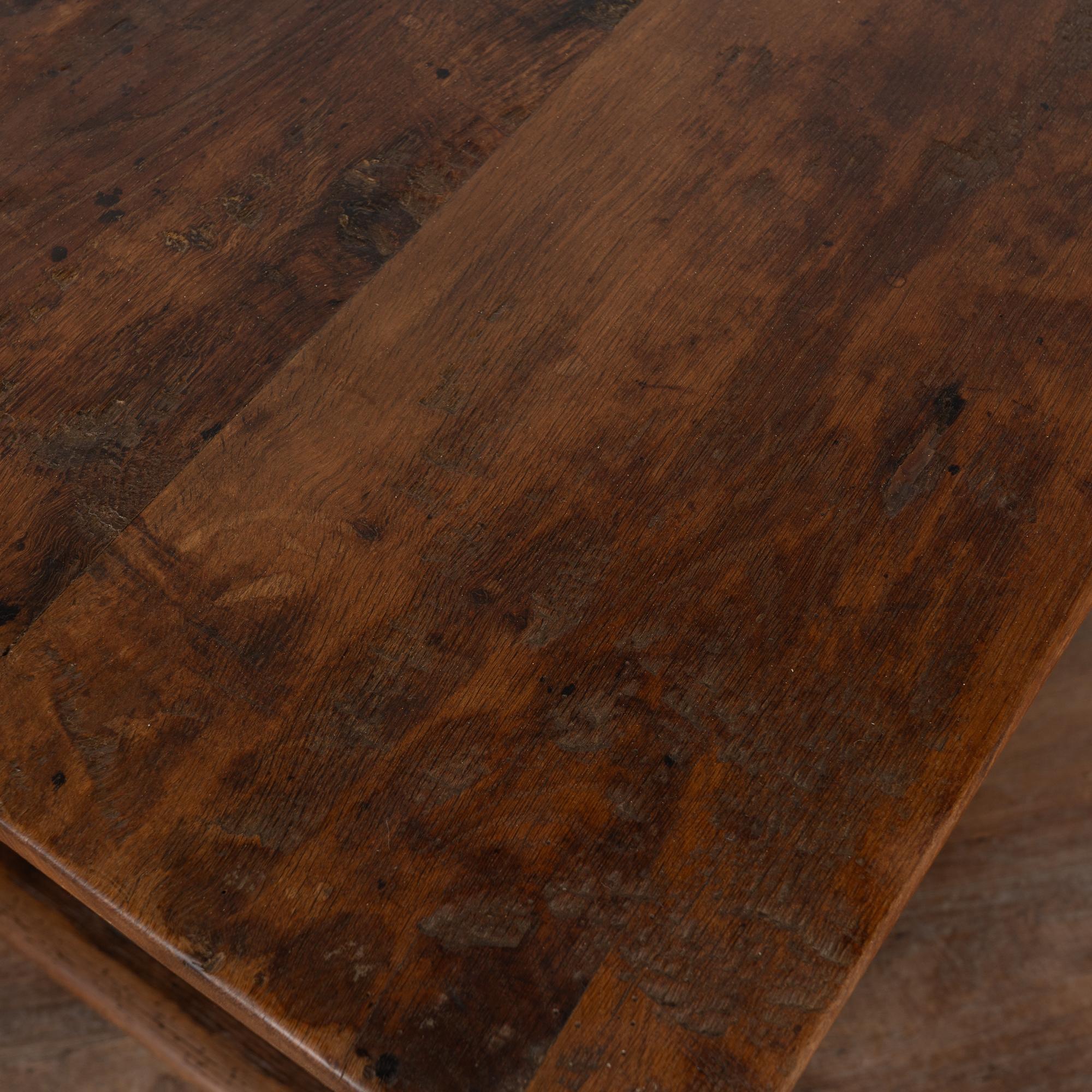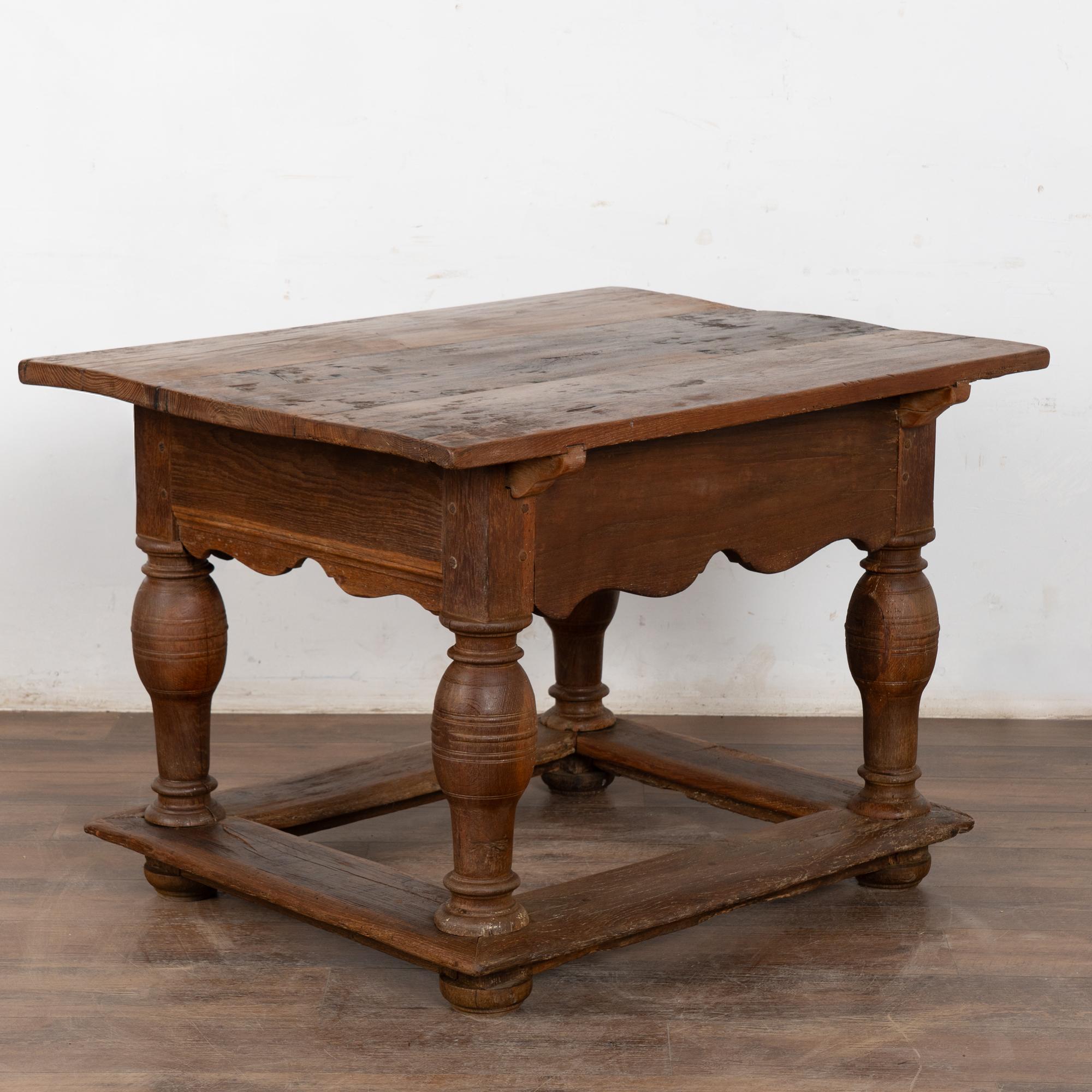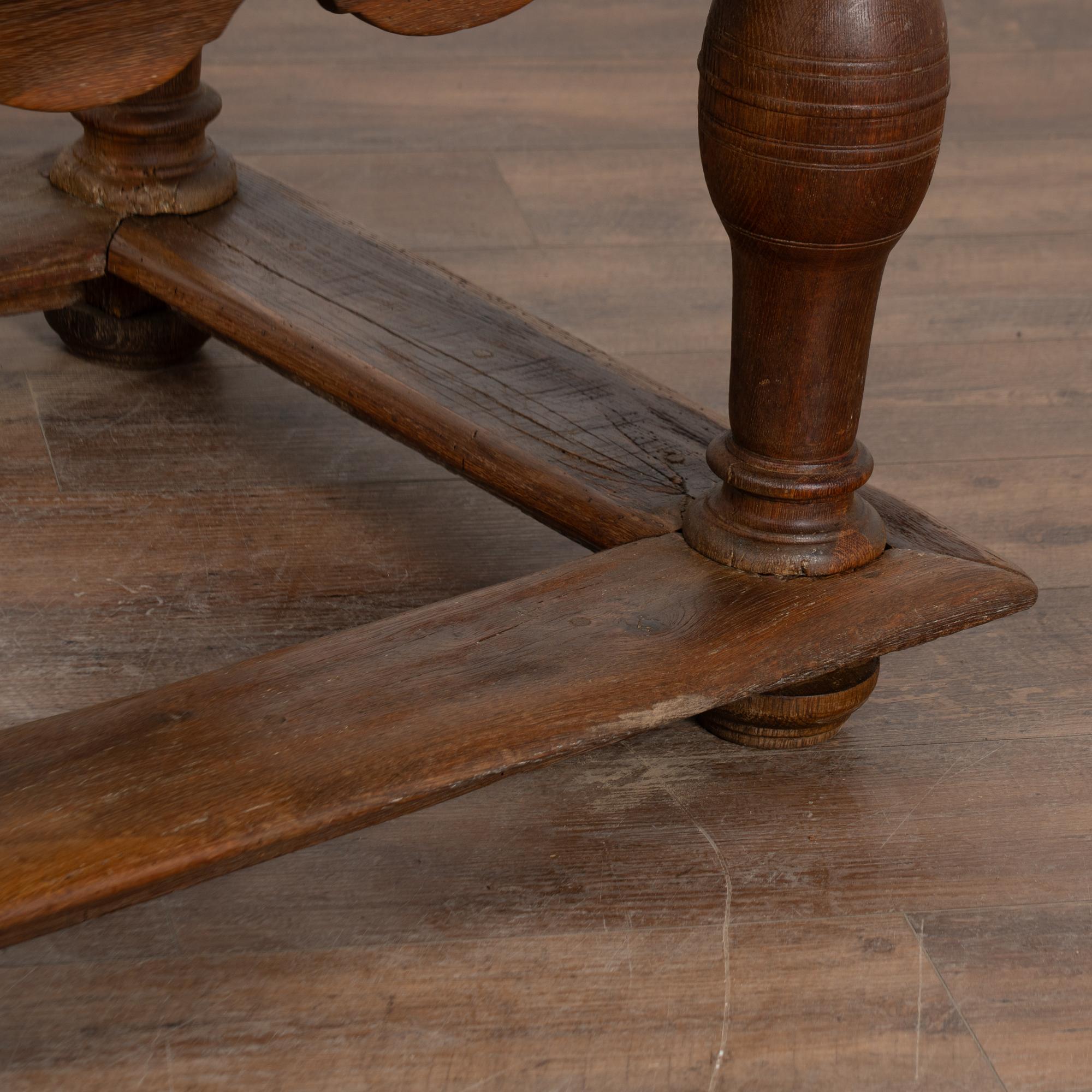 Baroque Danish oak table with a single drawer. Constructed of oak, the table features heavily turned legs connected by a square-shaped stretcher base. Scalloped skirt encircles the table. The top shows extensive evidence of age and use, including knots, gouges, stains, scratches, cracks, and additional surface wear, with similar distress visible throughout the piece. The table has been restored, is structurally strong, stable, and ready for use.