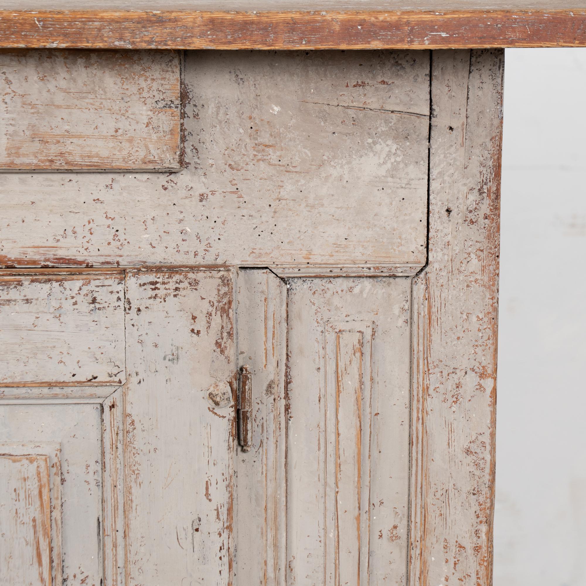 The original gray painted finish has been distressed through generations of use, revealing the warm, aged pine patina underneath.