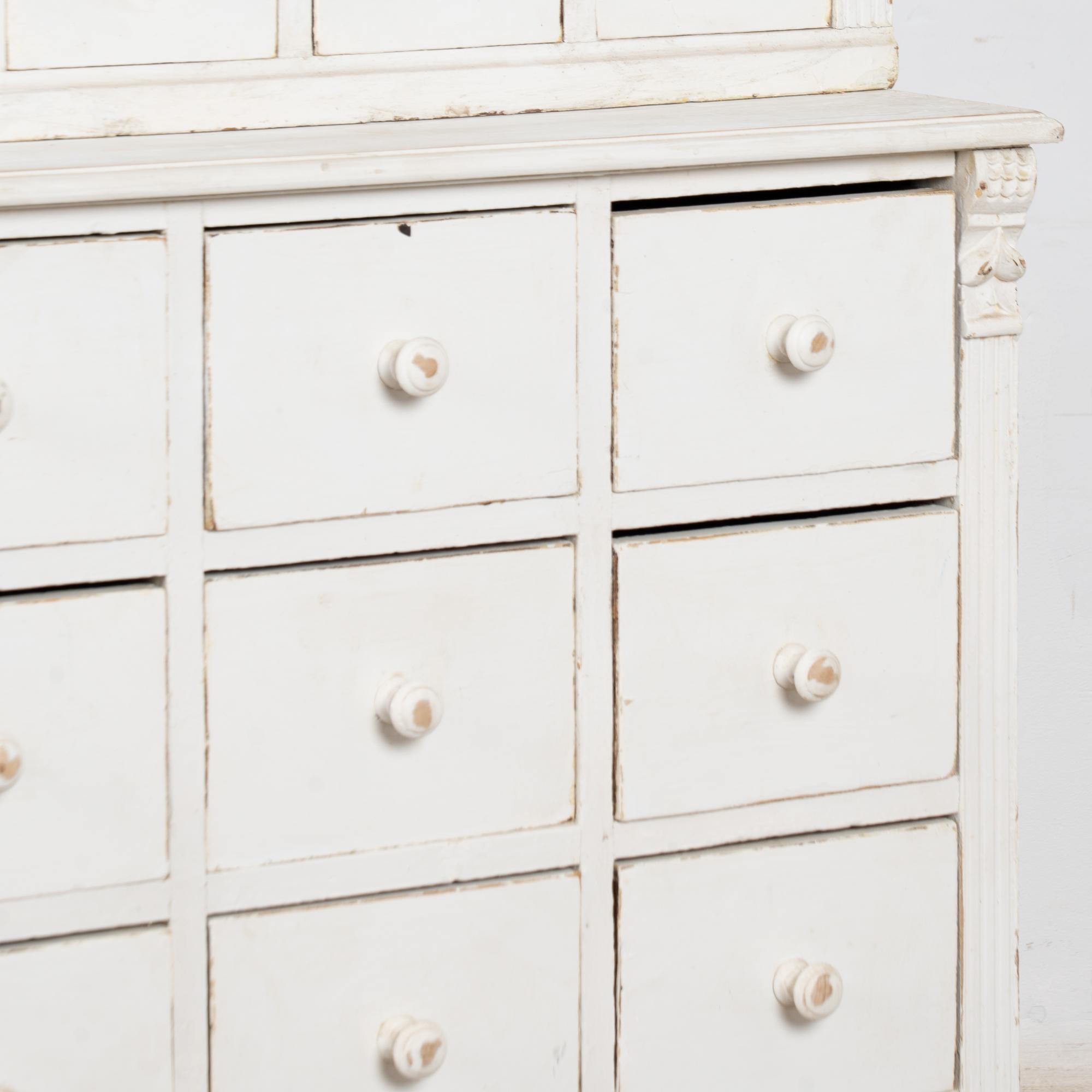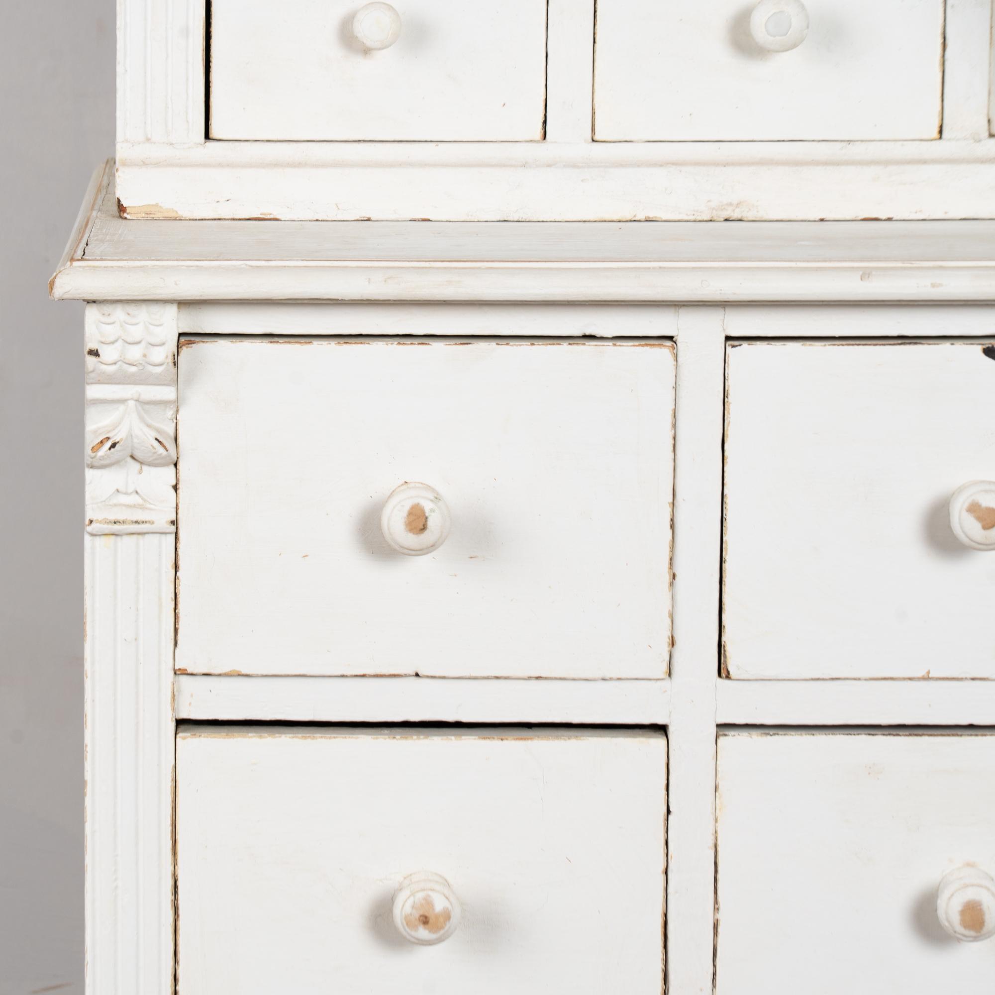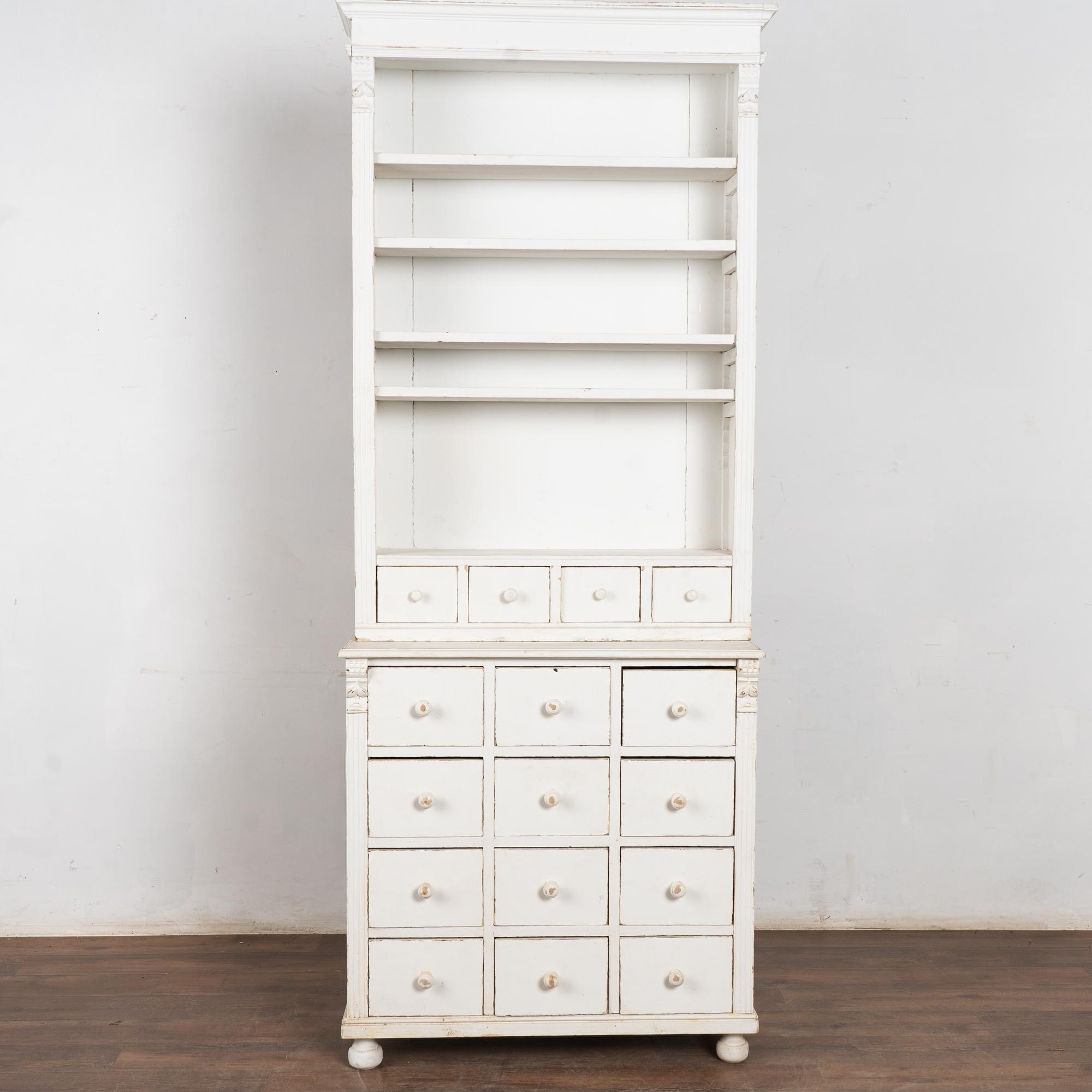 This country pine display cabinet may also be used as a bookcase, with adjustable shelves and 16 apothecary style drawers to add versatile storage and display options.