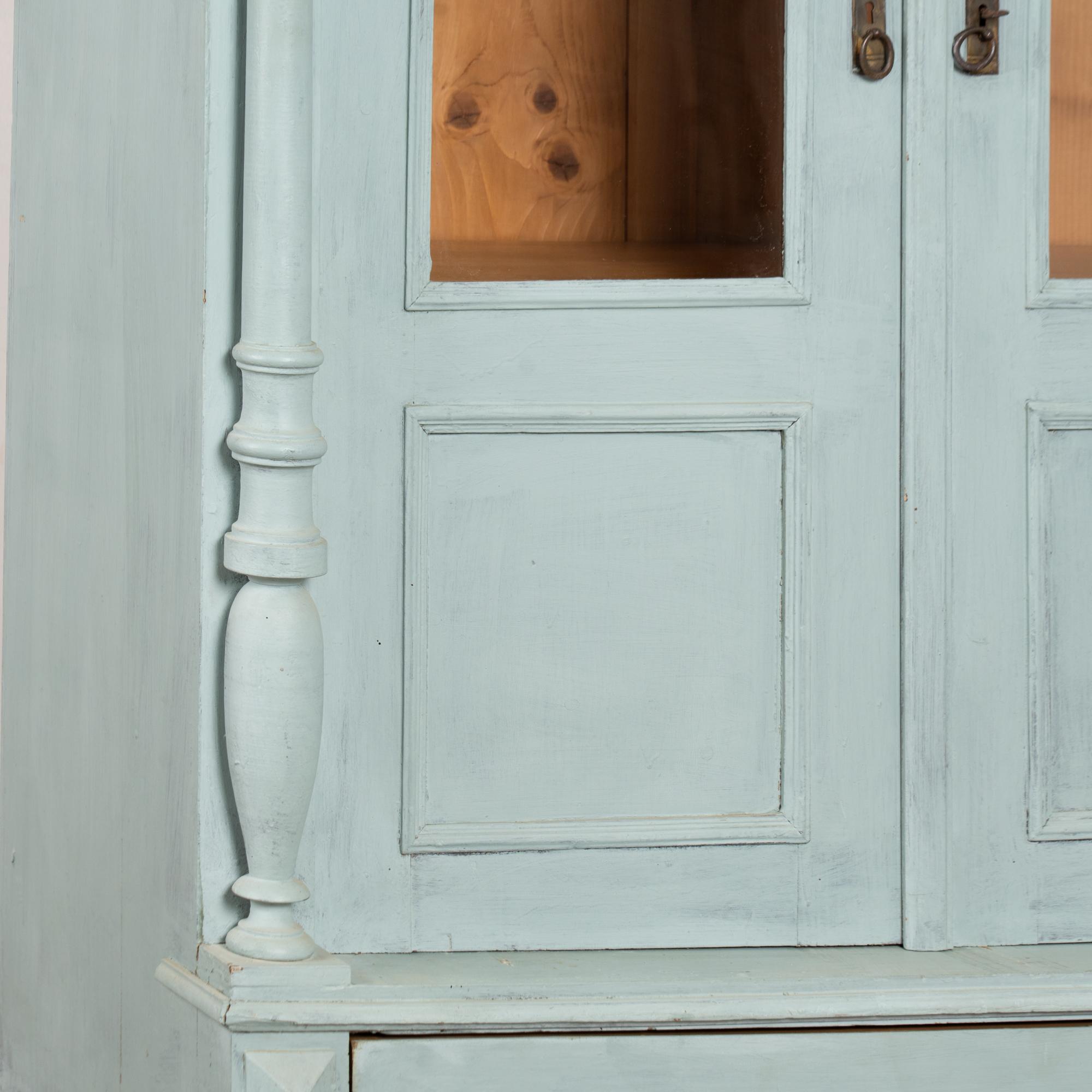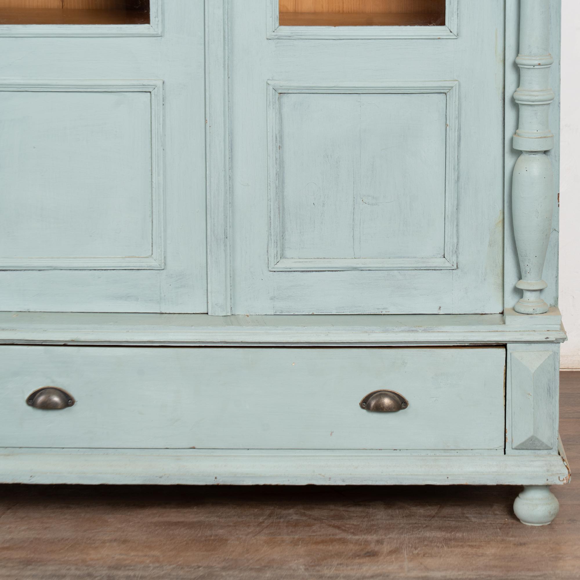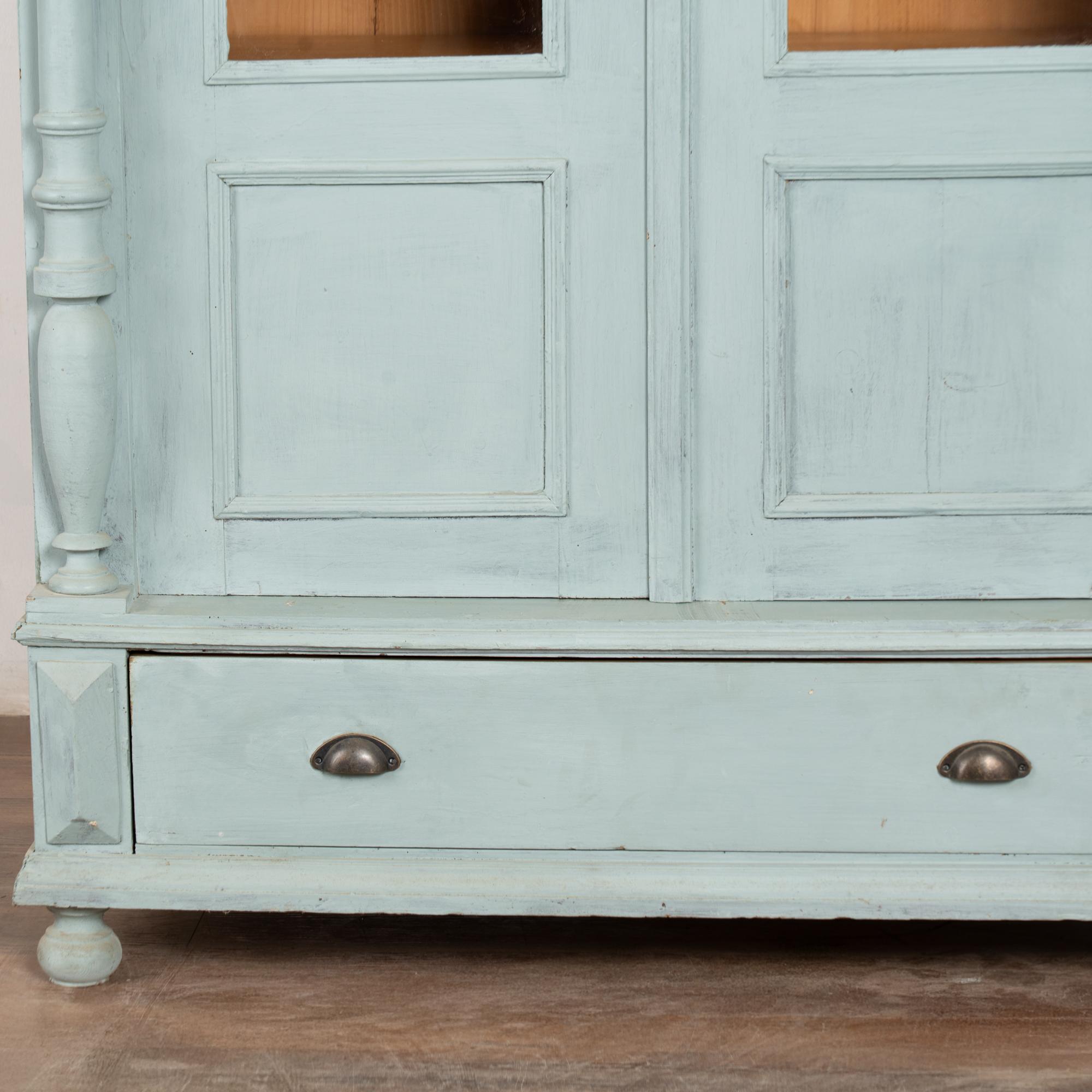 Blue painted pine bookcase with two glass panel doors flanked by turned columns over single lower drawer.