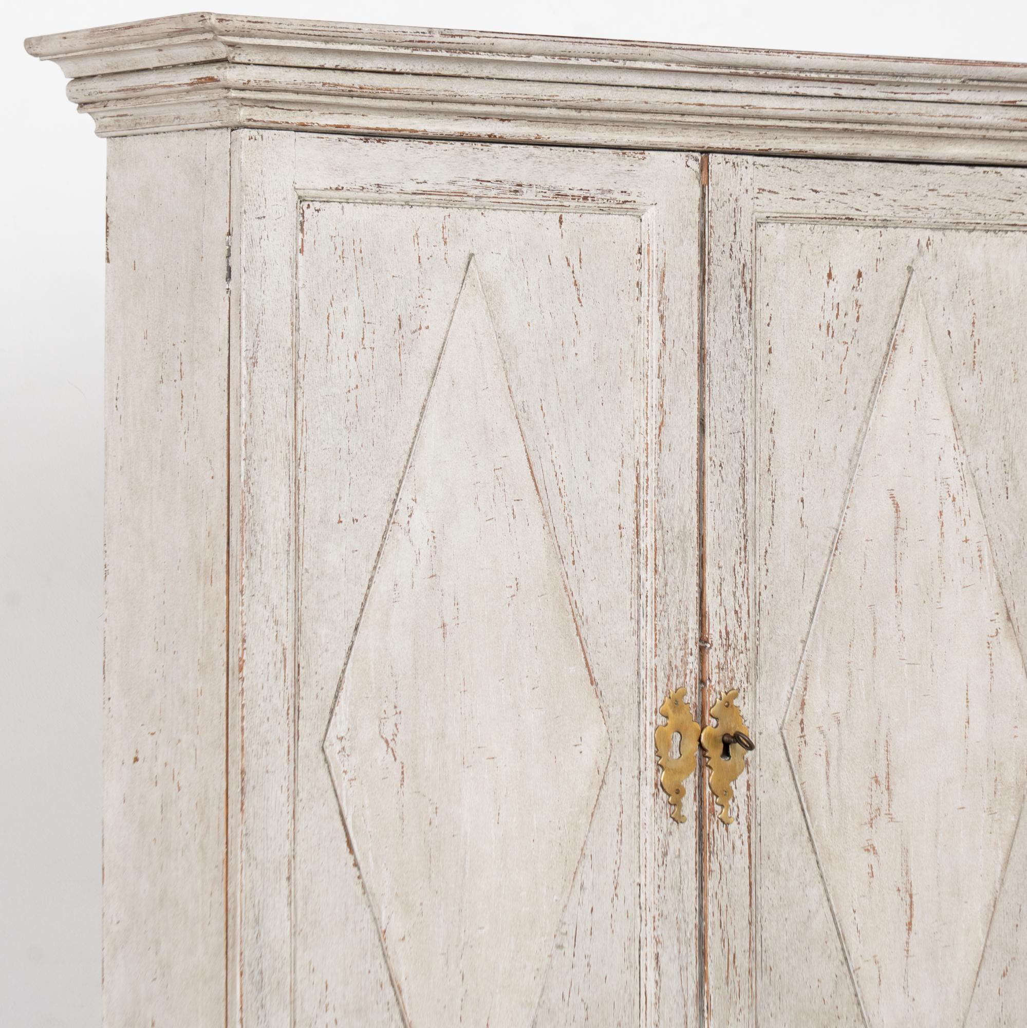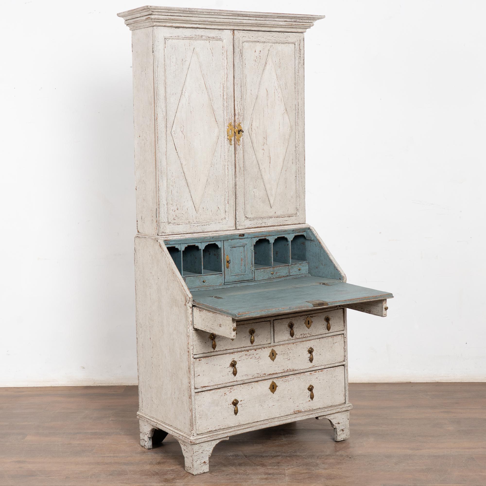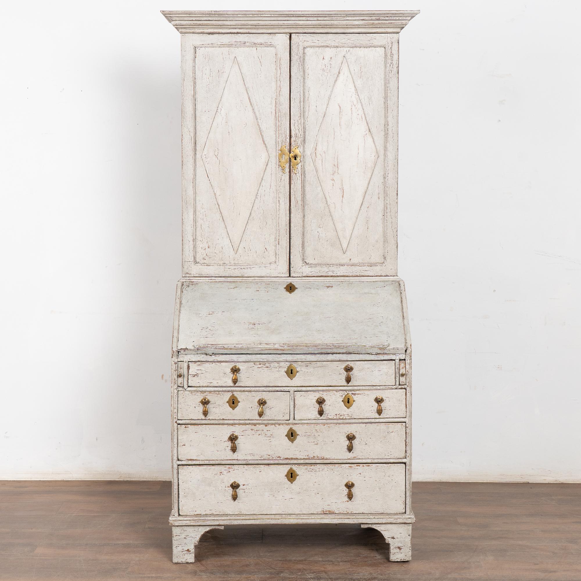 19th-century Swedish Gustavian oak secretary featuring a newer, professionally applied layered finish in antique white and soft gray undertones. Light distressing complements the elegant carved details and brass drop pulls. Traditional diamonds accent the panel doors.