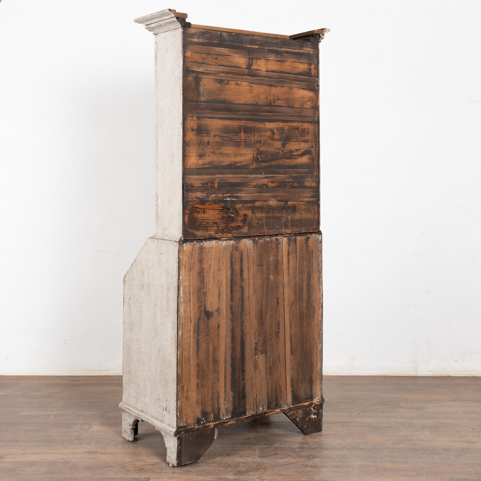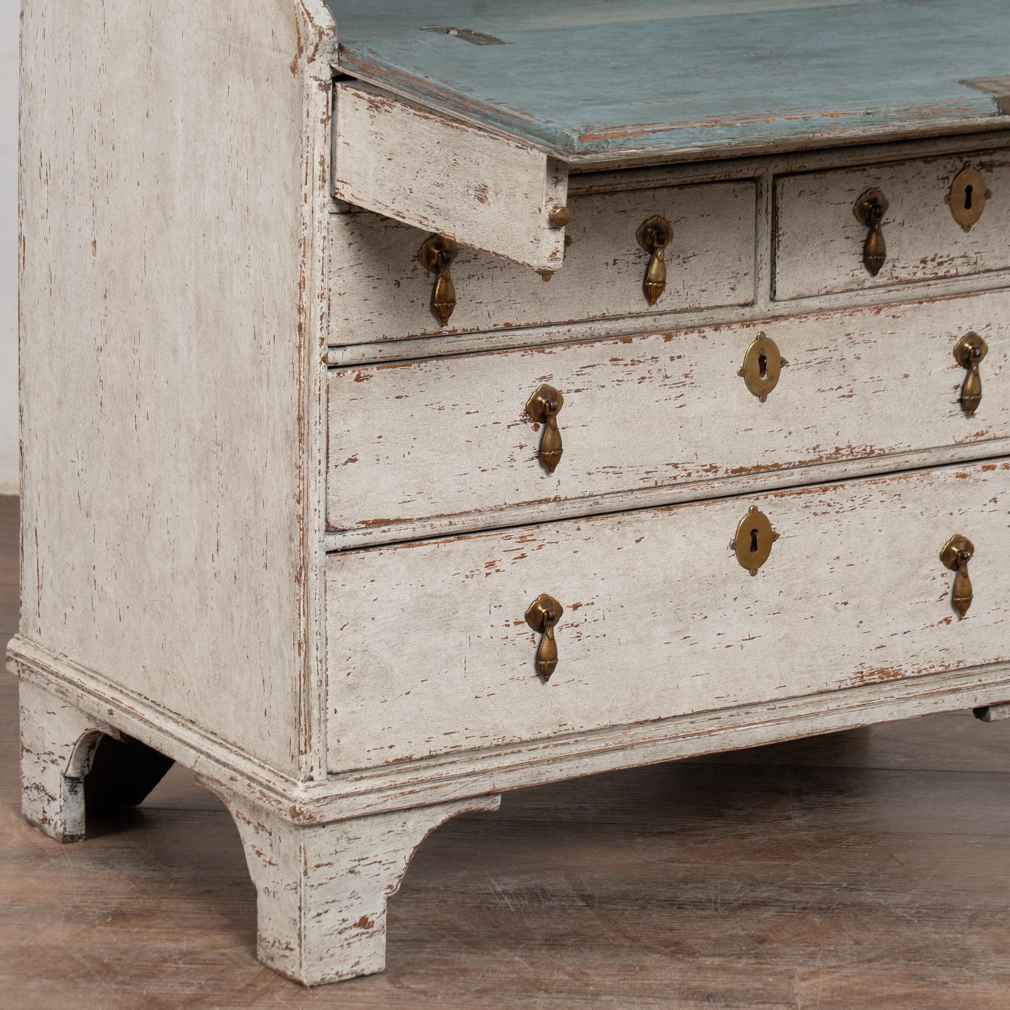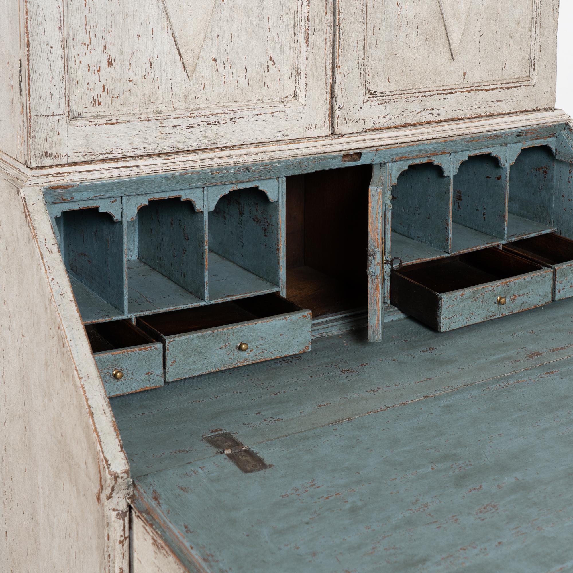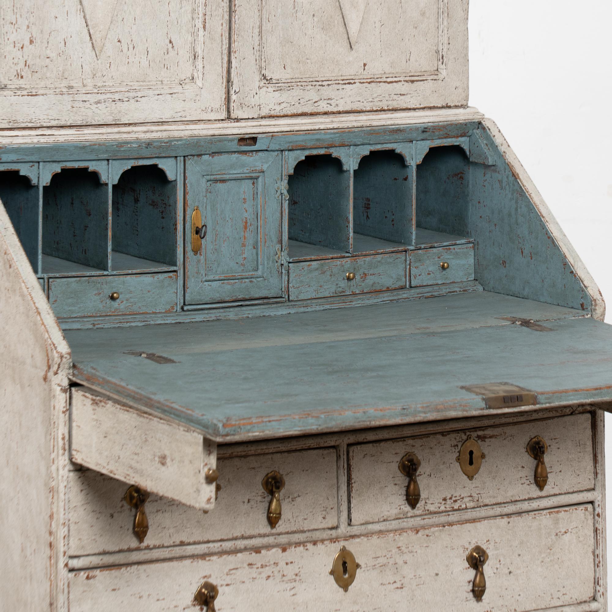 This secretary is narrow in scale at only 36 inches wide. Three adjustable interior shelves and contrasting gray-blue interior paint.