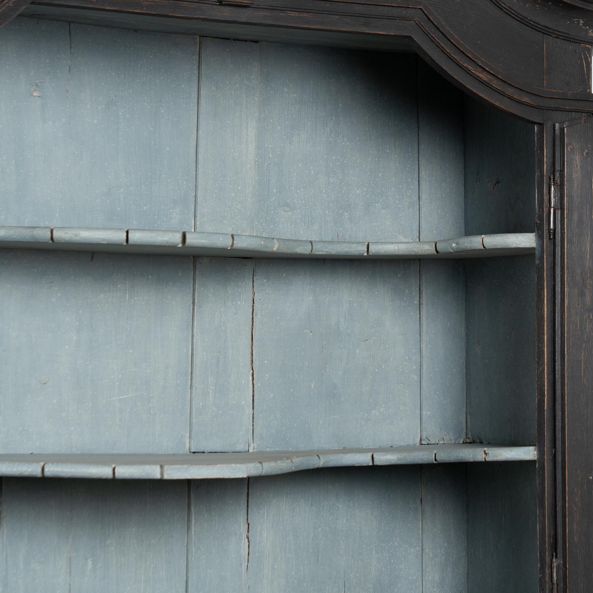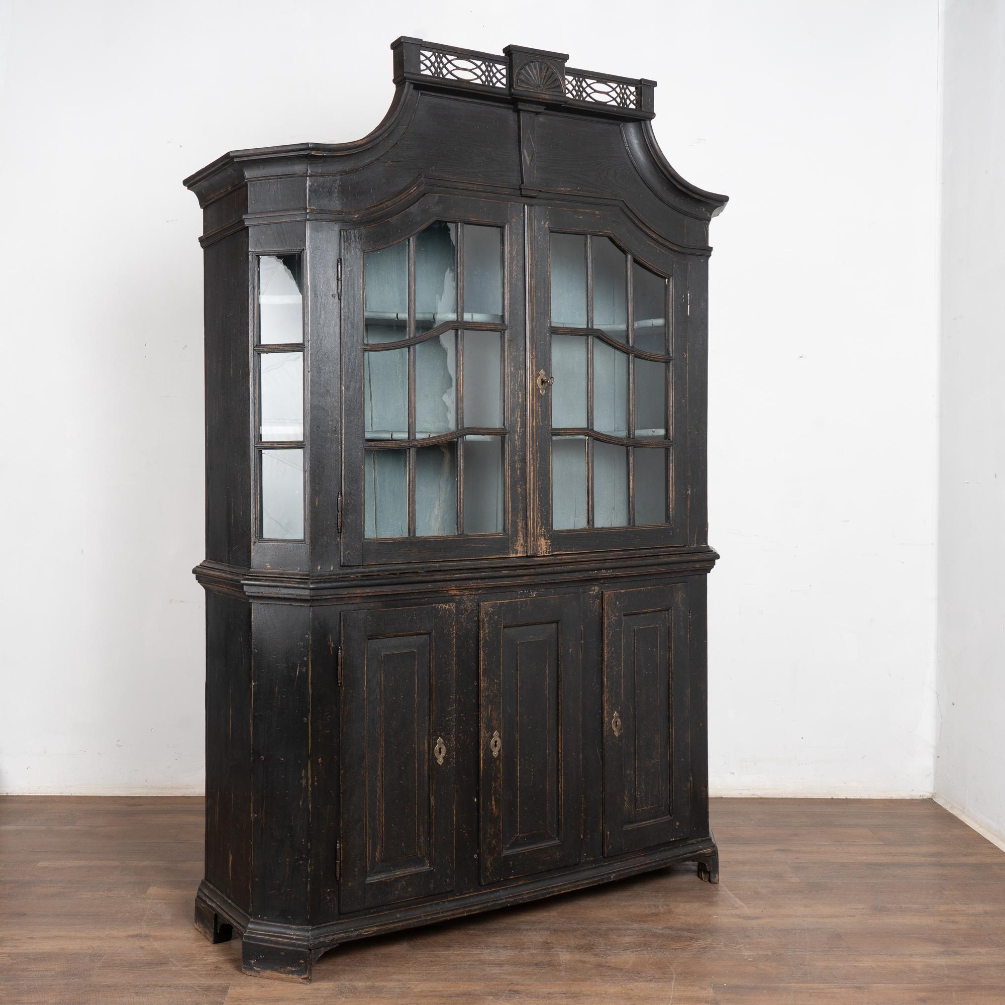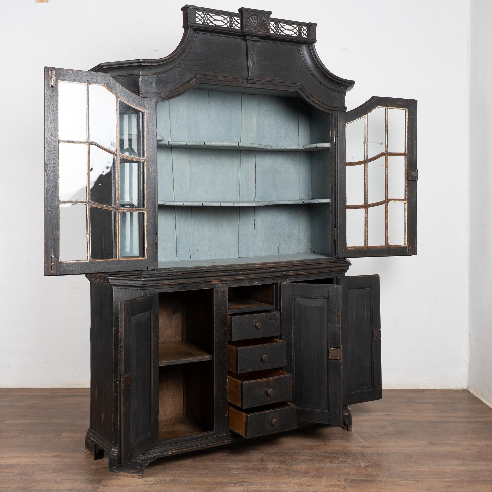 The newer professionally applied black painted finish is distressed to fit the age and grace of the cabinet, revealing the natural wood below. The interior is painted in a contrasting dusky blue.