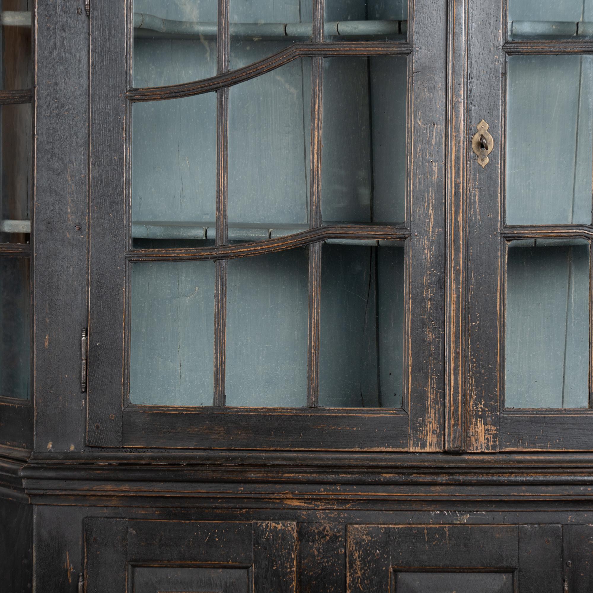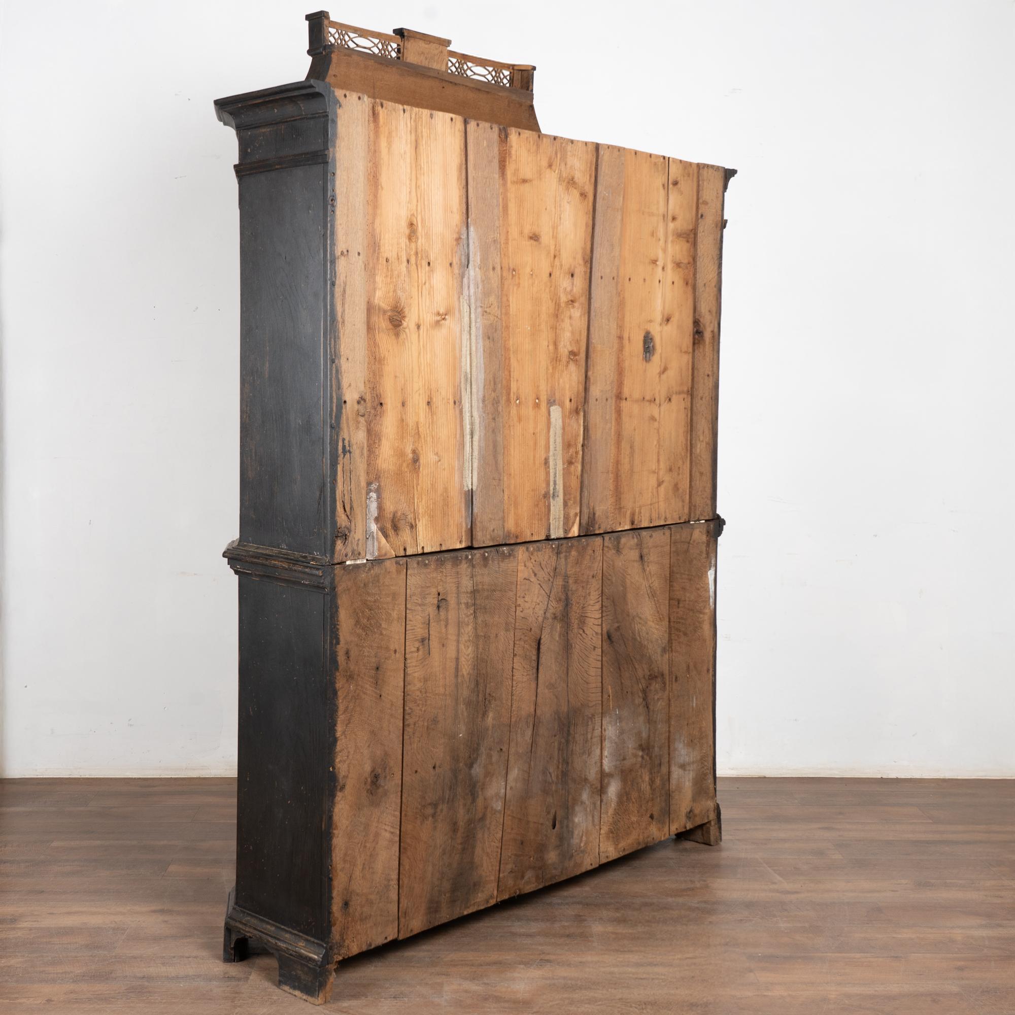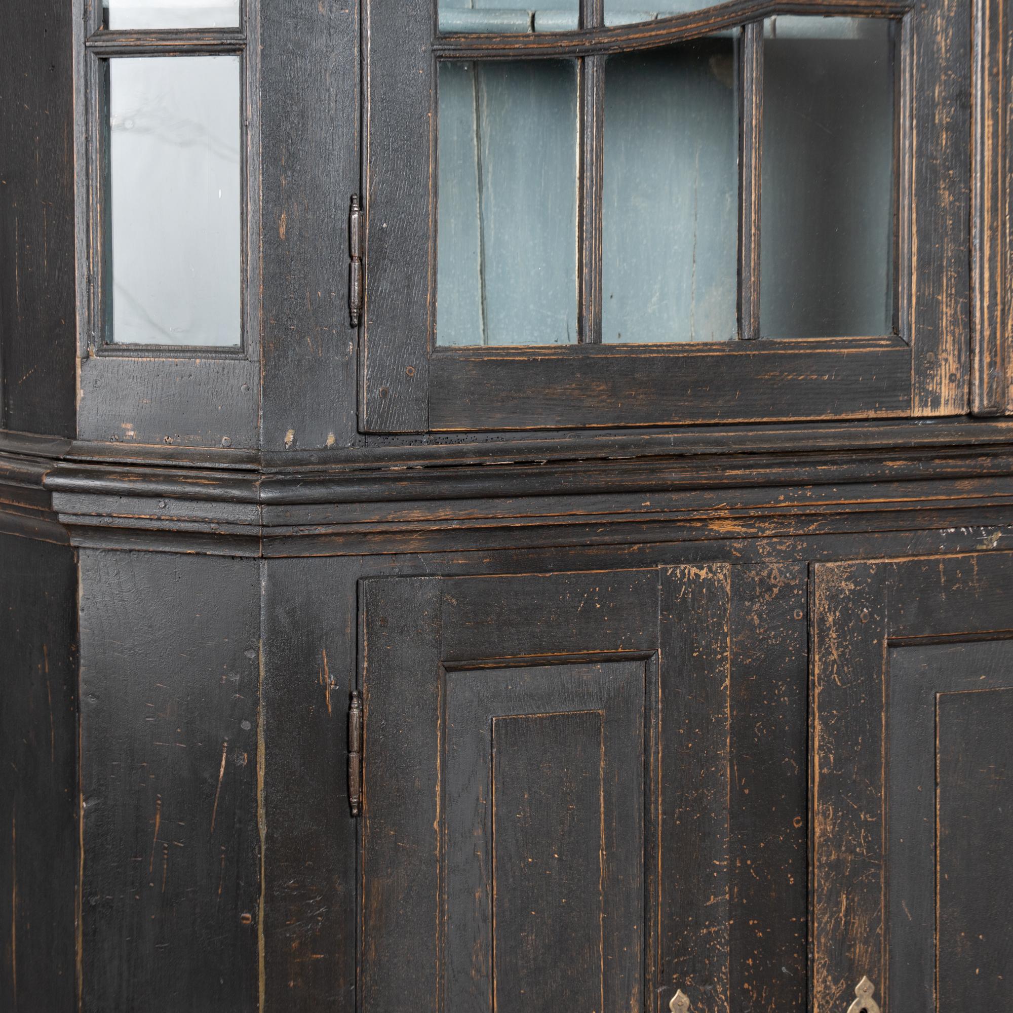 The newer professionally applied black painted finish is distressed to fit the age and grace of the cabinet, revealing the natural wood below. The interior is painted in a contrasting dusky blue.